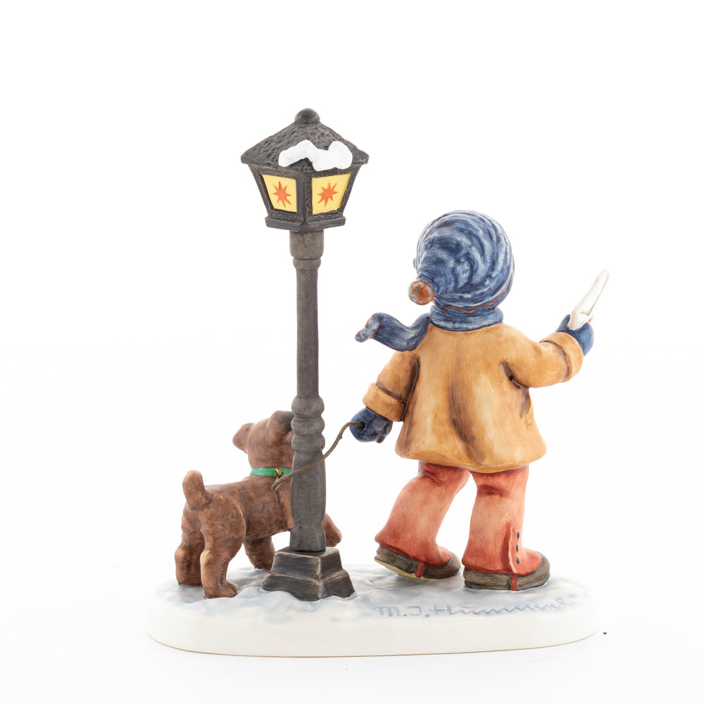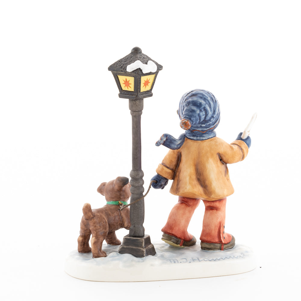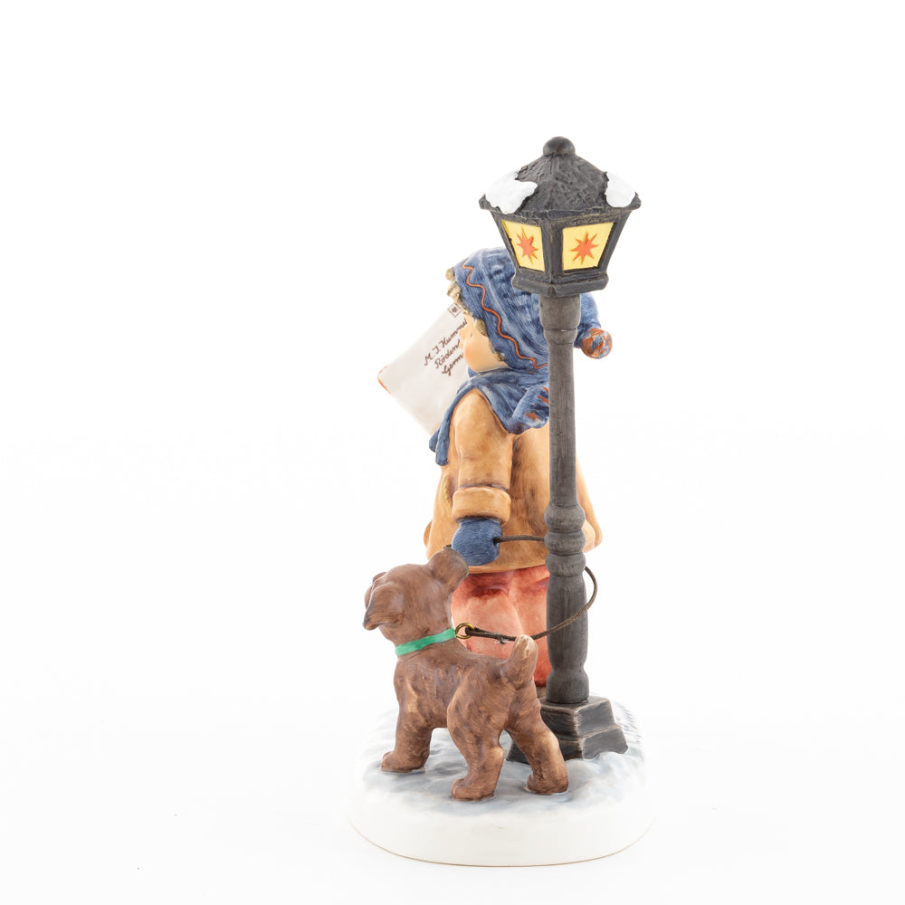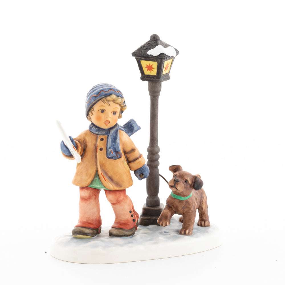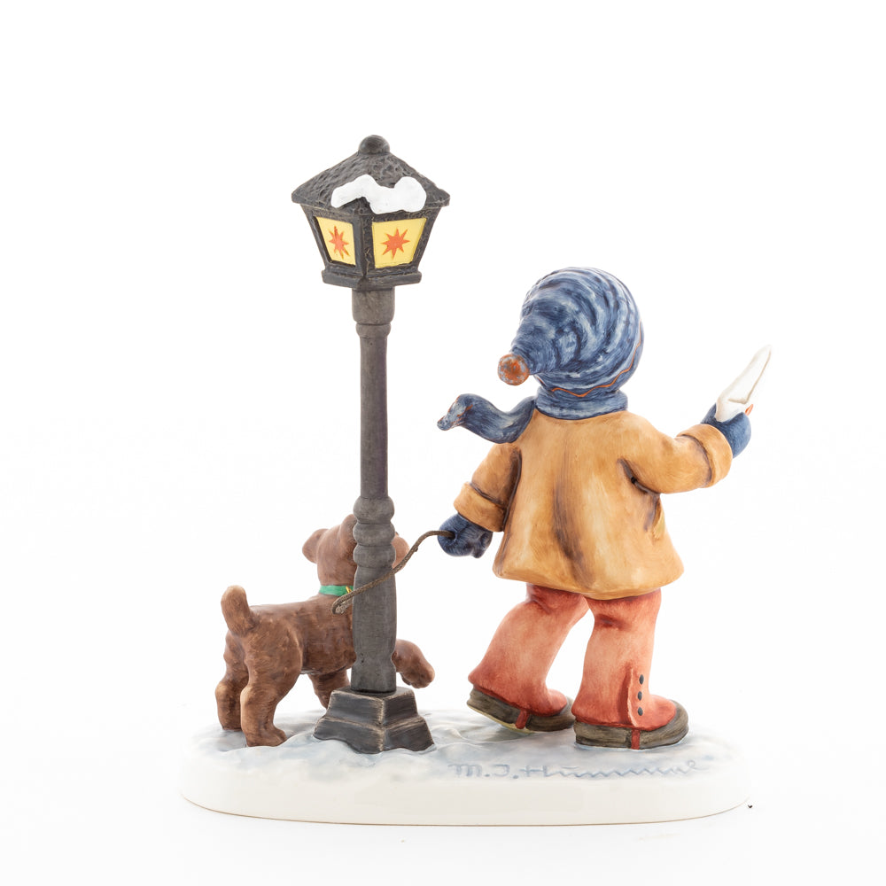 „Aus dem Weg, wir haben es doch eilig!“, scheint der Junge mit dem blauen Schal und der blauen Mütze zu rufen. In der einen Hand hält er wichtige Weihnachtspost, in der anderen die Leine seines Hundes, den er eilig hinter sich herzieht. Doch was ist das? Weil der Hund voller Vorfreude herumgesprungen ist, hat sich seine Leine um die Laterne gewickelt. Schaffen es der Bub und sein Freund aus Fell also noch rechtzeitig zum Briefkasten? Diese Doppelfigur ist handbemalt und -gefertigt und besticht durch viele liebevolle Details. Vom grünen Halsband des Hundes über das Licht in der Laterne bis zur Anschrift auf der Weihnachtspost.