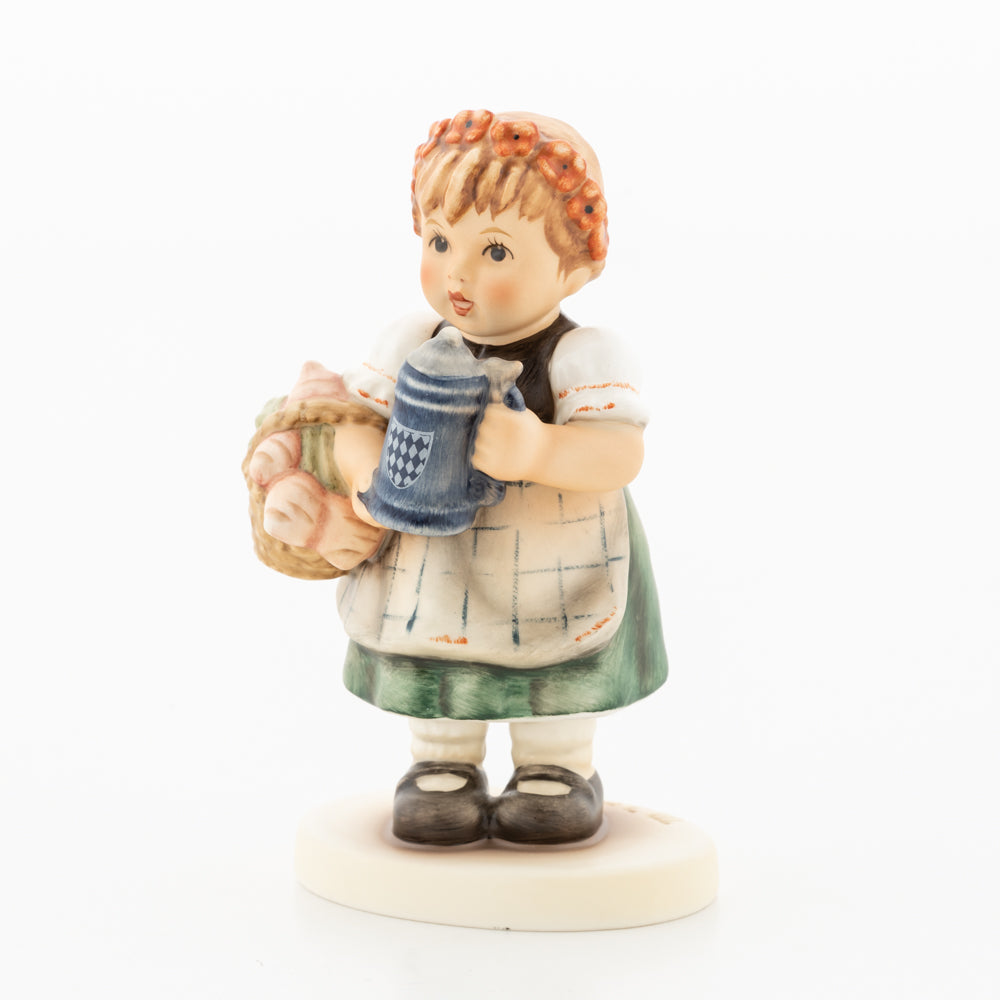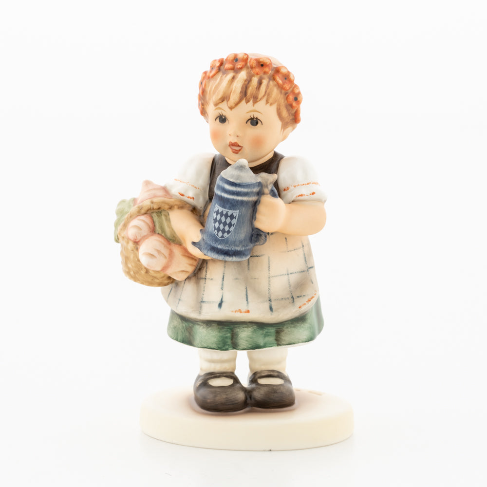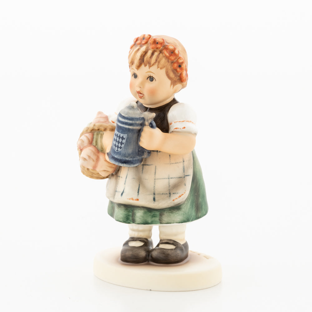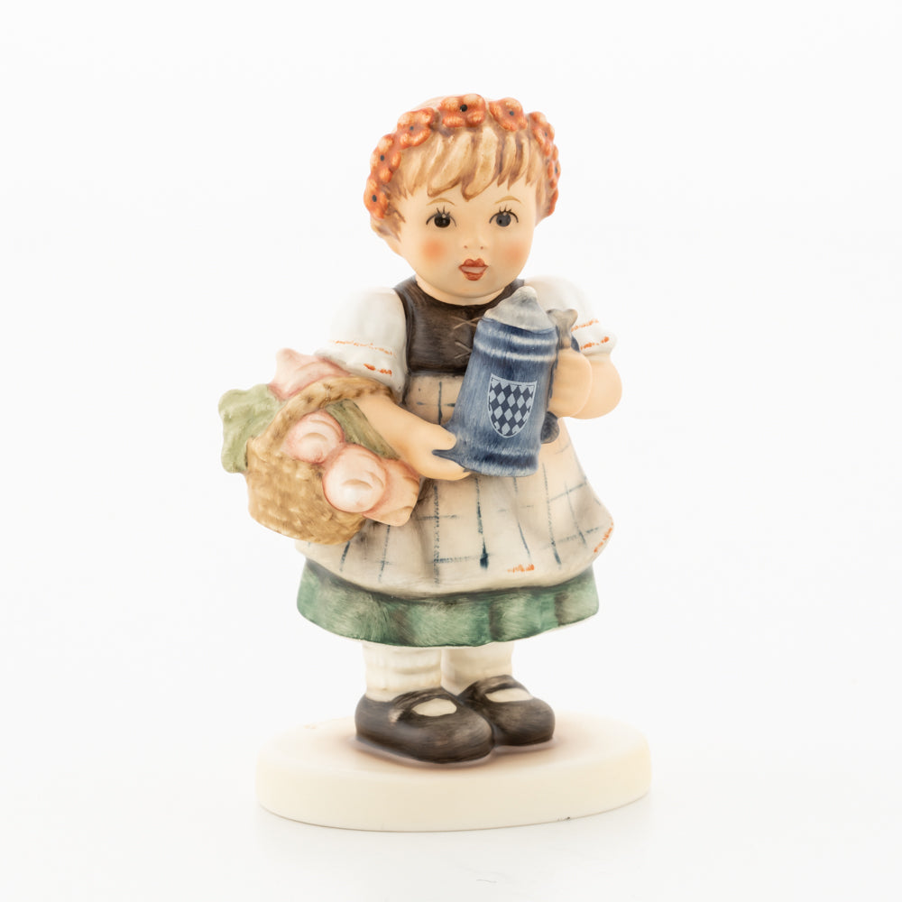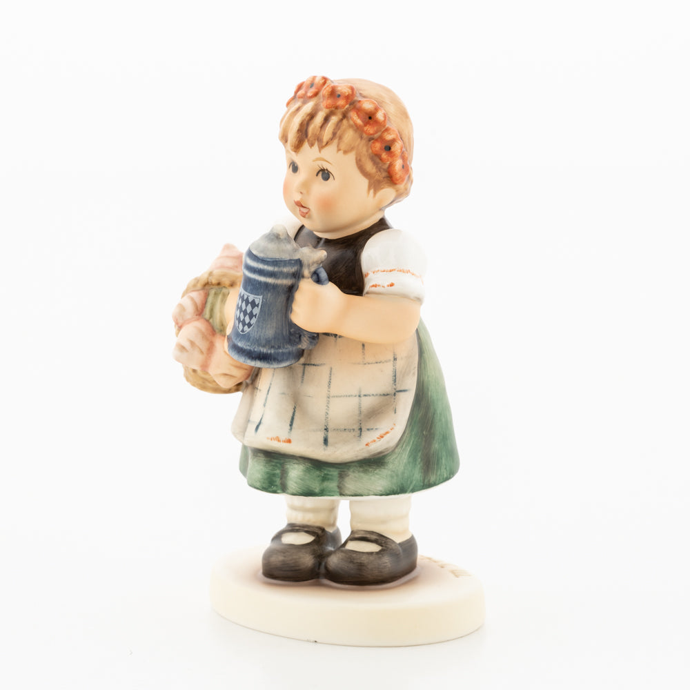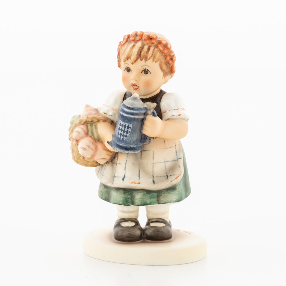 Mahlzeit! In der Hummel Manufaktur Rödental geht es auch einmal zünftig zu. Mit einem Korb voll Rettich im Arm und einem Bierkrug in der Hand macht sich das Hummel-Mädchen auf den Weg zum Dorf- oder sogar Oktoberfest. Natürlich darf die Tracht da nicht fehlen: Gekleidet im Dirndl und einen sorgsam geflochtenen Blumenkranz auf dem Kopf zeigt sich die original M.I. Hummel-Figur als echt bayerisches Madl.
