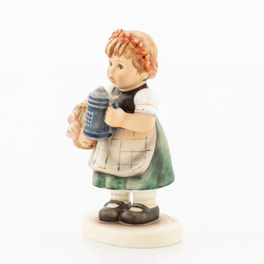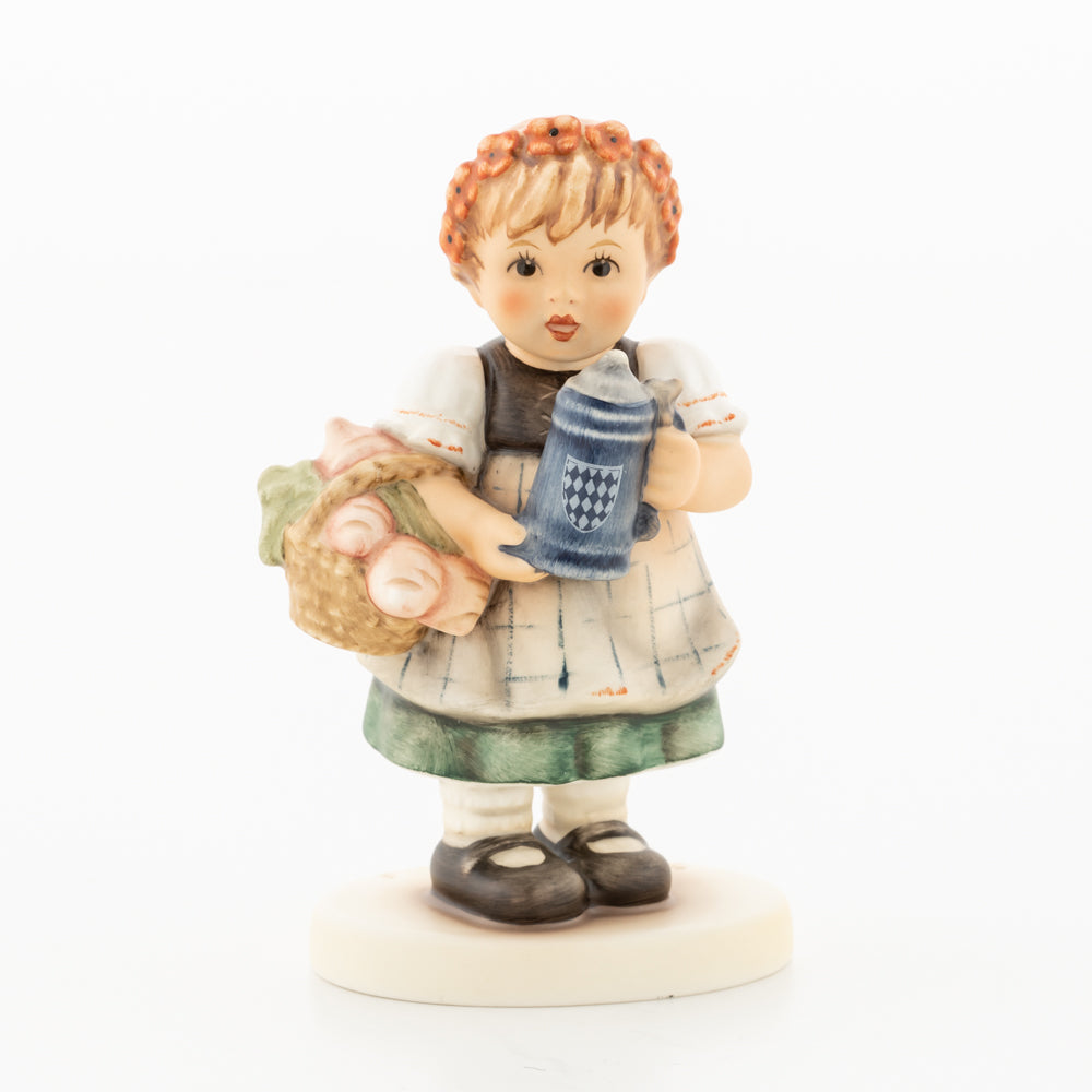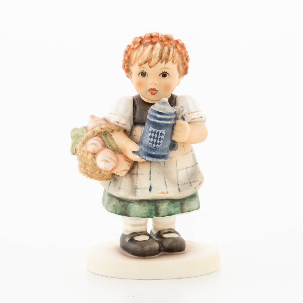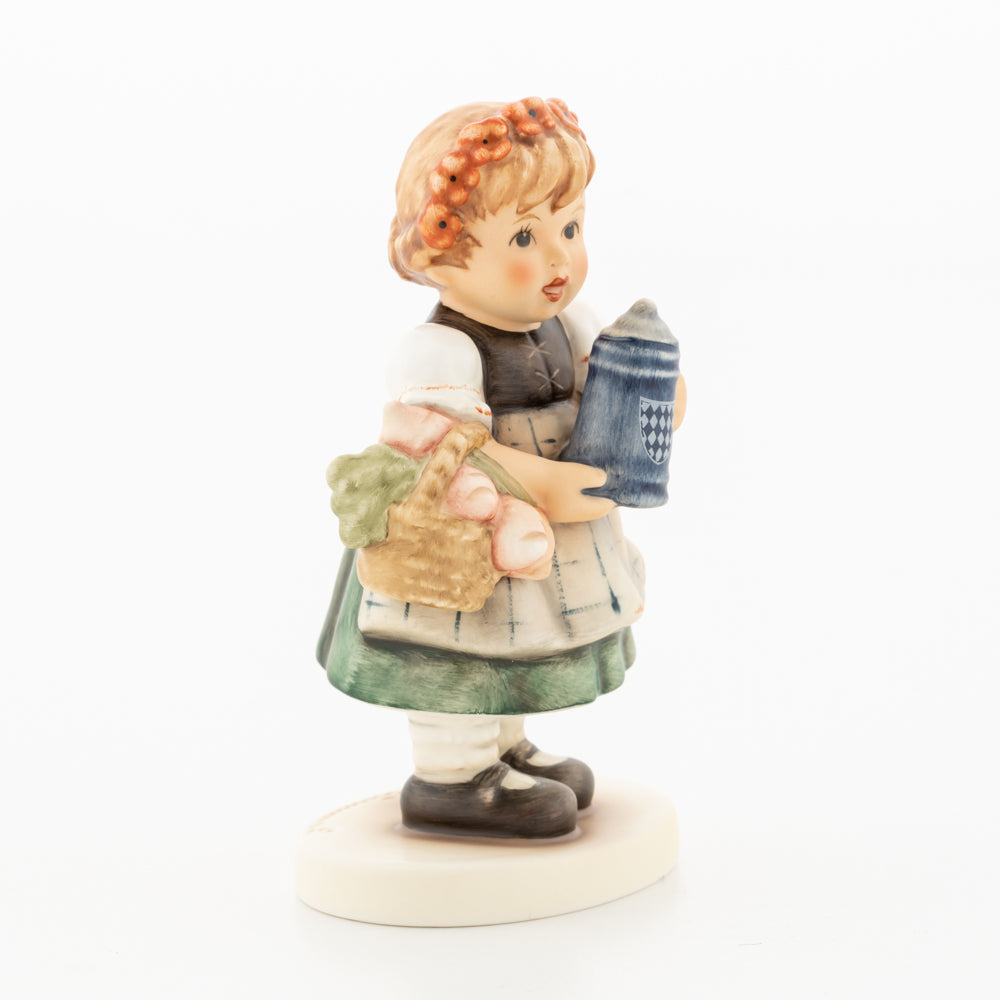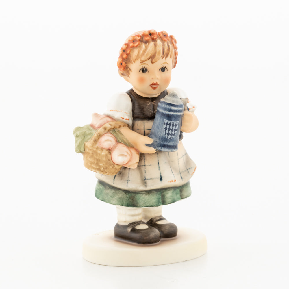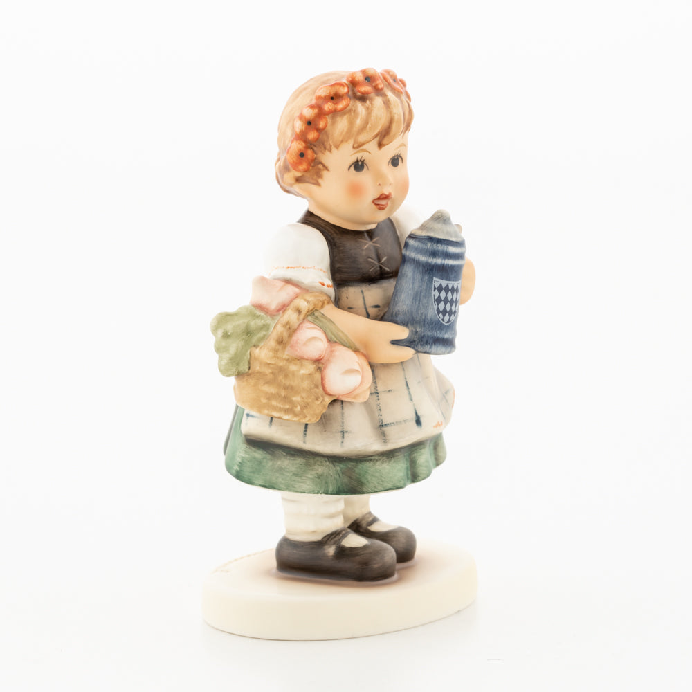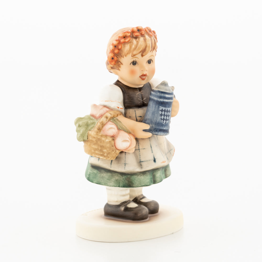 Mahlzeit! In der Hummel Manufaktur Rödental geht es auch einmal zünftig zu. Mit einem Korb voll Rettich im Arm und einem Bierkrug in der Hand macht sich das Hummel-Mädchen auf den Weg zum Dorf- oder sogar Oktoberfest. Natürlich darf die Tracht da nicht fehlen: Gekleidet im Dirndl und einen sorgsam geflochtenen Blumenkranz auf dem Kopf zeigt sich die original M.I. Hummel-Figur als echt bayerisches Madl.