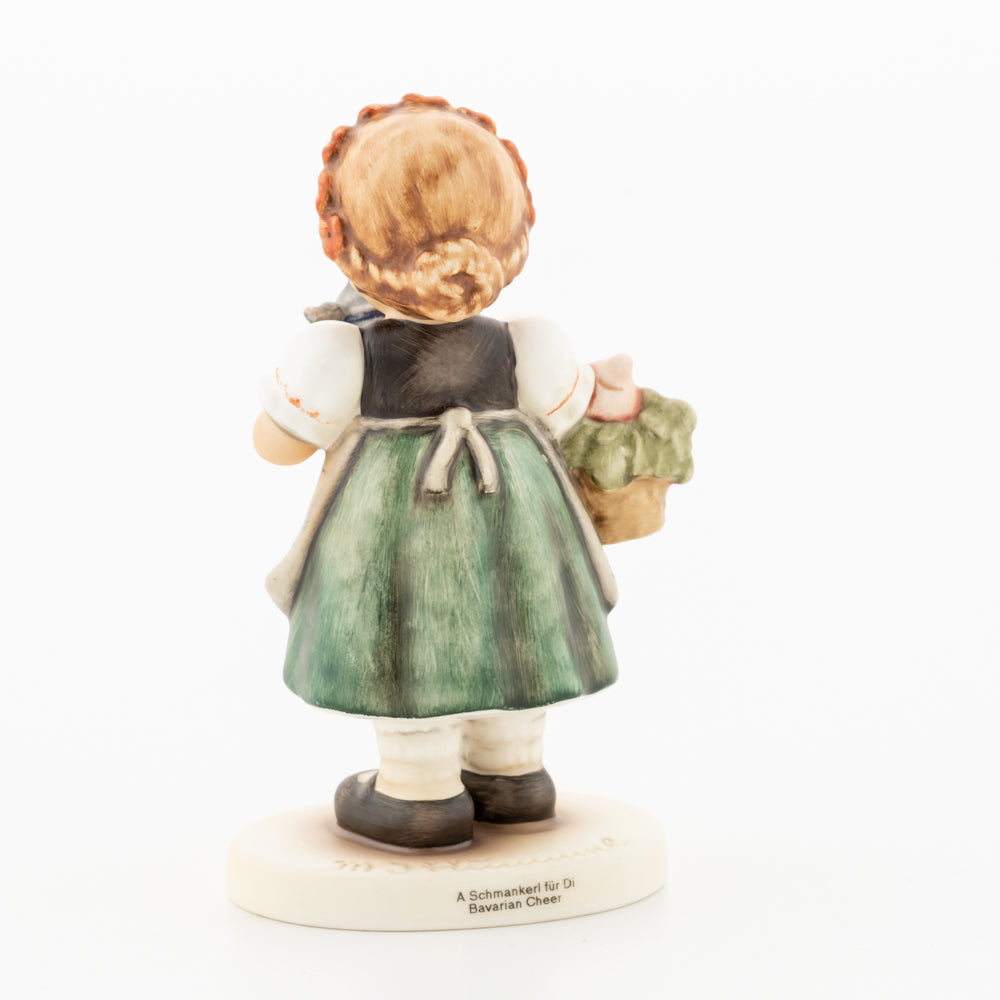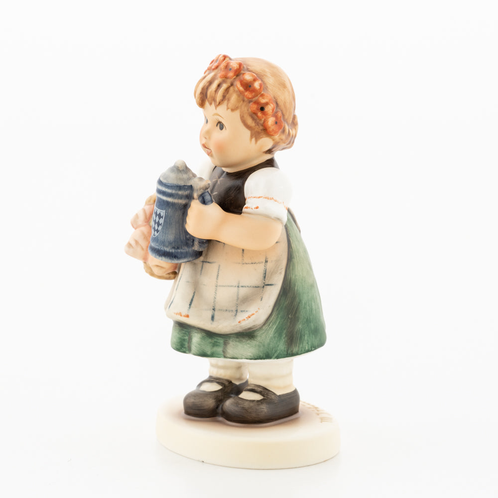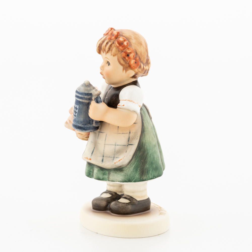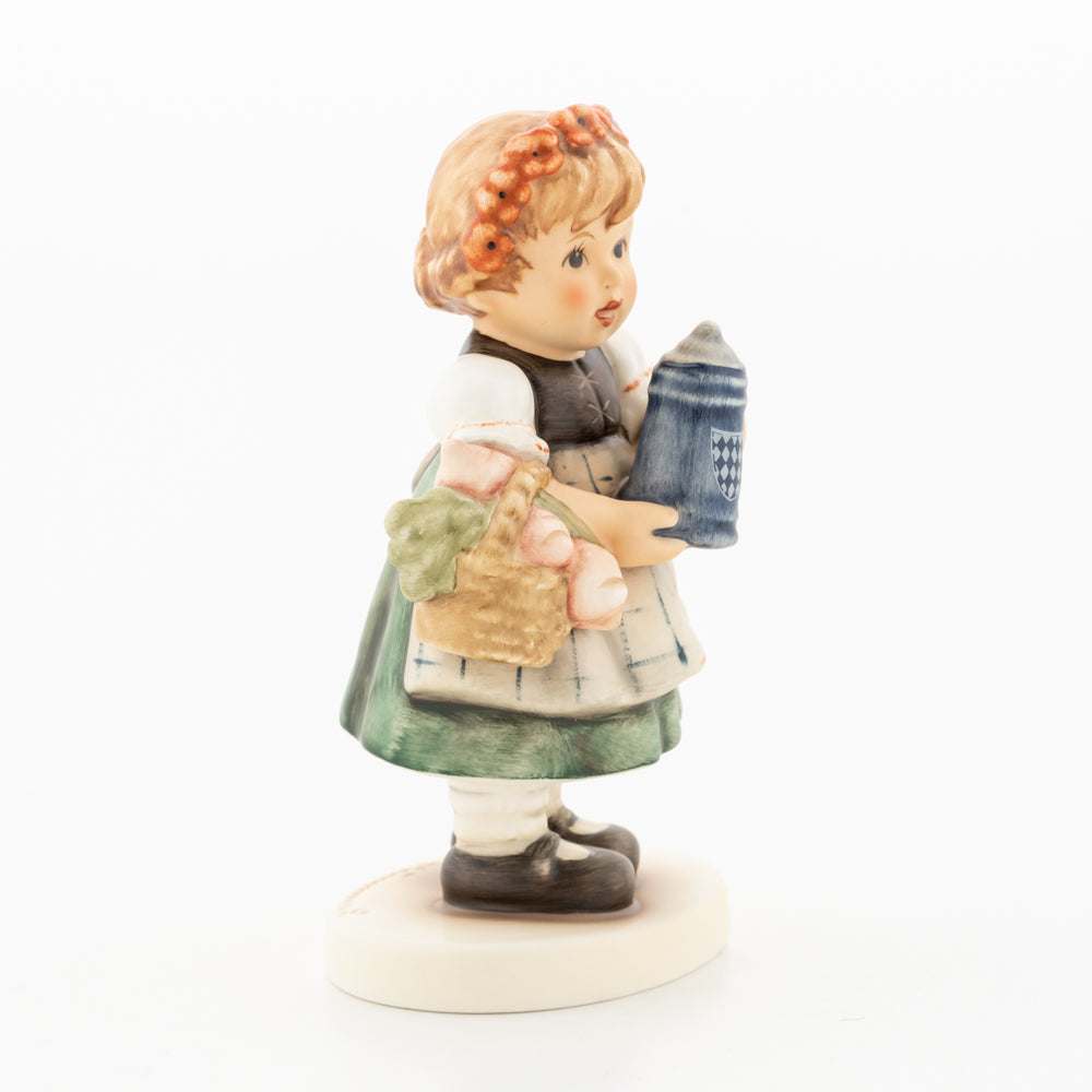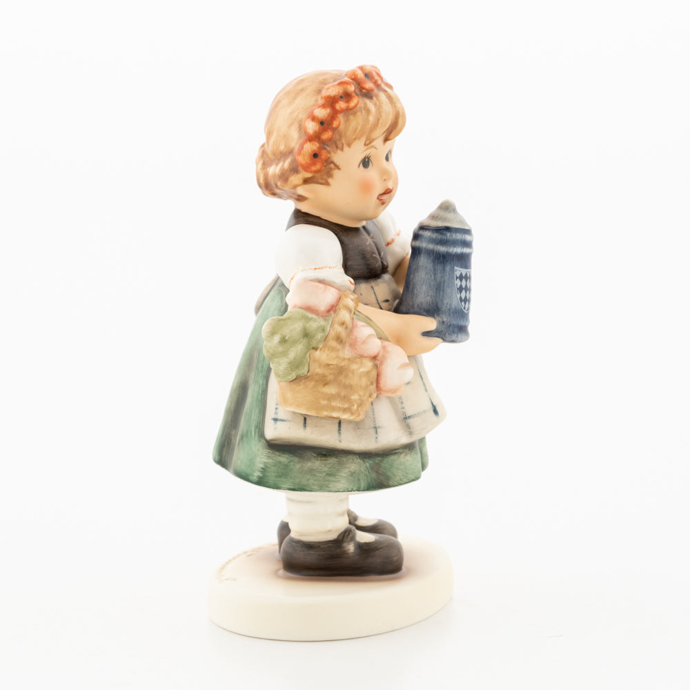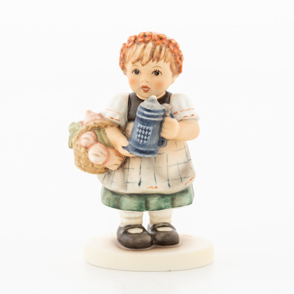 Mahlzeit! In der Hummel Manufaktur Rödental geht es auch einmal zünftig zu. Mit einem Korb voll Rettich im Arm und einem Bierkrug in der Hand macht sich das Hummel-Mädchen auf den Weg zum Dorf- oder sogar Oktoberfest. Natürlich darf die Tracht da nicht fehlen: Gekleidet im Dirndl und einen sorgsam geflochtenen Blumenkranz auf dem Kopf zeigt sich die original M.I. Hummel-Figur als echt bayerisches Madl.