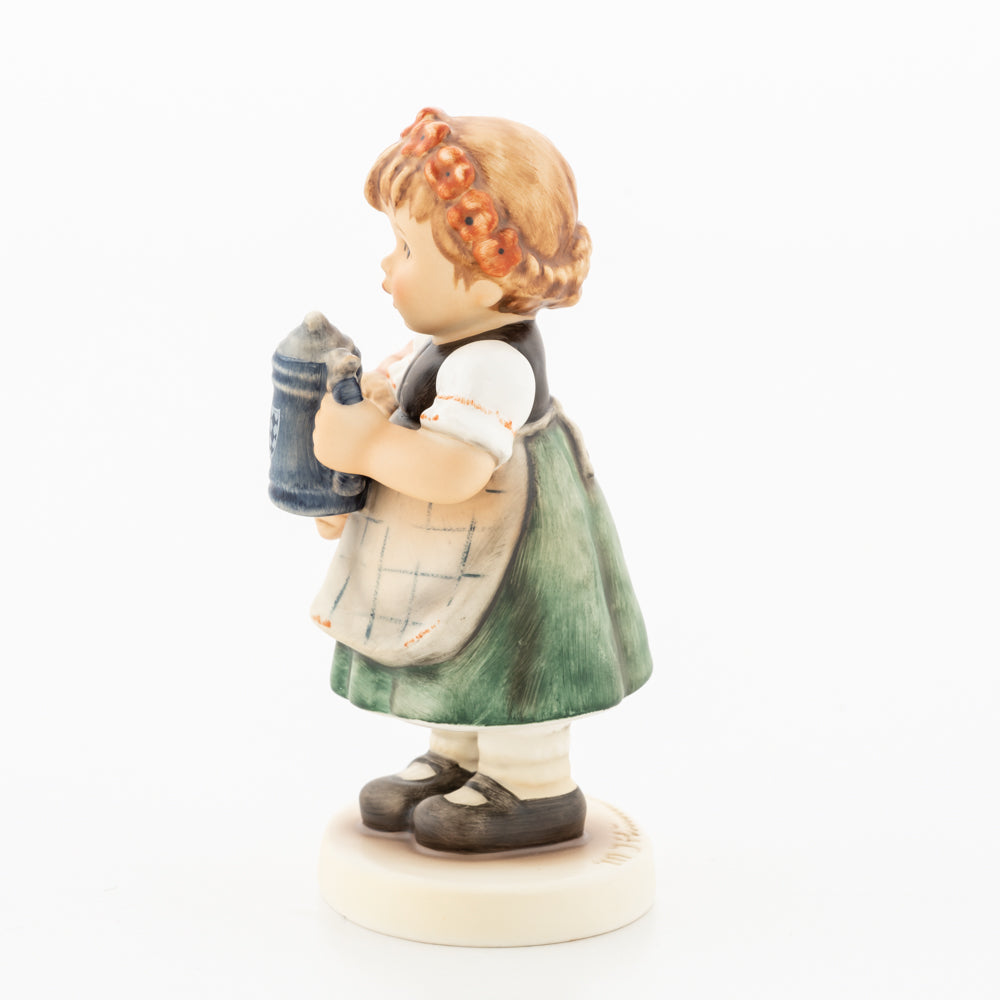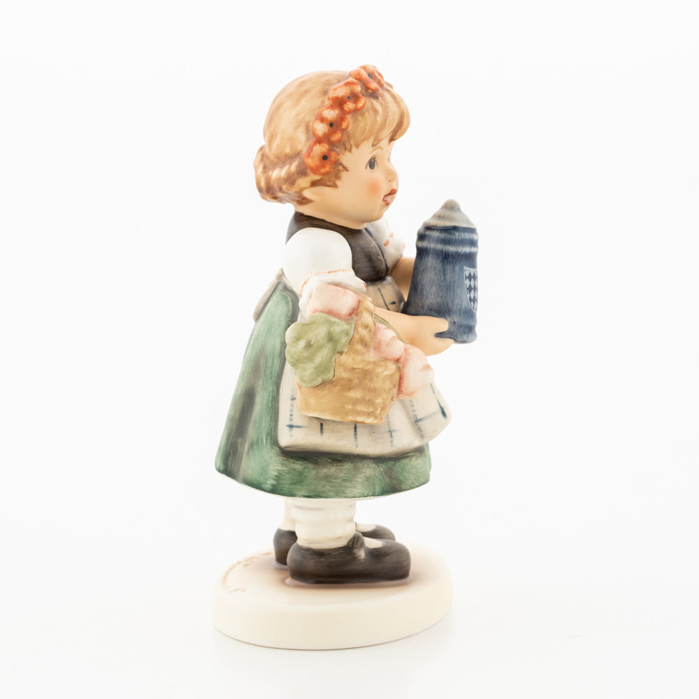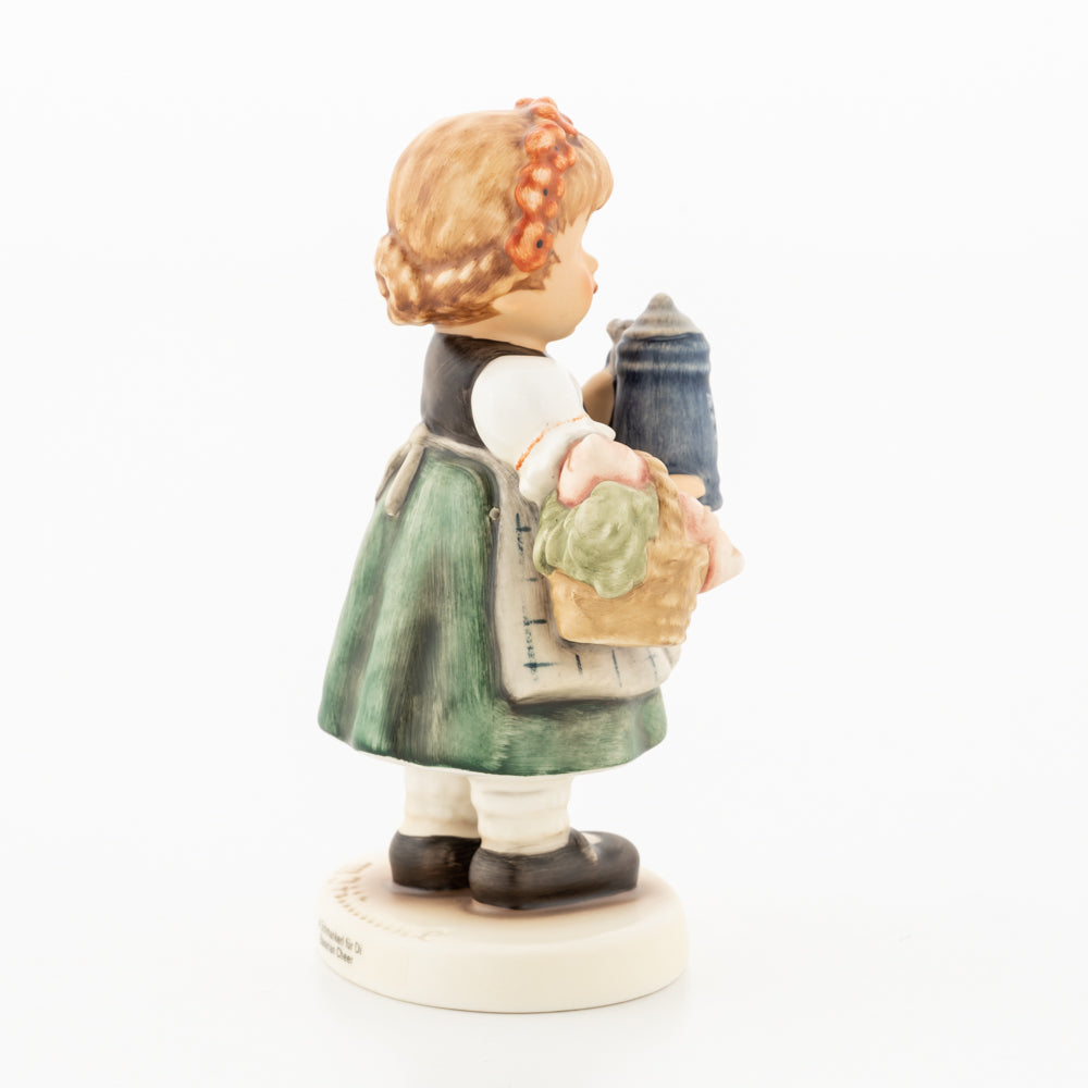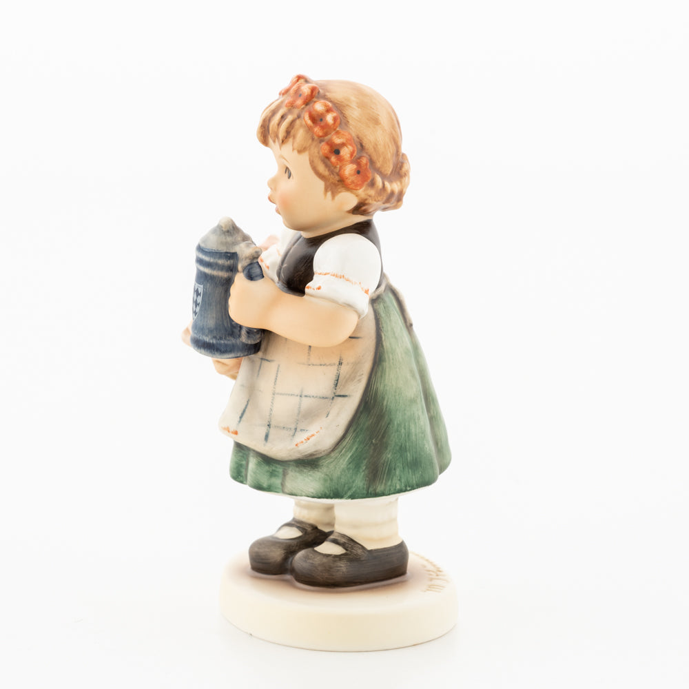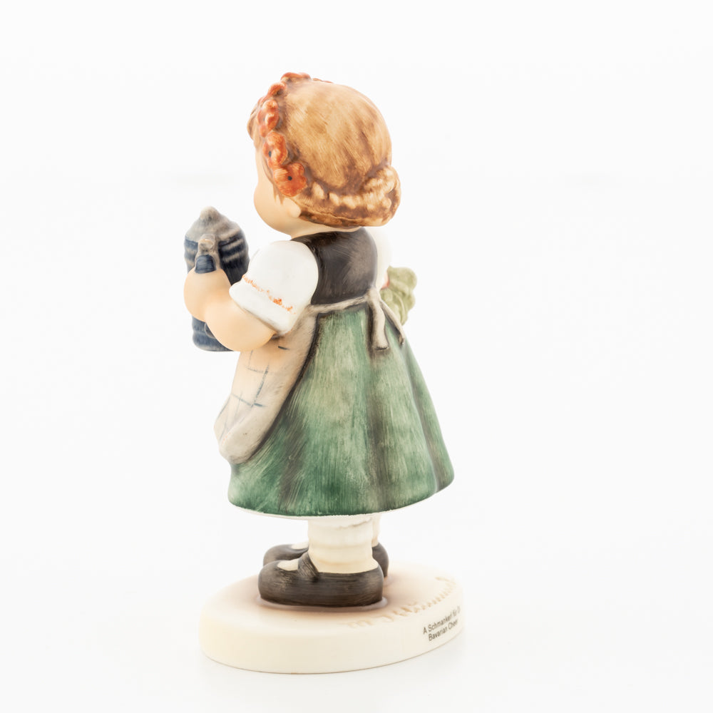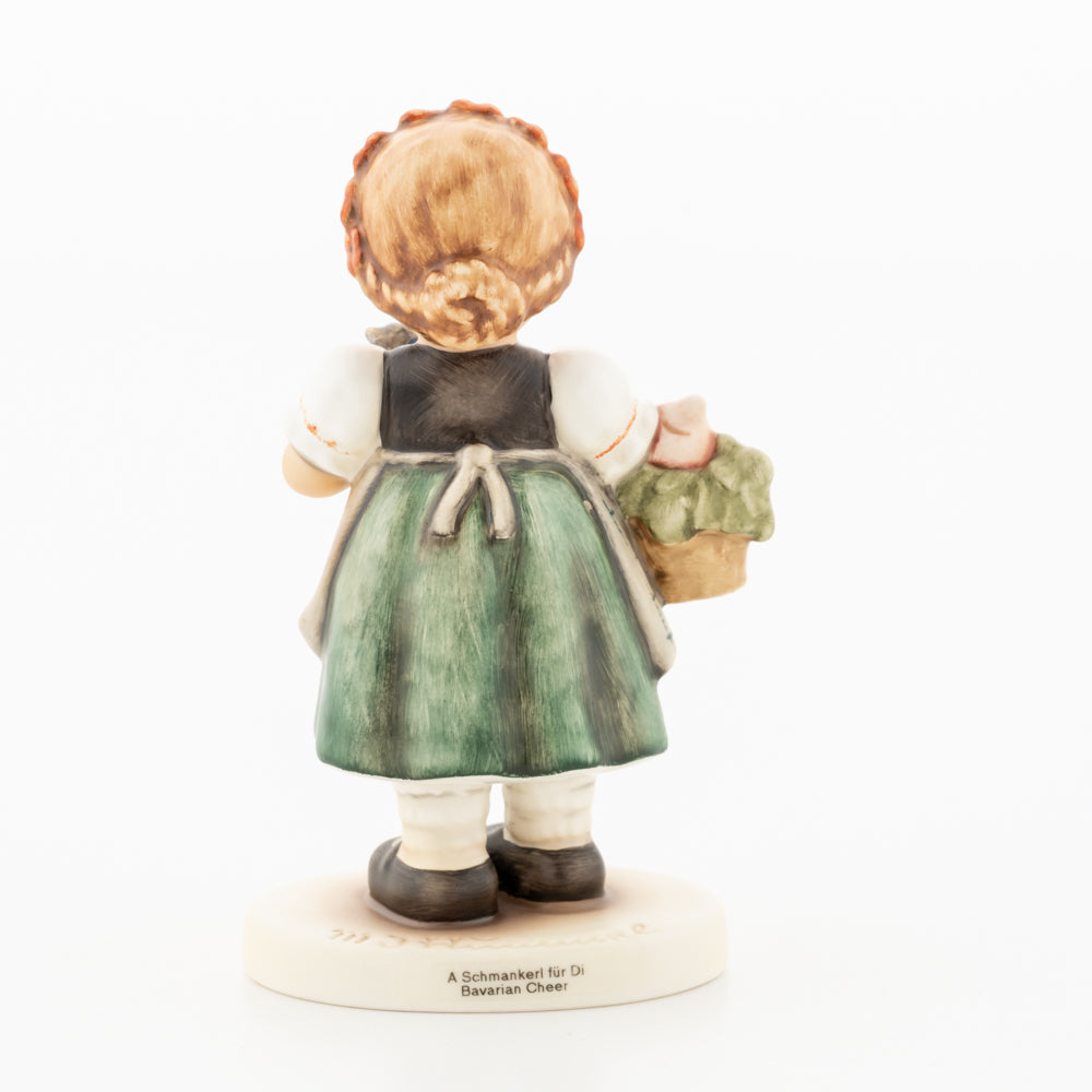 Mahlzeit! In der Hummel Manufaktur Rödental geht es auch einmal zünftig zu. Mit einem Korb voll Rettich im Arm und einem Bierkrug in der Hand macht sich das Hummel-Mädchen auf den Weg zum Dorf- oder sogar Oktoberfest. Natürlich darf die Tracht da nicht fehlen: Gekleidet im Dirndl und einen sorgsam geflochtenen Blumenkranz auf dem Kopf zeigt sich die original M.I. Hummel-Figur als echt bayerisches Madl.