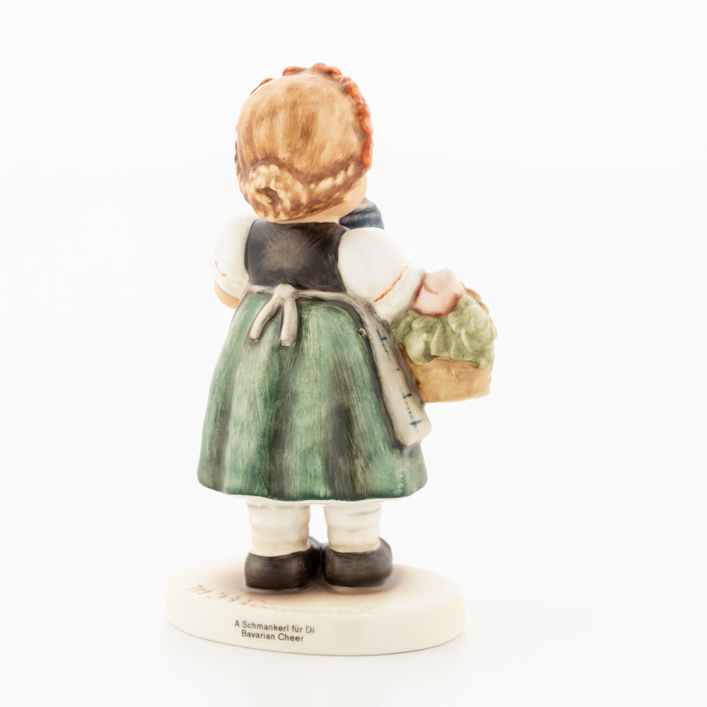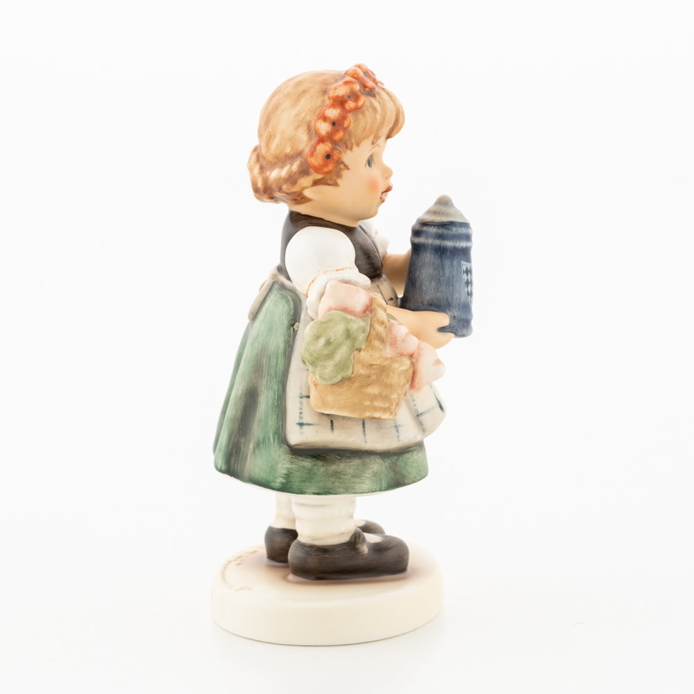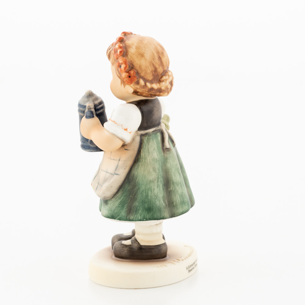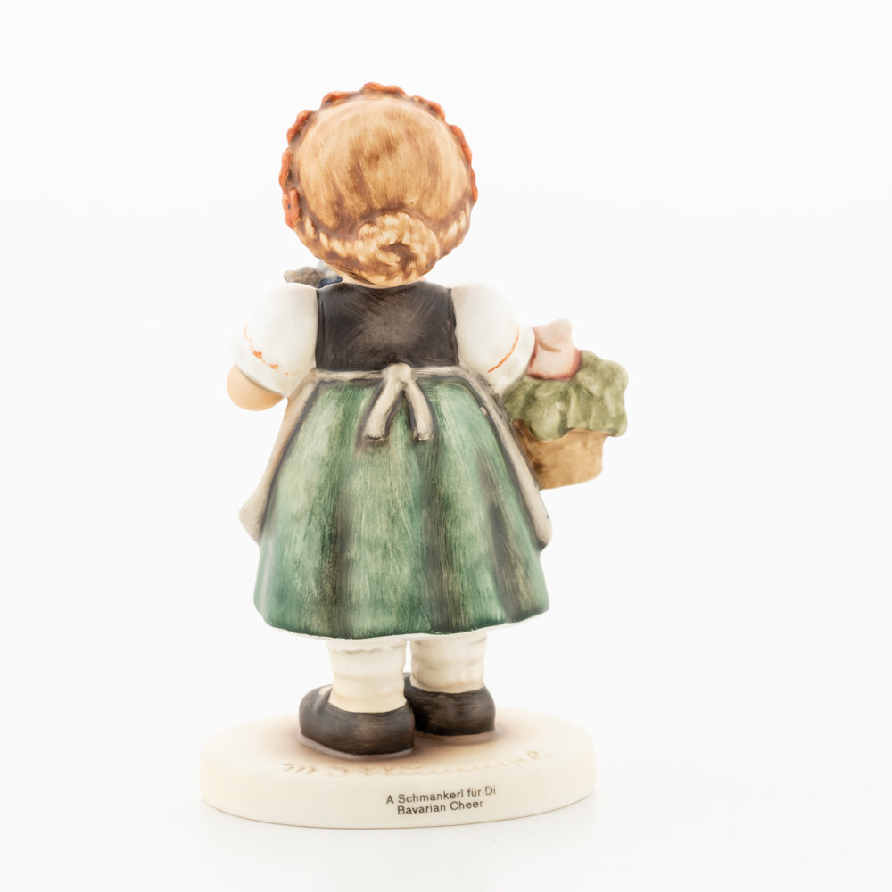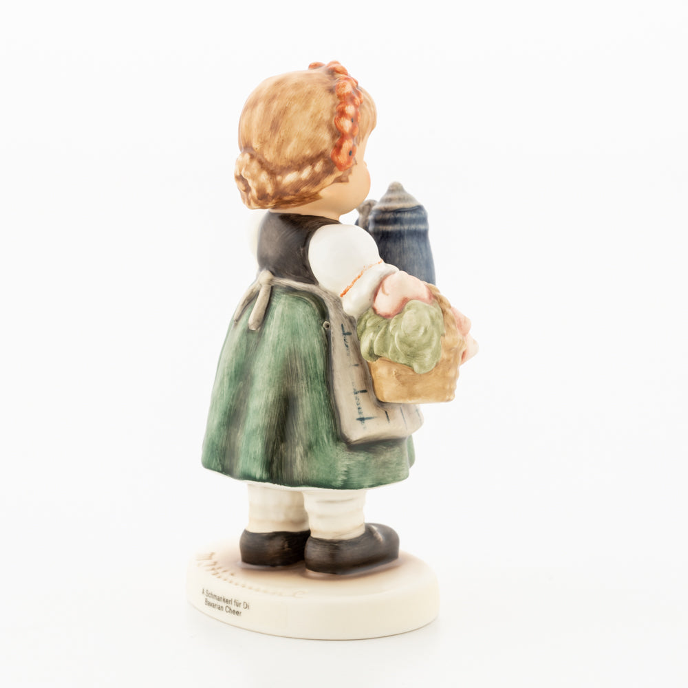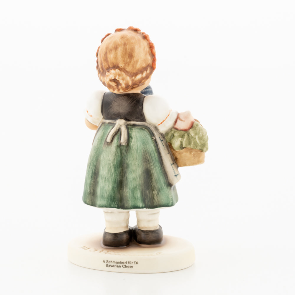 Mahlzeit! In der Hummel Manufaktur Rödental geht es auch einmal zünftig zu. Mit einem Korb voll Rettich im Arm und einem Bierkrug in der Hand macht sich das Hummel-Mädchen auf den Weg zum Dorf- oder sogar Oktoberfest. Natürlich darf die Tracht da nicht fehlen: Gekleidet im Dirndl und einen sorgsam geflochtenen Blumenkranz auf dem Kopf zeigt sich die original M.I. Hummel-Figur als echt bayerisches Madl.