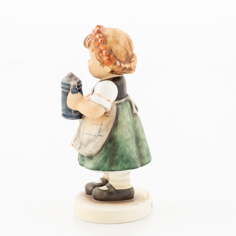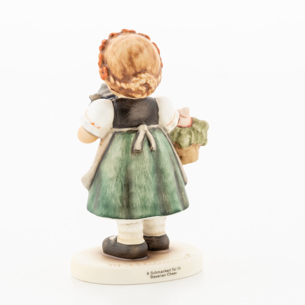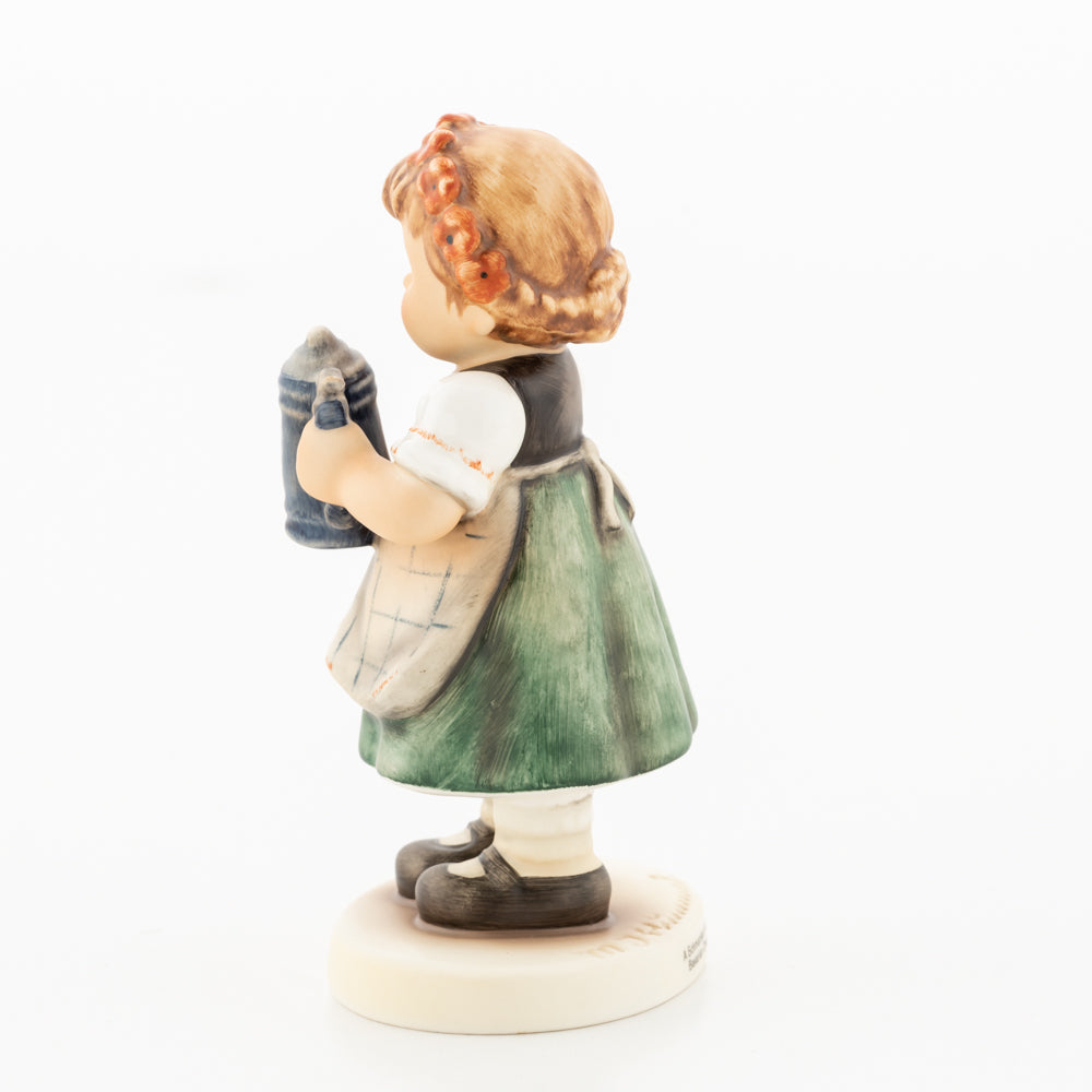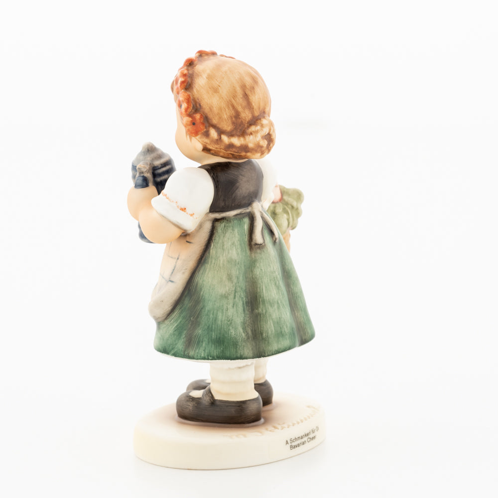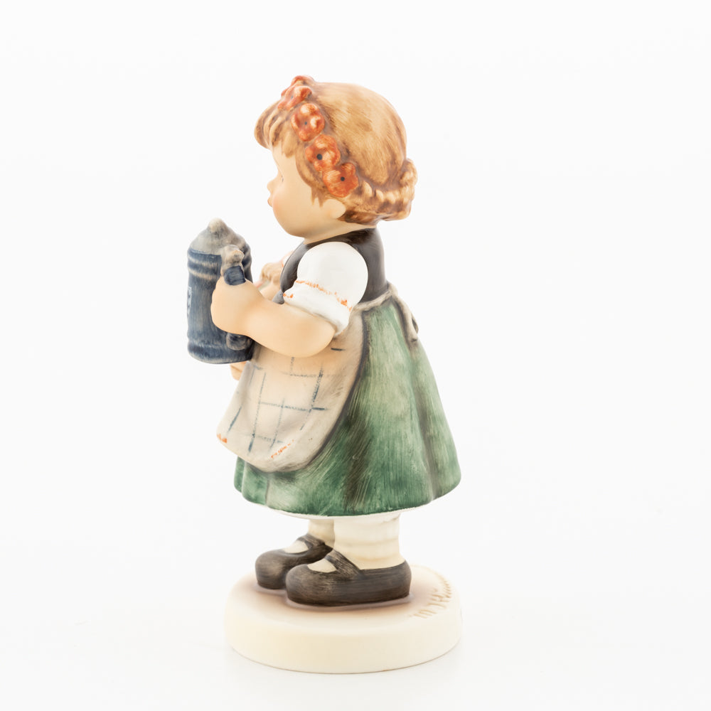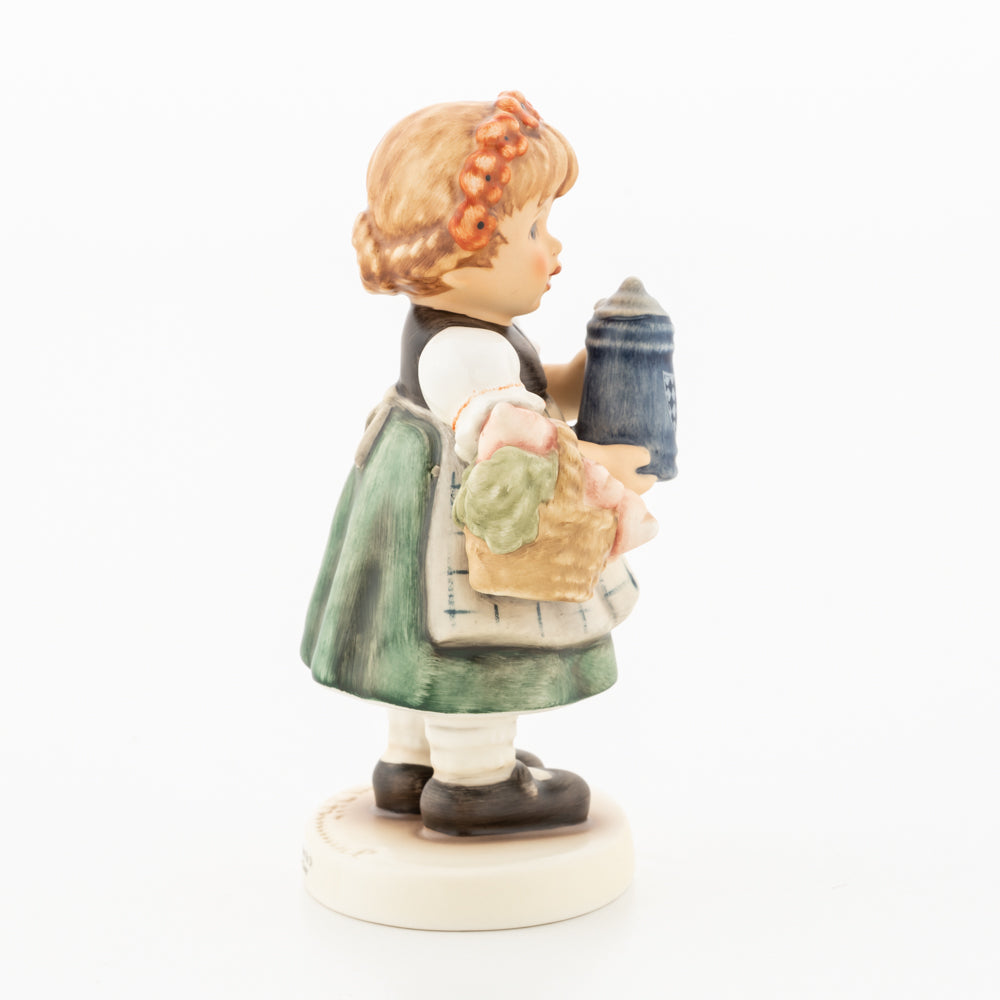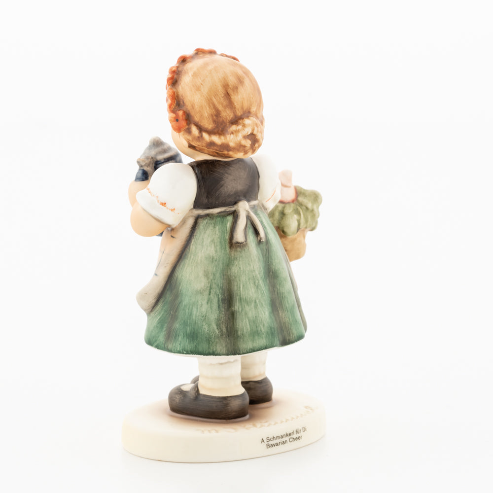 Mahlzeit! In der Hummel Manufaktur Rödental geht es auch einmal zünftig zu. Mit einem Korb voll Rettich im Arm und einem Bierkrug in der Hand macht sich das Hummel-Mädchen auf den Weg zum Dorf- oder sogar Oktoberfest. Natürlich darf die Tracht da nicht fehlen: Gekleidet im Dirndl und einen sorgsam geflochtenen Blumenkranz auf dem Kopf zeigt sich die original M.I. Hummel-Figur als echt bayerisches Madl.