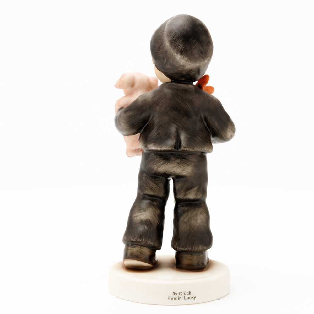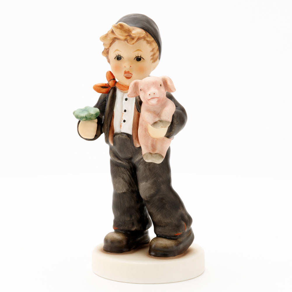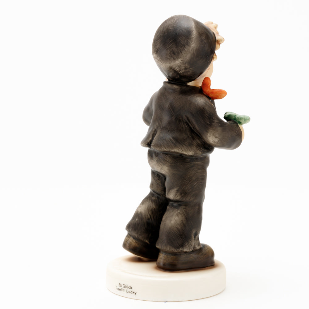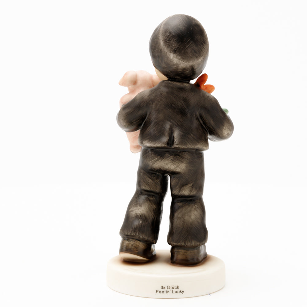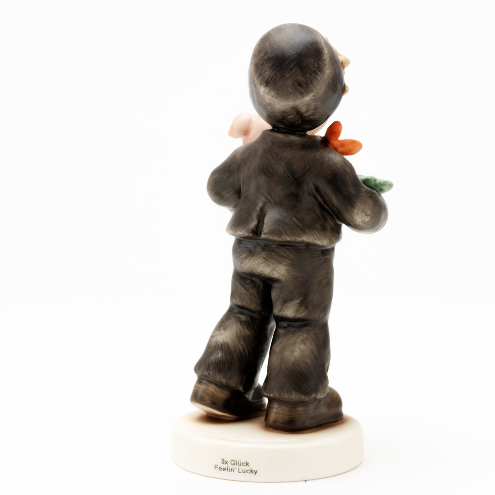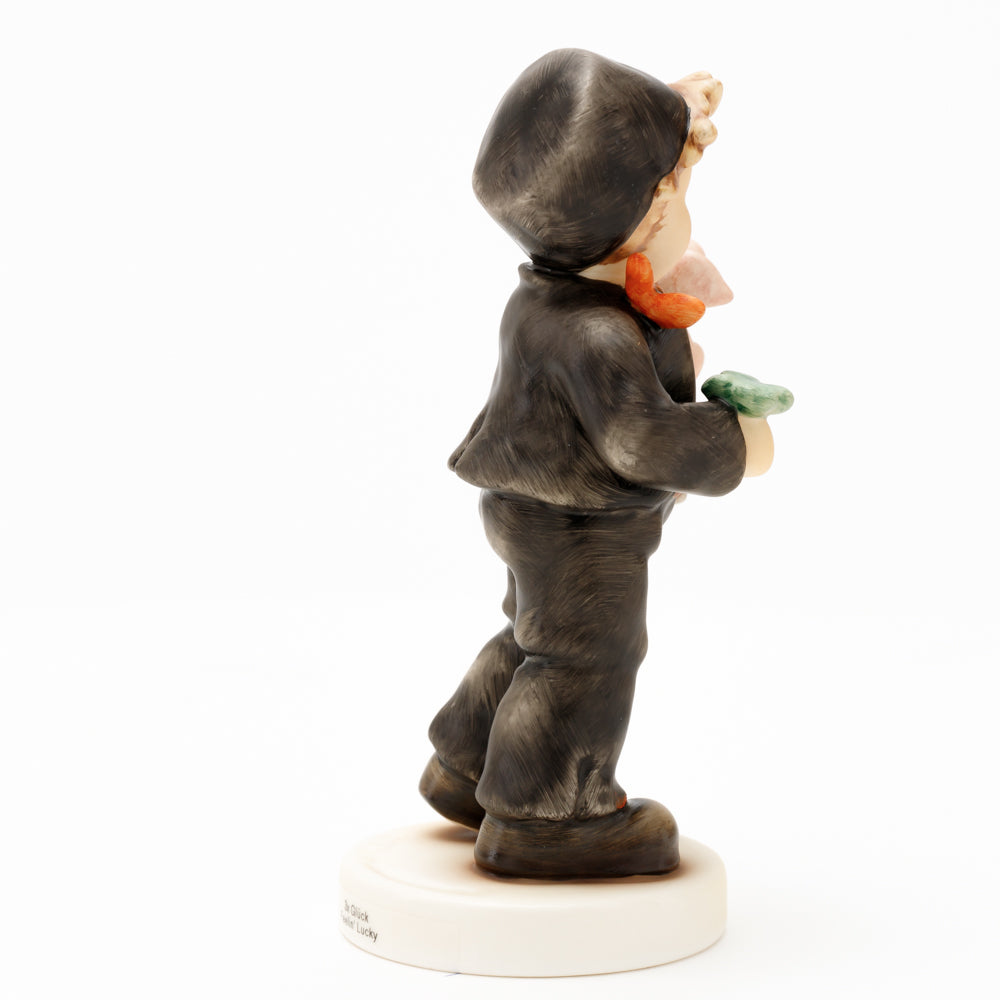 Die Figur "3x Glück" ist der neue Glücksbringer aus dem Hause Hummel! Diese original M.I. Hummel-Figur ist im Jahr 2017 entstanden und verkörpert eine Neuauflage des vor 82 Jahren entstandenen Schornsteinfegers). Der erste Schornsteinfeger wurde 1935 von Arthur Moeller modelliert. Der von Tamara Fuchs entworfene Schornsteinfeger ist ein klassisches Symbol, das Glück bringen soll. Unterstrichen wird dies noch durch das kleine rosa Schweinchen und dem vierblättrigen Kleeblatt, das die Hummel-Figur in ihren Händen hält. Deshalb entstand für diese liebevoll ausgearbeitete und handgefertigte Figur der Name "3x Glück". Komplettiert wird diese Hummel-Figur durch die Figur "Gefundenes Glück" (HUM 2379).