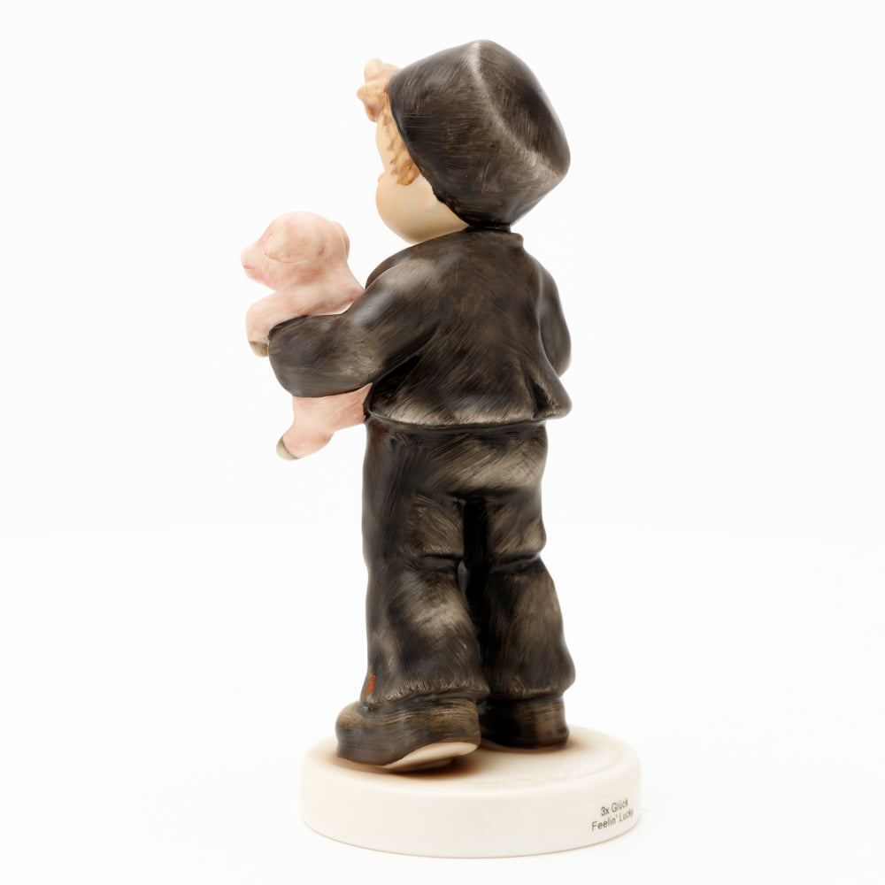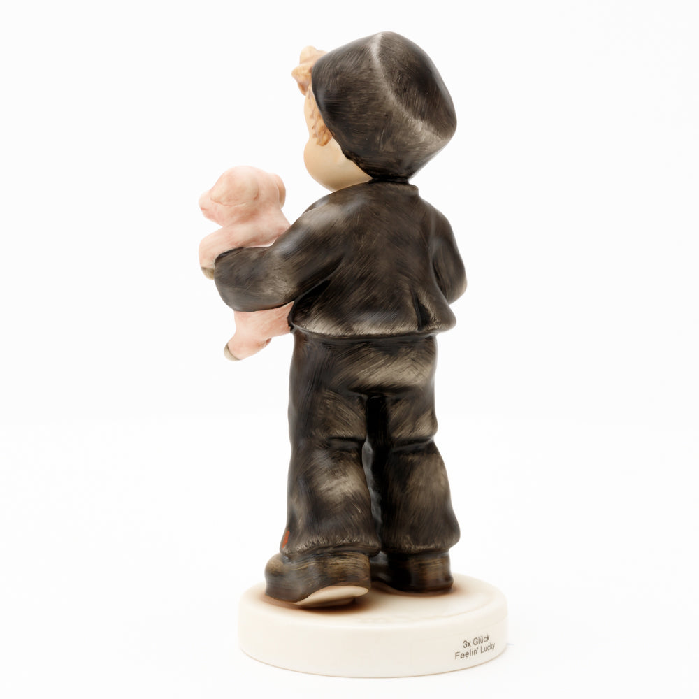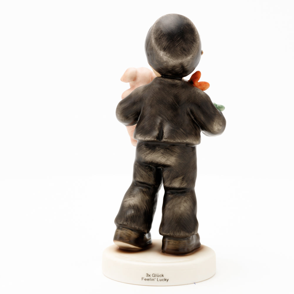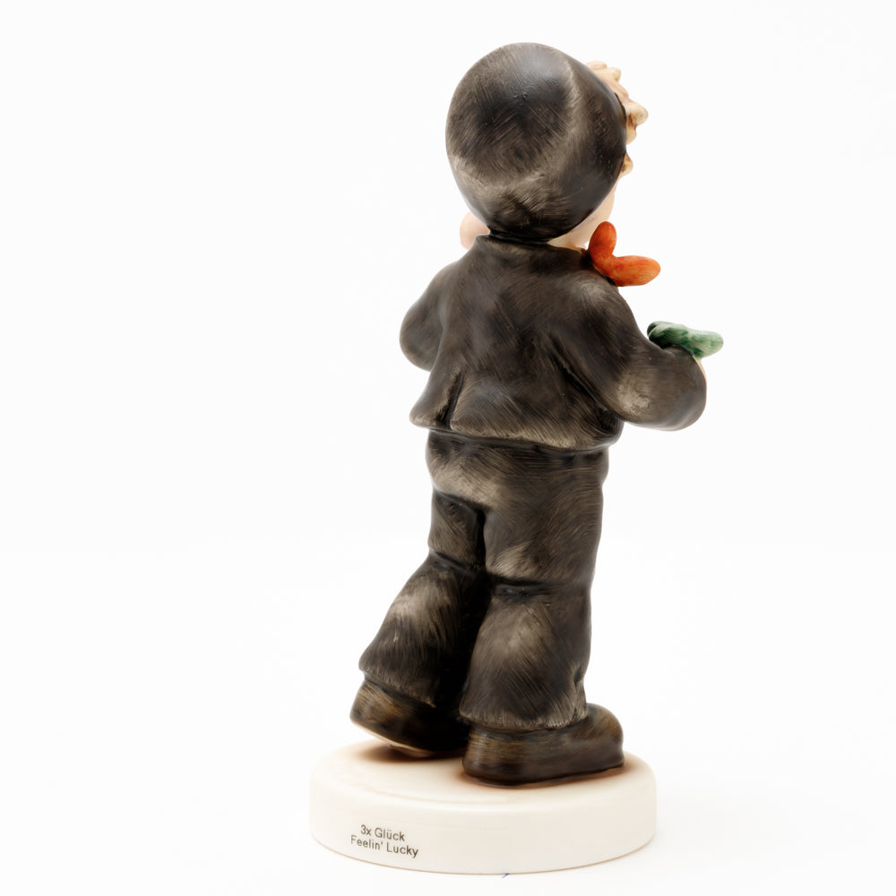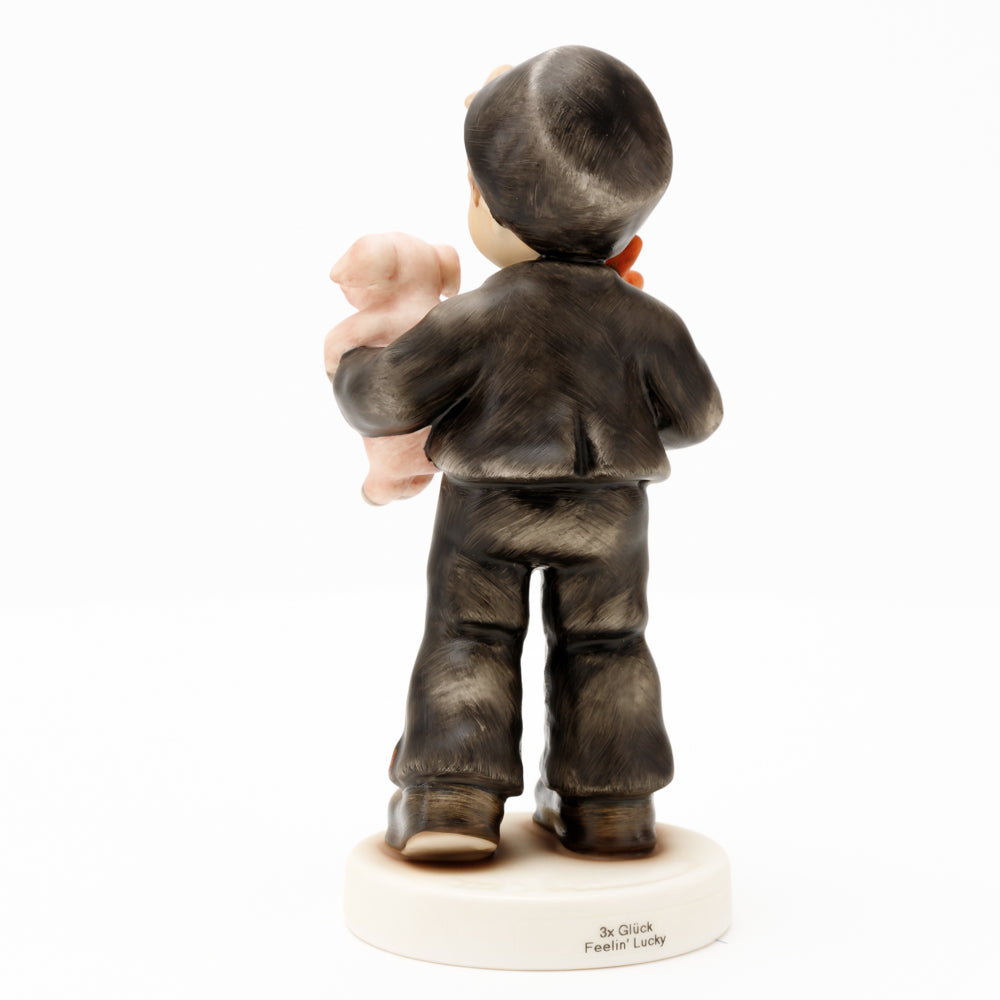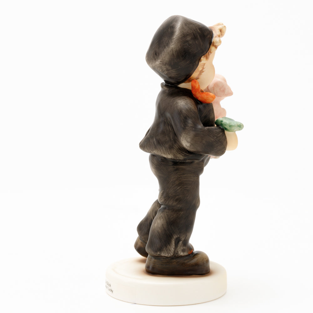 Die Figur "3x Glück" ist der neue Glücksbringer aus dem Hause Hummel! Diese original M.I. Hummel-Figur ist im Jahr 2017 entstanden und verkörpert eine Neuauflage des vor 82 Jahren entstandenen Schornsteinfegers). Der erste Schornsteinfeger wurde 1935 von Arthur Moeller modelliert. Der von Tamara Fuchs entworfene Schornsteinfeger ist ein klassisches Symbol, das Glück bringen soll. Unterstrichen wird dies noch durch das kleine rosa Schweinchen und dem vierblättrigen Kleeblatt, das die Hummel-Figur in ihren Händen hält. Deshalb entstand für diese liebevoll ausgearbeitete und handgefertigte Figur der Name "3x Glück". Komplettiert wird diese Hummel-Figur durch die Figur "Gefundenes Glück" (HUM 2379).