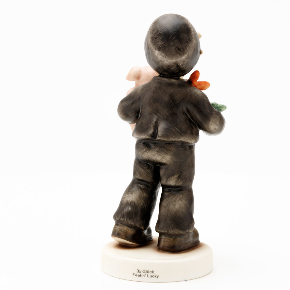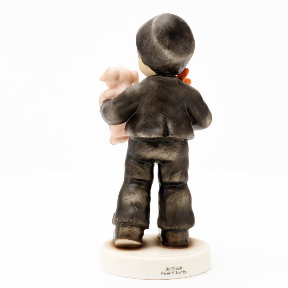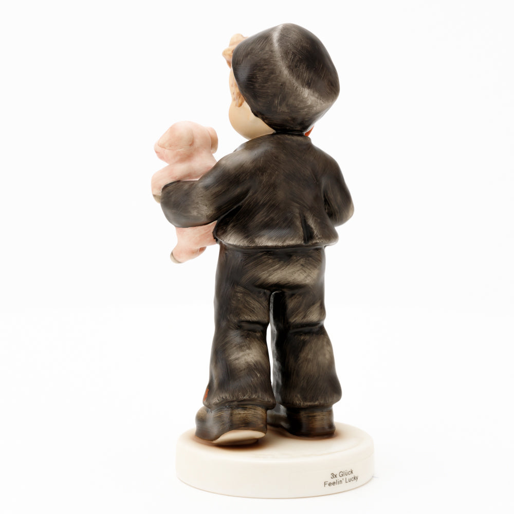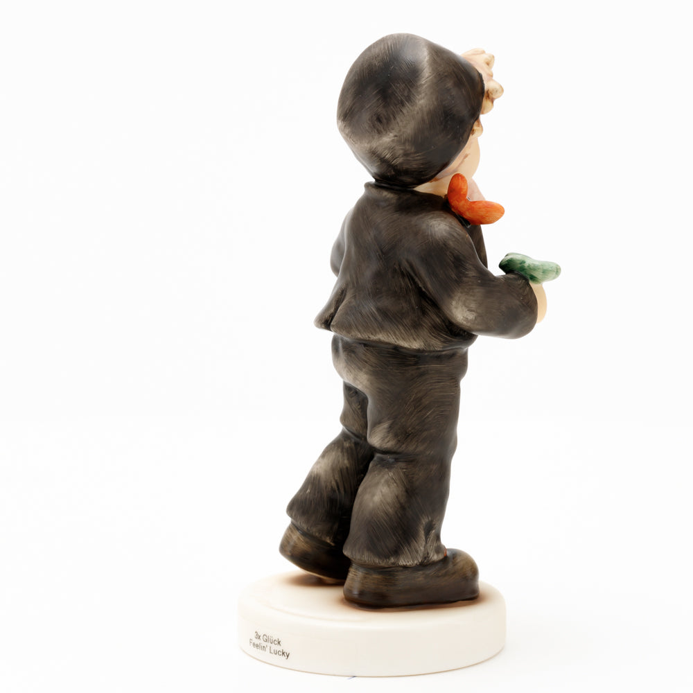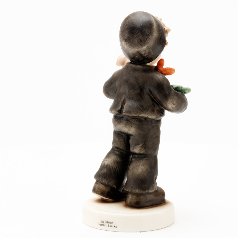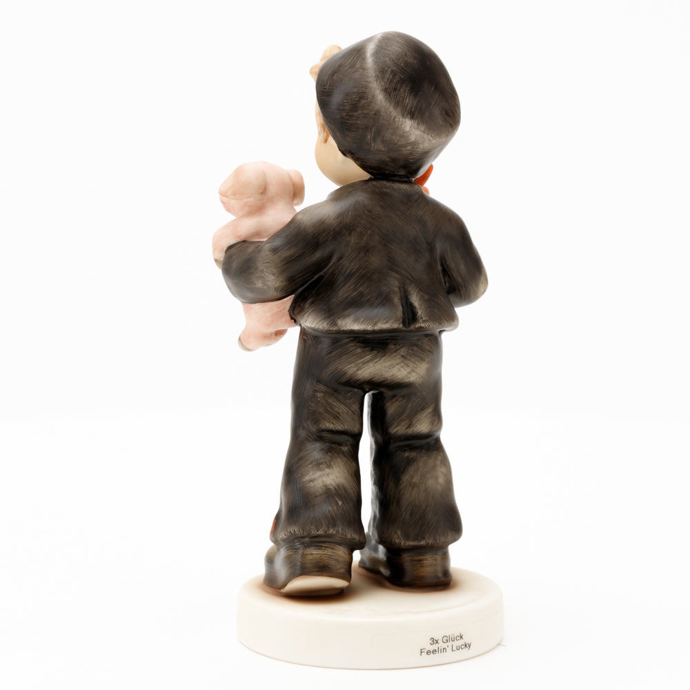 Die Figur "3x Glück" ist der neue Glücksbringer aus dem Hause Hummel! Diese original M.I. Hummel-Figur ist im Jahr 2017 entstanden und verkörpert eine Neuauflage des vor 82 Jahren entstandenen Schornsteinfegers). Der erste Schornsteinfeger wurde 1935 von Arthur Moeller modelliert. Der von Tamara Fuchs entworfene Schornsteinfeger ist ein klassisches Symbol, das Glück bringen soll. Unterstrichen wird dies noch durch das kleine rosa Schweinchen und dem vierblättrigen Kleeblatt, das die Hummel-Figur in ihren Händen hält. Deshalb entstand für diese liebevoll ausgearbeitete und handgefertigte Figur der Name "3x Glück". Komplettiert wird diese Hummel-Figur durch die Figur "Gefundenes Glück" (HUM 2379).