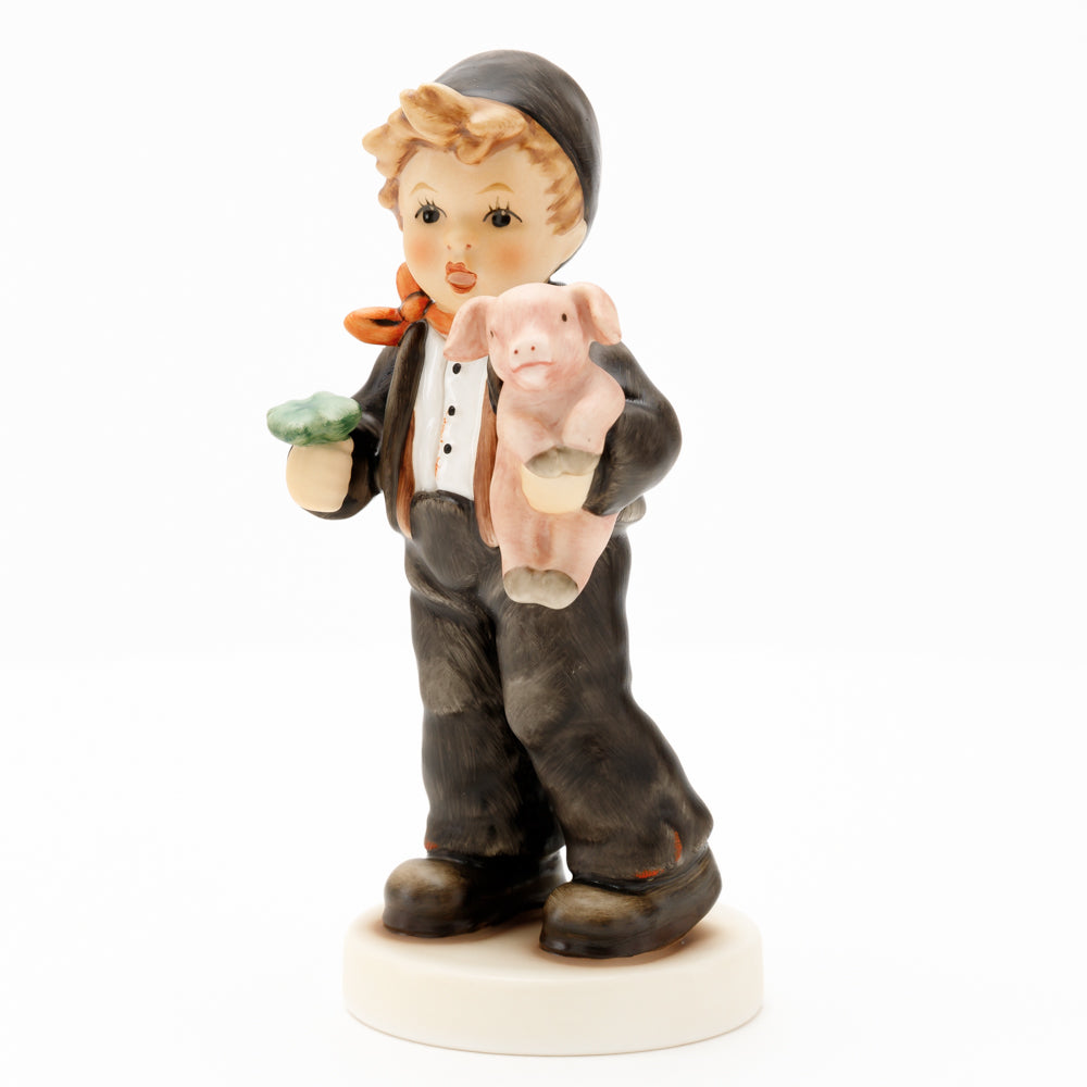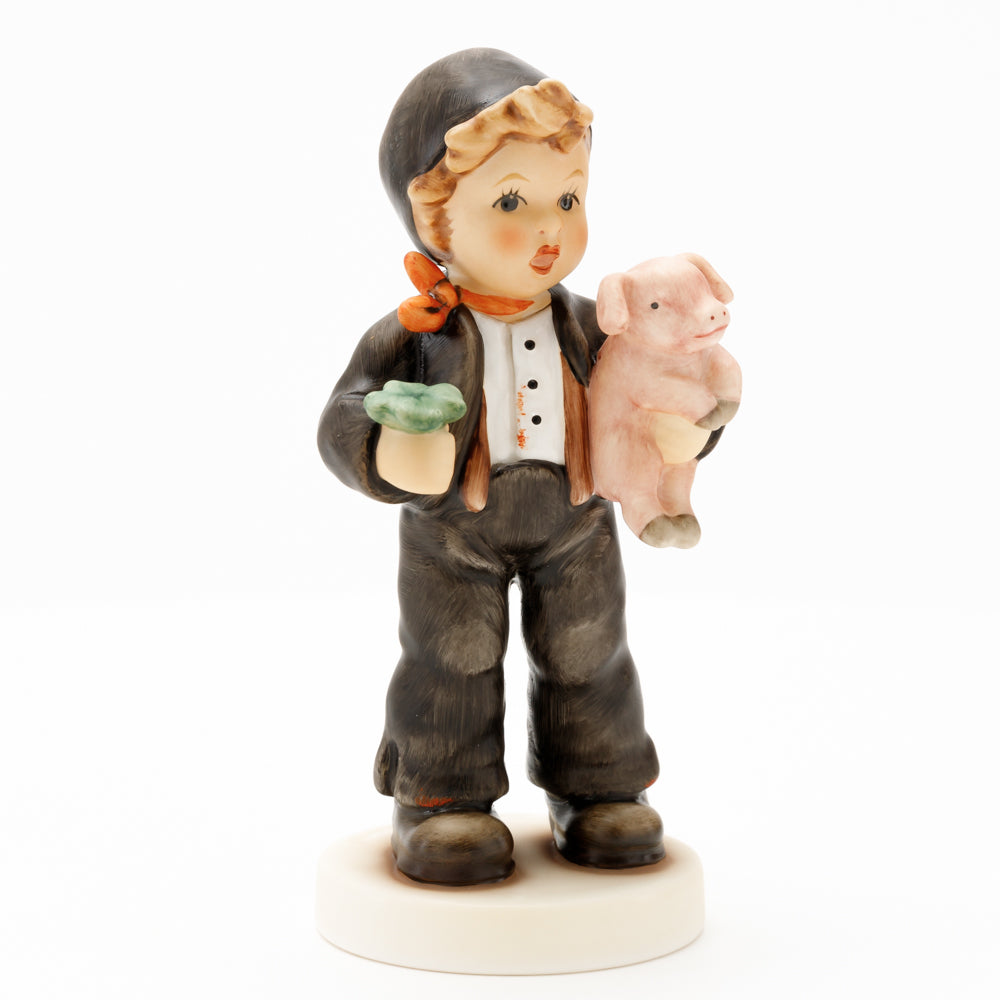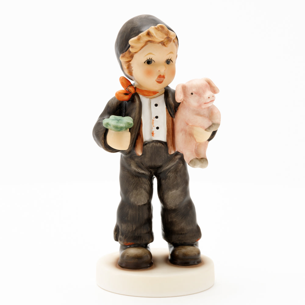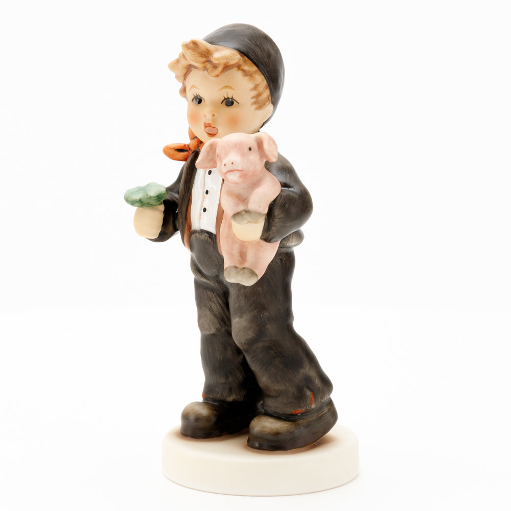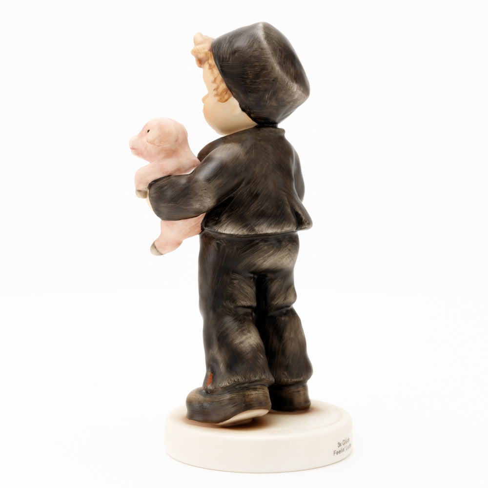 Die Figur "3x Glück" ist der neue Glücksbringer aus dem Hause Hummel! Diese original M.I. Hummel-Figur ist im Jahr 2017 entstanden und verkörpert eine Neuauflage des vor 82 Jahren entstandenen Schornsteinfegers). Der erste Schornsteinfeger wurde 1935 von Arthur Moeller modelliert. Der von Tamara Fuchs entworfene Schornsteinfeger ist ein klassisches Symbol, das Glück bringen soll. Unterstrichen wird dies noch durch das kleine rosa Schweinchen und dem vierblättrigen Kleeblatt, das die Hummel-Figur in ihren Händen hält. Deshalb entstand für diese liebevoll ausgearbeitete und handgefertigte Figur der Name "3x Glück". Komplettiert wird diese Hummel-Figur durch die Figur "Gefundenes Glück" (HUM 2379).