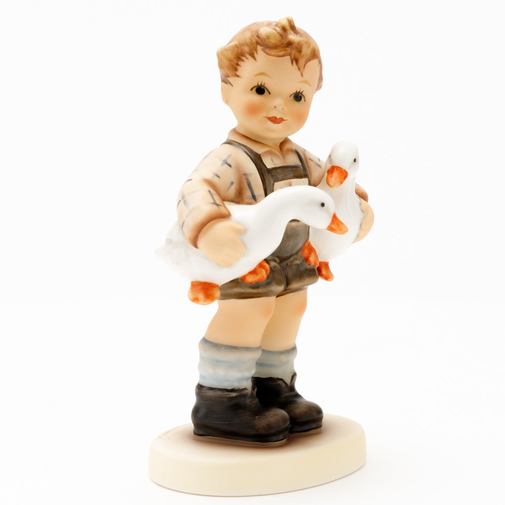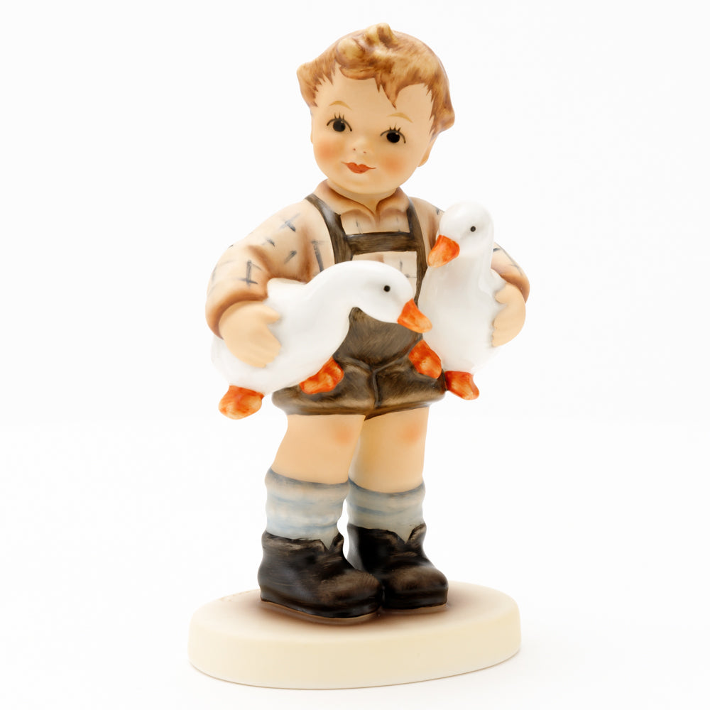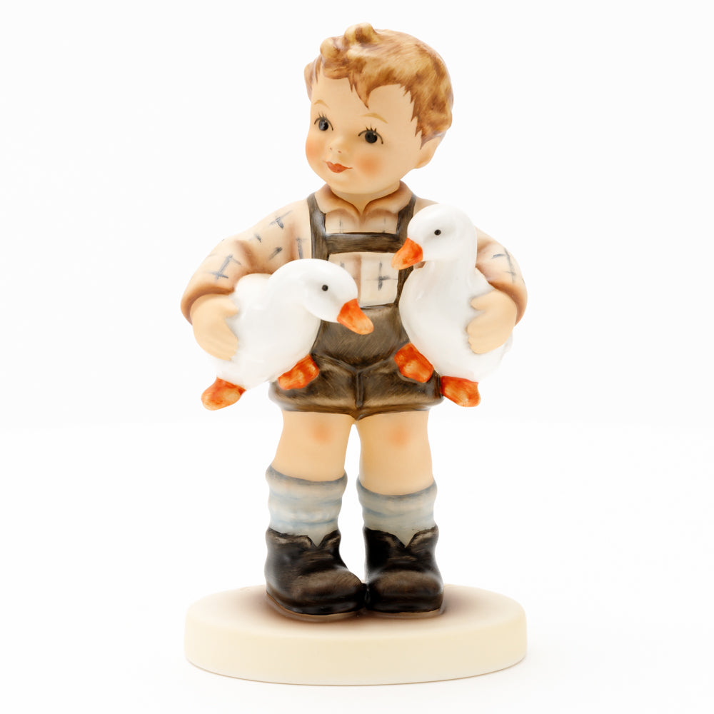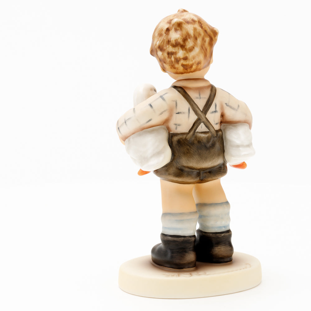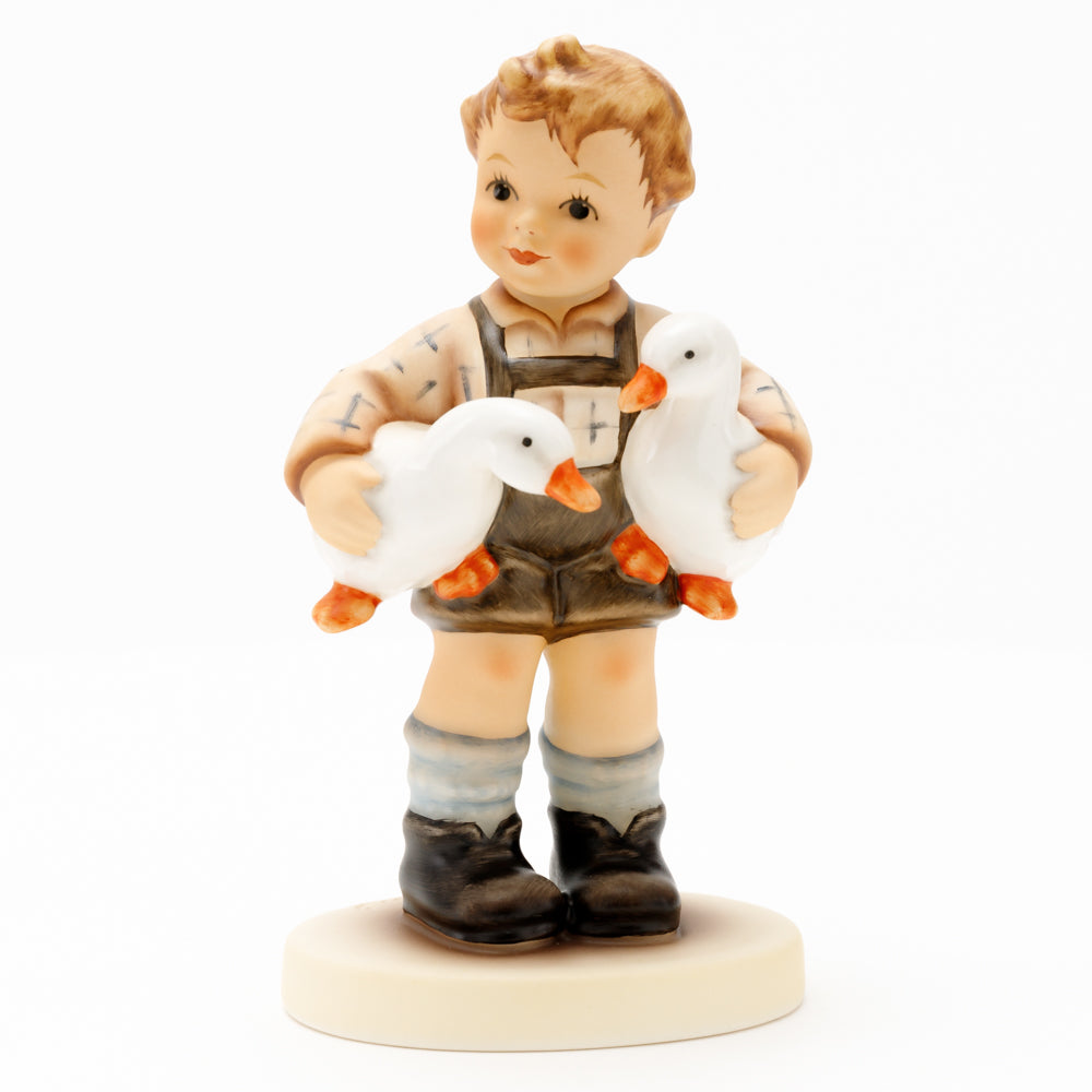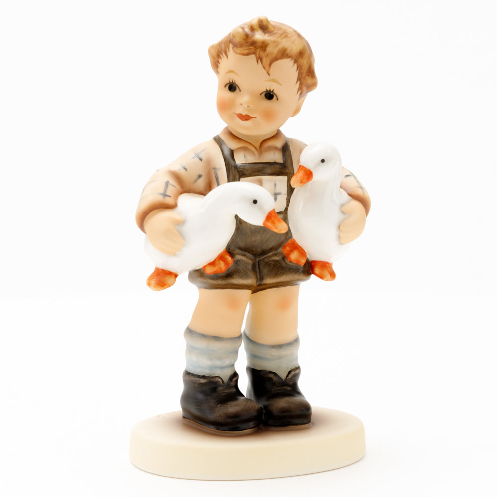 Diese original handgefertigte Hummel-Figur ist nicht nur zu den Osterfeiertagen eine Augenweide! Der "Entenbub" (HUM 2394) besticht auf den ersten Blick durch die in besonderem Glanz gefertigten Entlein. Eine weitere besondere, aber dennoch traditionelle Eigenschaft der von Marion Huschka modellierten Figur ist die Tatsache, dass die Hummel-Figur typisch bayerische Lederhosen trägt. Somit zeigt der Hummel-Junge die Verbundenheit zu seiner aus Bayern stammenden Schöpferin Maria Innocentia Hummel. Die bessere Hälfte der Hummel-Figur findet man in der Figur "Entenmadl" (HUM 2393). Auch diese ist in der typisch traditionellen Hummel-Optik gehalten. Denn der Hummel Manufaktur aus dem oberfränkischen Rödental ist es seit über 80 Jahren eine Herzensangelegenheit, durch einzigartige Handwerkskunst herauszuragen. Demnach werden diese wertvollen Keramikfiguren mit reinster Präzision erschaffen.