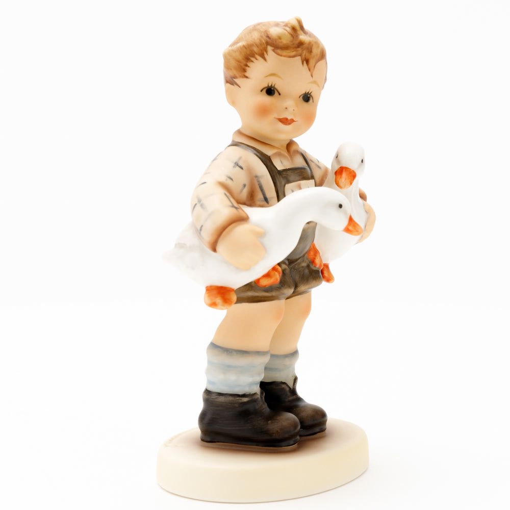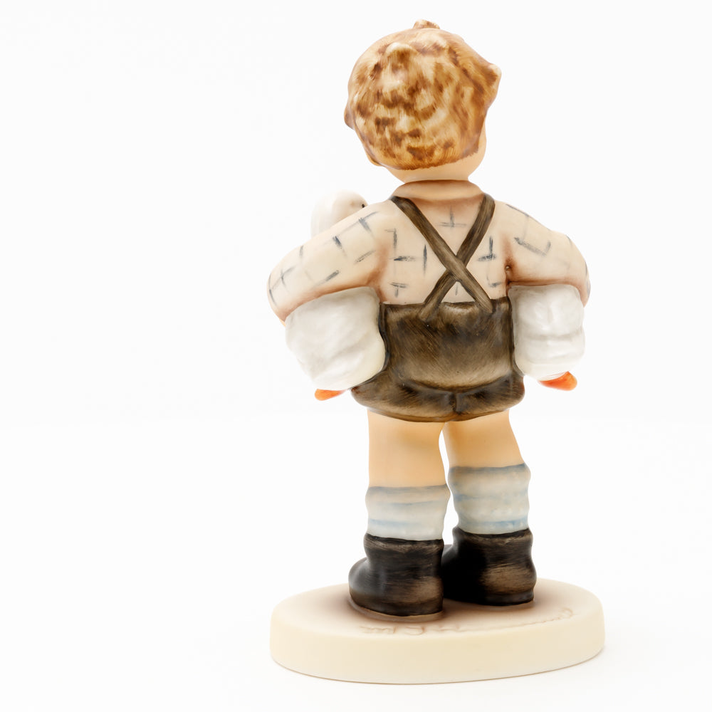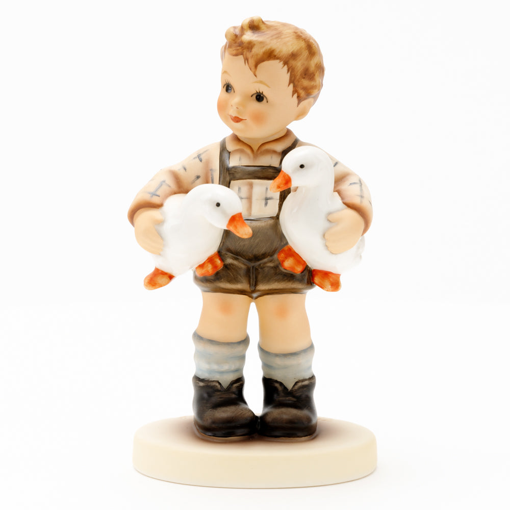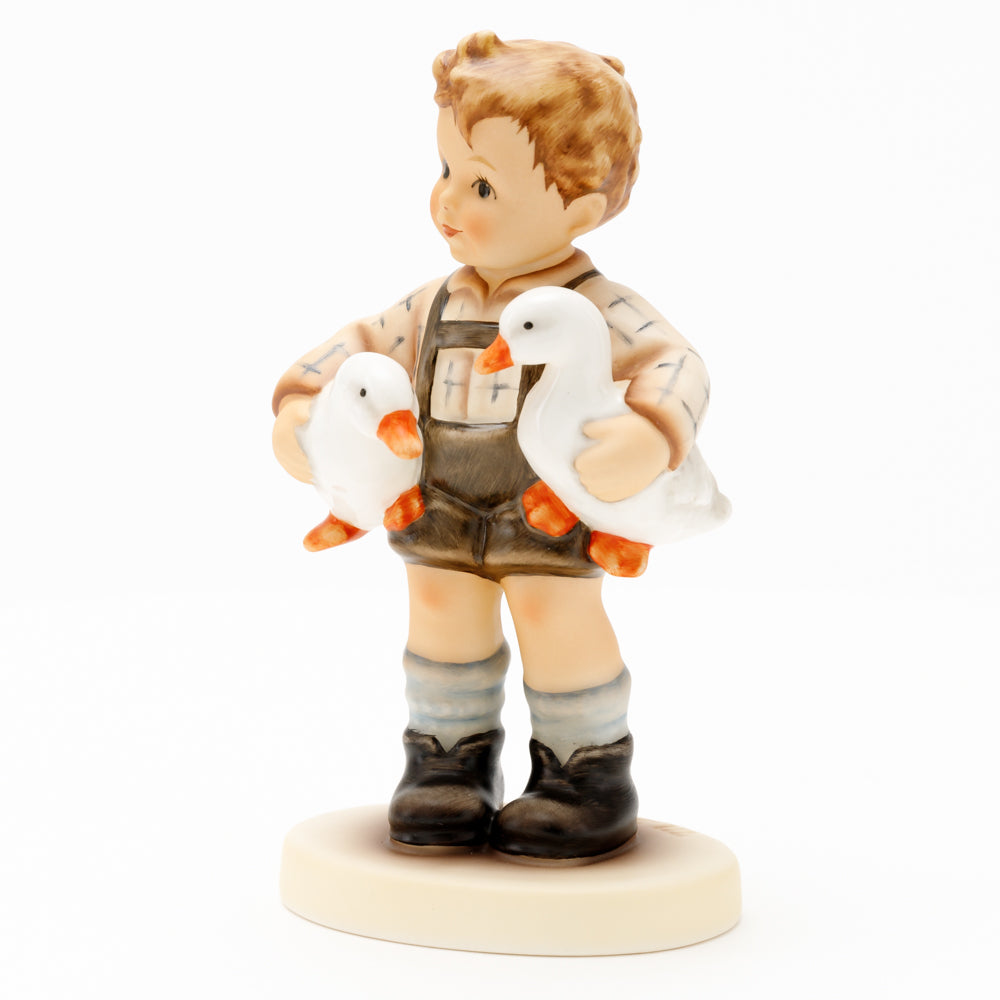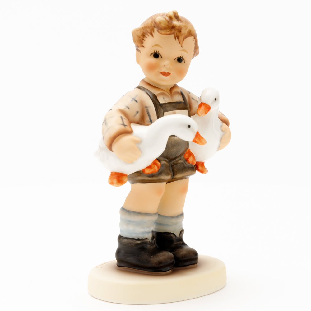 Diese original handgefertigte Hummel-Figur ist nicht nur zu den Osterfeiertagen eine Augenweide! Der "Entenbub" (HUM 2394) besticht auf den ersten Blick durch die in besonderem Glanz gefertigten Entlein. Eine weitere besondere, aber dennoch traditionelle Eigenschaft der von Marion Huschka modellierten Figur ist die Tatsache, dass die Hummel-Figur typisch bayerische Lederhosen trägt. Somit zeigt der Hummel-Junge die Verbundenheit zu seiner aus Bayern stammenden Schöpferin Maria Innocentia Hummel. Die bessere Hälfte der Hummel-Figur findet man in der Figur "Entenmadl" (HUM 2393). Auch diese ist in der typisch traditionellen Hummel-Optik gehalten. Denn der Hummel Manufaktur aus dem oberfränkischen Rödental ist es seit über 80 Jahren eine Herzensangelegenheit, durch einzigartige Handwerkskunst herauszuragen. Demnach werden diese wertvollen Keramikfiguren mit reinster Präzision erschaffen.