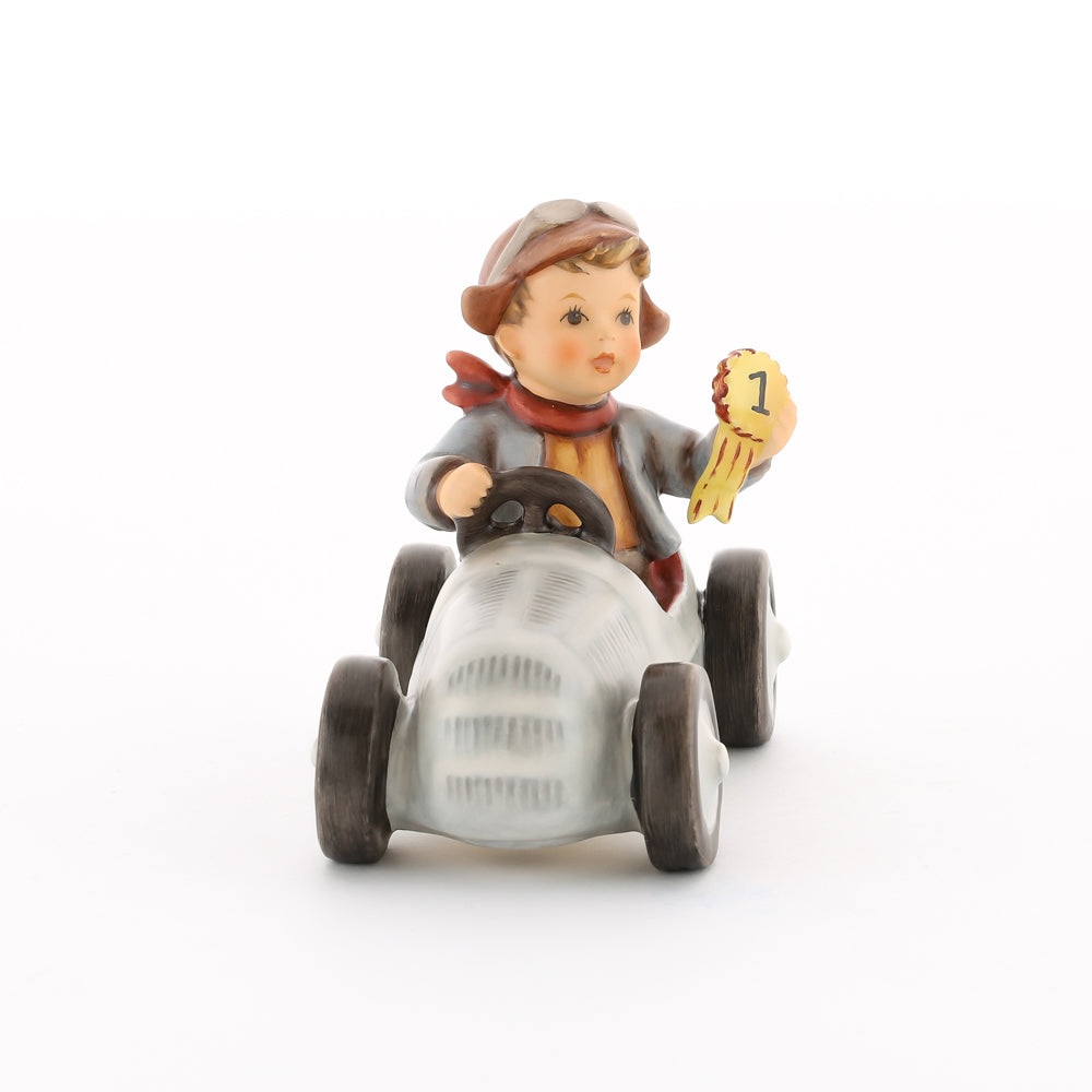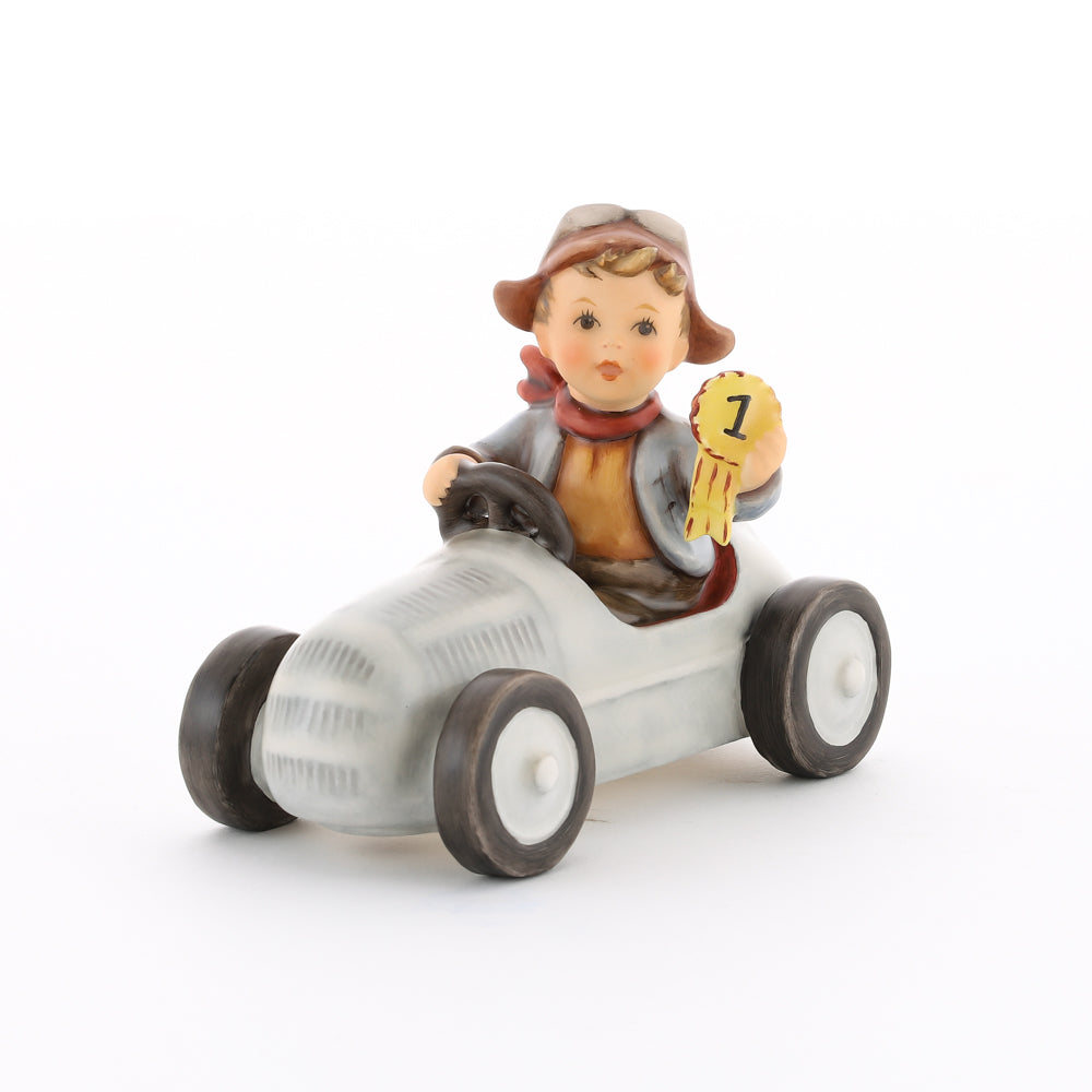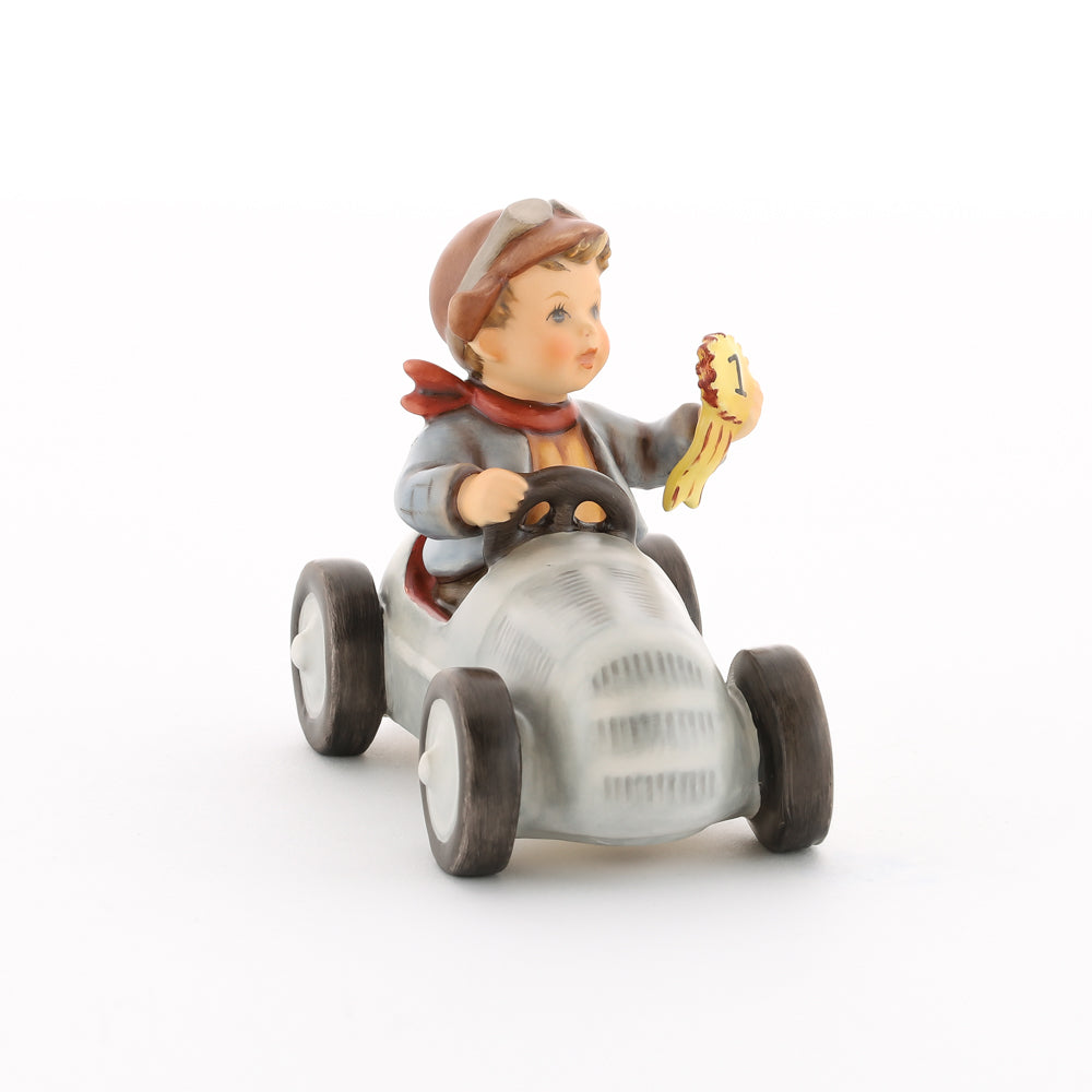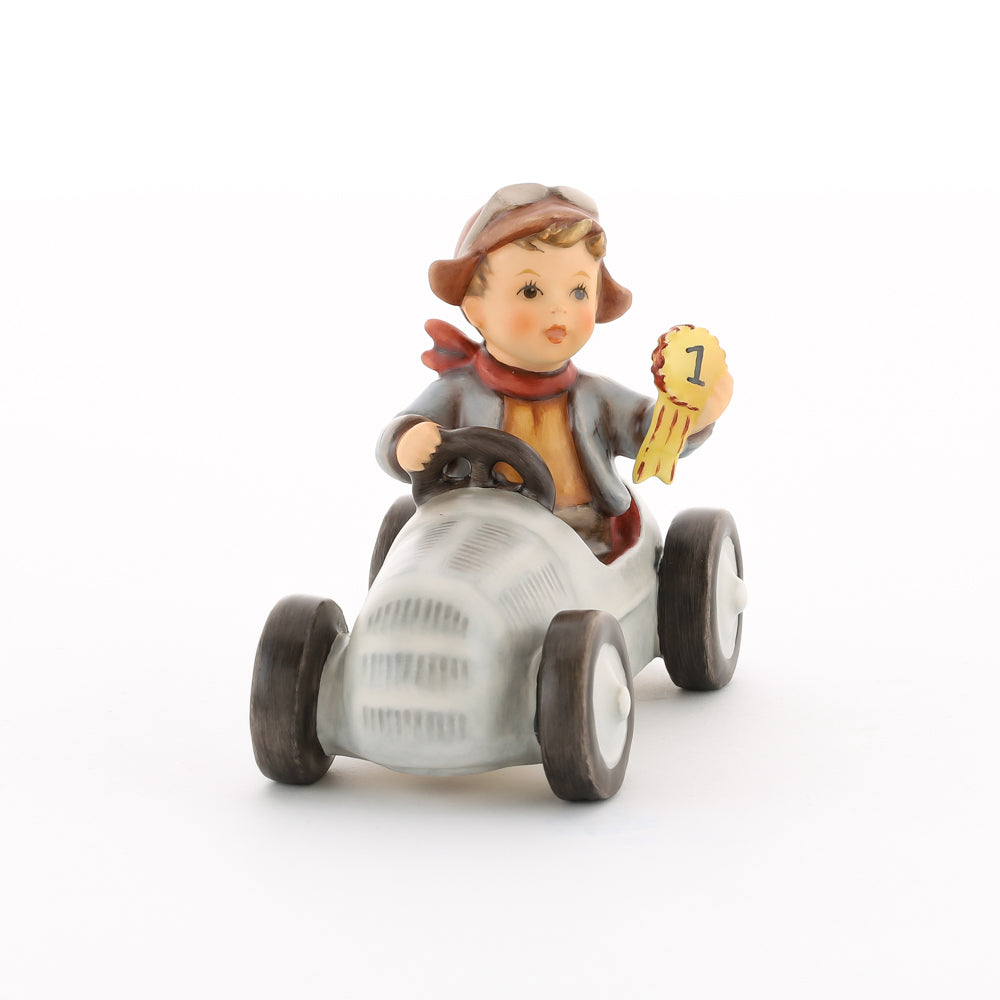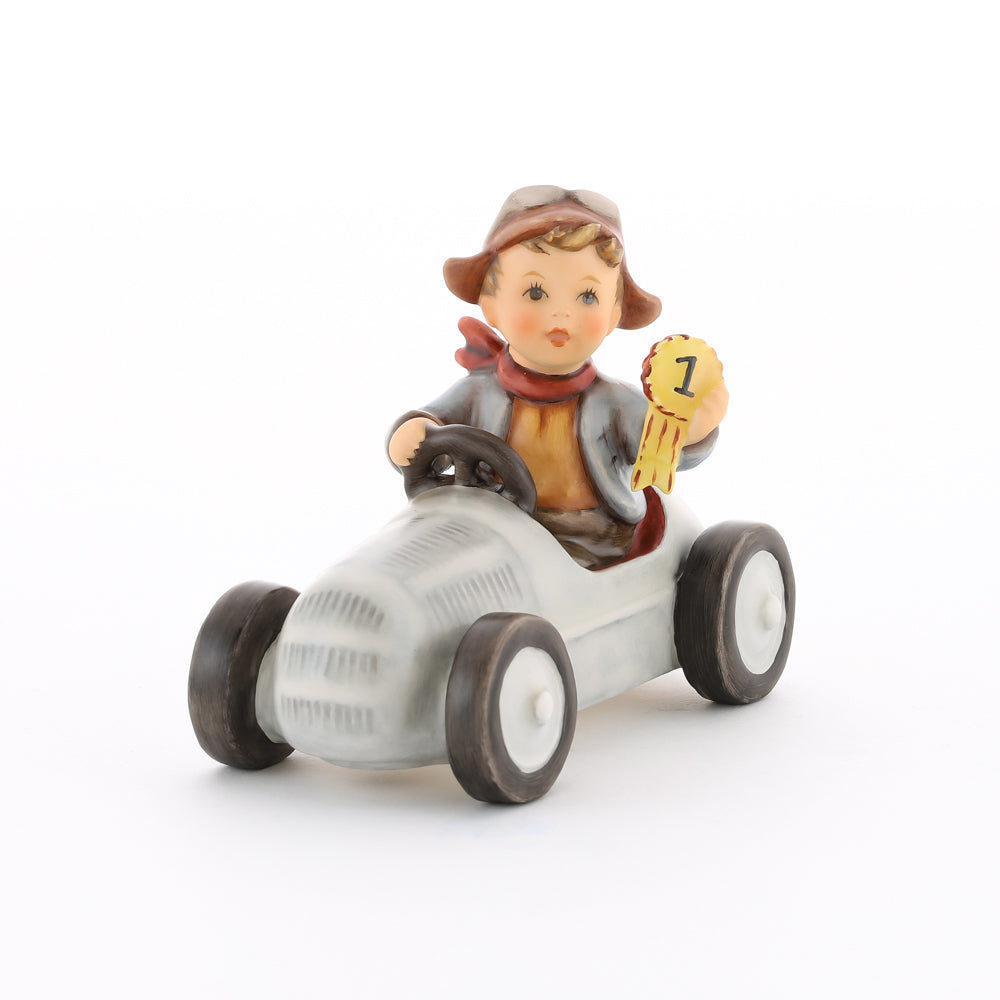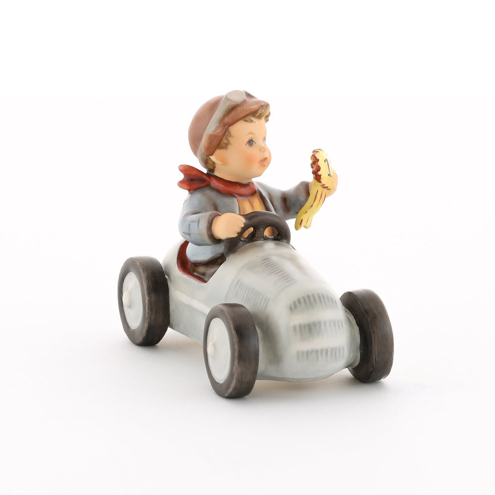 Die Kraft der Motoren, die Faszination der Geschwindigkeit, der Mut zum Risiko, die taktischen Winkelzüge auf der Strecke: Der Autorennsport fesselt die Menschen weltweit. Seit es Autos gibt, suchen Fahrer den Wettbewerb – und Kinder ahmen sie nach. Auch unser Hummel-Junge ist vom Autofahren fasziniert und fühlt sich in seiner Seifenkiste pudelwohl. Für ihn ist das silberne Gefährt aber sicherlich ein waschechter Rennwagen – umso glücklicher hält er seinen Preis für den ersten Platz in der Hand. „Ich habe gewonnen!", ruft er und strahlt über das ganze Gesicht – die Fliegermütze und -brille wackelt auf seinem Kopf.