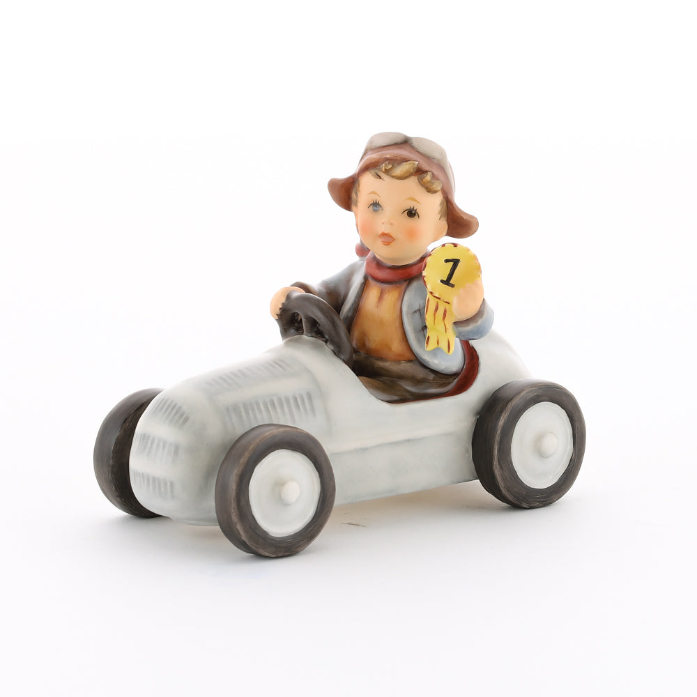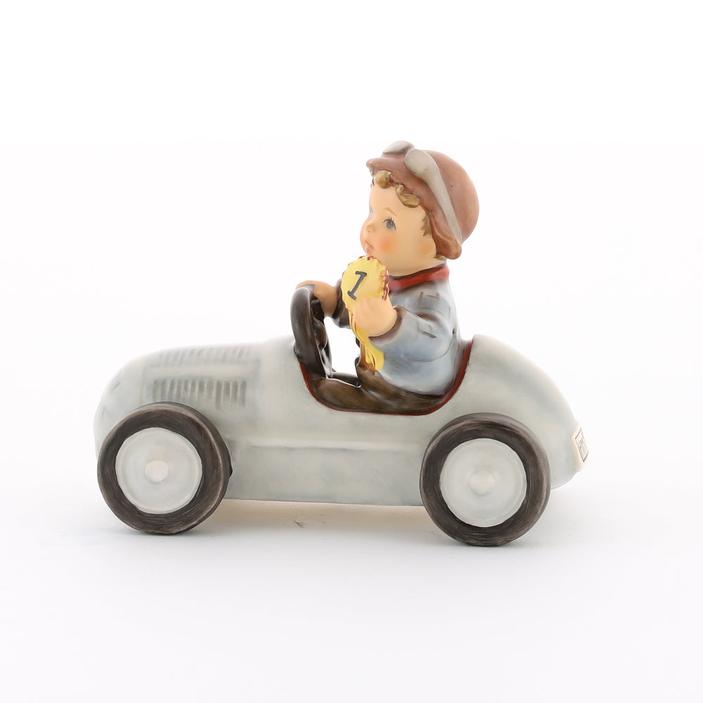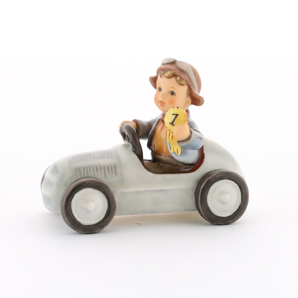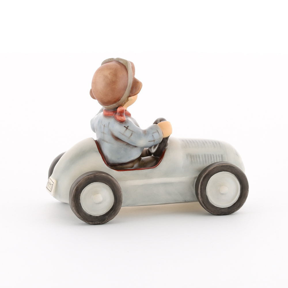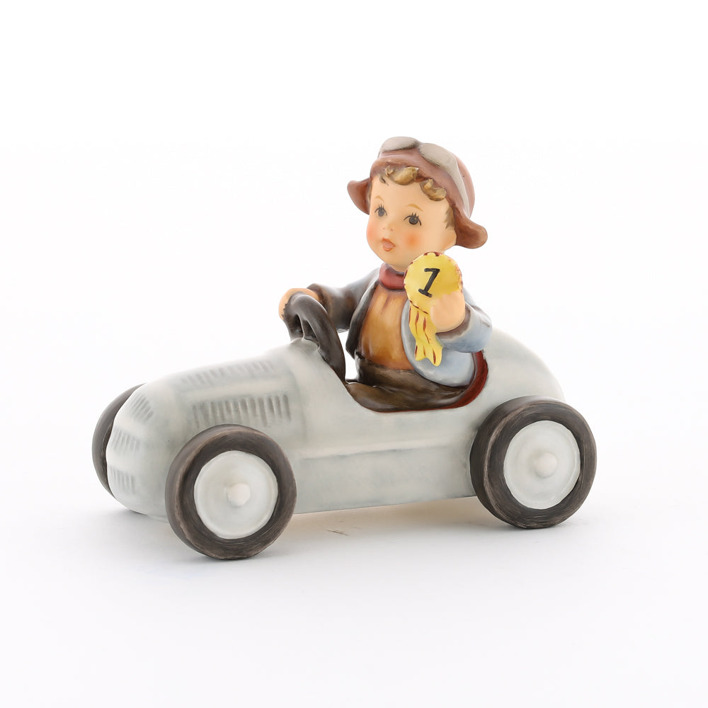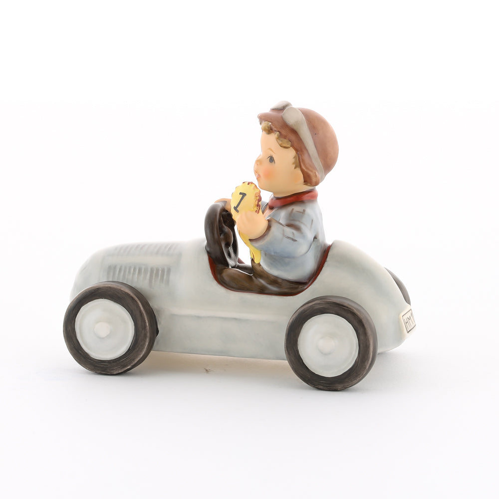 Die Kraft der Motoren, die Faszination der Geschwindigkeit, der Mut zum Risiko, die taktischen Winkelzüge auf der Strecke: Der Autorennsport fesselt die Menschen weltweit. Seit es Autos gibt, suchen Fahrer den Wettbewerb – und Kinder ahmen sie nach. Auch unser Hummel-Junge ist vom Autofahren fasziniert und fühlt sich in seiner Seifenkiste pudelwohl. Für ihn ist das silberne Gefährt aber sicherlich ein waschechter Rennwagen – umso glücklicher hält er seinen Preis für den ersten Platz in der Hand. „Ich habe gewonnen!", ruft er und strahlt über das ganze Gesicht – die Fliegermütze und -brille wackelt auf seinem Kopf.