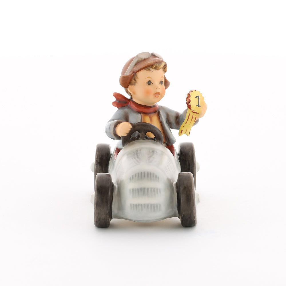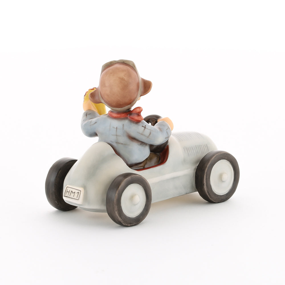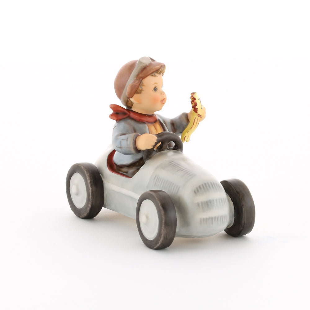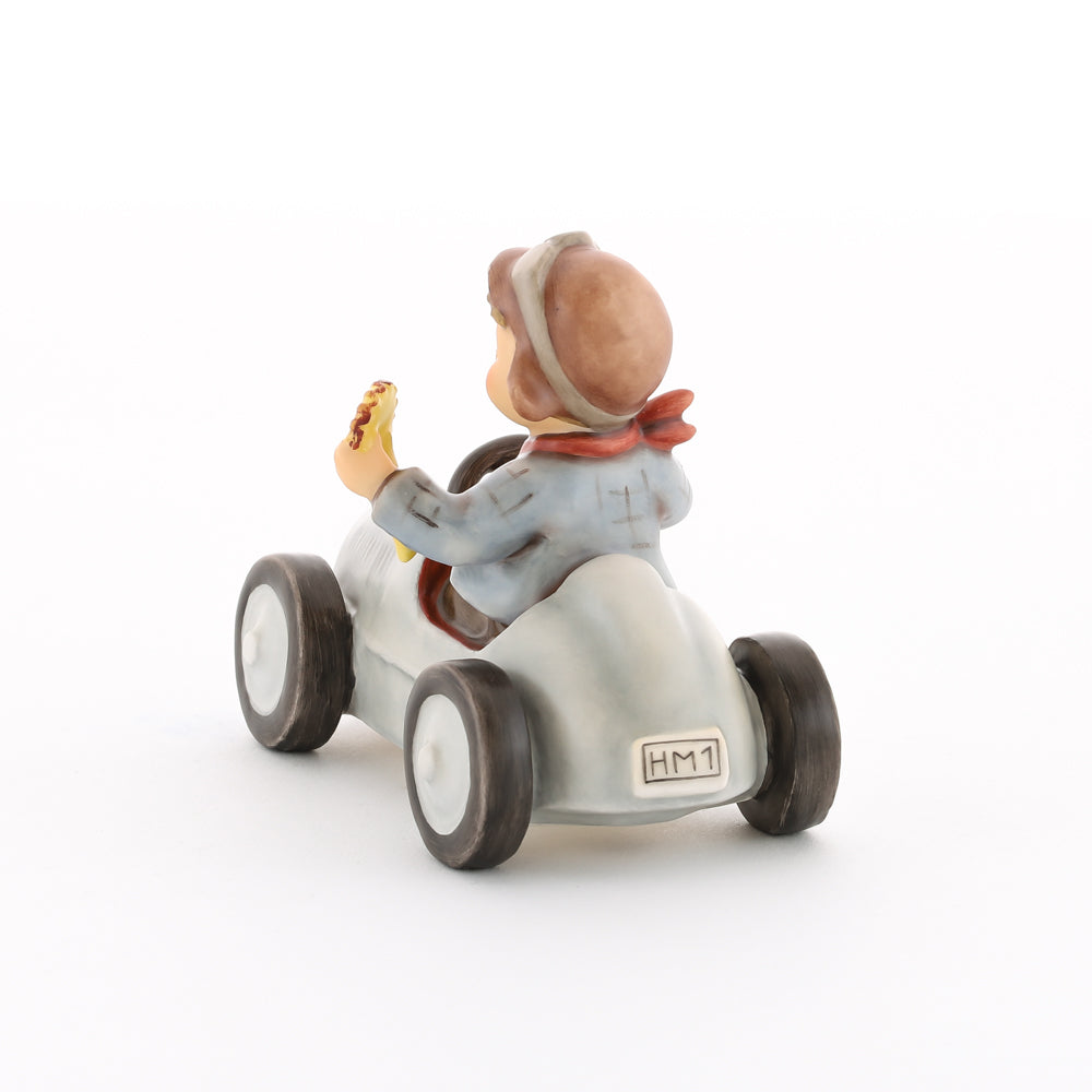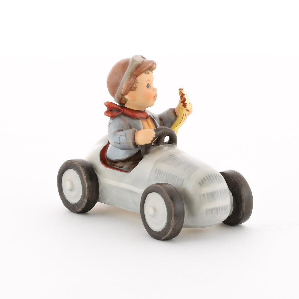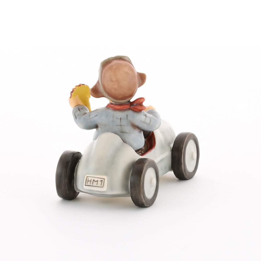 Die Kraft der Motoren, die Faszination der Geschwindigkeit, der Mut zum Risiko, die taktischen Winkelzüge auf der Strecke: Der Autorennsport fesselt die Menschen weltweit. Seit es Autos gibt, suchen Fahrer den Wettbewerb – und Kinder ahmen sie nach. Auch unser Hummel-Junge ist vom Autofahren fasziniert und fühlt sich in seiner Seifenkiste pudelwohl. Für ihn ist das silberne Gefährt aber sicherlich ein waschechter Rennwagen – umso glücklicher hält er seinen Preis für den ersten Platz in der Hand. „Ich habe gewonnen!", ruft er und strahlt über das ganze Gesicht – die Fliegermütze und -brille wackelt auf seinem Kopf.