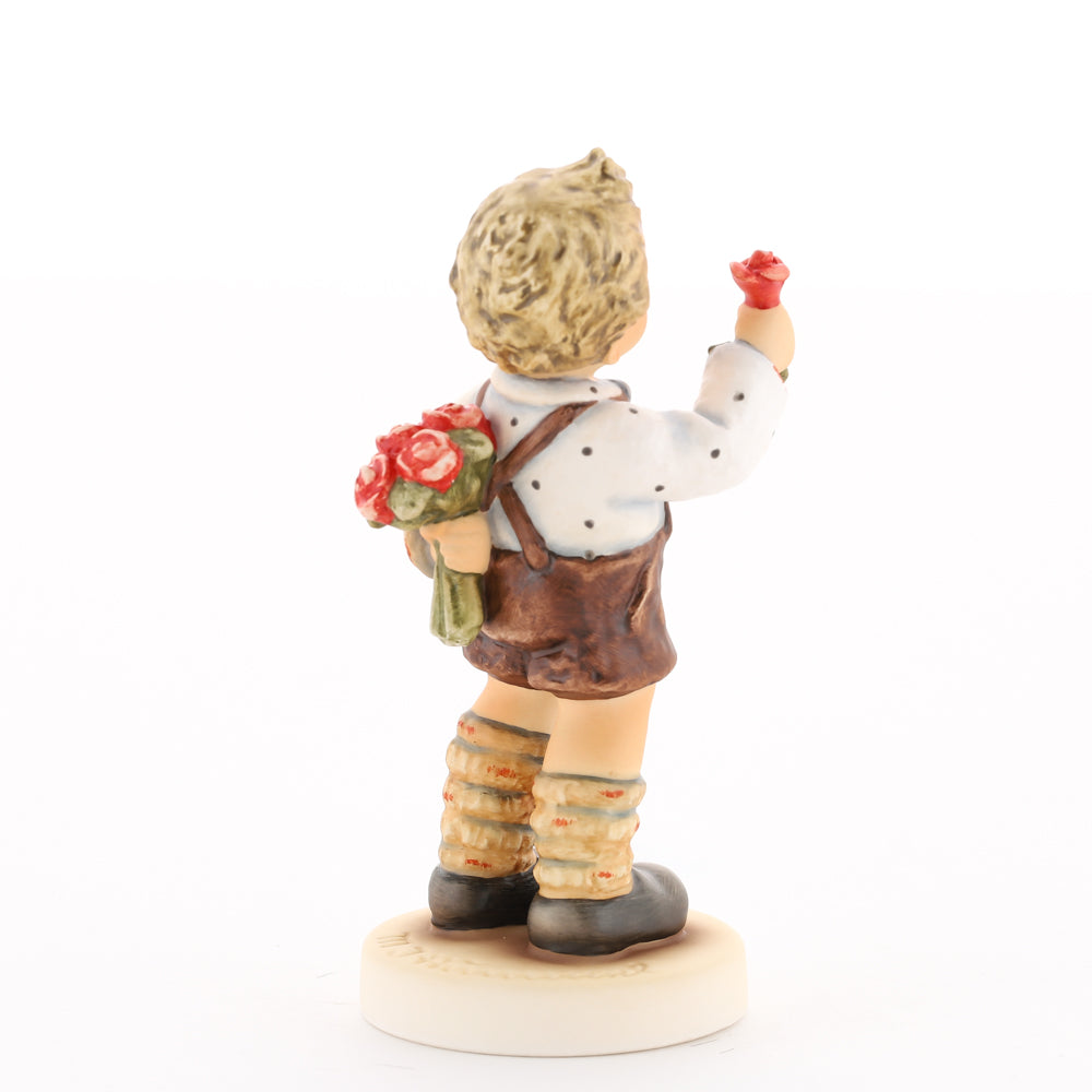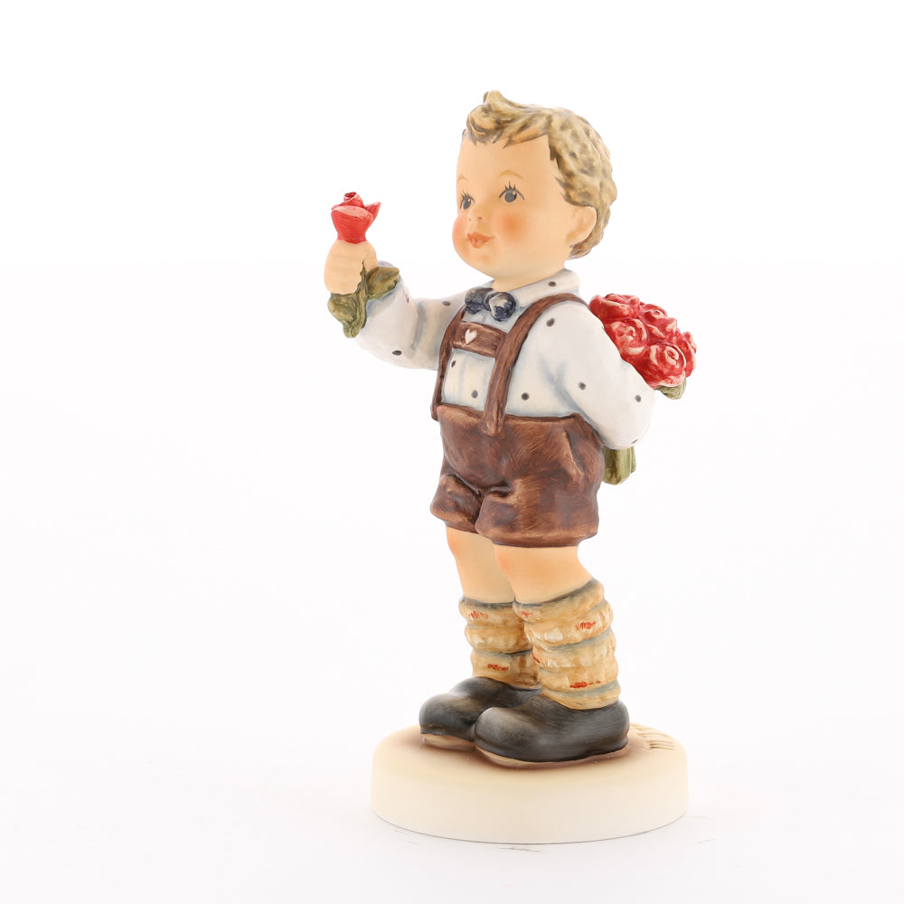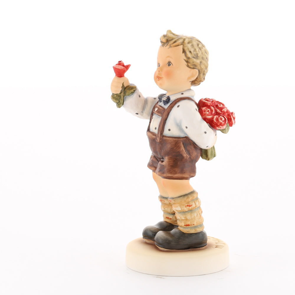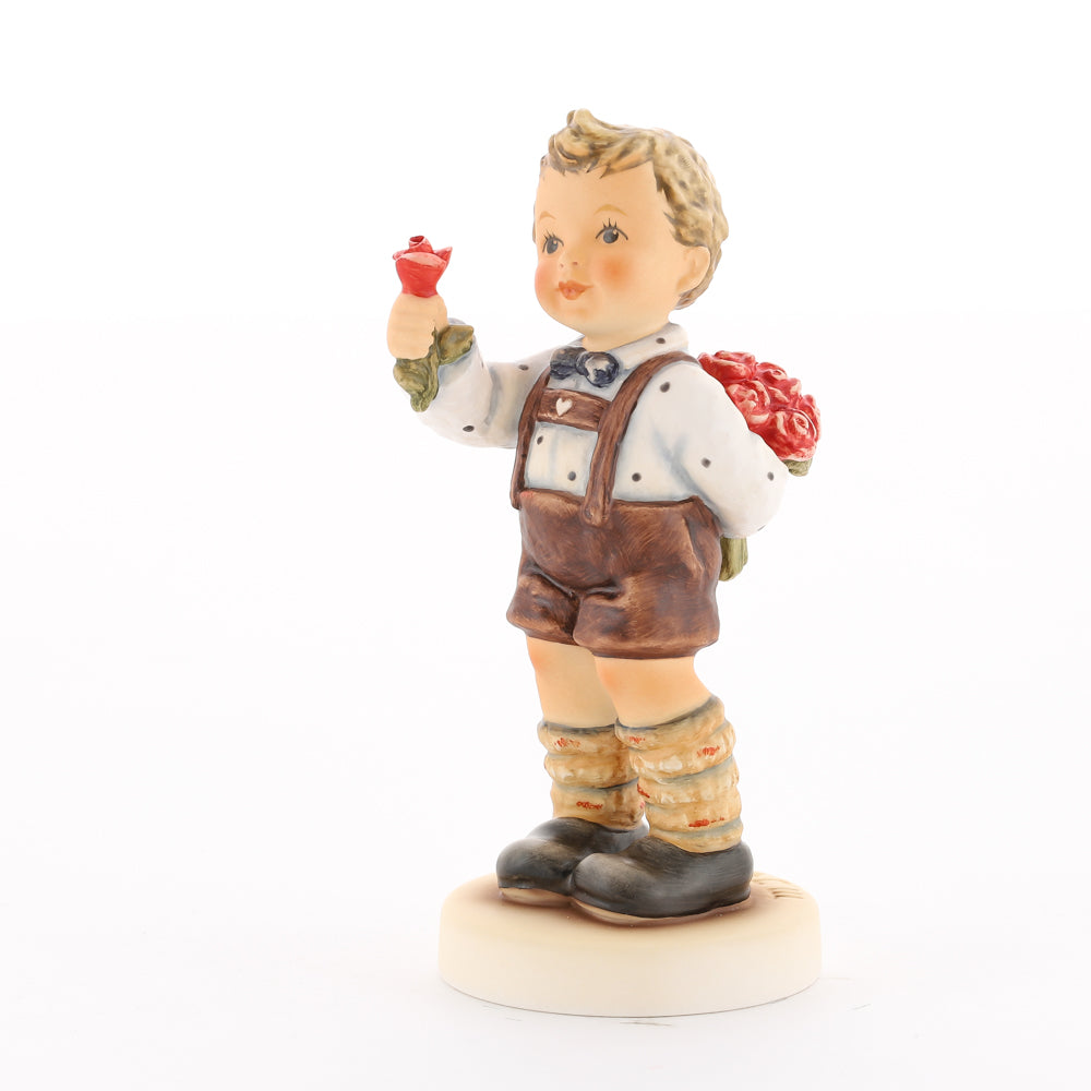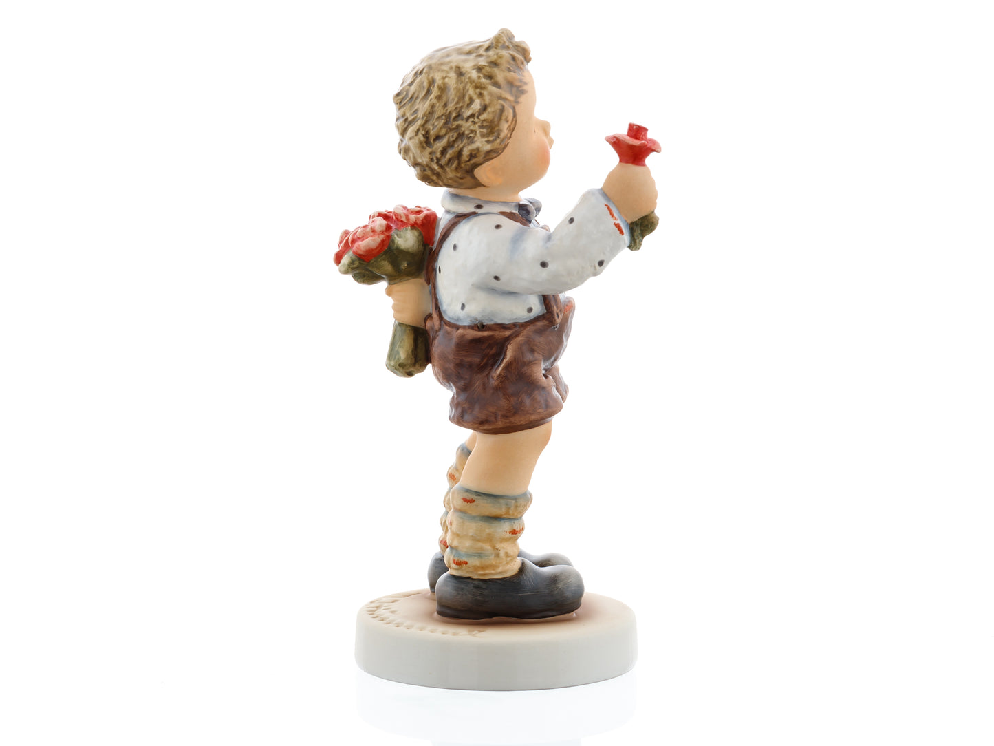 Die einzelne Rose in der Hand macht diese Figur zu einer Besonderheit: Die Blüte wird nicht gegossen, sondern in der Manufaktur jeweils von Hand geformt. Dabei besinnen sich unsere Keramiker einer alten Handwerkskunst, wie sie auch heute noch in der figürlichen Porzellankunst in traditionellen deutschen Manufakturen praktiziert wird. Drei filigrane Blütenblätter und eine Knospe werden von Hand geformt. Diese Technik wurde bisher noch nie bei einer Hummel-Figur angewendet.