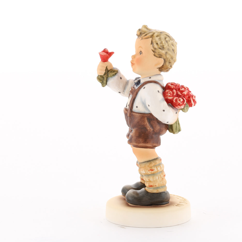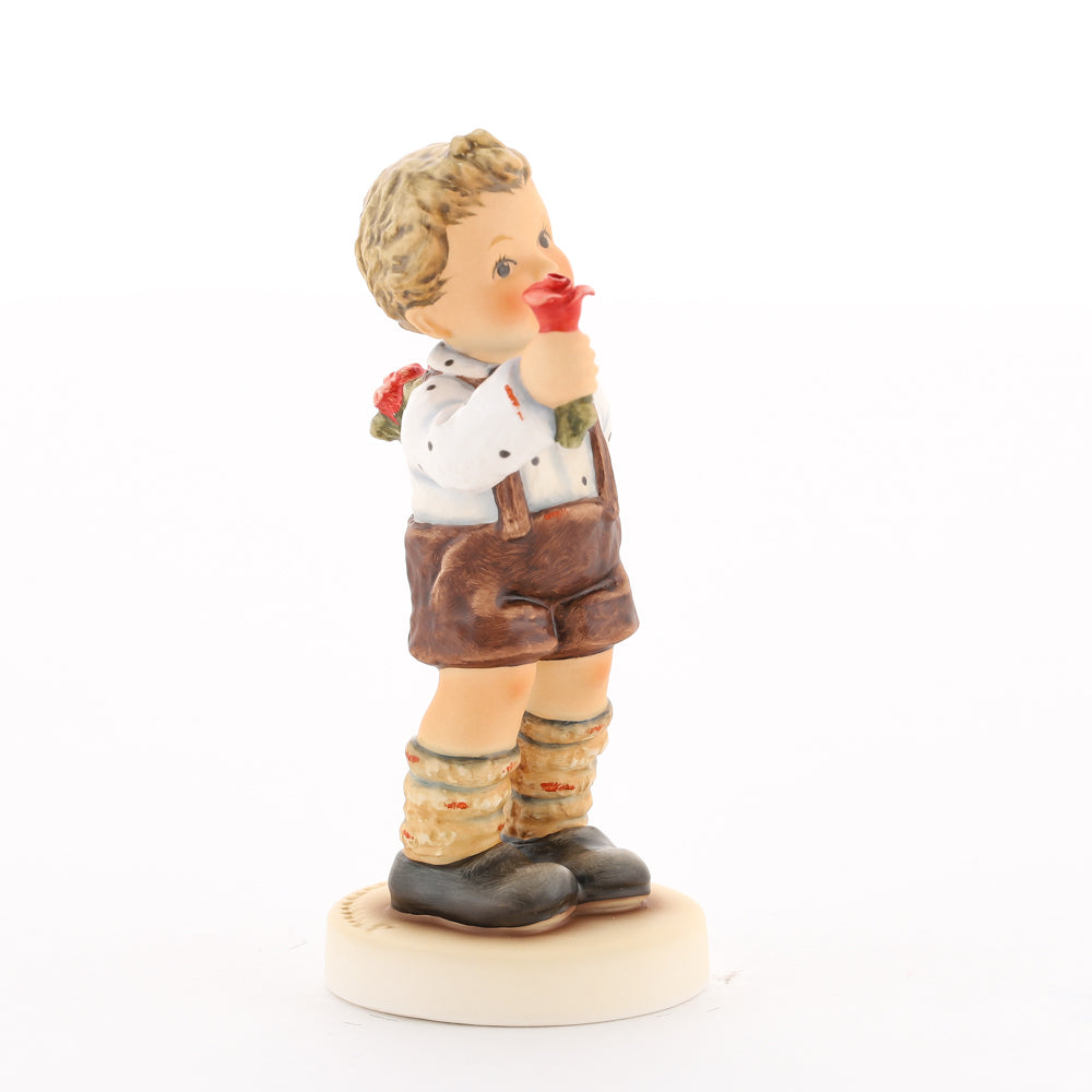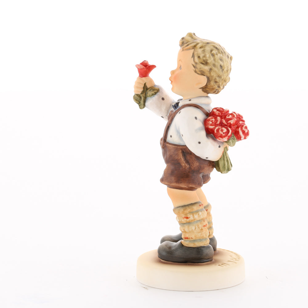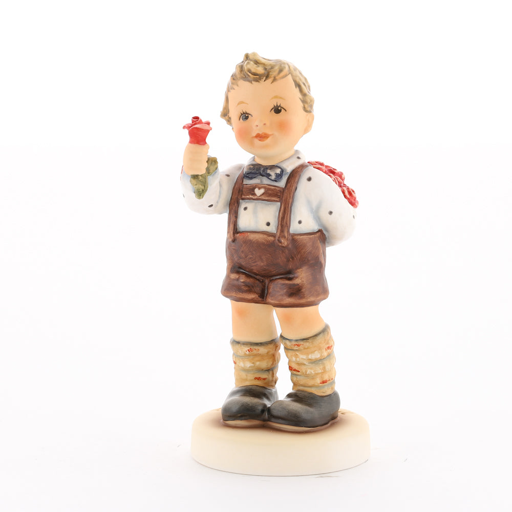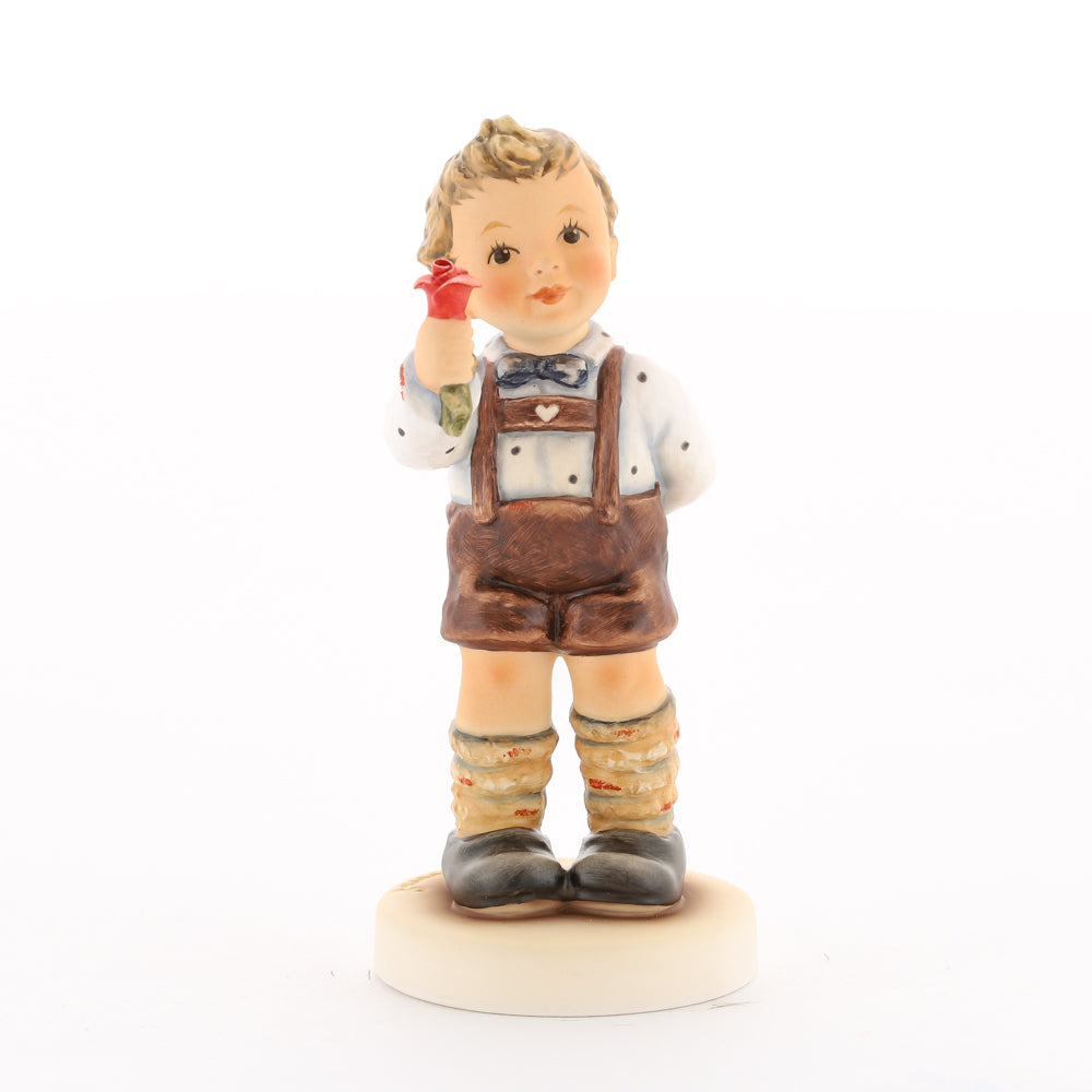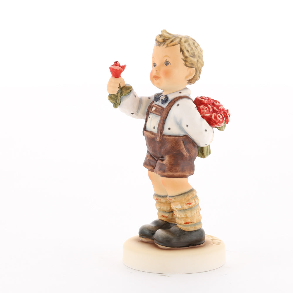 Die einzelne Rose in der Hand macht diese Figur zu einer Besonderheit: Die Blüte wird nicht gegossen, sondern in der Manufaktur jeweils von Hand geformt. Dabei besinnen sich unsere Keramiker einer alten Handwerkskunst, wie sie auch heute noch in der figürlichen Porzellankunst in traditionellen deutschen Manufakturen praktiziert wird. Drei filigrane Blütenblätter und eine Knospe werden von Hand geformt. Diese Technik wurde bisher noch nie bei einer Hummel-Figur angewendet.