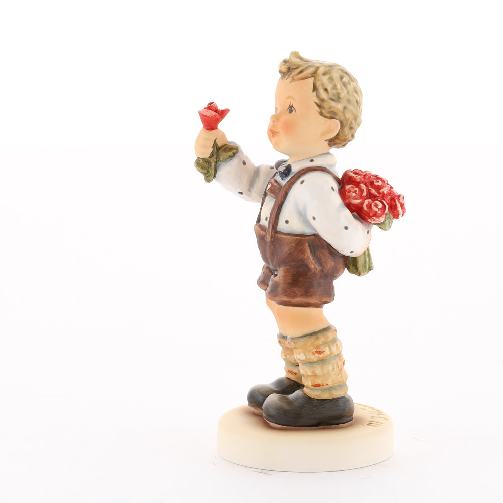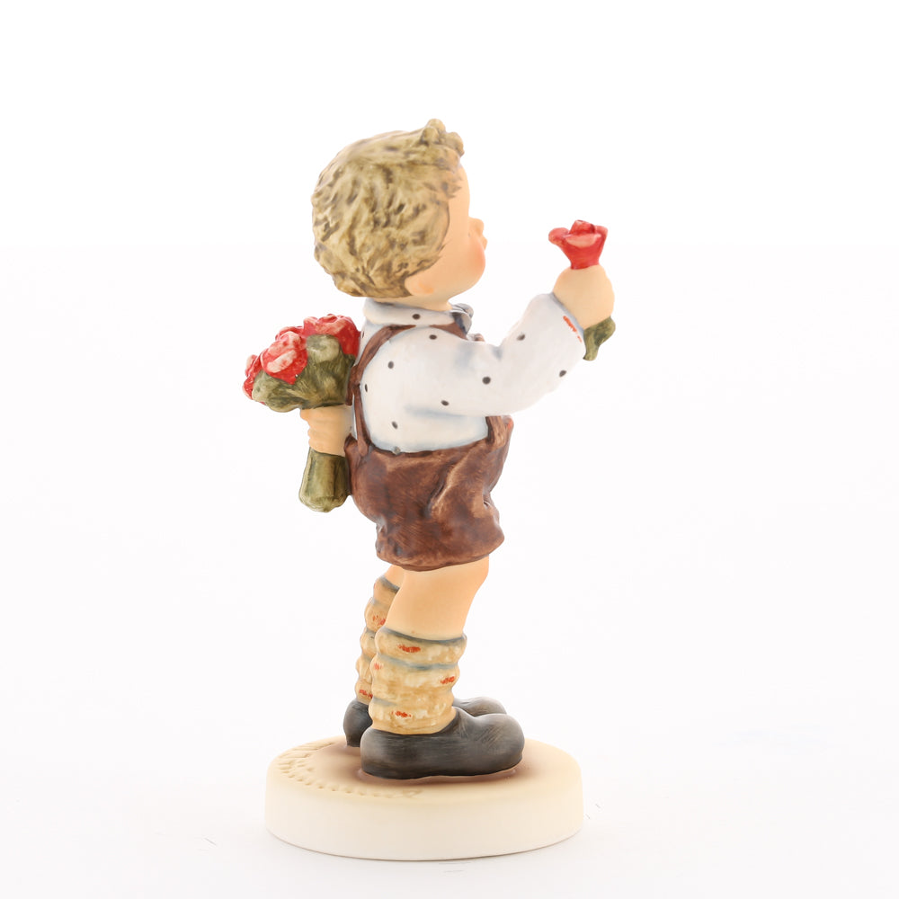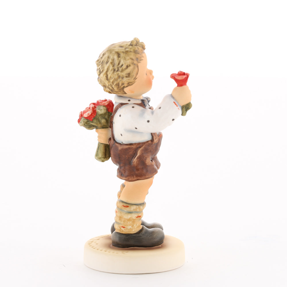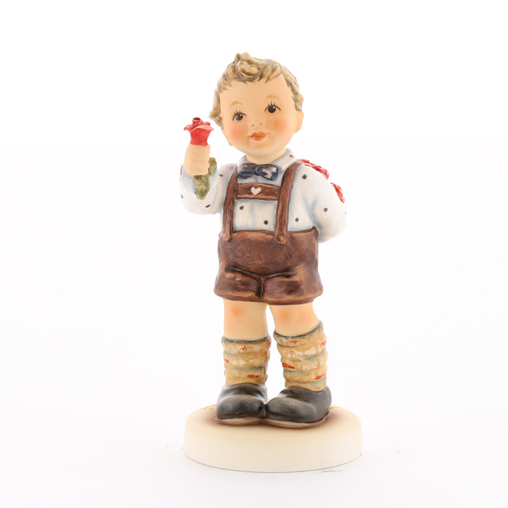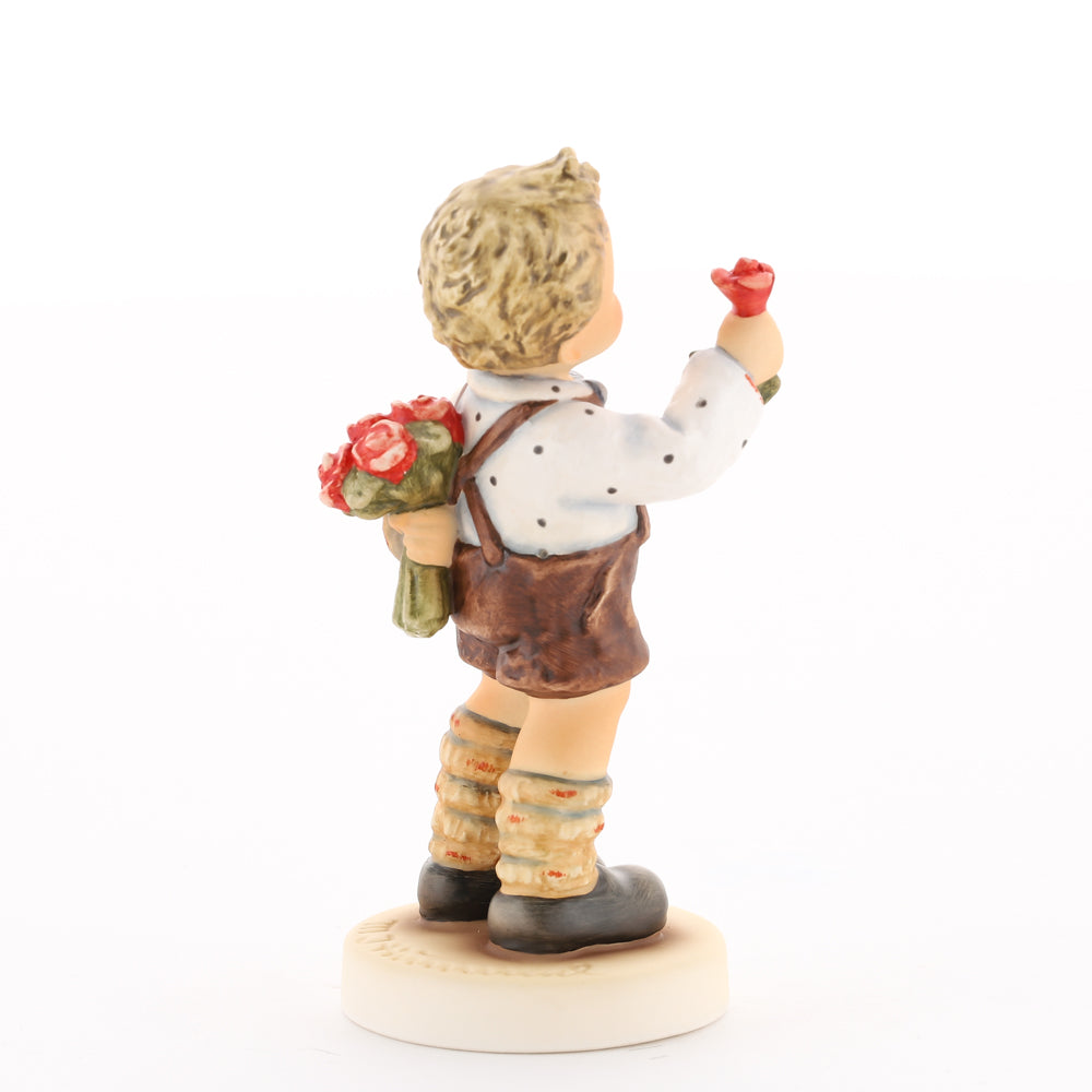 Die einzelne Rose in der Hand macht diese Figur zu einer Besonderheit: Die Blüte wird nicht gegossen, sondern in der Manufaktur jeweils von Hand geformt. Dabei besinnen sich unsere Keramiker einer alten Handwerkskunst, wie sie auch heute noch in der figürlichen Porzellankunst in traditionellen deutschen Manufakturen praktiziert wird. Drei filigrane Blütenblätter und eine Knospe werden von Hand geformt. Diese Technik wurde bisher noch nie bei einer Hummel-Figur angewendet.