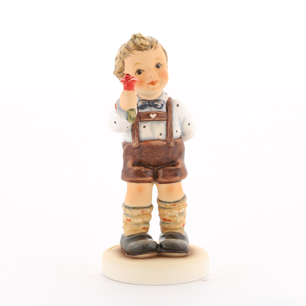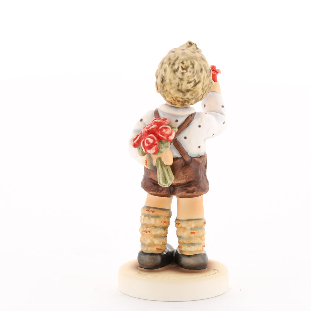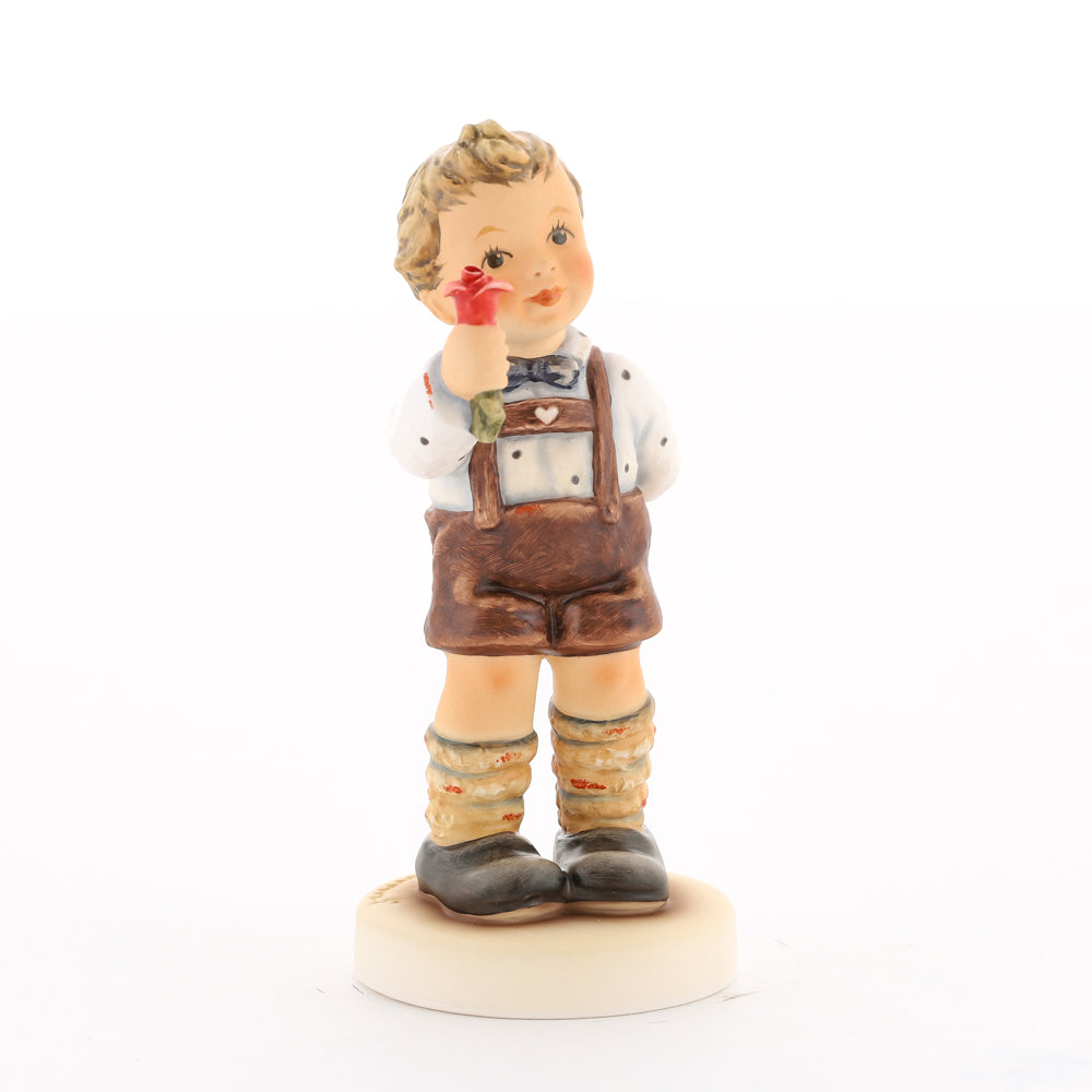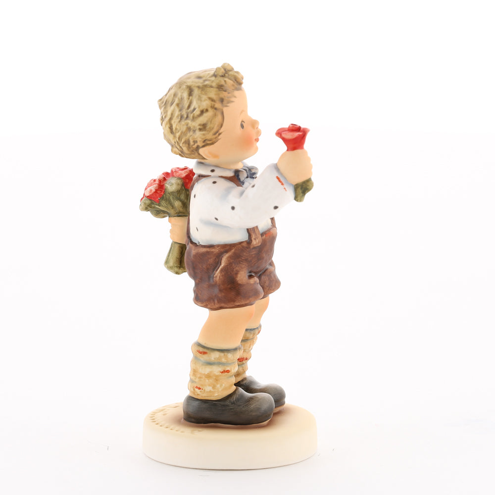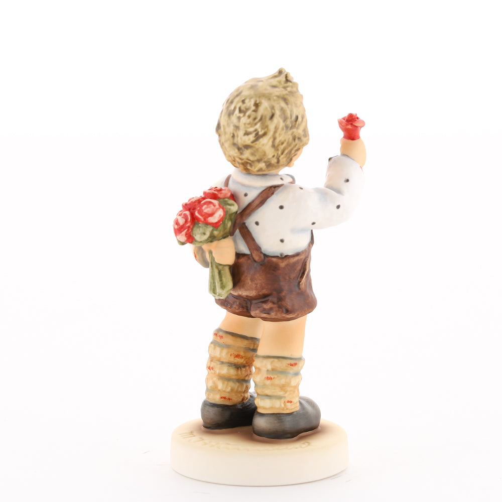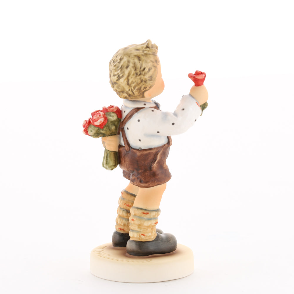 Die einzelne Rose in der Hand macht diese Figur zu einer Besonderheit: Die Blüte wird nicht gegossen, sondern in der Manufaktur jeweils von Hand geformt. Dabei besinnen sich unsere Keramiker einer alten Handwerkskunst, wie sie auch heute noch in der figürlichen Porzellankunst in traditionellen deutschen Manufakturen praktiziert wird. Drei filigrane Blütenblätter und eine Knospe werden von Hand geformt. Diese Technik wurde bisher noch nie bei einer Hummel-Figur angewendet.