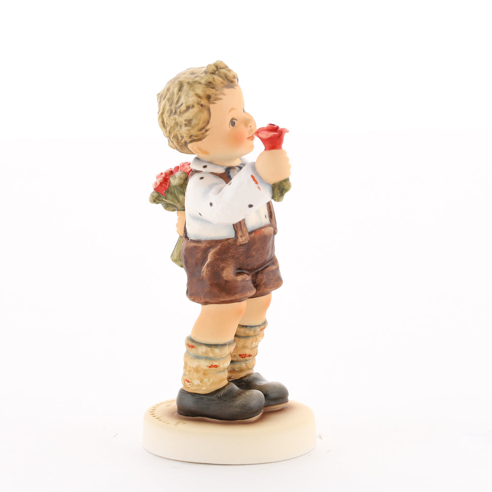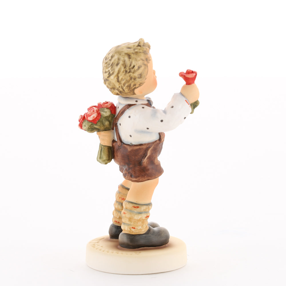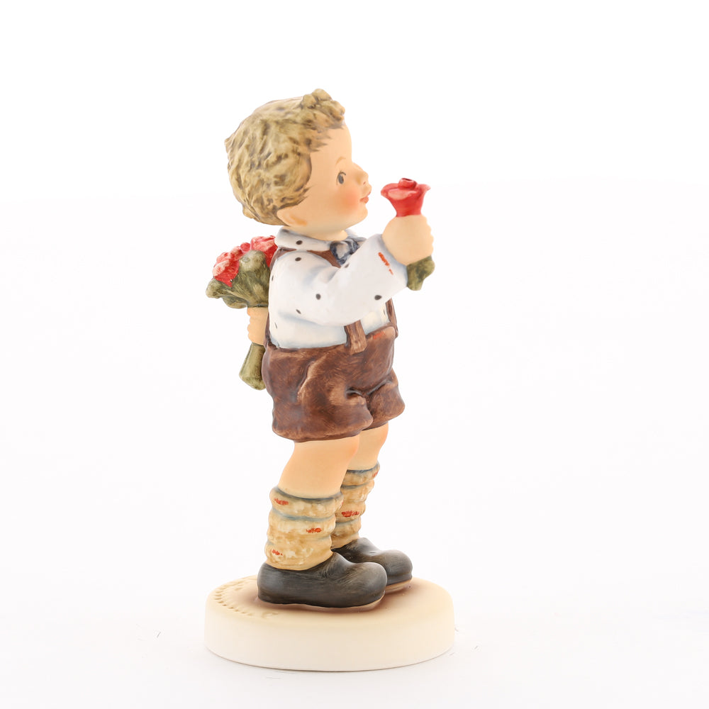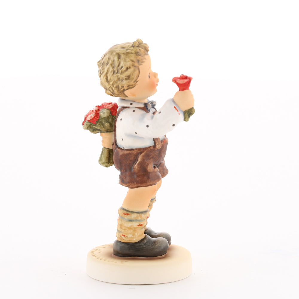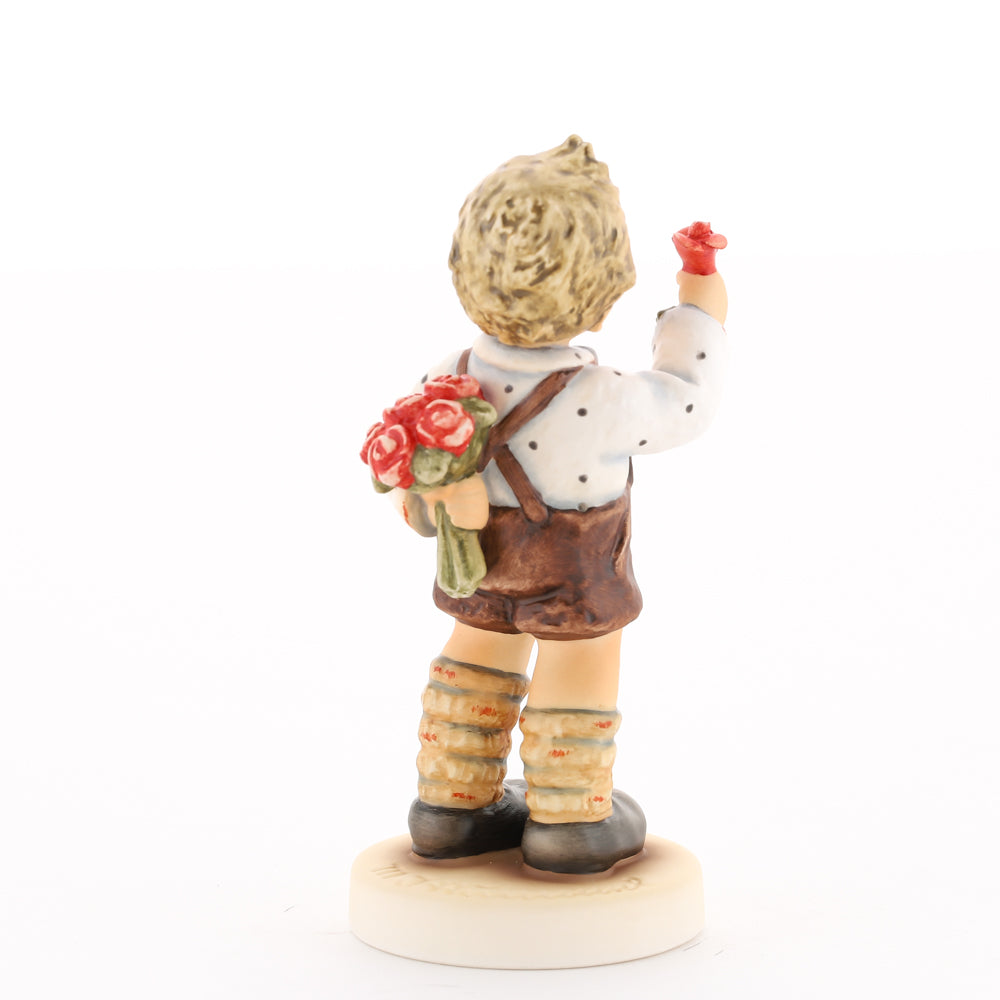Die einzelne Rose in der Hand macht diese Figur zu einer Besonderheit: Die Blüte wird nicht gegossen, sondern in der Manufaktur jeweils von Hand geformt. Dabei besinnen sich unsere Keramiker einer alten Handwerkskunst, wie sie auch heute noch in der figürlichen Porzellankunst in traditionellen deutschen Manufakturen praktiziert wird. Drei filigrane Blütenblätter und eine Knospe werden von Hand geformt. Diese Technik wurde bisher noch nie bei einer Hummel-Figur angewendet.
