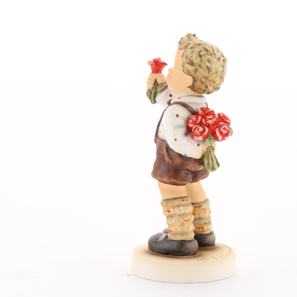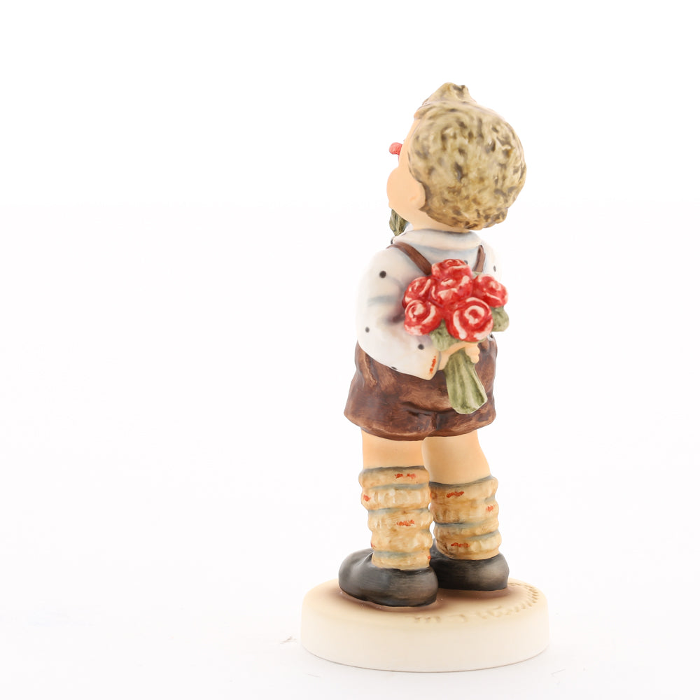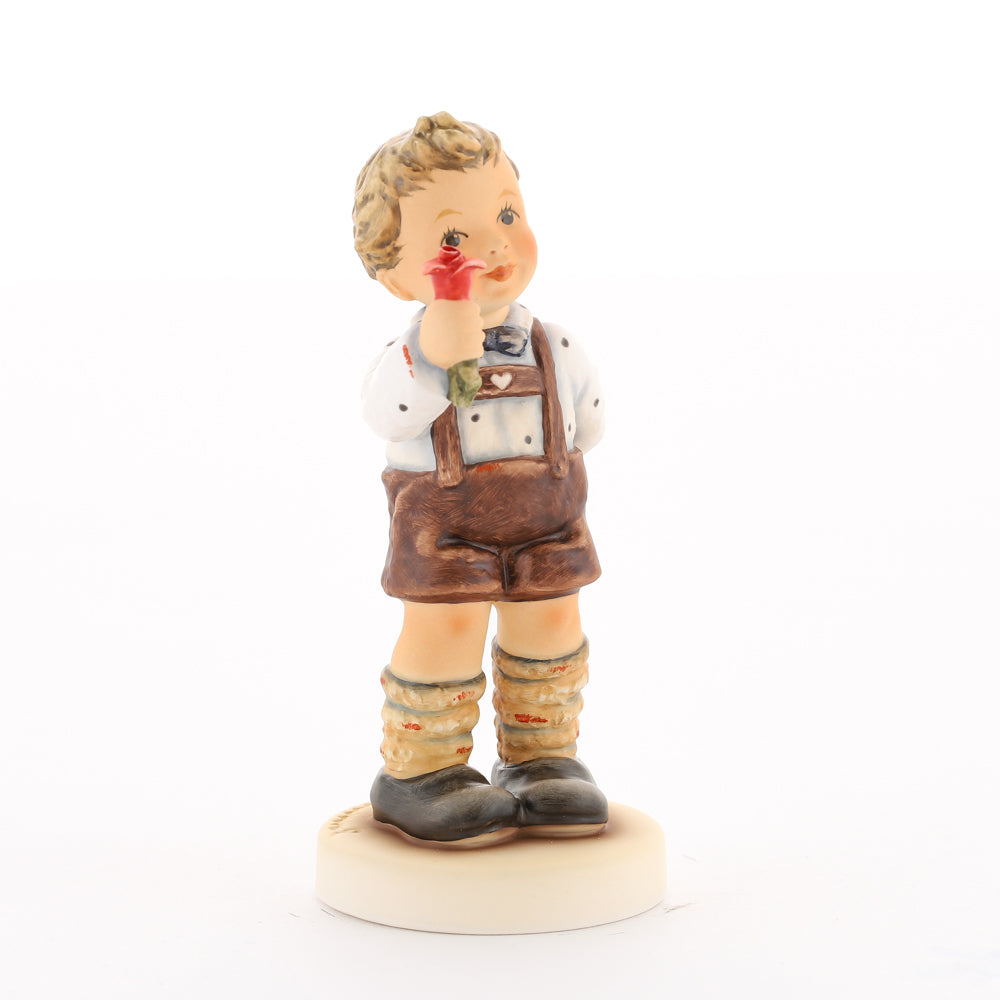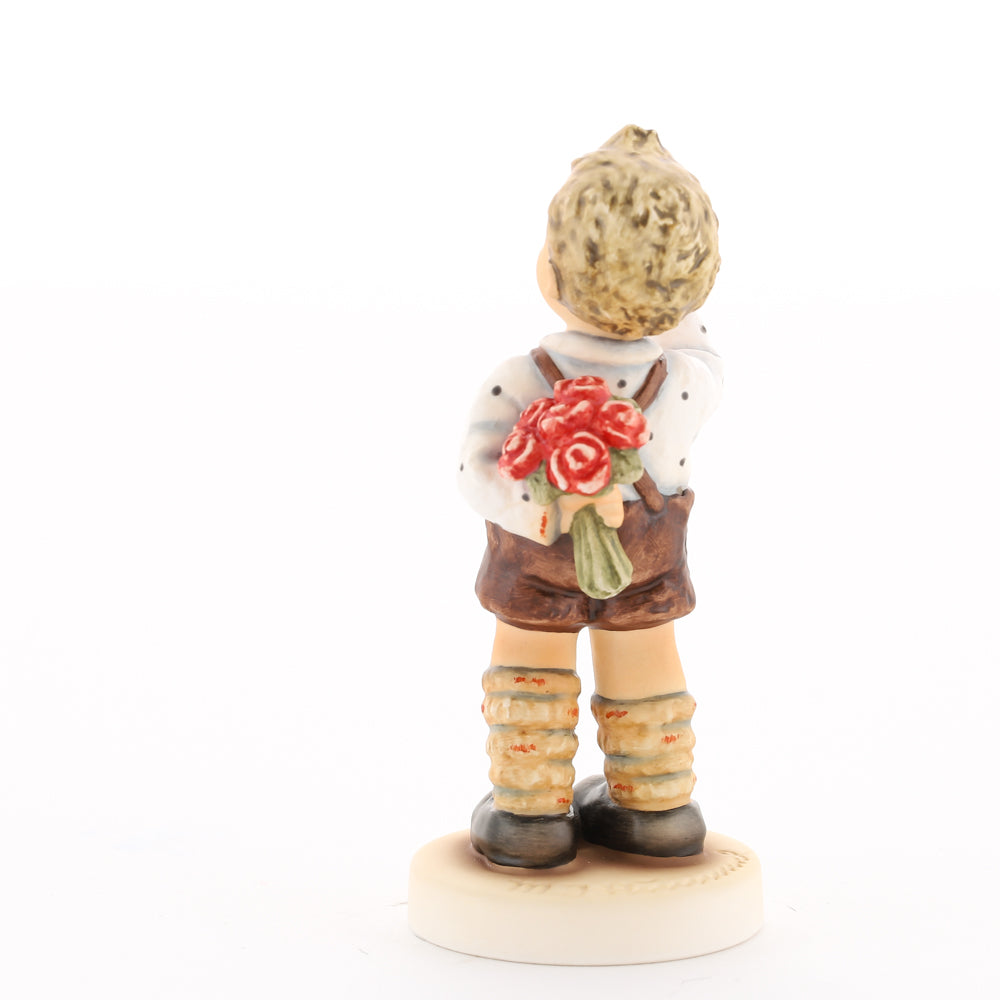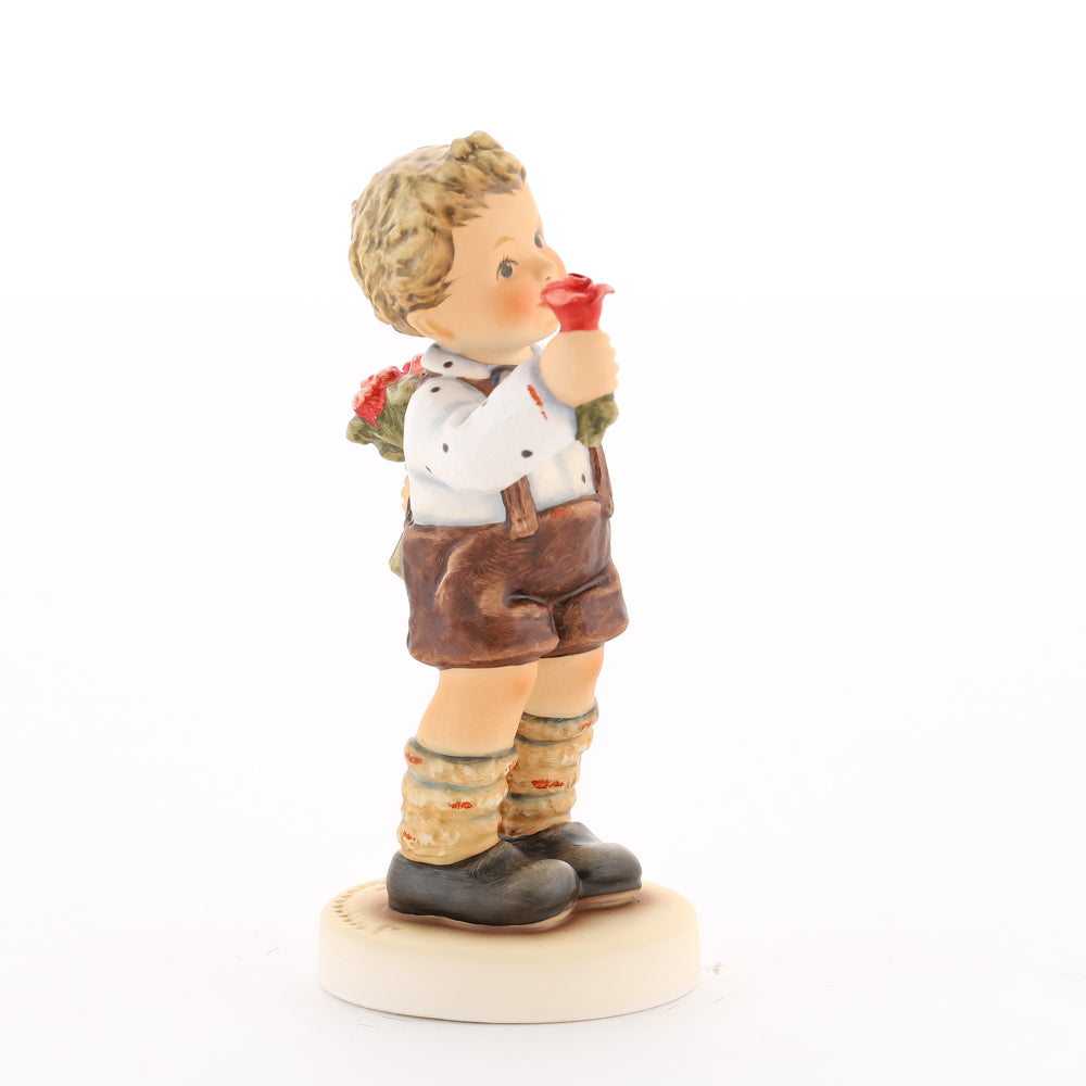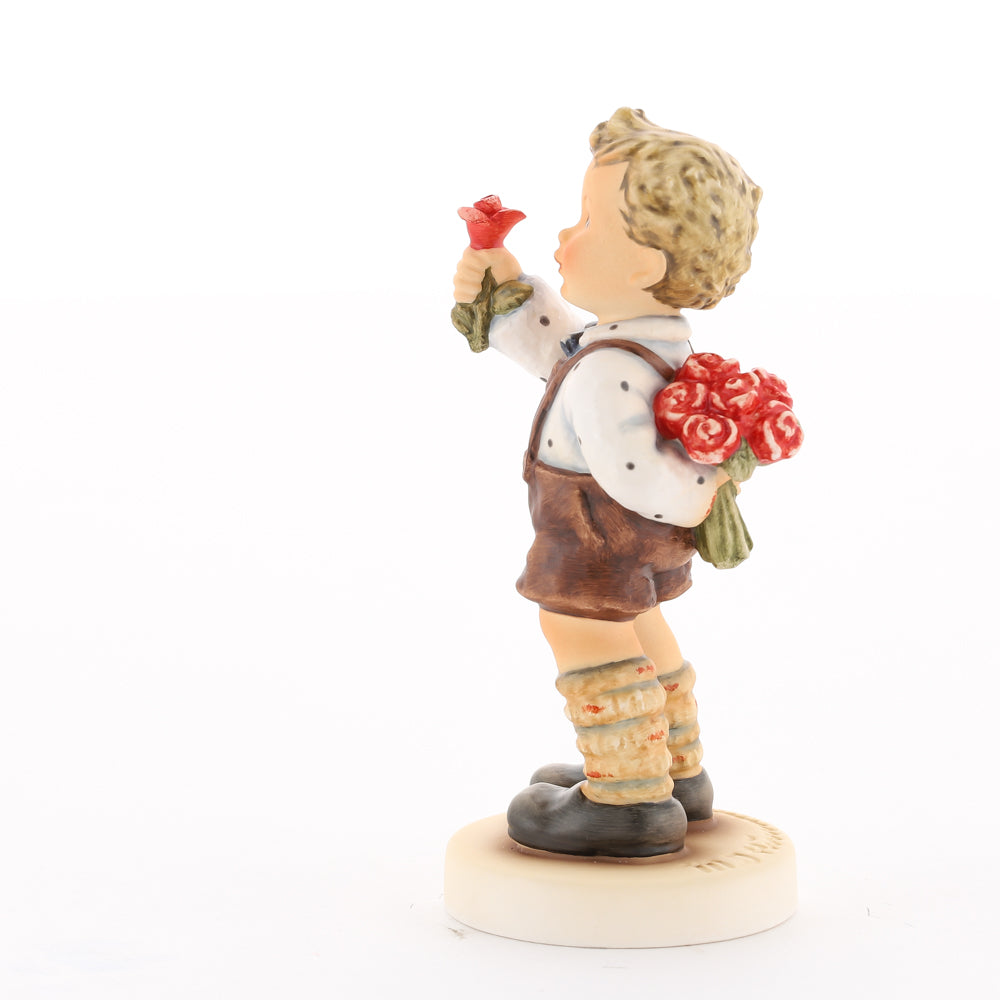 Die einzelne Rose in der Hand macht diese Figur zu einer Besonderheit: Die Blüte wird nicht gegossen, sondern in der Manufaktur jeweils von Hand geformt. Dabei besinnen sich unsere Keramiker einer alten Handwerkskunst, wie sie auch heute noch in der figürlichen Porzellankunst in traditionellen deutschen Manufakturen praktiziert wird. Drei filigrane Blütenblätter und eine Knospe werden von Hand geformt. Diese Technik wurde bisher noch nie bei einer Hummel-Figur angewendet.