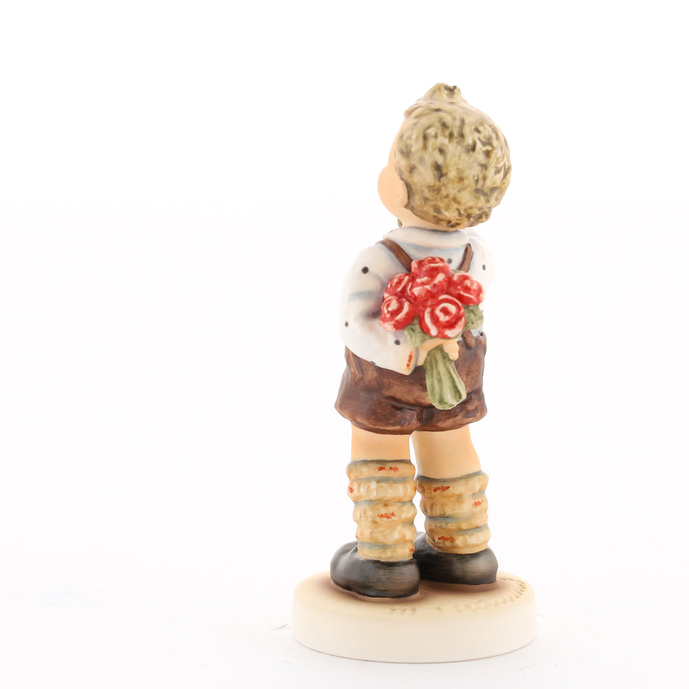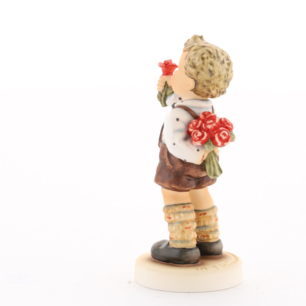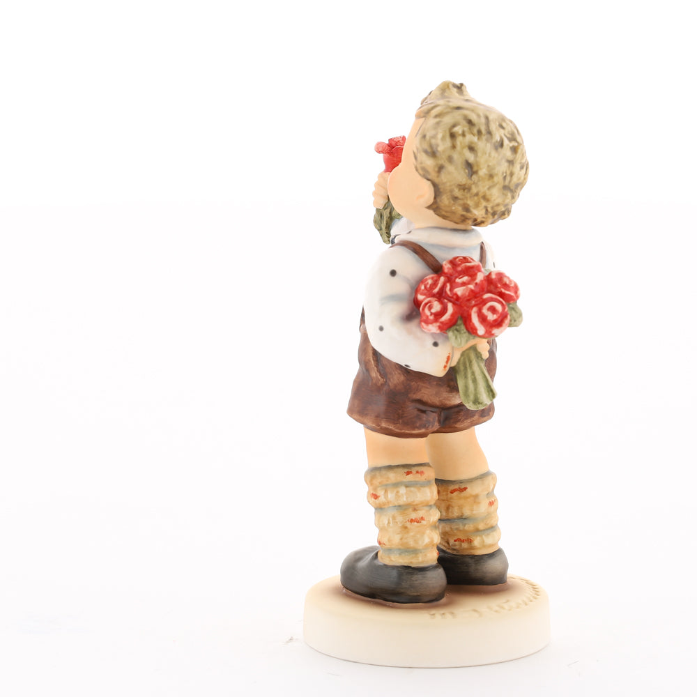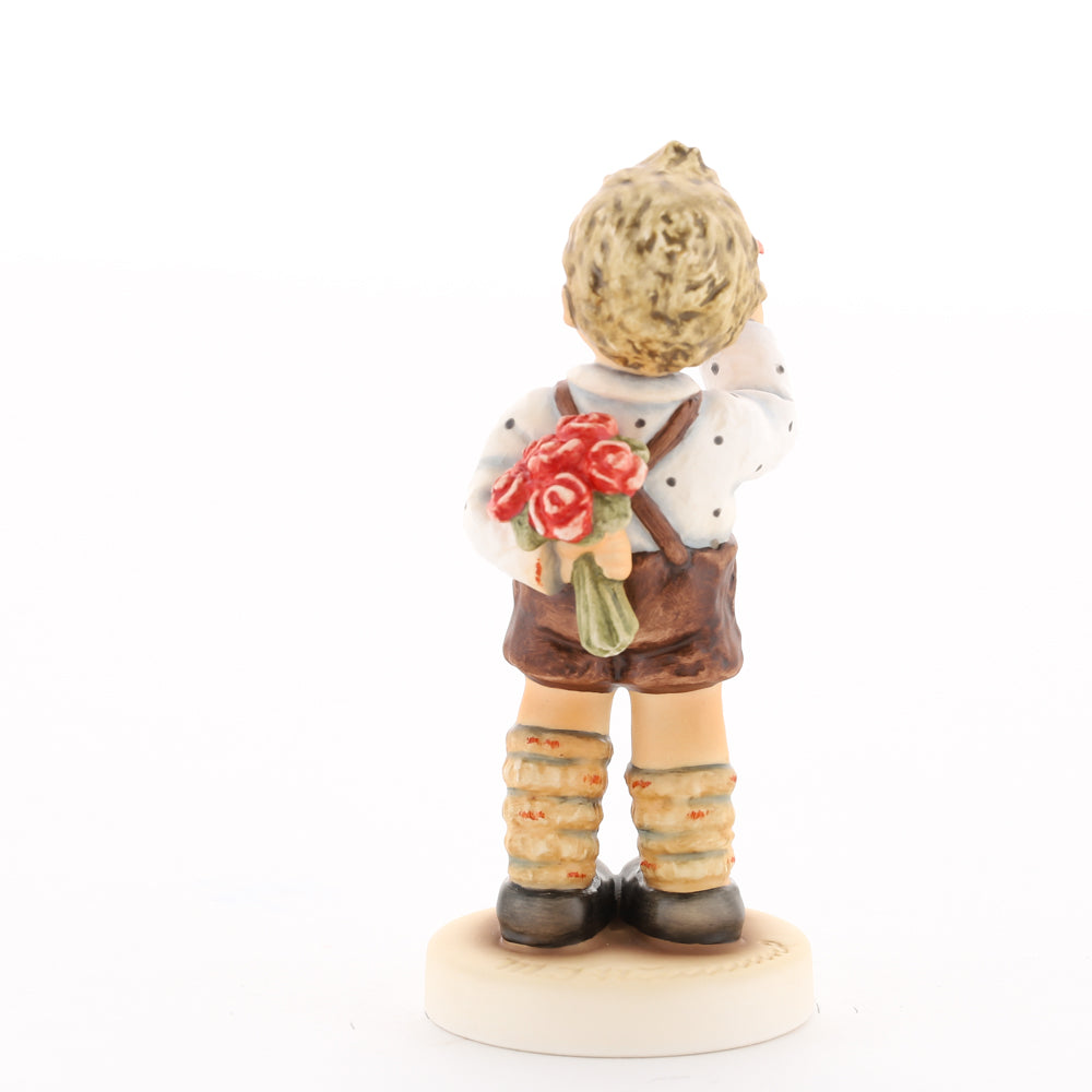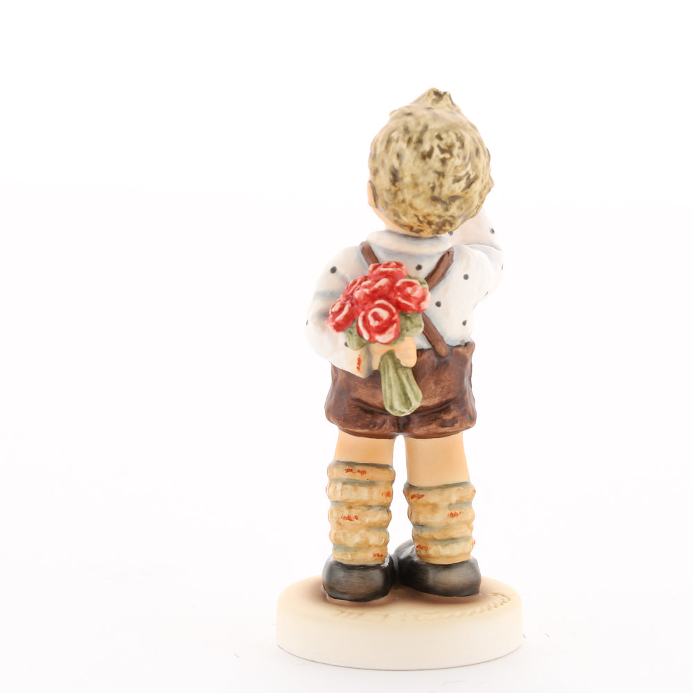 Die einzelne Rose in der Hand macht diese Figur zu einer Besonderheit: Die Blüte wird nicht gegossen, sondern in der Manufaktur jeweils von Hand geformt. Dabei besinnen sich unsere Keramiker einer alten Handwerkskunst, wie sie auch heute noch in der figürlichen Porzellankunst in traditionellen deutschen Manufakturen praktiziert wird. Drei filigrane Blütenblätter und eine Knospe werden von Hand geformt. Diese Technik wurde bisher noch nie bei einer Hummel-Figur angewendet.