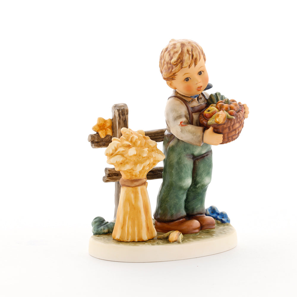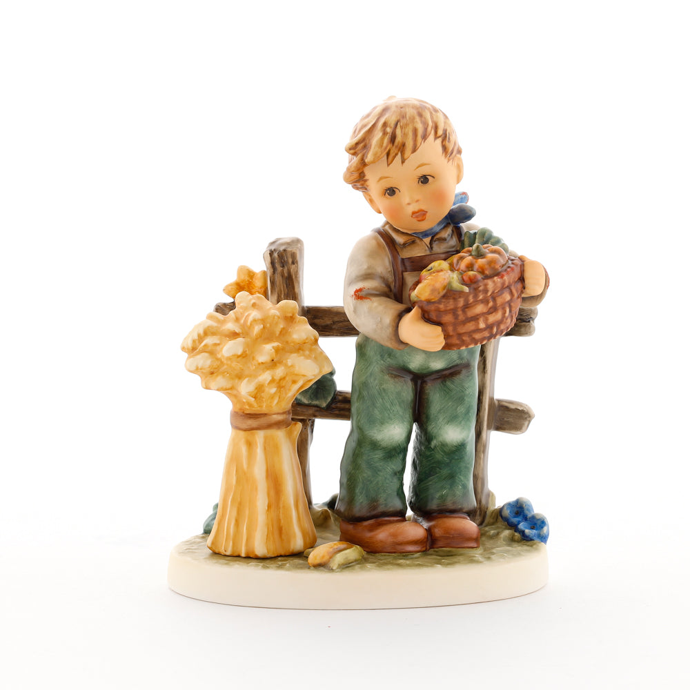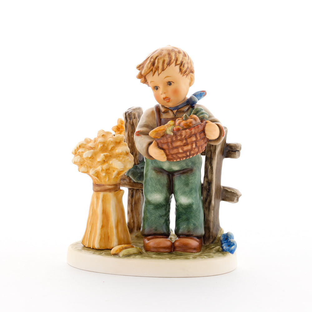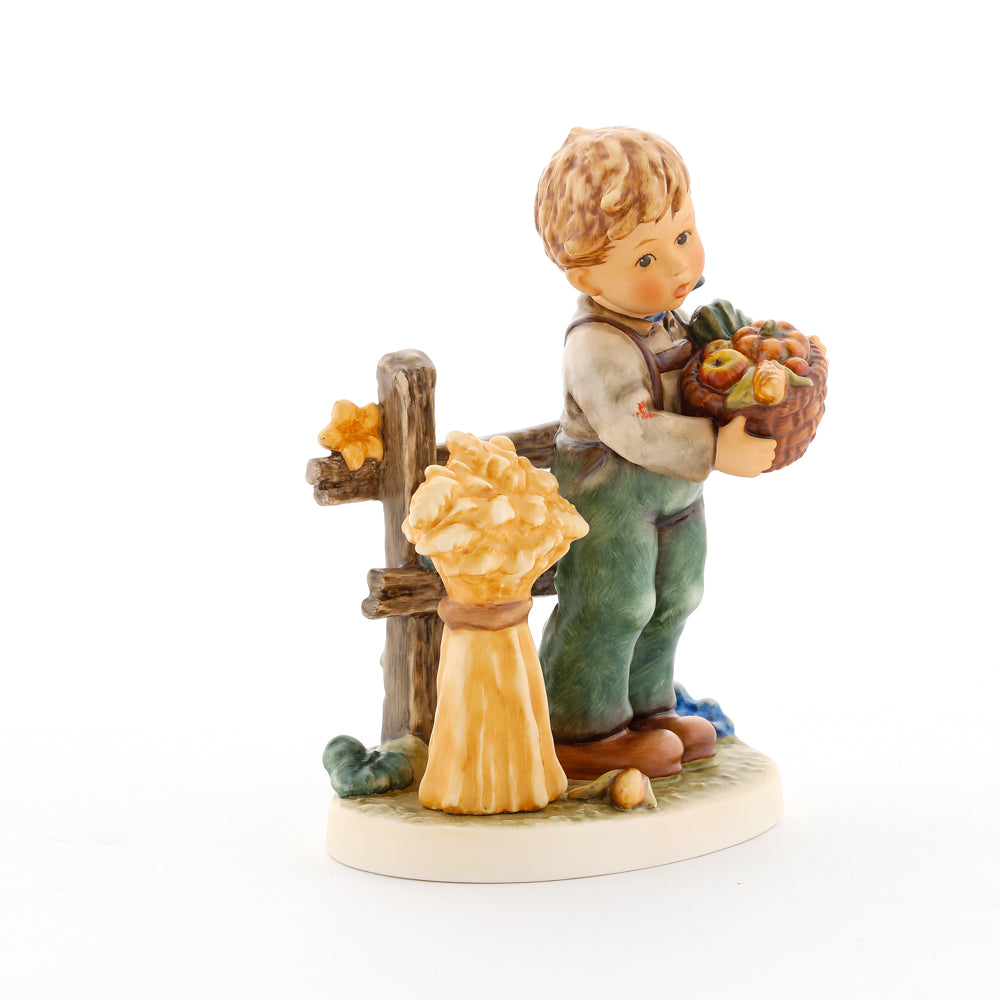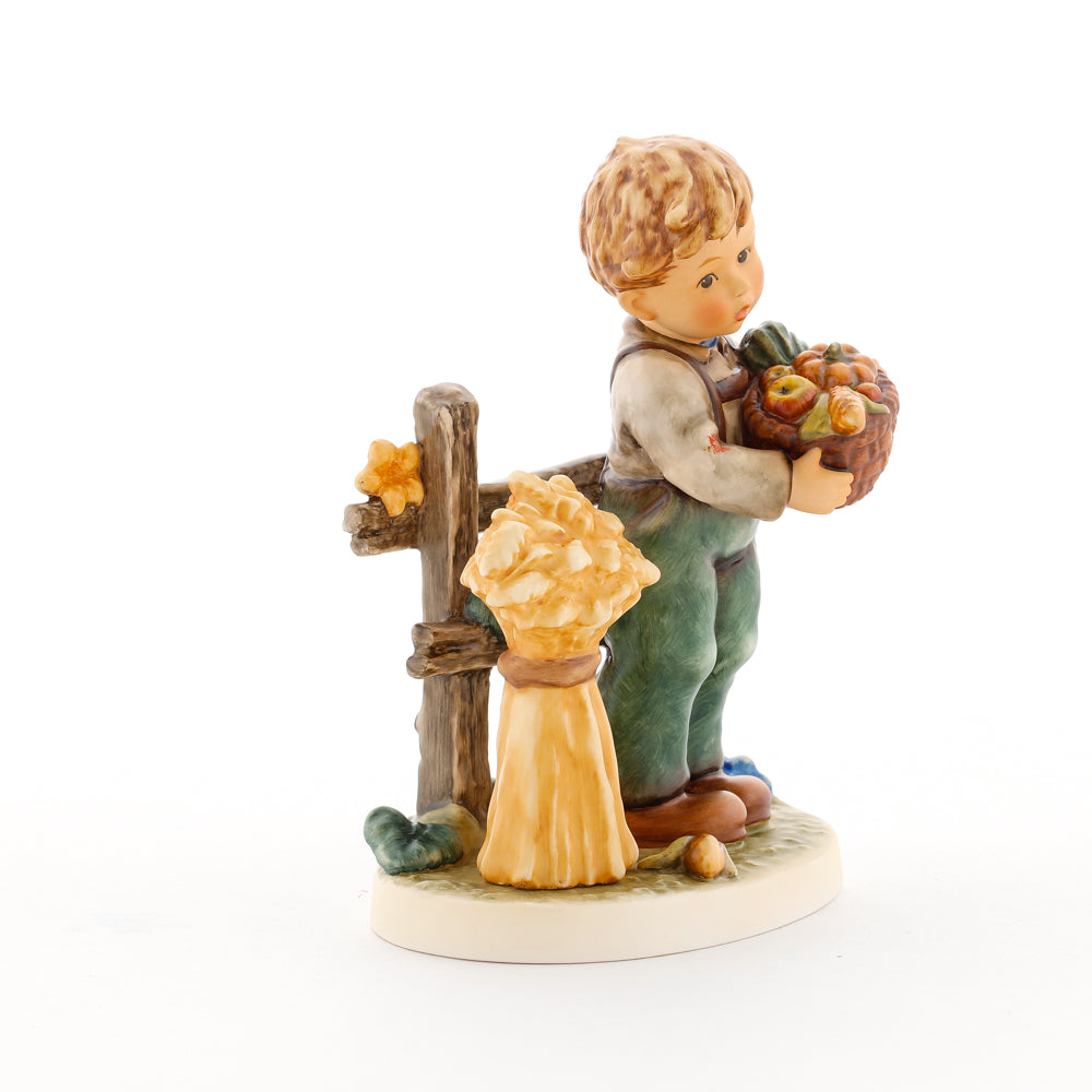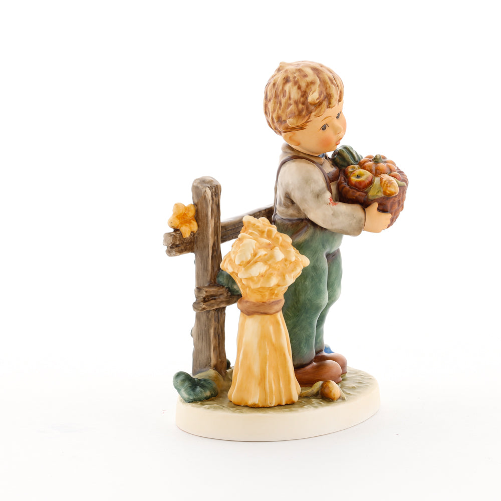 Die Hummel-Figur „Erntedank (Truthahn)“ (HUM 2439) ergänzt diese Figur wunderbar. Angespielt wird hier auf das amerikanische Traditionsfest Thanksgiving, bei dem Truthahn (auf Englisch „Turkey“) serviert wird. Des Weiteren harmoniert auch die Figur „Süße Ernte“ (HUM 2372), die ein zauberhaft süßes Herbst-Mädchen bei ihrer Gabendarbietung zeigt.