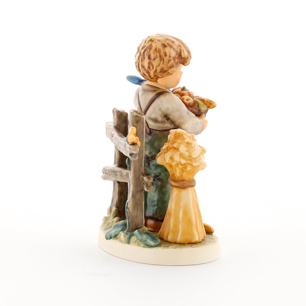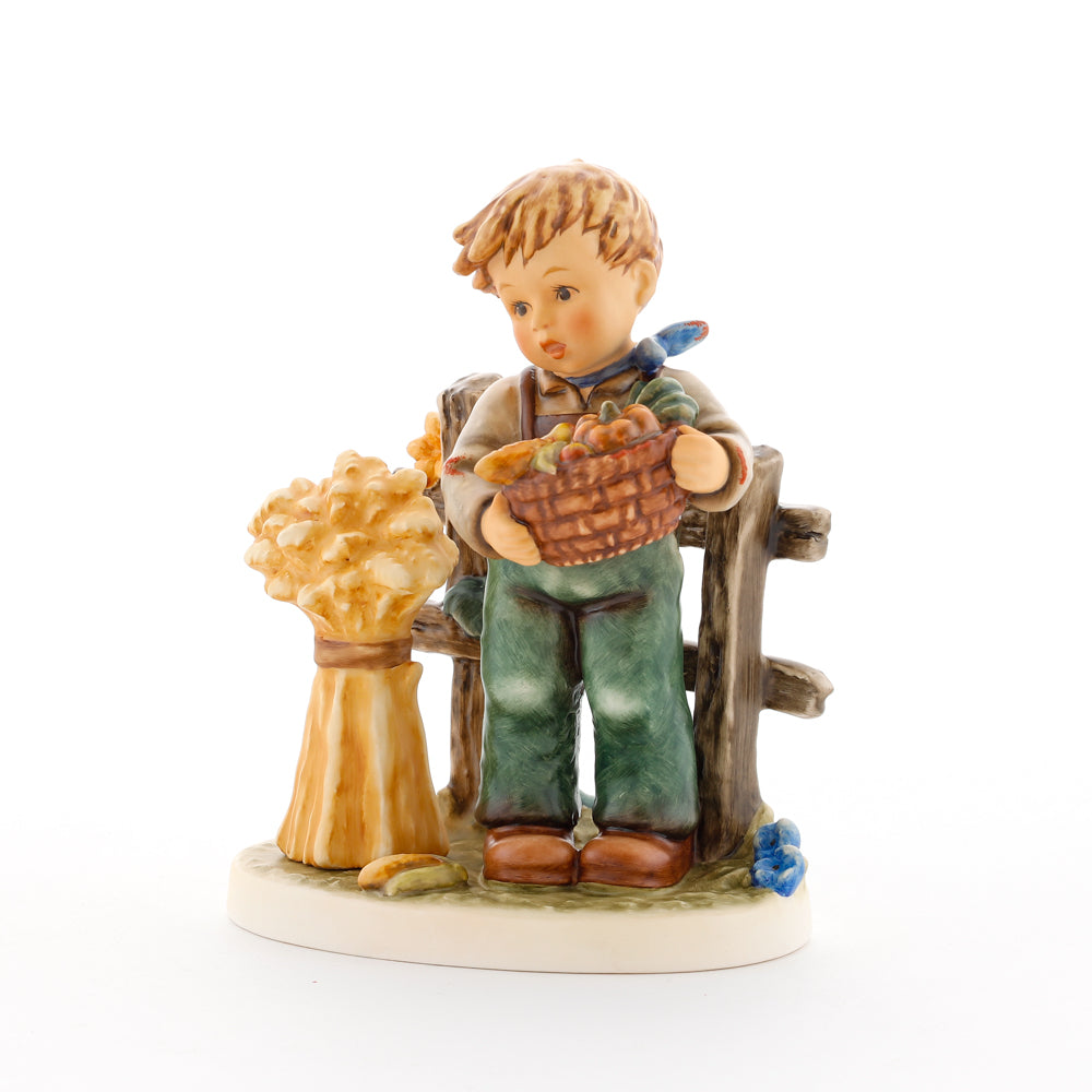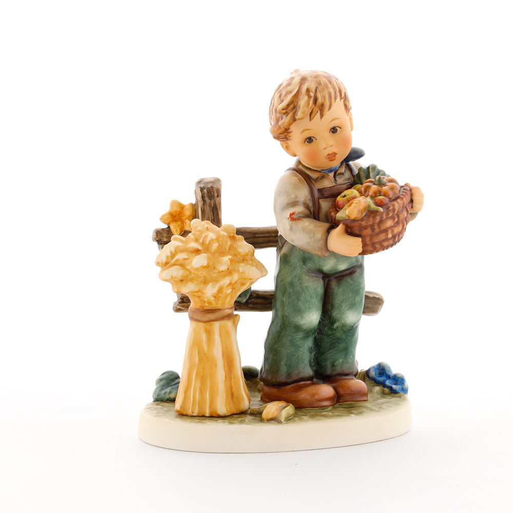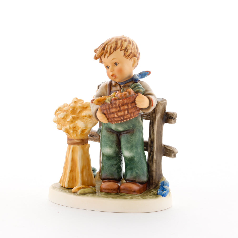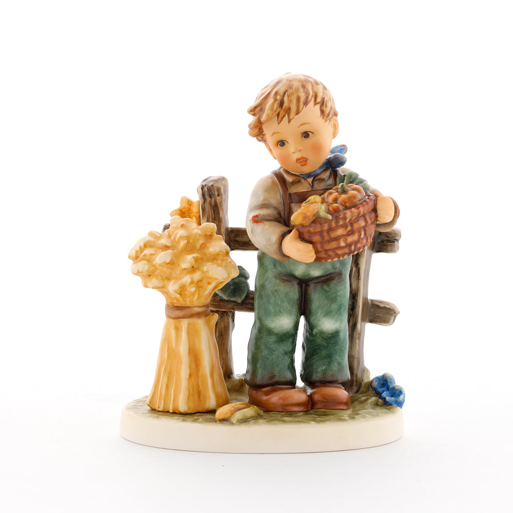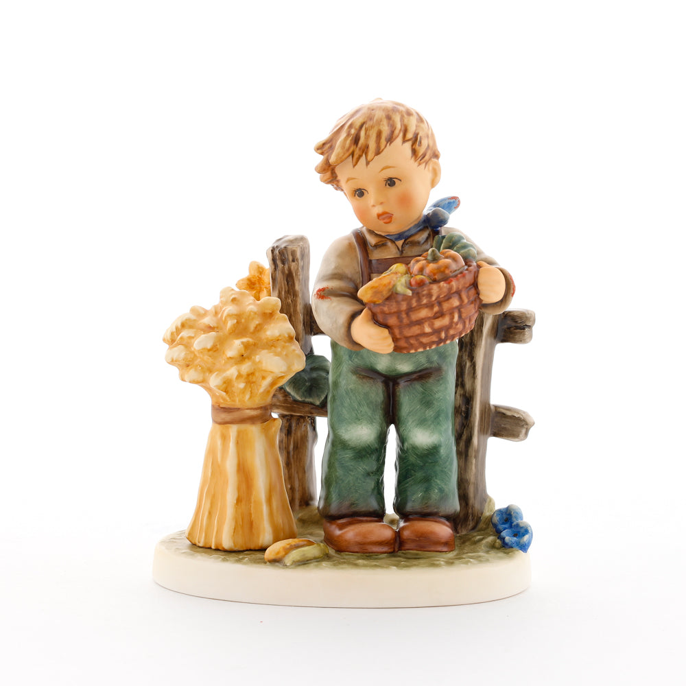 Die Hummel-Figur „Erntedank (Truthahn)“ (HUM 2439) ergänzt diese Figur wunderbar. Angespielt wird hier auf das amerikanische Traditionsfest Thanksgiving, bei dem Truthahn (auf Englisch „Turkey“) serviert wird. Des Weiteren harmoniert auch die Figur „Süße Ernte“ (HUM 2372), die ein zauberhaft süßes Herbst-Mädchen bei ihrer Gabendarbietung zeigt.