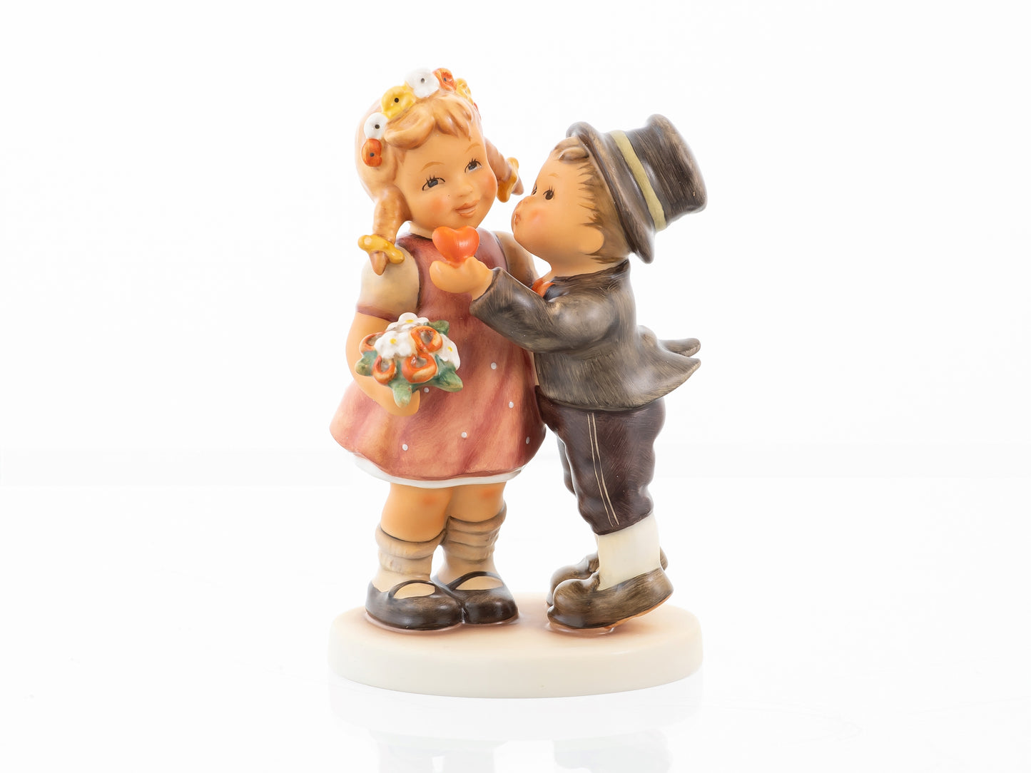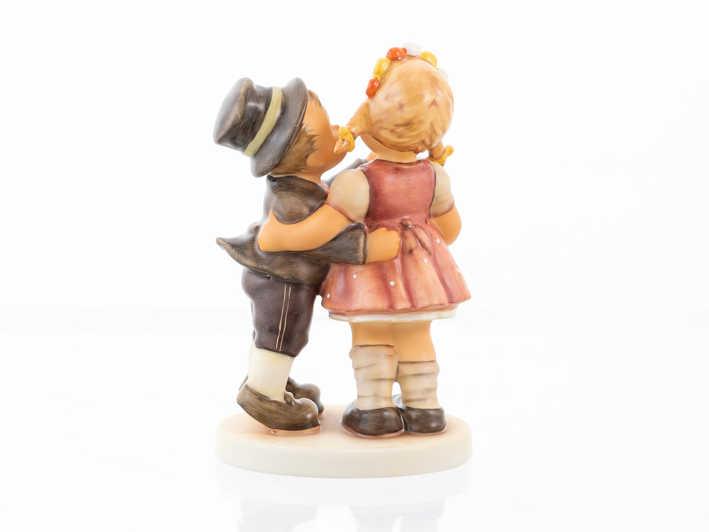 Das traditionelle weiße Brautkleid wie beim Hummel-Klassiker „Hochzeit“ von 1997 (HUM 2003 2/0) finden Hummel-Fans hier allerdings nicht – das Madla kommt im klassischen bayerischen Dirndl und der Bub in seiner besten Lederhose. Im Vergleich zu „Hochzeit“ steht das Hummel-Mädchen diesmal links statt rechts. Mit einem Lächeln im Gesicht haben sich die beiden gerade das Jawort gegeben und starten nun in ihr gemeinsames Leben. Umso mehr freut sich der glückliche Ehemann jetzt, seiner Braut den ersten Kuss aufzudrücken. Mit gespitzten Lippen streckt er sich seiner Angetrauten entgegen – sie wird ihm den Kuss ganz bestimmt nicht verwehren.