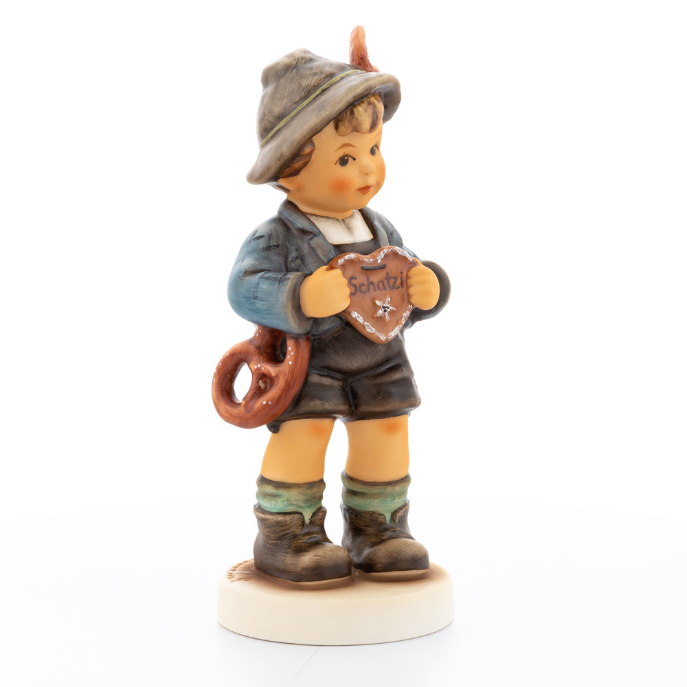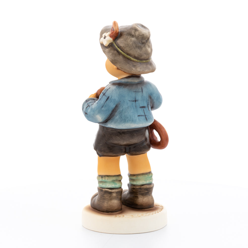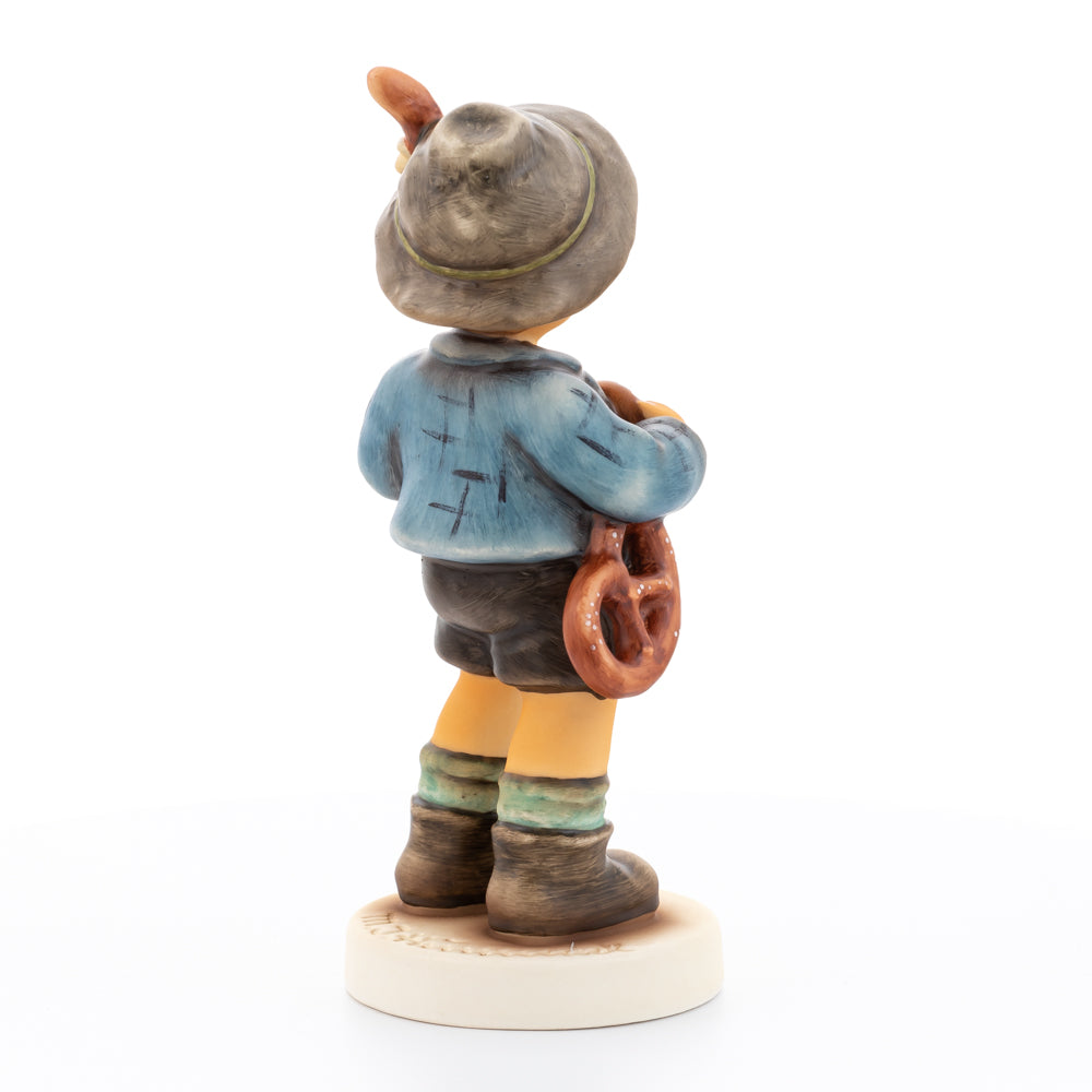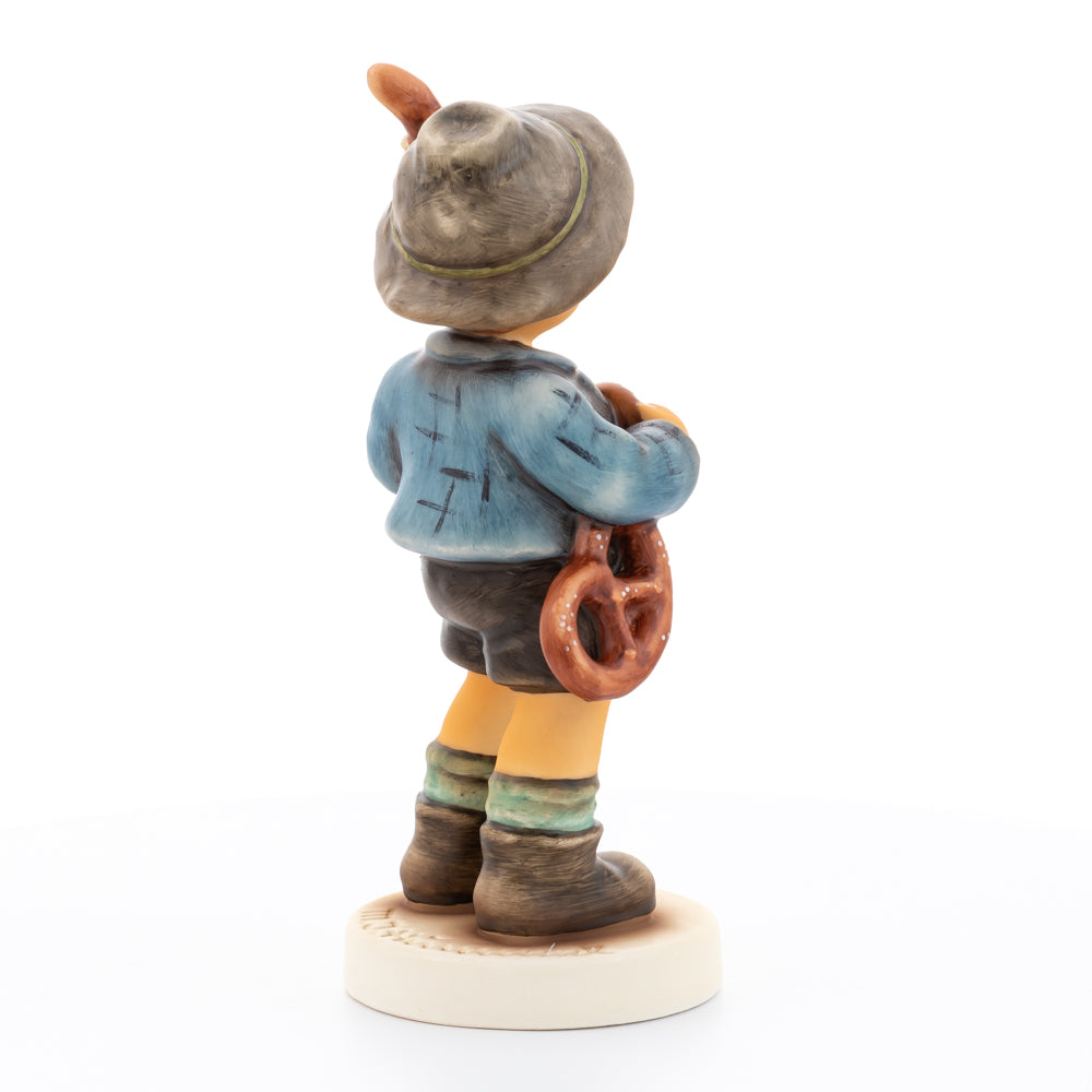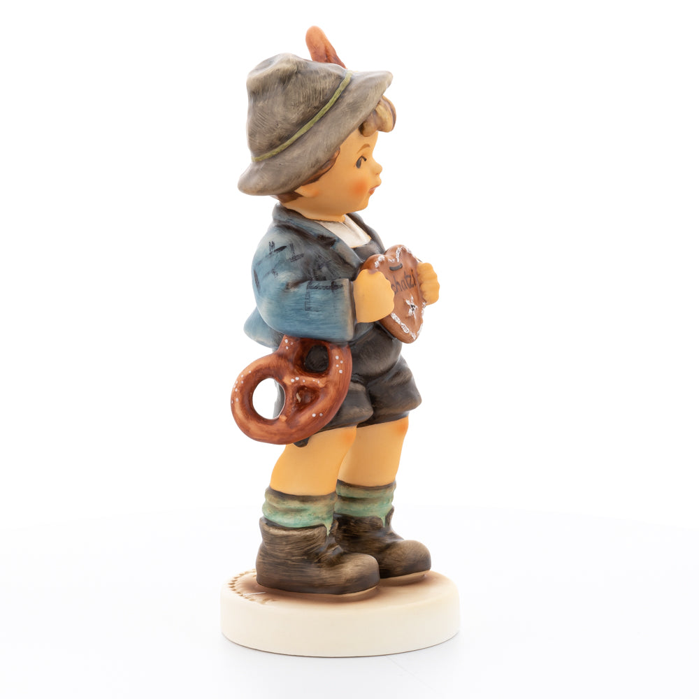 Wie seine Partnerin, die Hummel-Figur „Du gehörst zu mir“ (HUM 2446), trägt das Hummel-Kind traditionelle bayerische Tracht, bestehend aus Lederhosen und Hemd, der passenden Jacke in Blau sowie dem Hut mit Federgesteck. Aus den schwarzen Stiefeln gucken dicke grüne Socken hervor, während er eine leckere Brezn als Wegzehrung unter dem Arm hat.