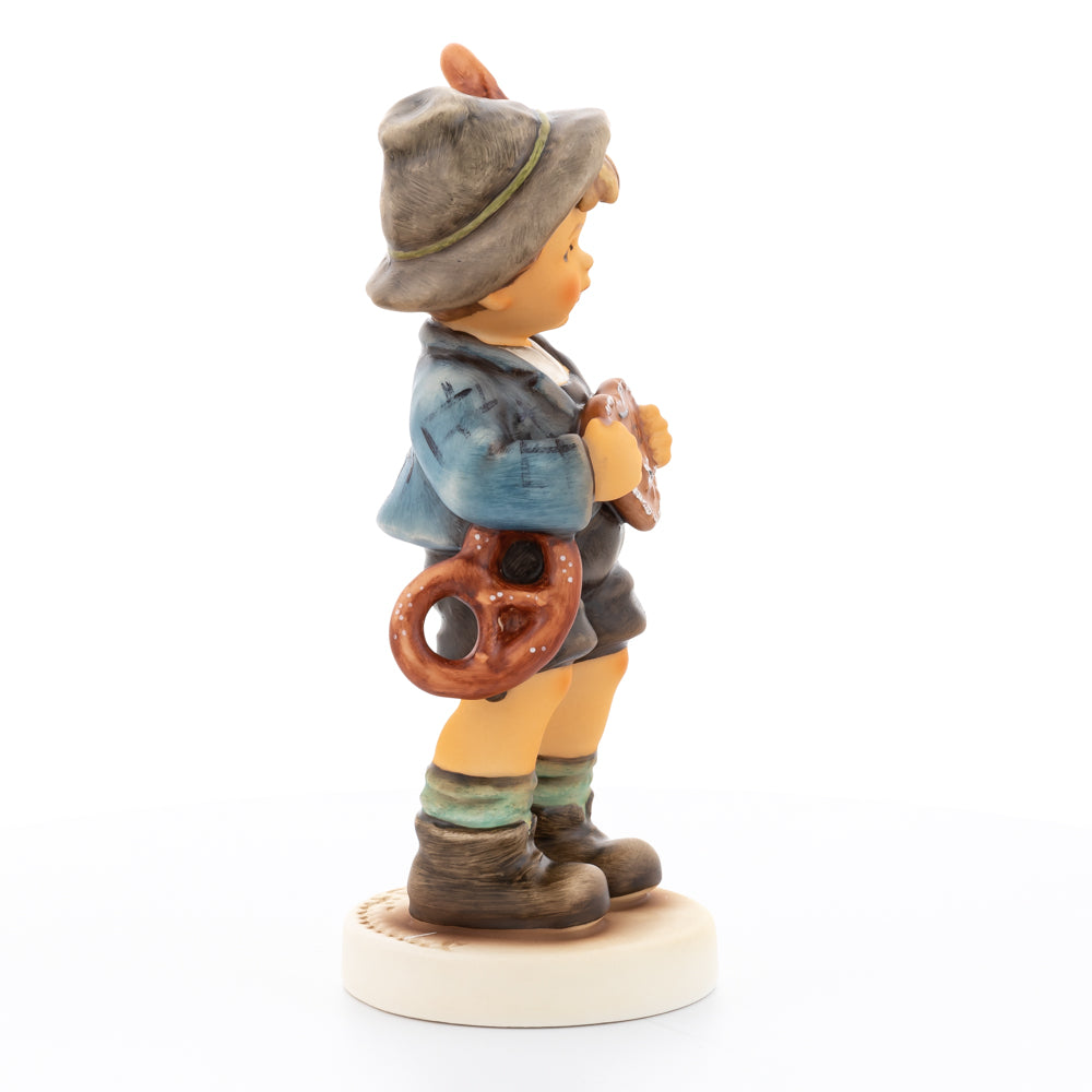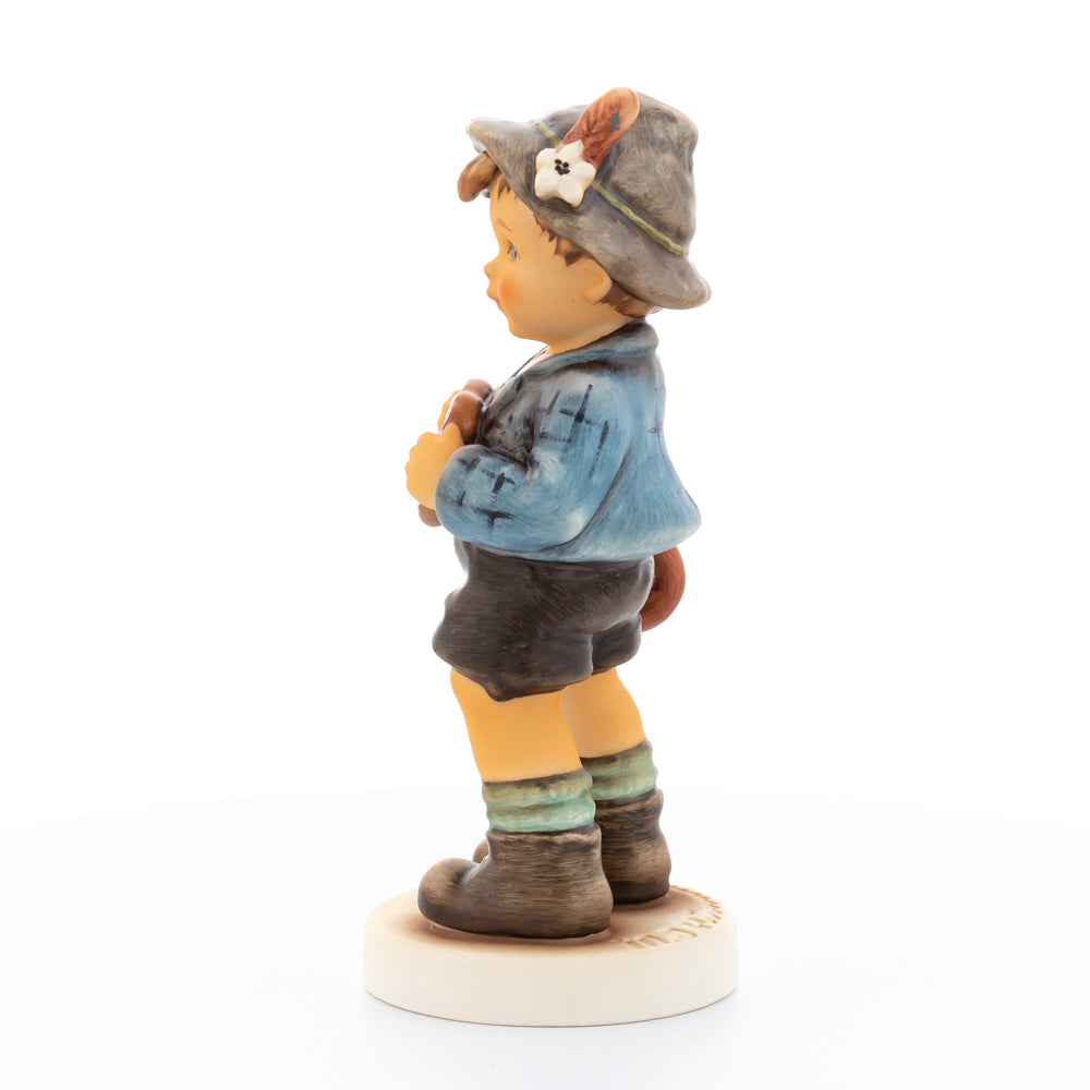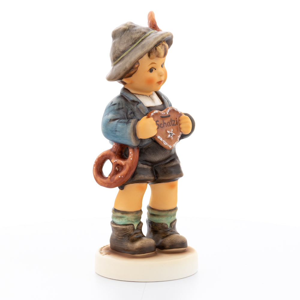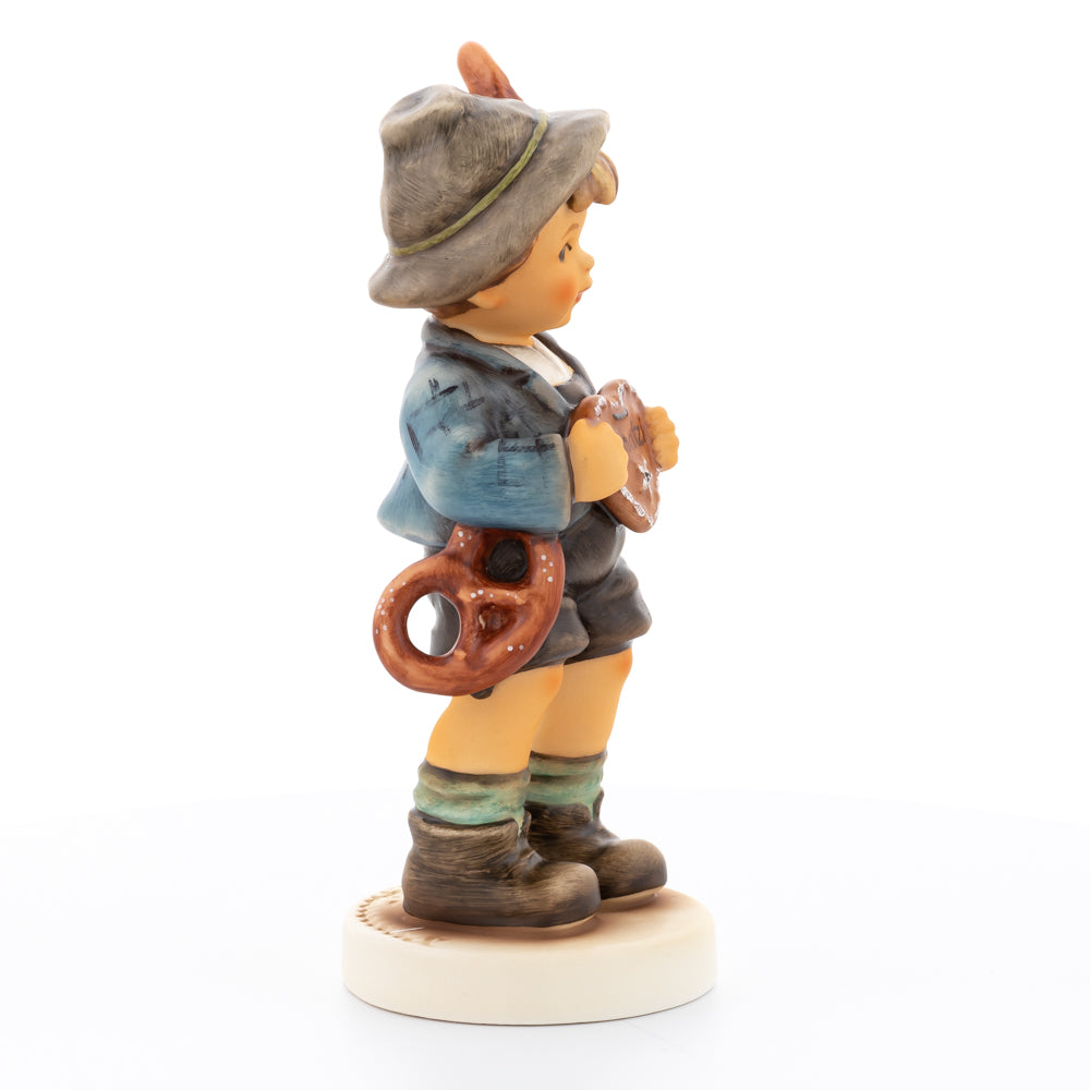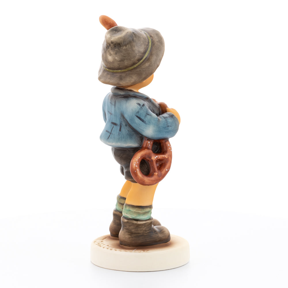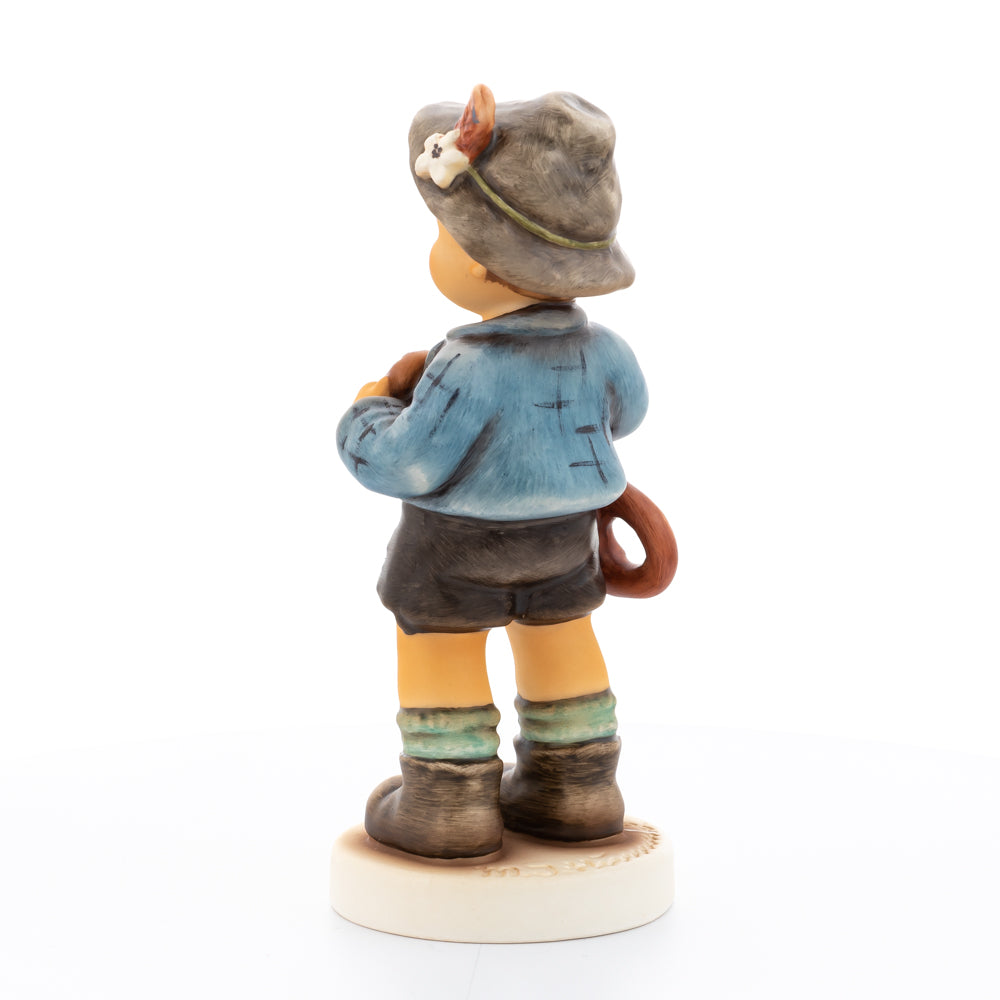 Wie seine Partnerin, die Hummel-Figur „Du gehörst zu mir“ (HUM 2446), trägt das Hummel-Kind traditionelle bayerische Tracht, bestehend aus Lederhosen und Hemd, der passenden Jacke in Blau sowie dem Hut mit Federgesteck. Aus den schwarzen Stiefeln gucken dicke grüne Socken hervor, während er eine leckere Brezn als Wegzehrung unter dem Arm hat.
