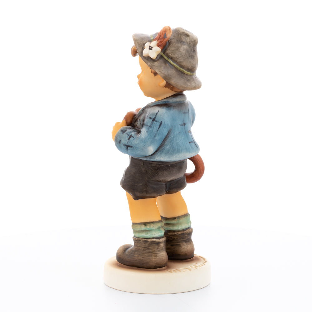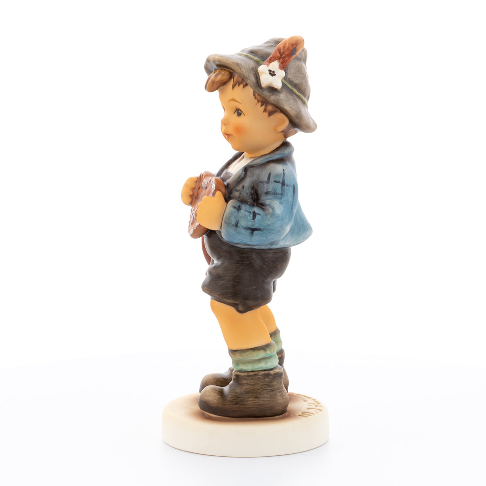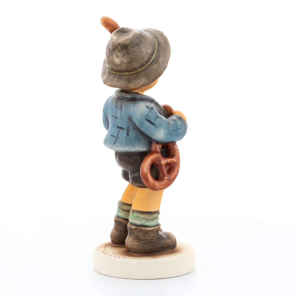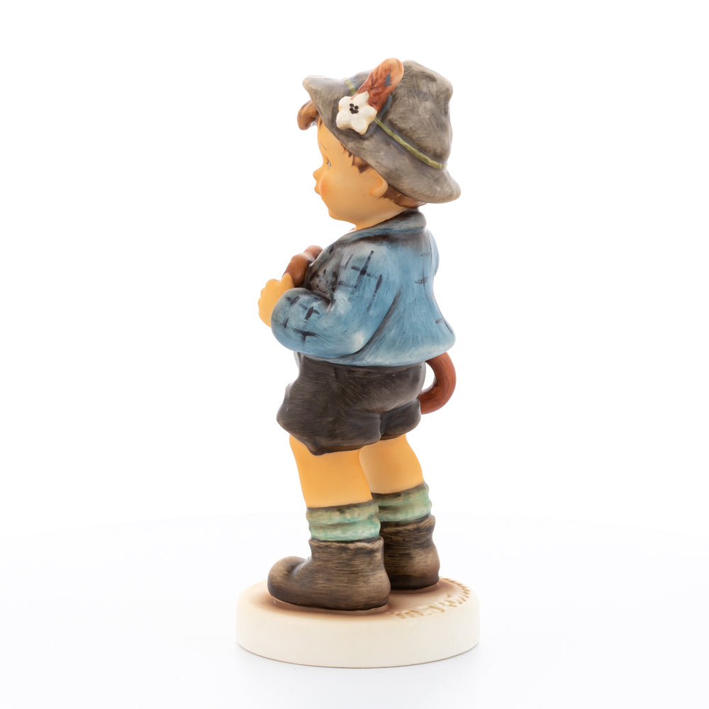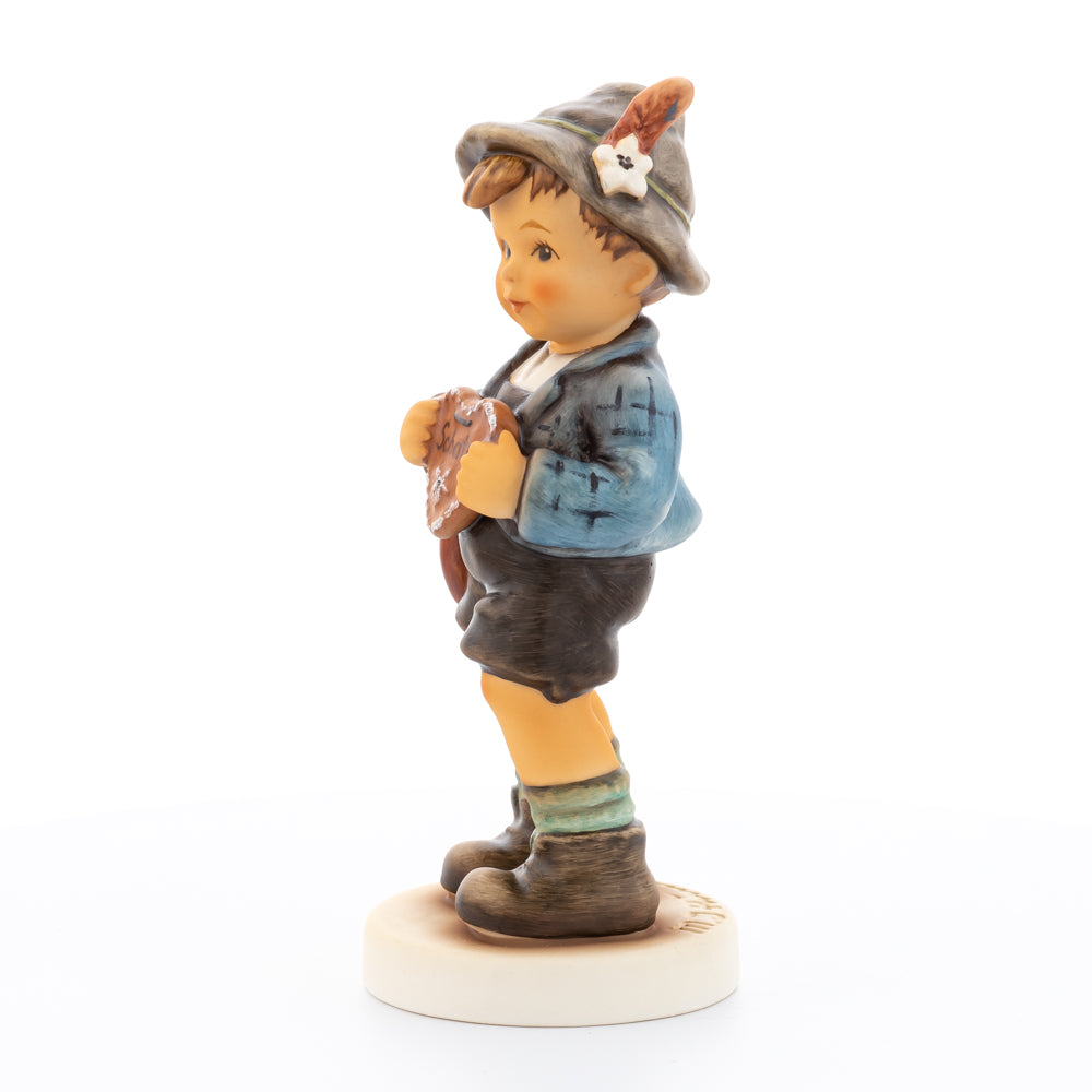 Wie seine Partnerin, die Hummel-Figur „Du gehörst zu mir“ (HUM 2446), trägt das Hummel-Kind traditionelle bayerische Tracht, bestehend aus Lederhosen und Hemd, der passenden Jacke in Blau sowie dem Hut mit Federgesteck. Aus den schwarzen Stiefeln gucken dicke grüne Socken hervor, während er eine leckere Brezn als Wegzehrung unter dem Arm hat.