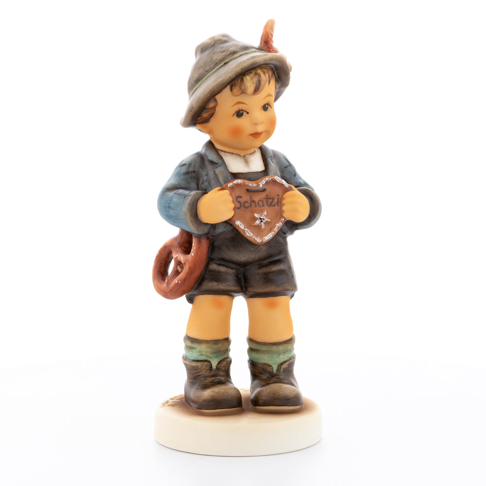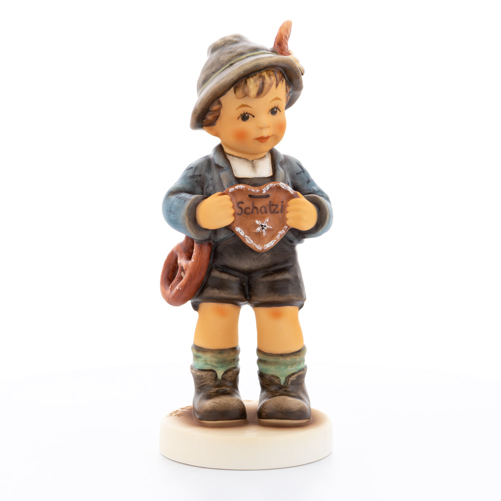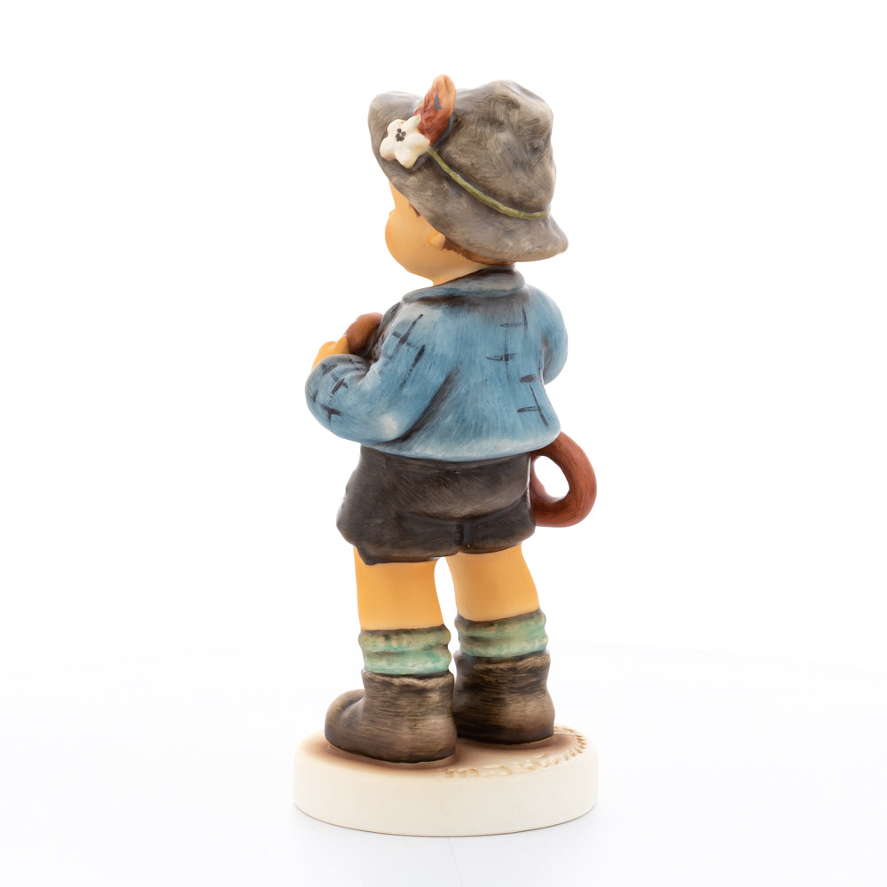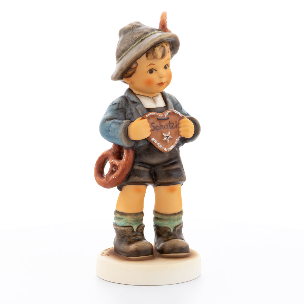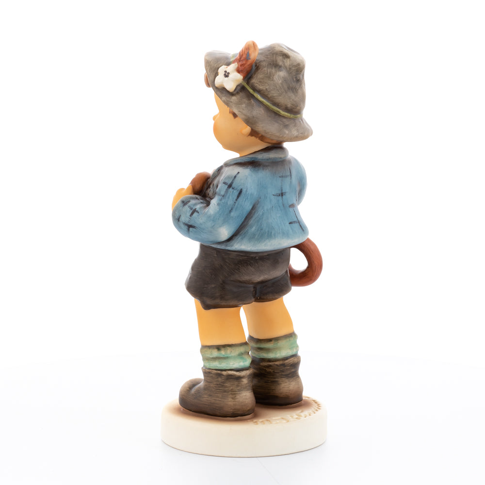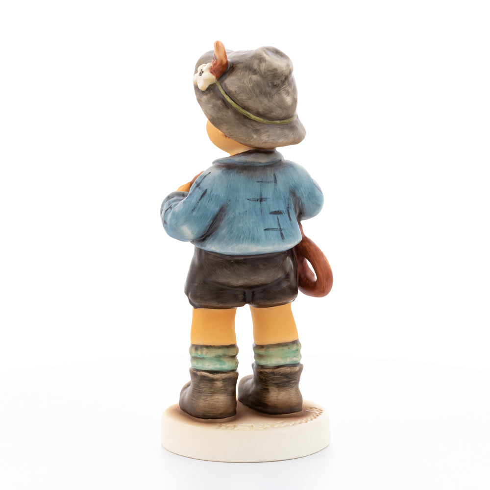 Wie seine Partnerin, die Hummel-Figur „Du gehörst zu mir“ (HUM 2446), trägt das Hummel-Kind traditionelle bayerische Tracht, bestehend aus Lederhosen und Hemd, der passenden Jacke in Blau sowie dem Hut mit Federgesteck. Aus den schwarzen Stiefeln gucken dicke grüne Socken hervor, während er eine leckere Brezn als Wegzehrung unter dem Arm hat.