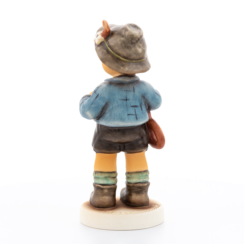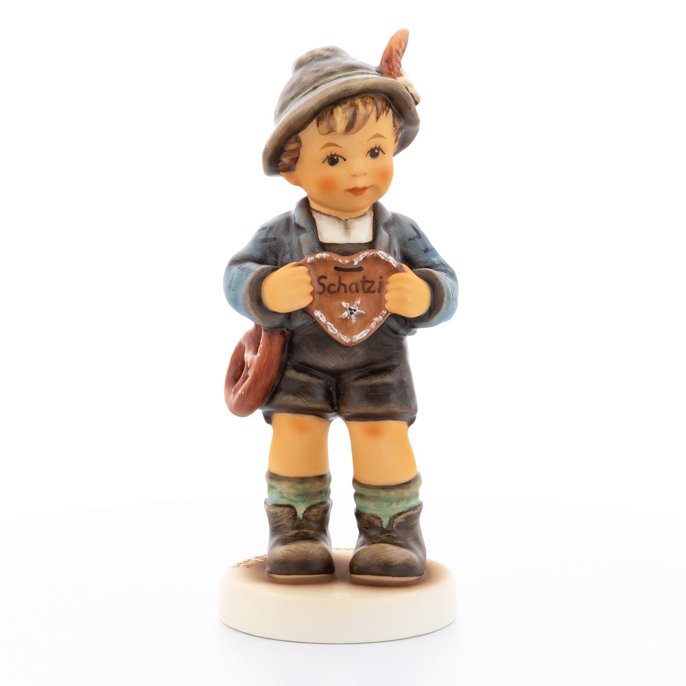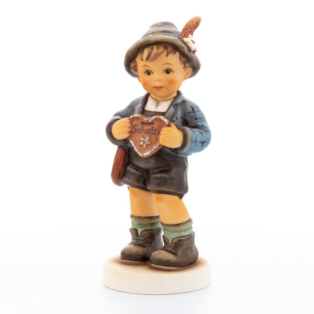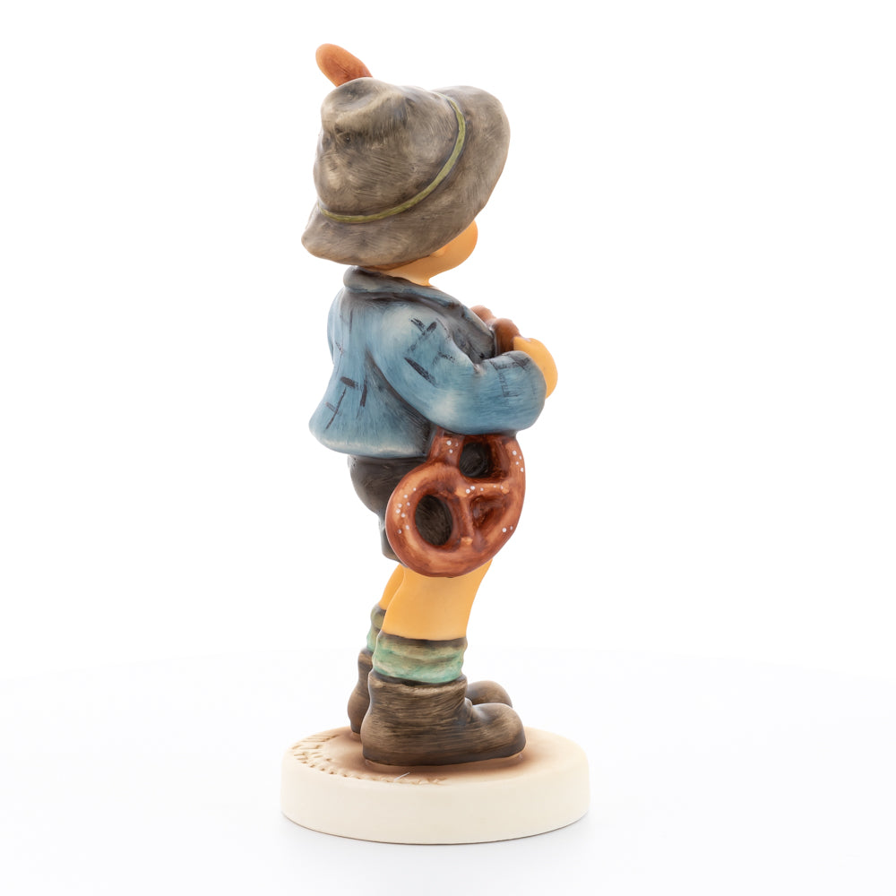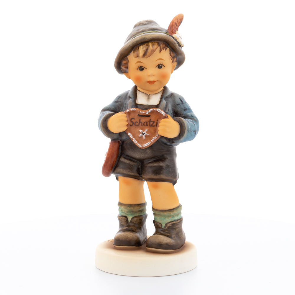 Wie seine Partnerin, die Hummel-Figur „Du gehörst zu mir“ (HUM 2446), trägt das Hummel-Kind traditionelle bayerische Tracht, bestehend aus Lederhosen und Hemd, der passenden Jacke in Blau sowie dem Hut mit Federgesteck. Aus den schwarzen Stiefeln gucken dicke grüne Socken hervor, während er eine leckere Brezn als Wegzehrung unter dem Arm hat.