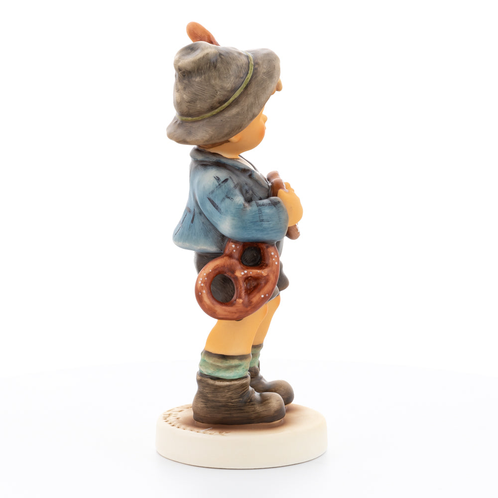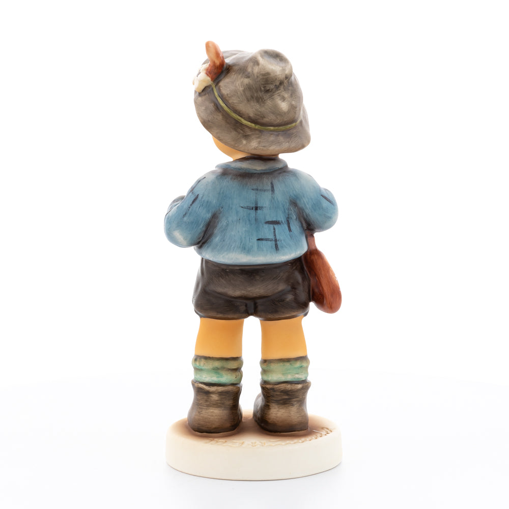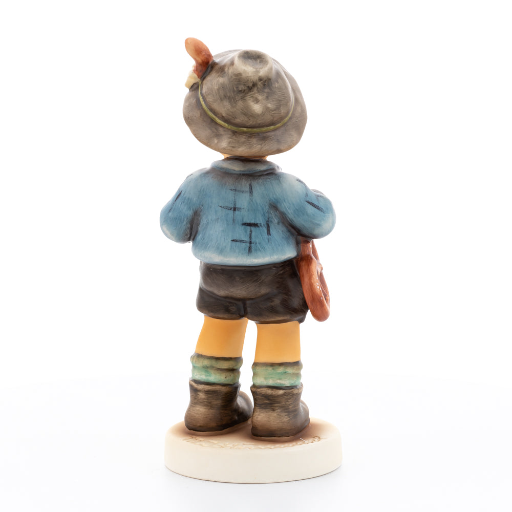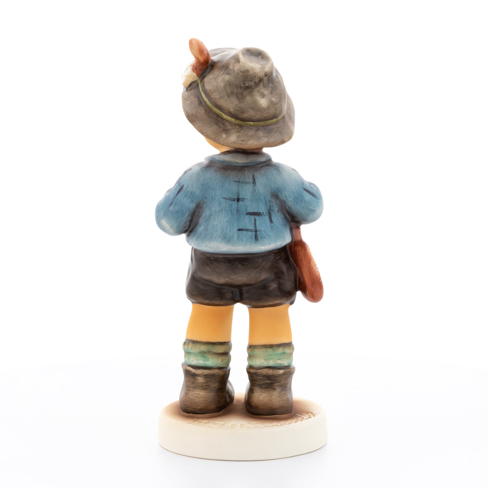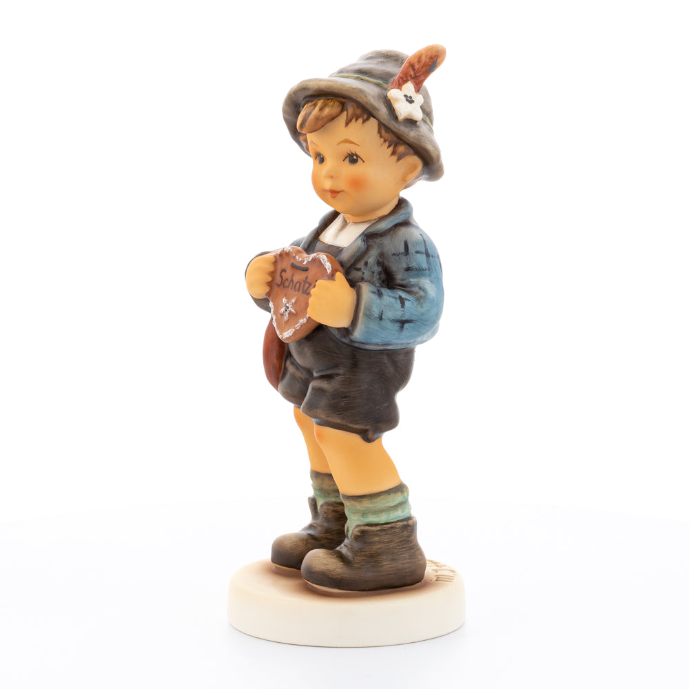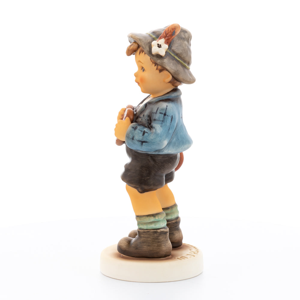 Wie seine Partnerin, die Hummel-Figur „Du gehörst zu mir“ (HUM 2446), trägt das Hummel-Kind traditionelle bayerische Tracht, bestehend aus Lederhosen und Hemd, der passenden Jacke in Blau sowie dem Hut mit Federgesteck. Aus den schwarzen Stiefeln gucken dicke grüne Socken hervor, während er eine leckere Brezn als Wegzehrung unter dem Arm hat.