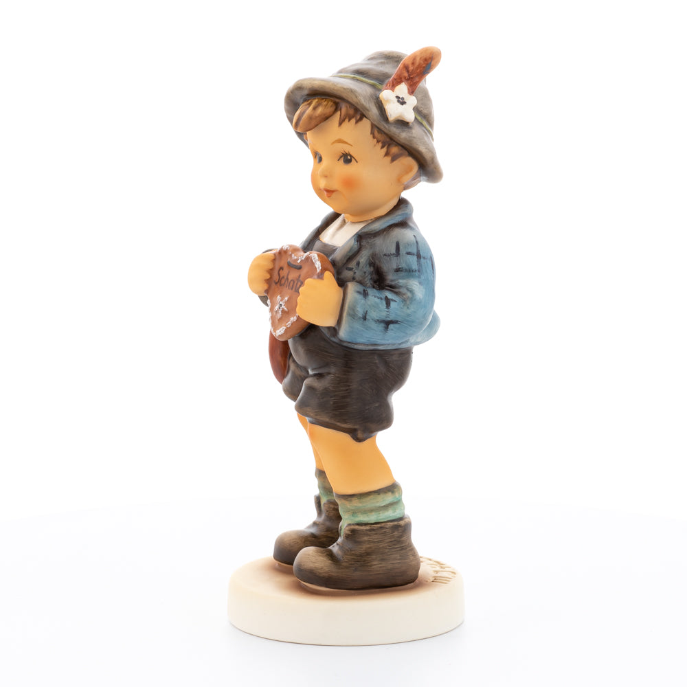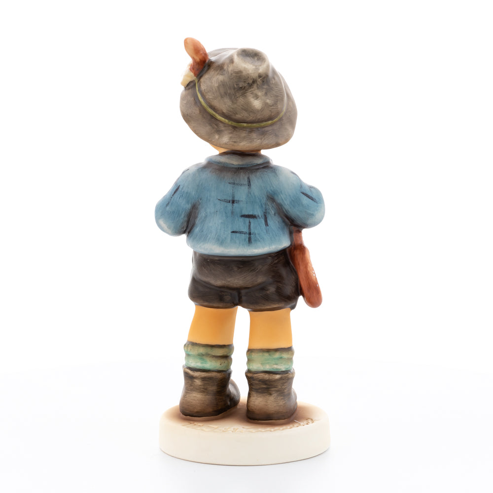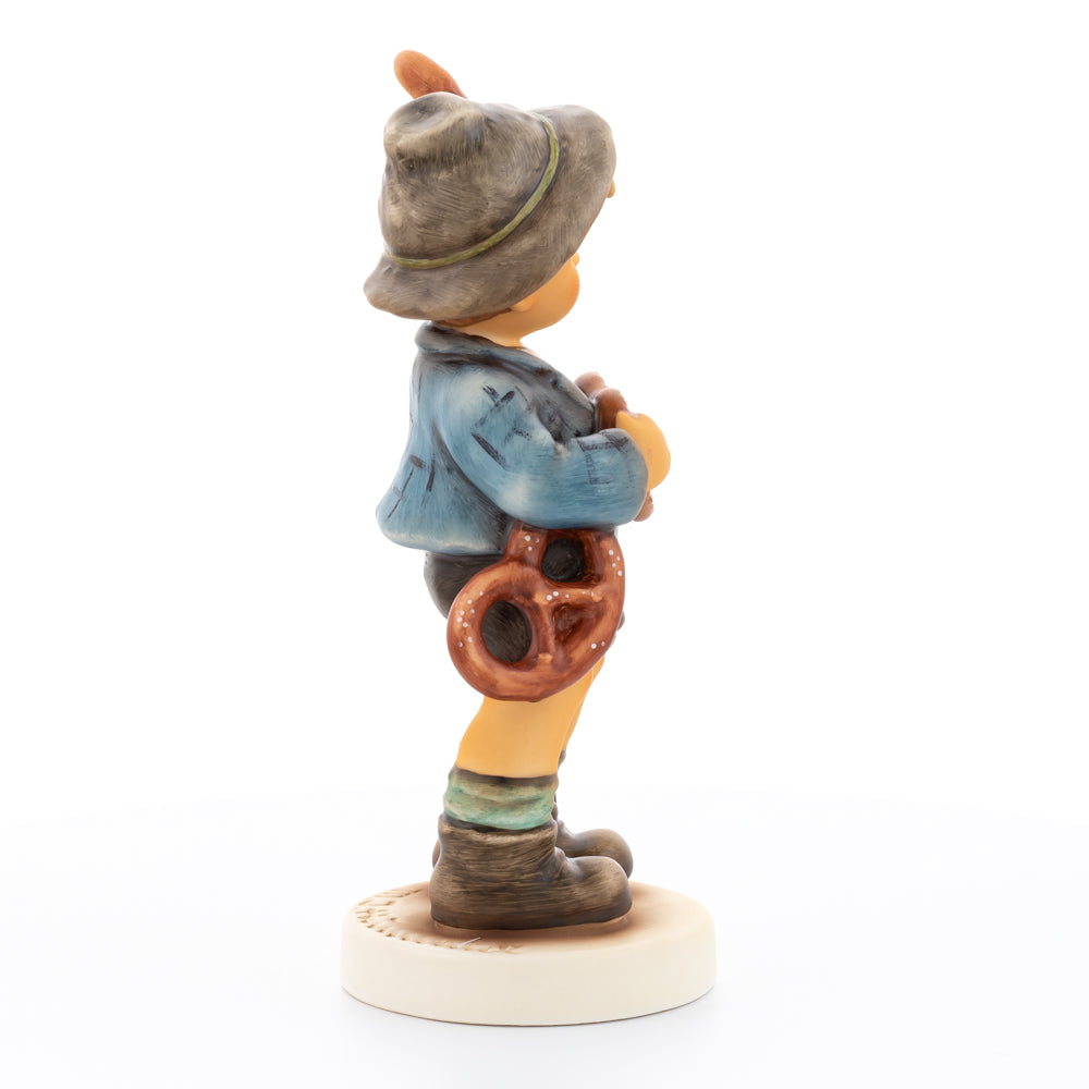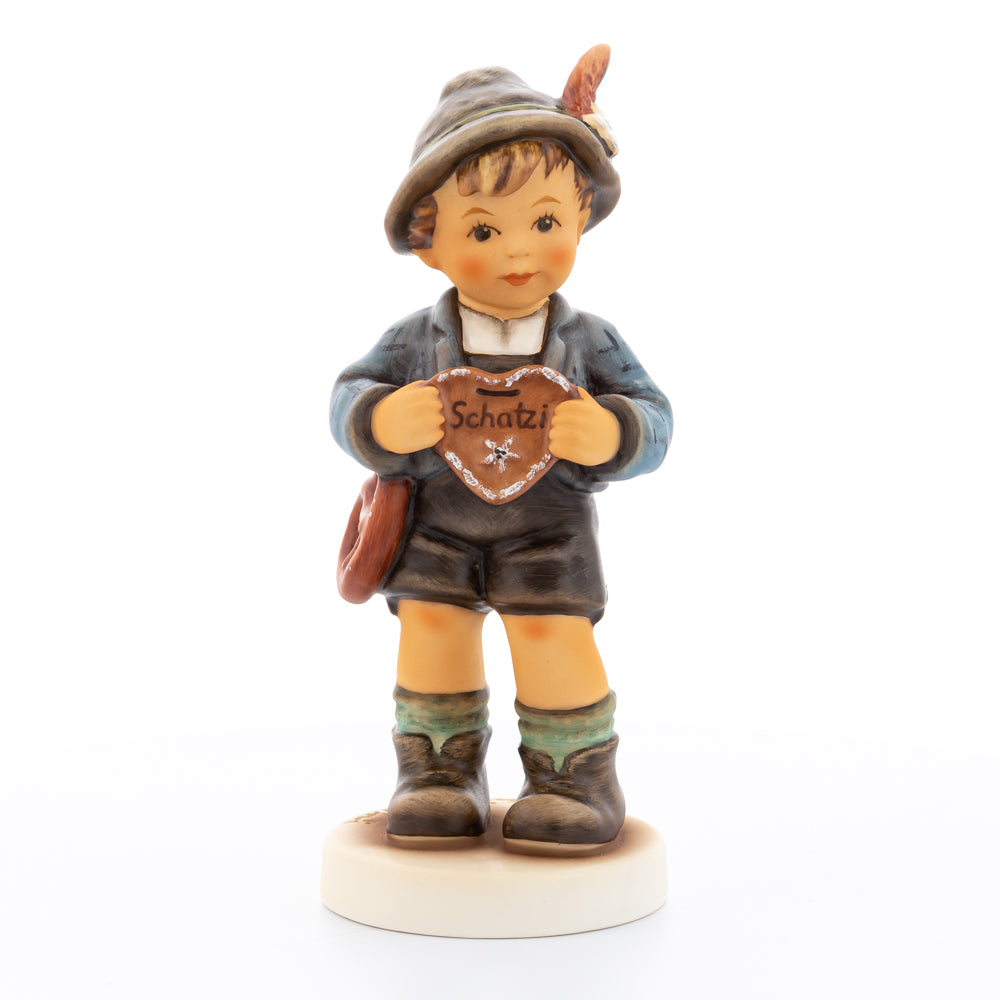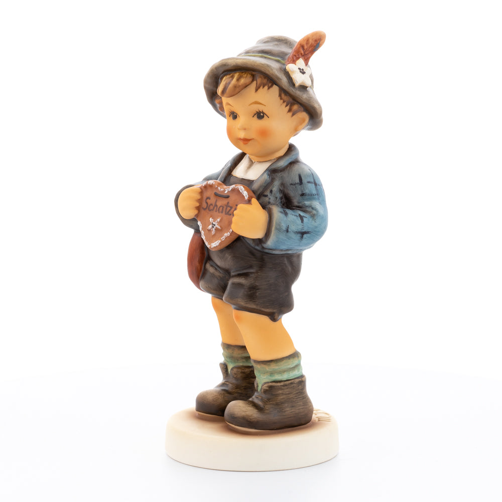 Wie seine Partnerin, die Hummel-Figur „Du gehörst zu mir“ (HUM 2446), trägt das Hummel-Kind traditionelle bayerische Tracht, bestehend aus Lederhosen und Hemd, der passenden Jacke in Blau sowie dem Hut mit Federgesteck. Aus den schwarzen Stiefeln gucken dicke grüne Socken hervor, während er eine leckere Brezn als Wegzehrung unter dem Arm hat.