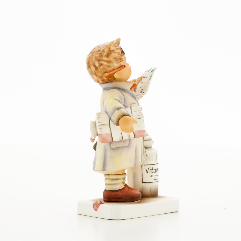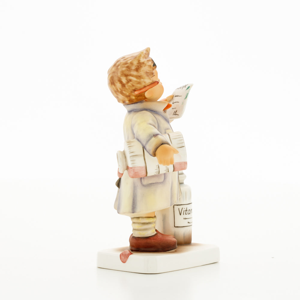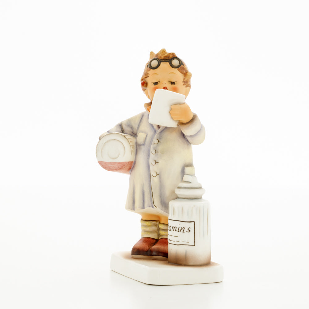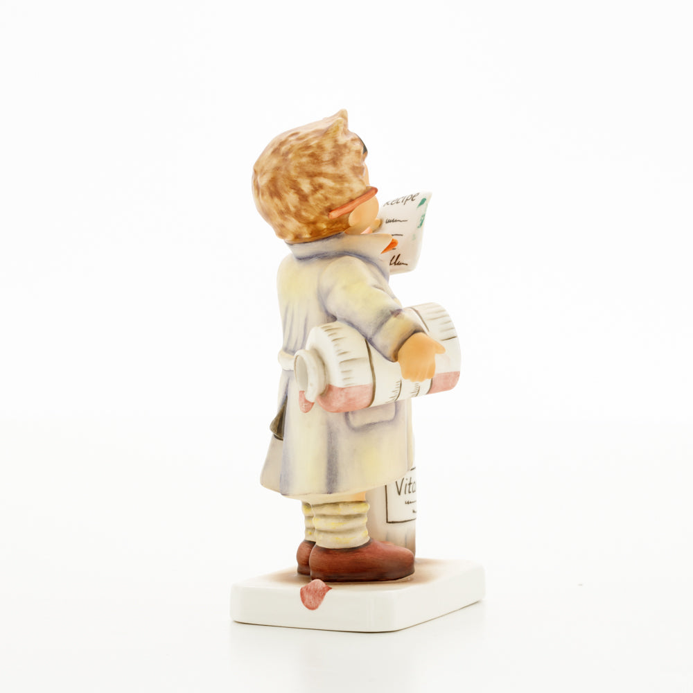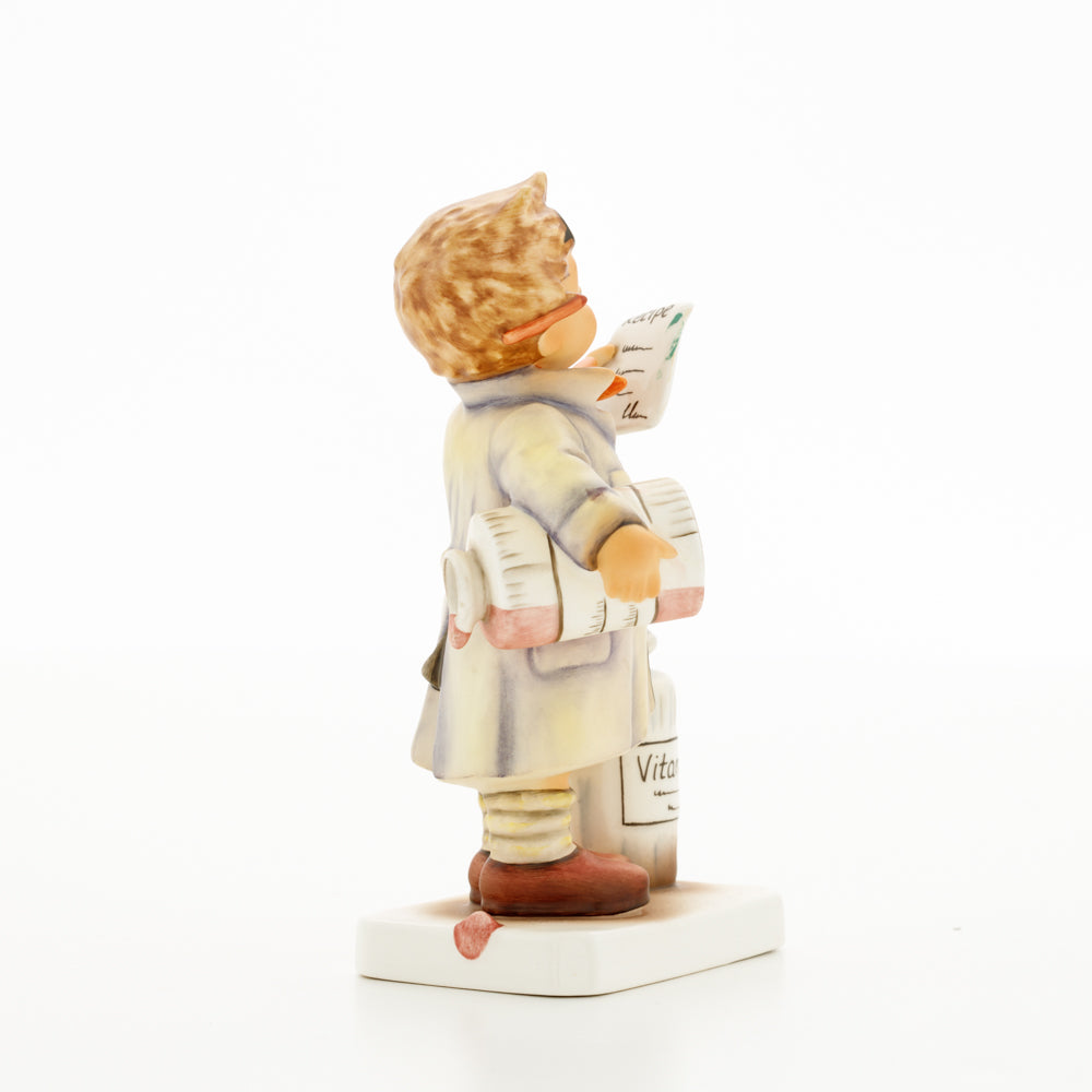 "Mmh....was steht auf dem Rezept?" Gewissenhaft und äußerst genau studiert der Apotheker aus der Hummel Manufaktur Rödental den kleinen Zettel in seiner Hand. Mit Brille auf dem Kopf und Stift hinter dem Ohr macht sich die original M.I. Hummel-Figur eifrig an die Arbeit. Zu den Füßen des Apothekers steht schon ein Medikament. Oder ist doch die Tablettendose, die der Hummel-Junge unter dem Arm hält, das Richtige? Der geschäftige Hummel-Apotheker wurde 1955 von Karl Wagner erschaffen und kam 1962 auf den amerikanischen Markt. Die Hummel-Figur wurde im Herbst 1987 umgestaltet und mit einem neuen Sockel versehen. Auch wurden minimale Details an der M.I. Hummel-Figur verändert bzw. neugestaltet.