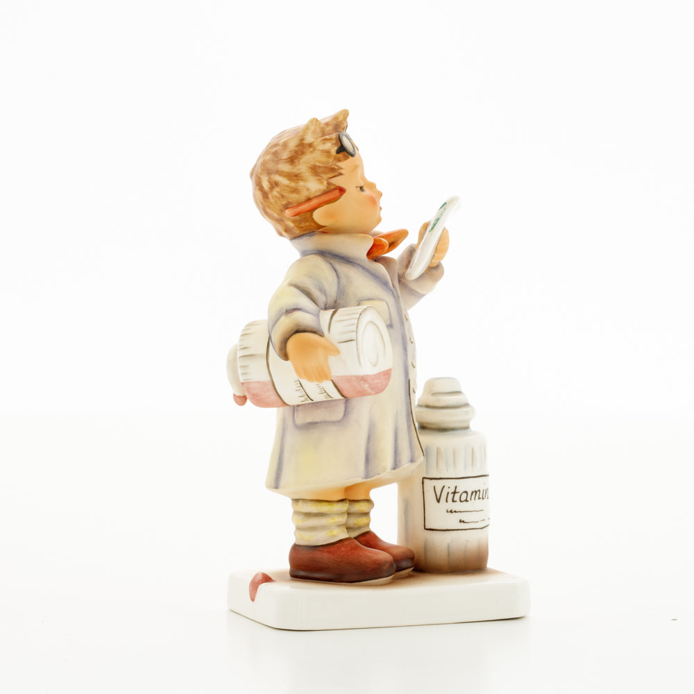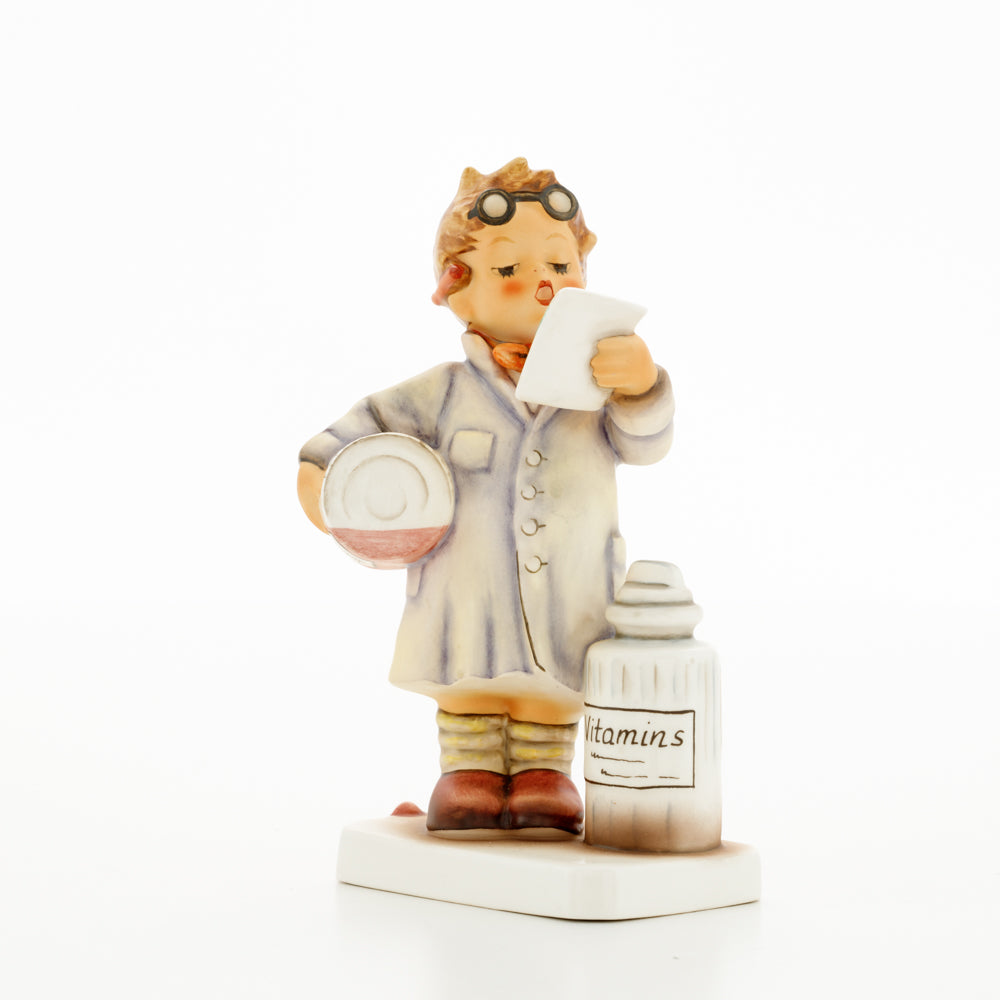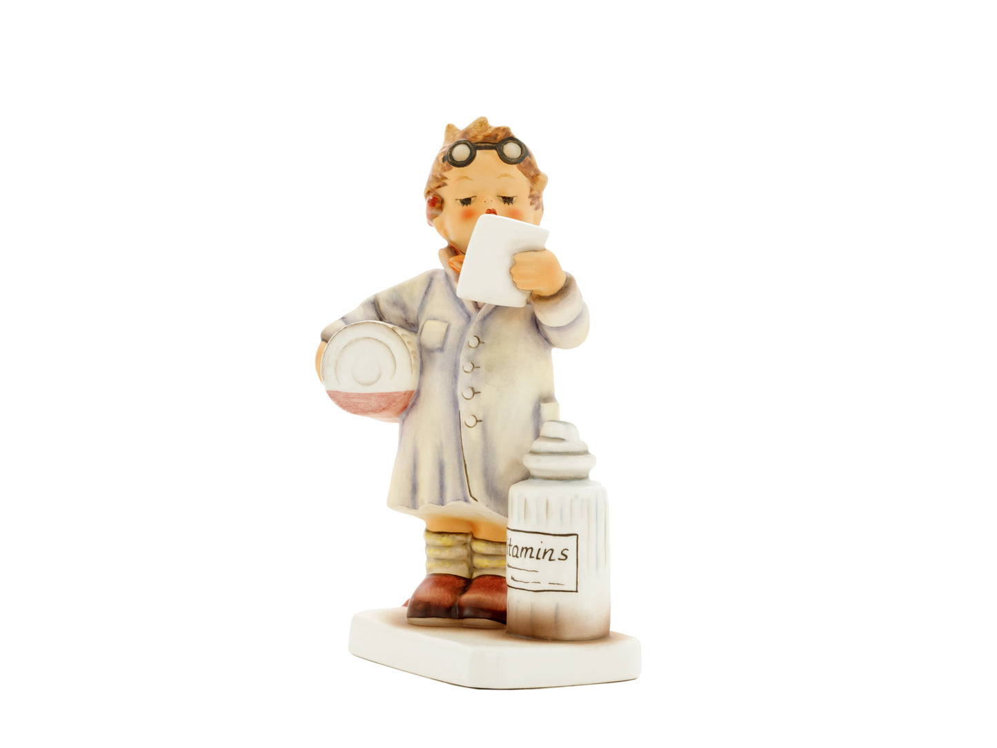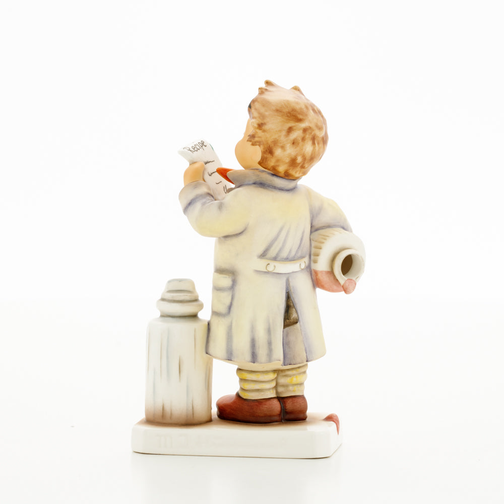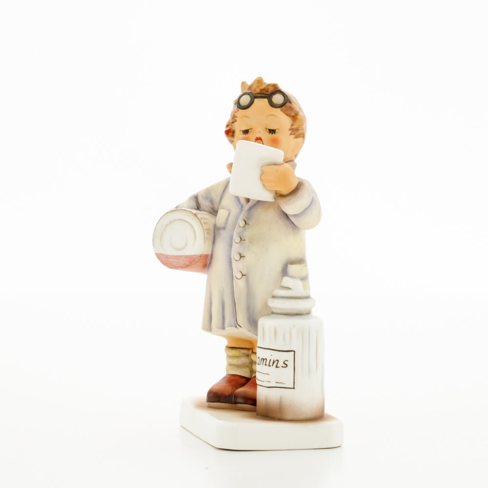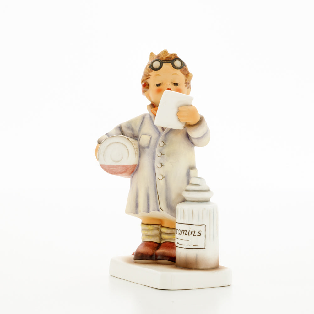 "Mmh....was steht auf dem Rezept?" Gewissenhaft und äußerst genau studiert der Apotheker aus der Hummel Manufaktur Rödental den kleinen Zettel in seiner Hand. Mit Brille auf dem Kopf und Stift hinter dem Ohr macht sich die original M.I. Hummel-Figur eifrig an die Arbeit. Zu den Füßen des Apothekers steht schon ein Medikament. Oder ist doch die Tablettendose, die der Hummel-Junge unter dem Arm hält, das Richtige? Der geschäftige Hummel-Apotheker wurde 1955 von Karl Wagner erschaffen und kam 1962 auf den amerikanischen Markt. Die Hummel-Figur wurde im Herbst 1987 umgestaltet und mit einem neuen Sockel versehen. Auch wurden minimale Details an der M.I. Hummel-Figur verändert bzw. neugestaltet.