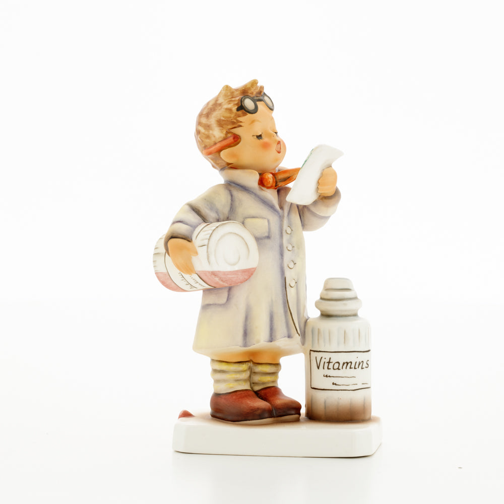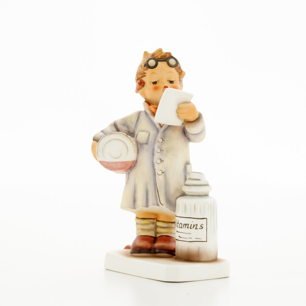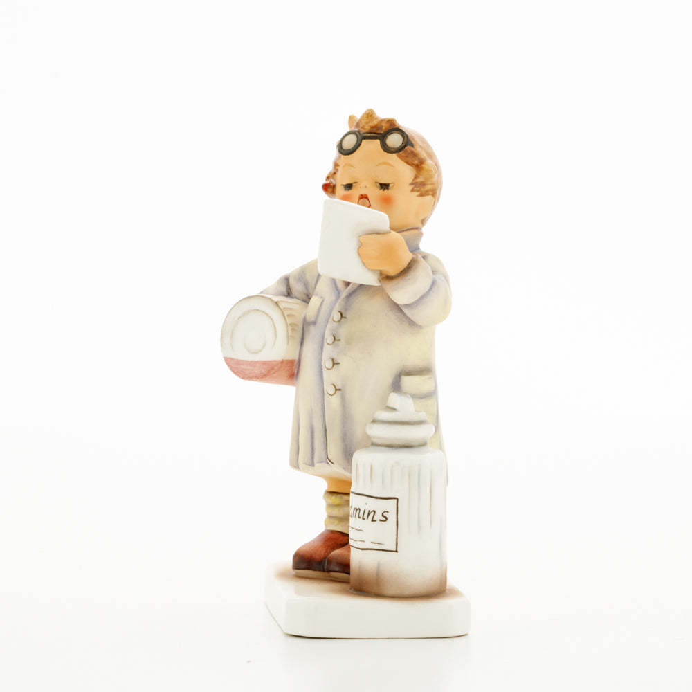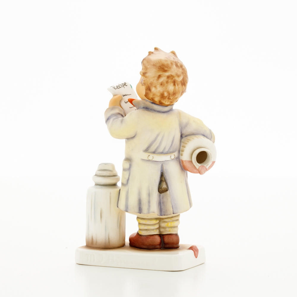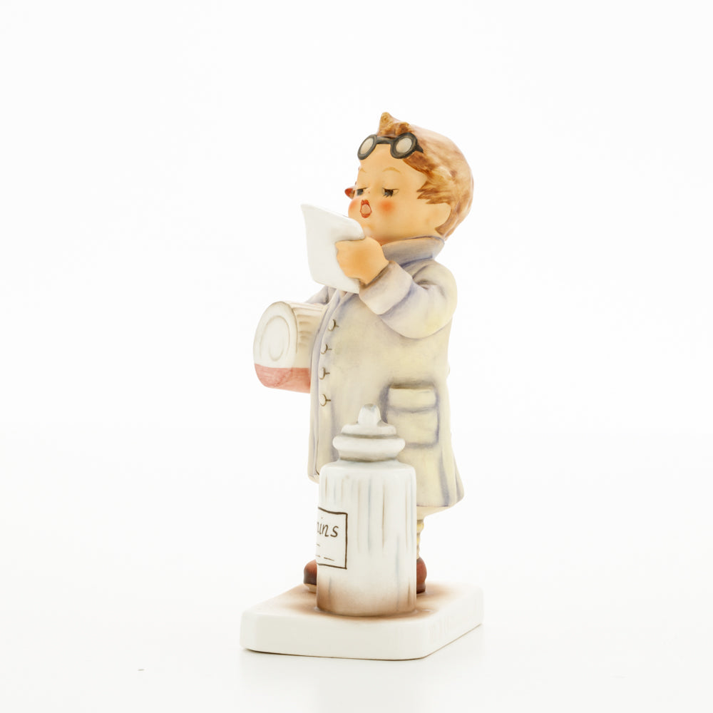 "Mmh....was steht auf dem Rezept?" Gewissenhaft und äußerst genau studiert der Apotheker aus der Hummel Manufaktur Rödental den kleinen Zettel in seiner Hand. Mit Brille auf dem Kopf und Stift hinter dem Ohr macht sich die original M.I. Hummel-Figur eifrig an die Arbeit. Zu den Füßen des Apothekers steht schon ein Medikament. Oder ist doch die Tablettendose, die der Hummel-Junge unter dem Arm hält, das Richtige? Der geschäftige Hummel-Apotheker wurde 1955 von Karl Wagner erschaffen und kam 1962 auf den amerikanischen Markt. Die Hummel-Figur wurde im Herbst 1987 umgestaltet und mit einem neuen Sockel versehen. Auch wurden minimale Details an der M.I. Hummel-Figur verändert bzw. neugestaltet.