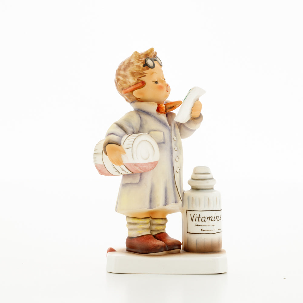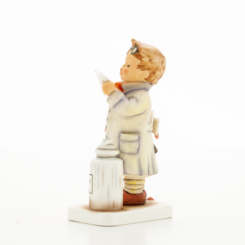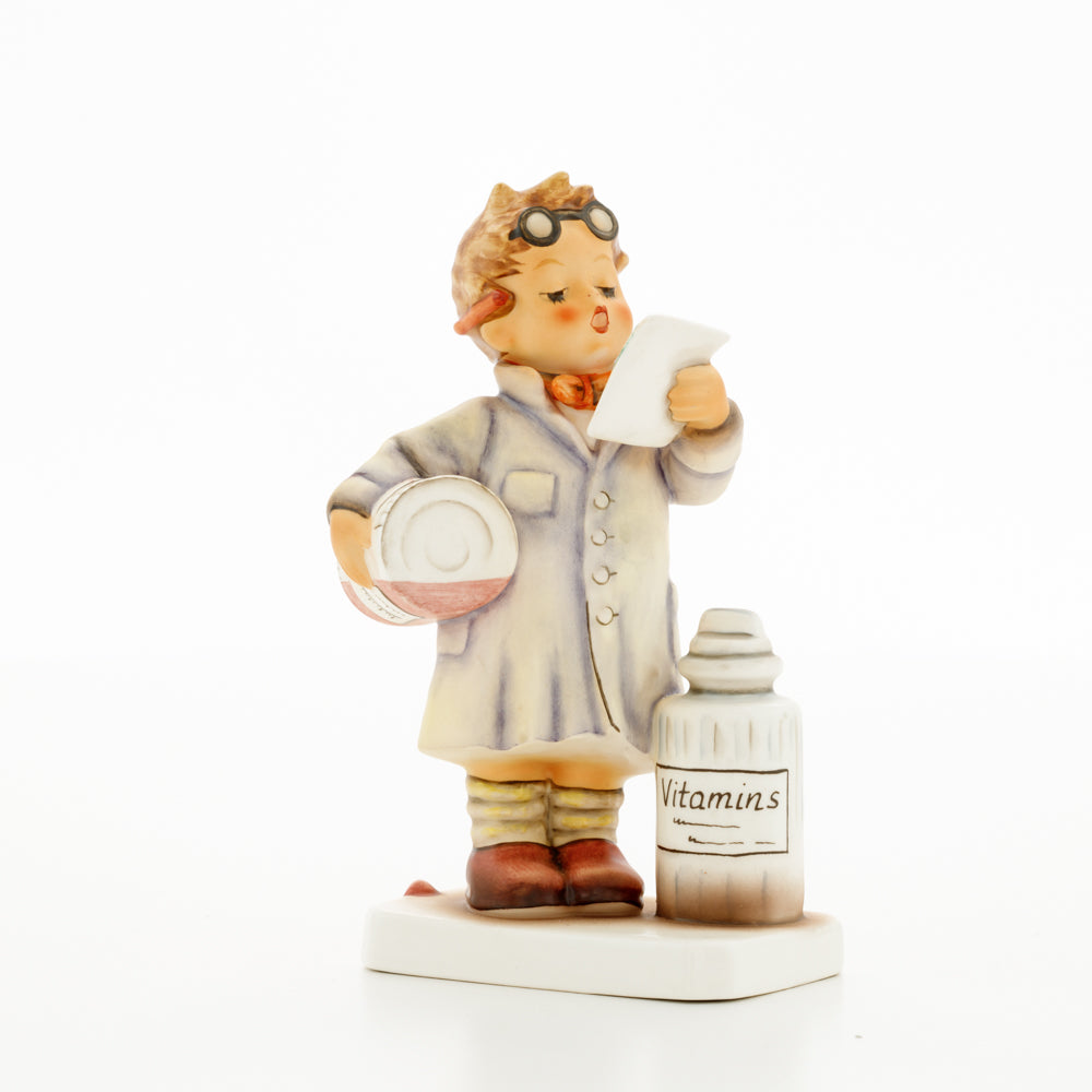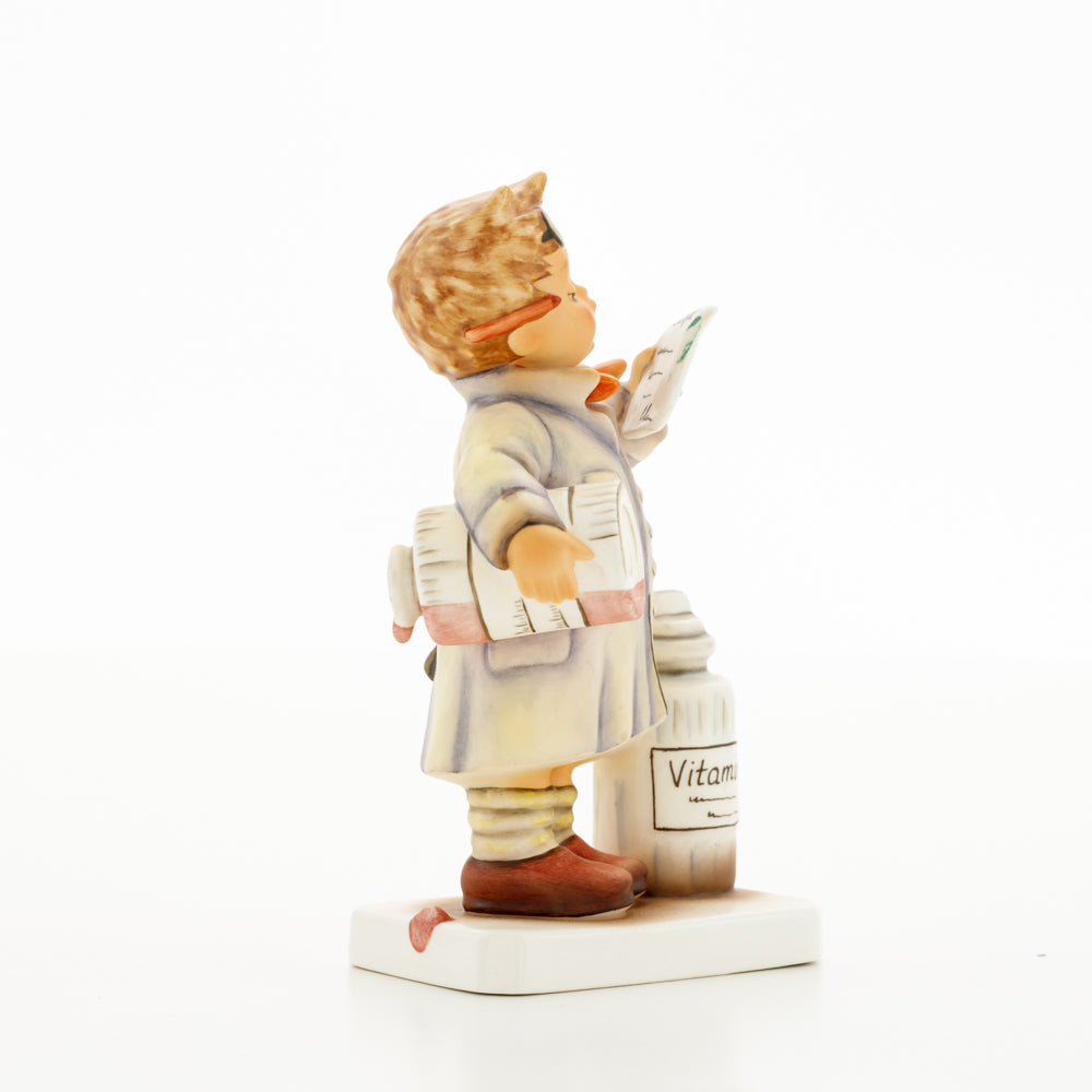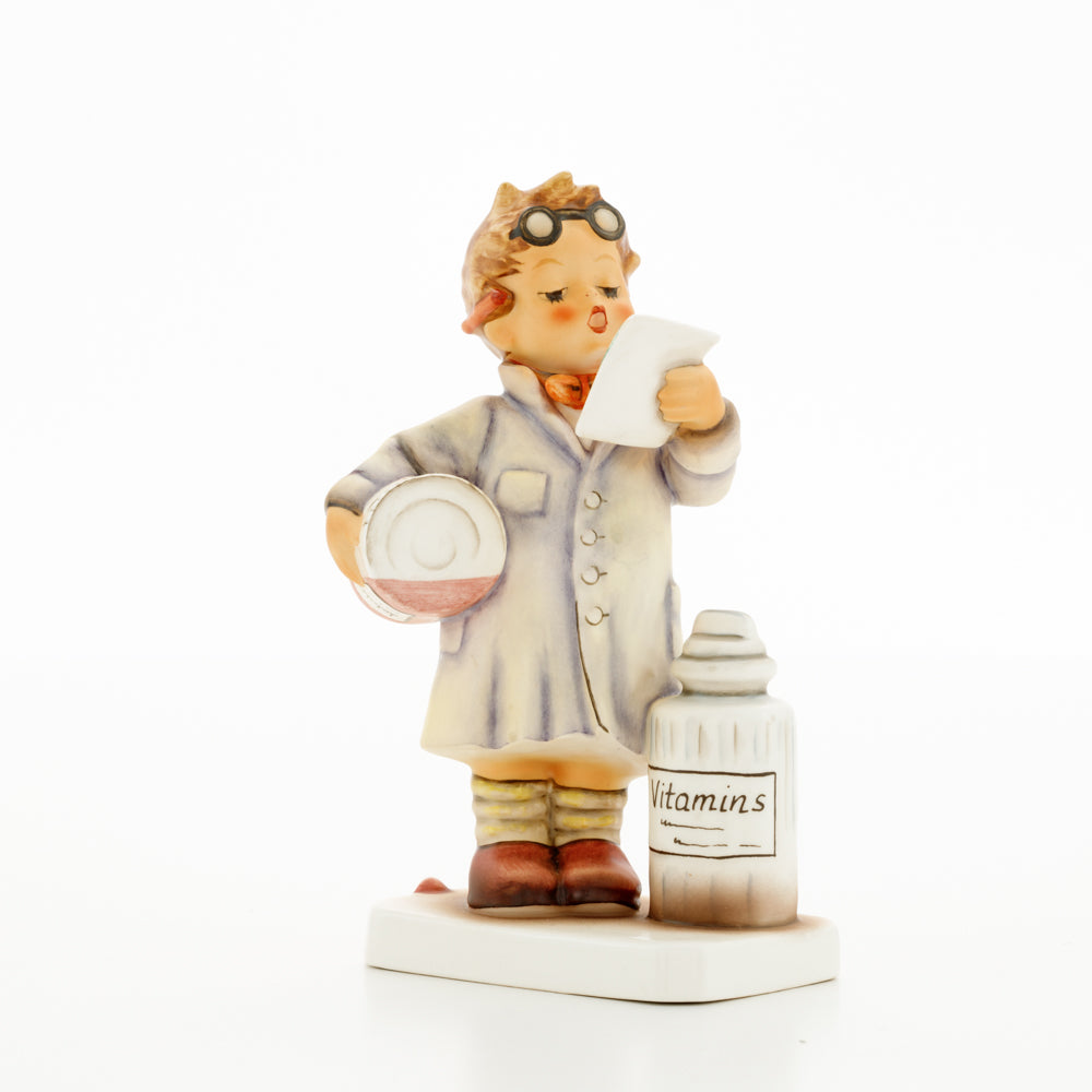 "Mmh....was steht auf dem Rezept?" Gewissenhaft und äußerst genau studiert der Apotheker aus der Hummel Manufaktur Rödental den kleinen Zettel in seiner Hand. Mit Brille auf dem Kopf und Stift hinter dem Ohr macht sich die original M.I. Hummel-Figur eifrig an die Arbeit. Zu den Füßen des Apothekers steht schon ein Medikament. Oder ist doch die Tablettendose, die der Hummel-Junge unter dem Arm hält, das Richtige? Der geschäftige Hummel-Apotheker wurde 1955 von Karl Wagner erschaffen und kam 1962 auf den amerikanischen Markt. Die Hummel-Figur wurde im Herbst 1987 umgestaltet und mit einem neuen Sockel versehen. Auch wurden minimale Details an der M.I. Hummel-Figur verändert bzw. neugestaltet.