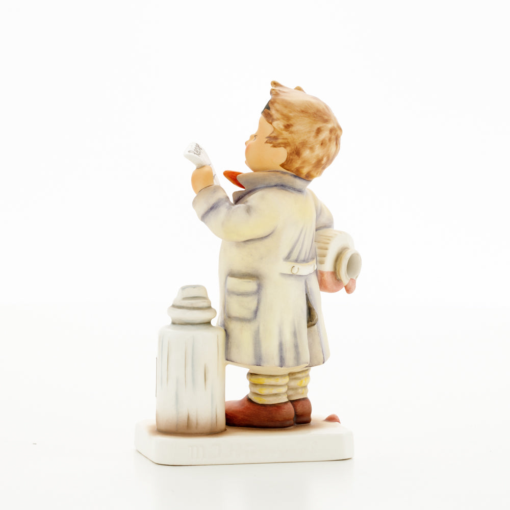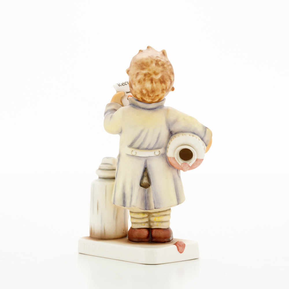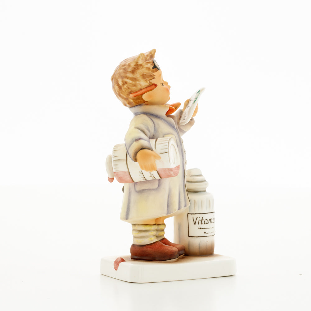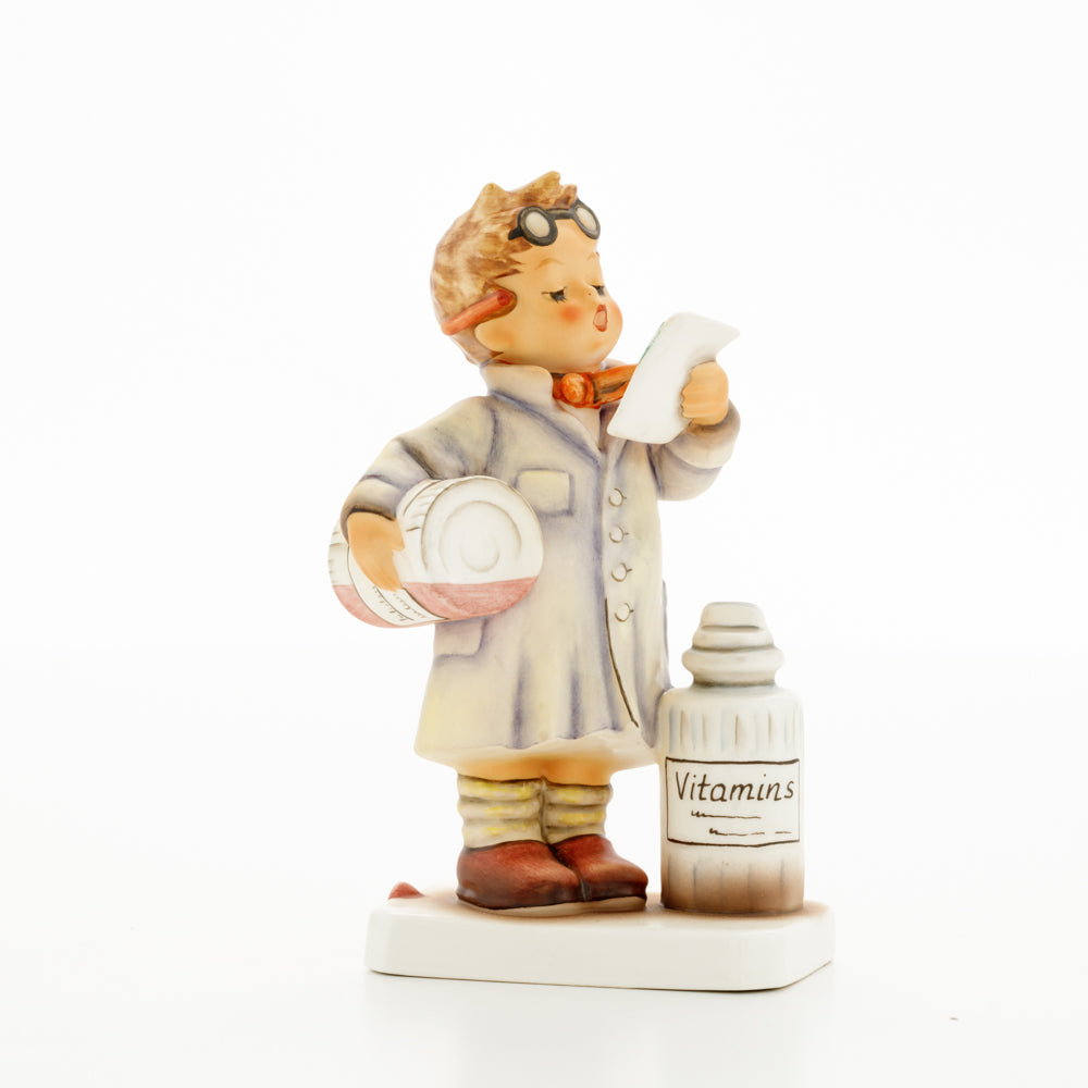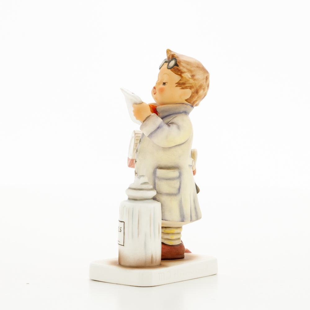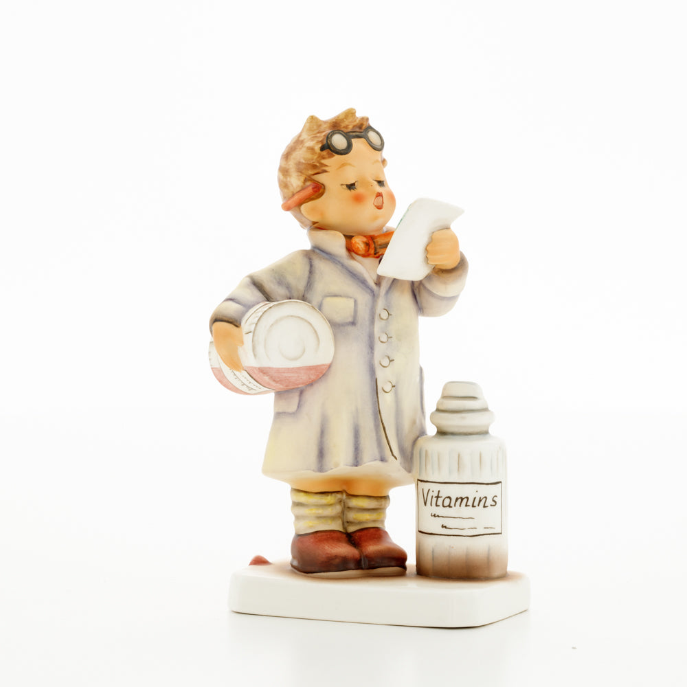 "Mmh....was steht auf dem Rezept?" Gewissenhaft und äußerst genau studiert der Apotheker aus der Hummel Manufaktur Rödental den kleinen Zettel in seiner Hand. Mit Brille auf dem Kopf und Stift hinter dem Ohr macht sich die original M.I. Hummel-Figur eifrig an die Arbeit. Zu den Füßen des Apothekers steht schon ein Medikament. Oder ist doch die Tablettendose, die der Hummel-Junge unter dem Arm hält, das Richtige? Der geschäftige Hummel-Apotheker wurde 1955 von Karl Wagner erschaffen und kam 1962 auf den amerikanischen Markt. Die Hummel-Figur wurde im Herbst 1987 umgestaltet und mit einem neuen Sockel versehen. Auch wurden minimale Details an der M.I. Hummel-Figur verändert bzw. neugestaltet.