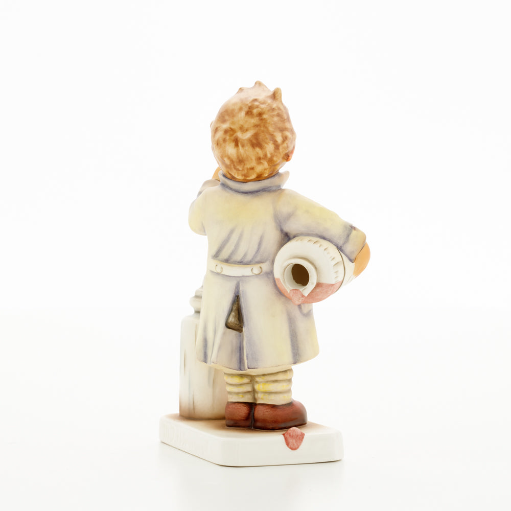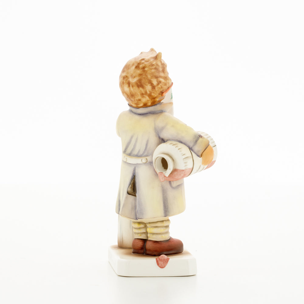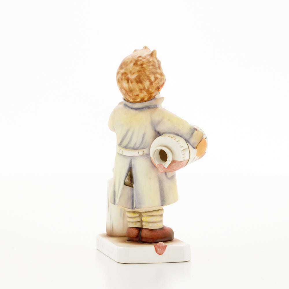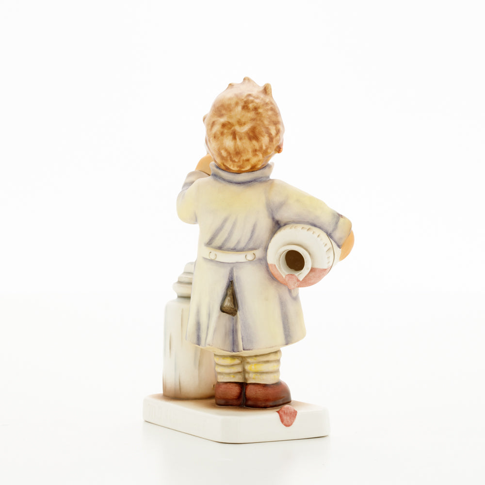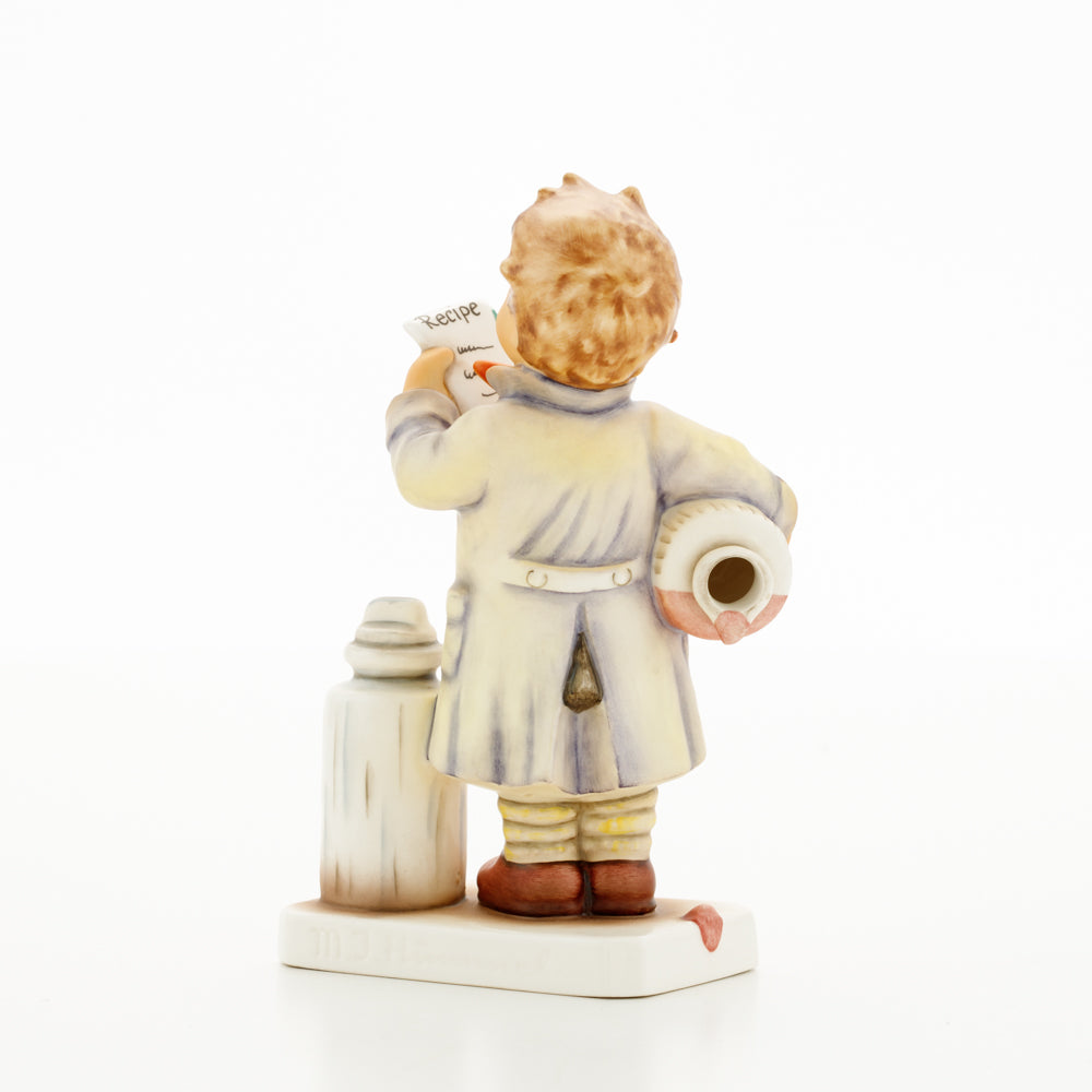 "Mmh....was steht auf dem Rezept?" Gewissenhaft und äußerst genau studiert der Apotheker aus der Hummel Manufaktur Rödental den kleinen Zettel in seiner Hand. Mit Brille auf dem Kopf und Stift hinter dem Ohr macht sich die original M.I. Hummel-Figur eifrig an die Arbeit. Zu den Füßen des Apothekers steht schon ein Medikament. Oder ist doch die Tablettendose, die der Hummel-Junge unter dem Arm hält, das Richtige? Der geschäftige Hummel-Apotheker wurde 1955 von Karl Wagner erschaffen und kam 1962 auf den amerikanischen Markt. Die Hummel-Figur wurde im Herbst 1987 umgestaltet und mit einem neuen Sockel versehen. Auch wurden minimale Details an der M.I. Hummel-Figur verändert bzw. neugestaltet.