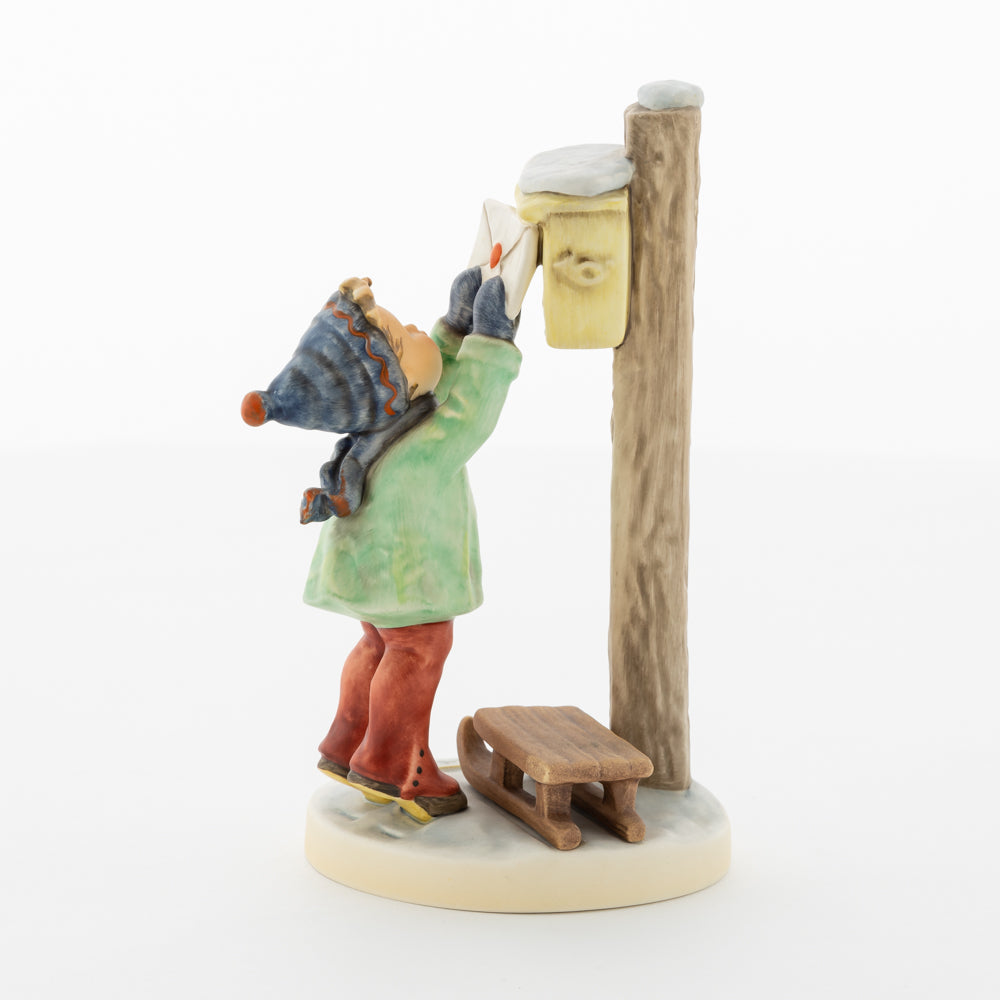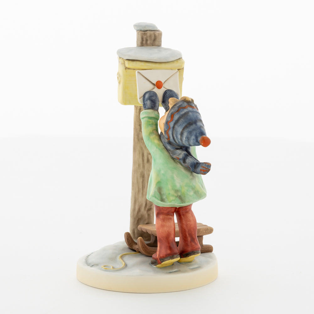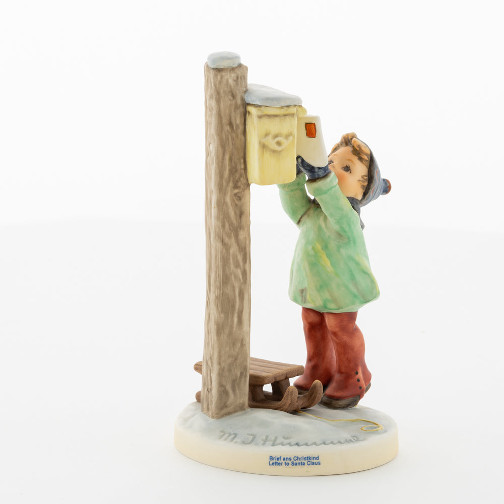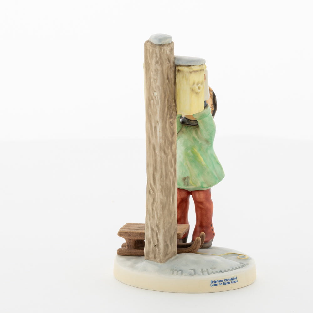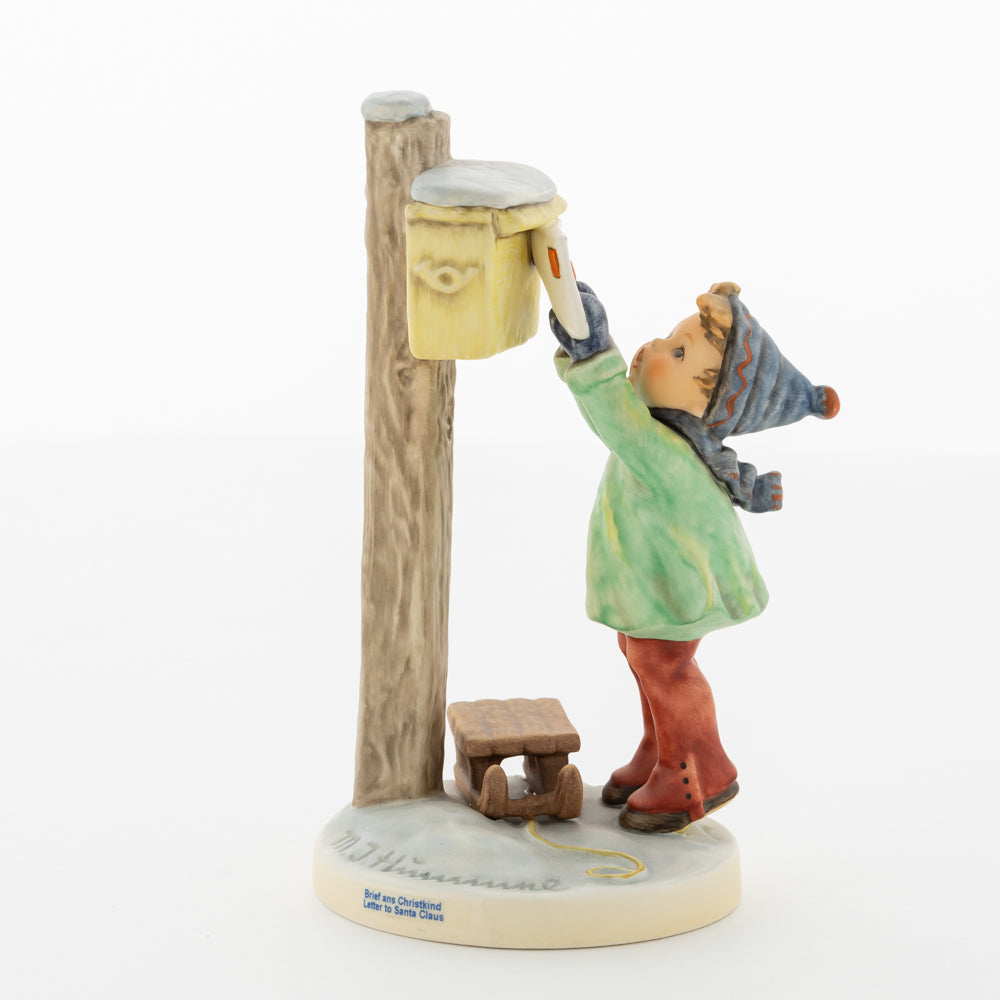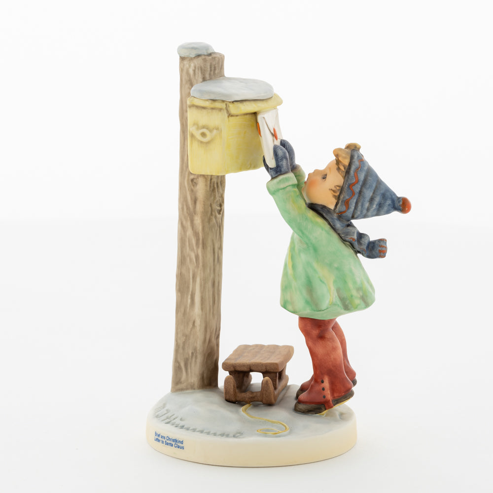 Die original Hummel-Figur „Brief ans Christkind" mit einer Größe von 18 Zentimeter wurde von Meistermodelleur Gerhard Skrobek entworfen. Sie weckt nicht nur Kindheitserinnerungen, sondern verzaubert den Betrachter durch ihren typischen Hummel-Charme. Gemeinsam mit Figuren wie „Ein Lichtlein brennt“ (HUM 2390) oder „Wir haben’s doch eilig“ (HUM 2362) bringt „Brief ans Christkind“ den Zauber der Weihnachtszeit zu Ihnen nach Hause. Weil sie zeitlos sind, eignen sich diese Figuren auch ideal als Nikolaus- oder Weihnachtsgeschenk.
