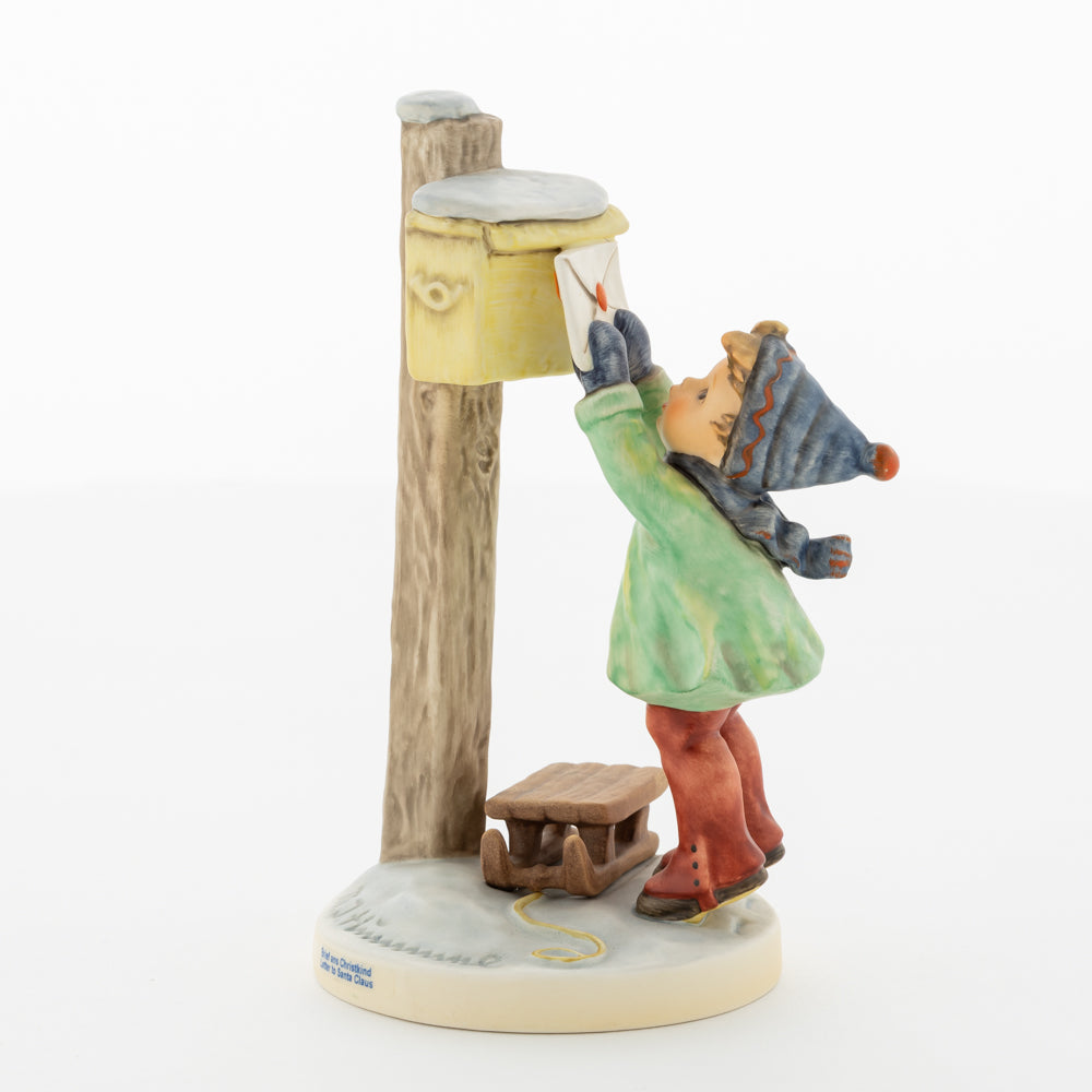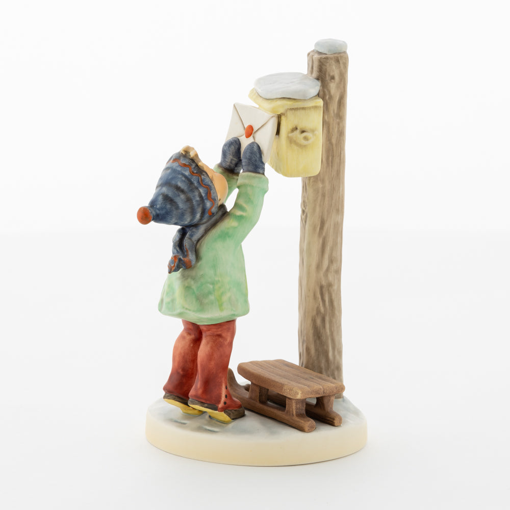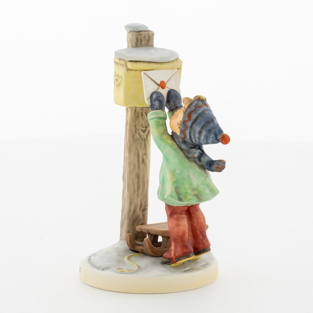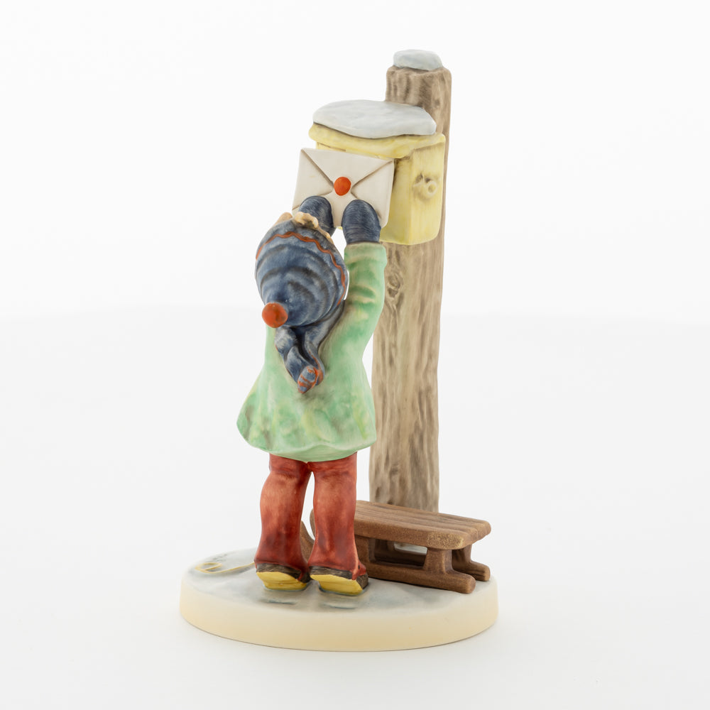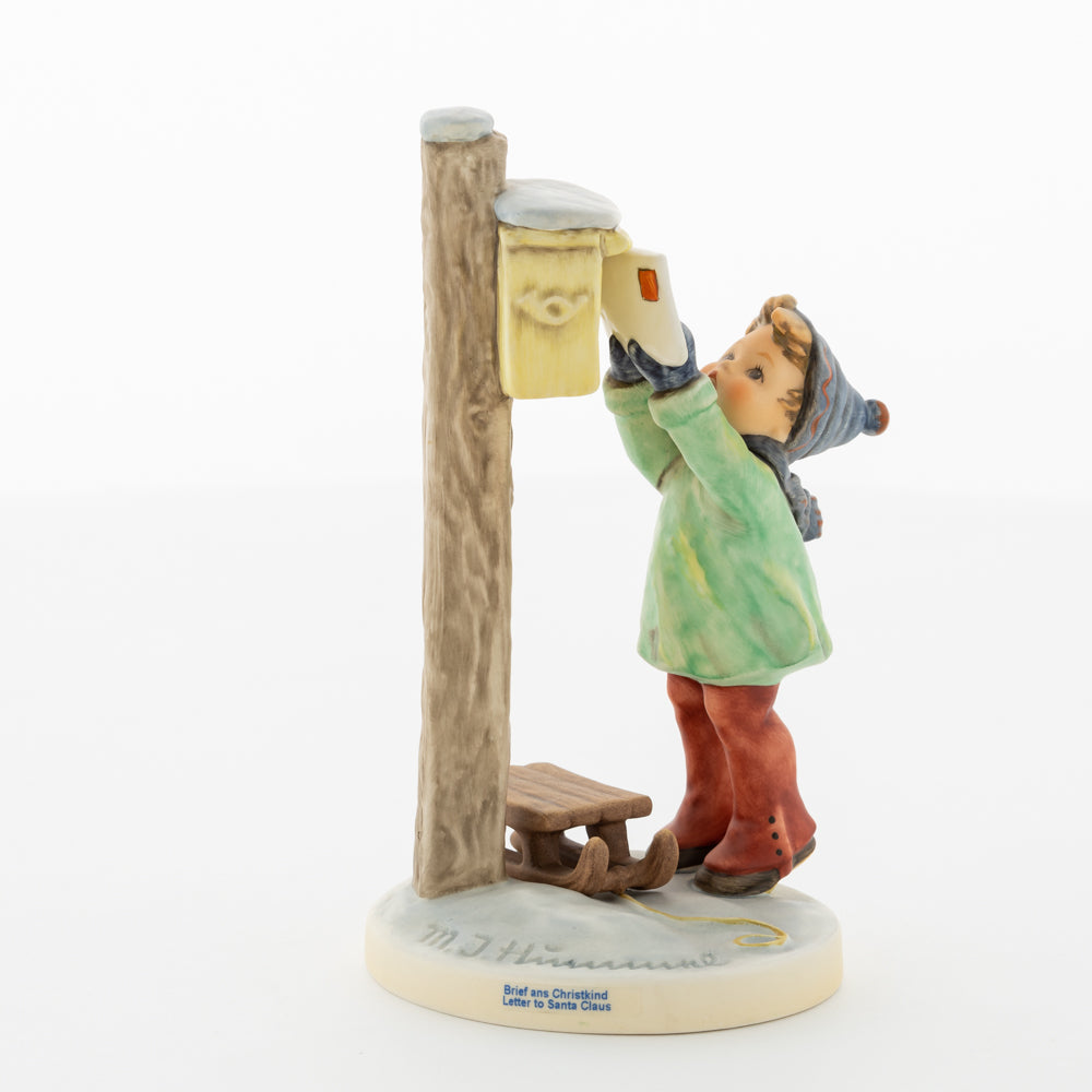 Die original Hummel-Figur „Brief ans Christkind" mit einer Größe von 18 Zentimeter wurde von Meistermodelleur Gerhard Skrobek entworfen. Sie weckt nicht nur Kindheitserinnerungen, sondern verzaubert den Betrachter durch ihren typischen Hummel-Charme. Gemeinsam mit Figuren wie „Ein Lichtlein brennt“ (HUM 2390) oder „Wir haben’s doch eilig“ (HUM 2362) bringt „Brief ans Christkind“ den Zauber der Weihnachtszeit zu Ihnen nach Hause. Weil sie zeitlos sind, eignen sich diese Figuren auch ideal als Nikolaus- oder Weihnachtsgeschenk.
