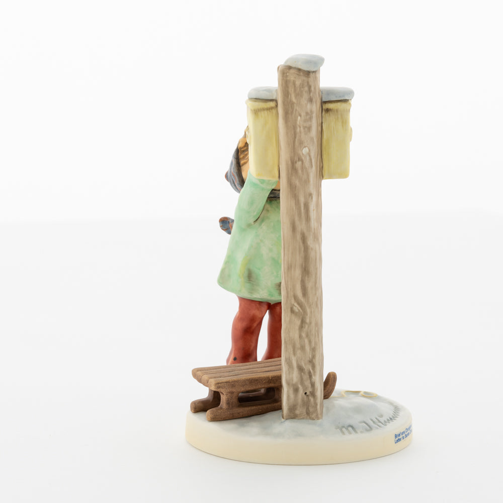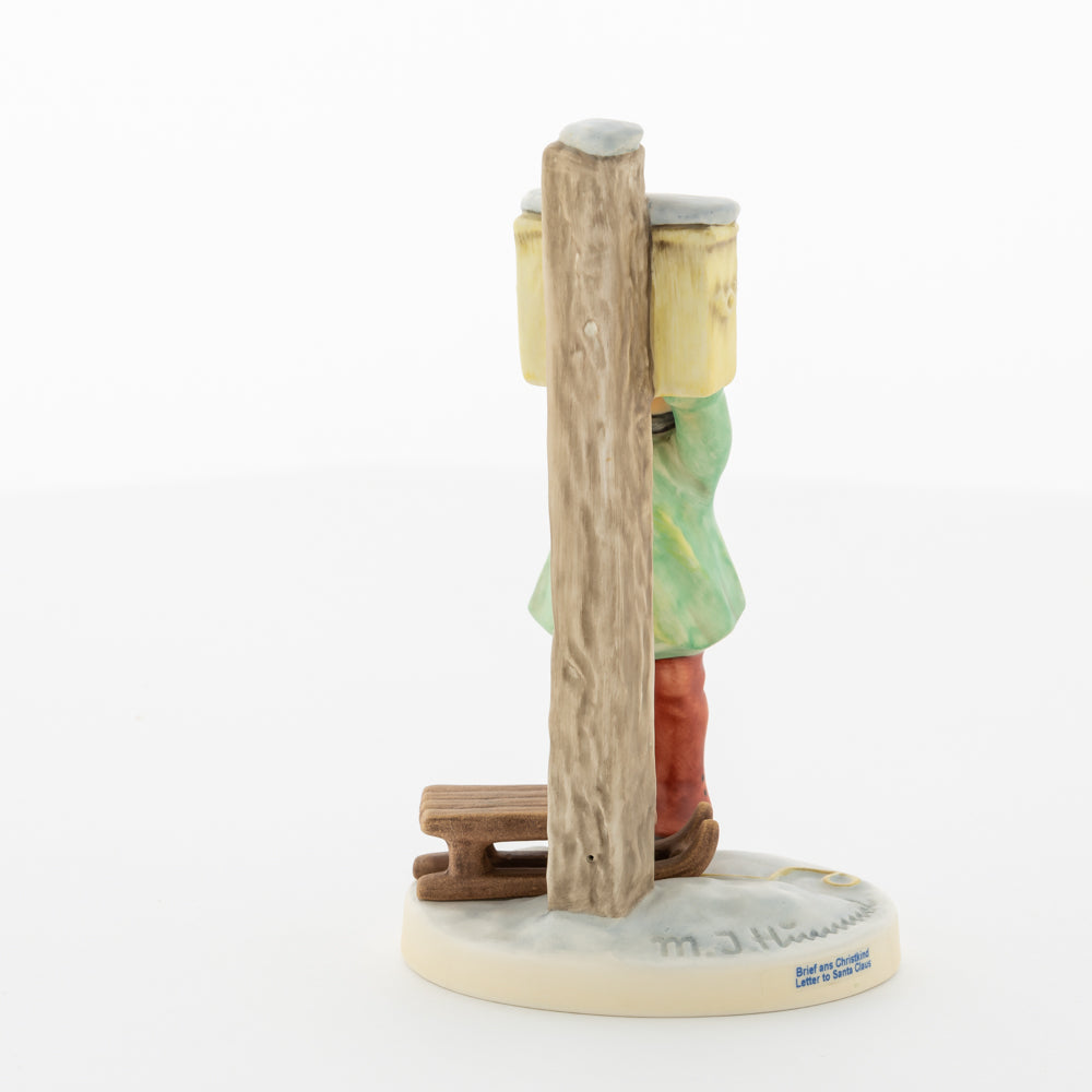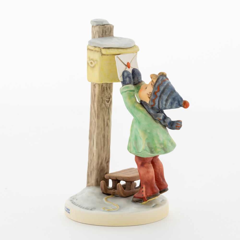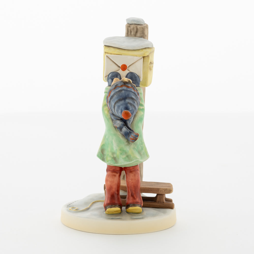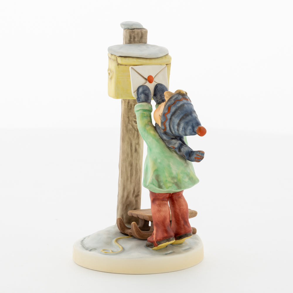 Die original Hummel-Figur „Brief ans Christkind" mit einer Größe von 18 Zentimeter wurde von Meistermodelleur Gerhard Skrobek entworfen. Sie weckt nicht nur Kindheitserinnerungen, sondern verzaubert den Betrachter durch ihren typischen Hummel-Charme. Gemeinsam mit Figuren wie „Ein Lichtlein brennt“ (HUM 2390) oder „Wir haben’s doch eilig“ (HUM 2362) bringt „Brief ans Christkind“ den Zauber der Weihnachtszeit zu Ihnen nach Hause. Weil sie zeitlos sind, eignen sich diese Figuren auch ideal als Nikolaus- oder Weihnachtsgeschenk.