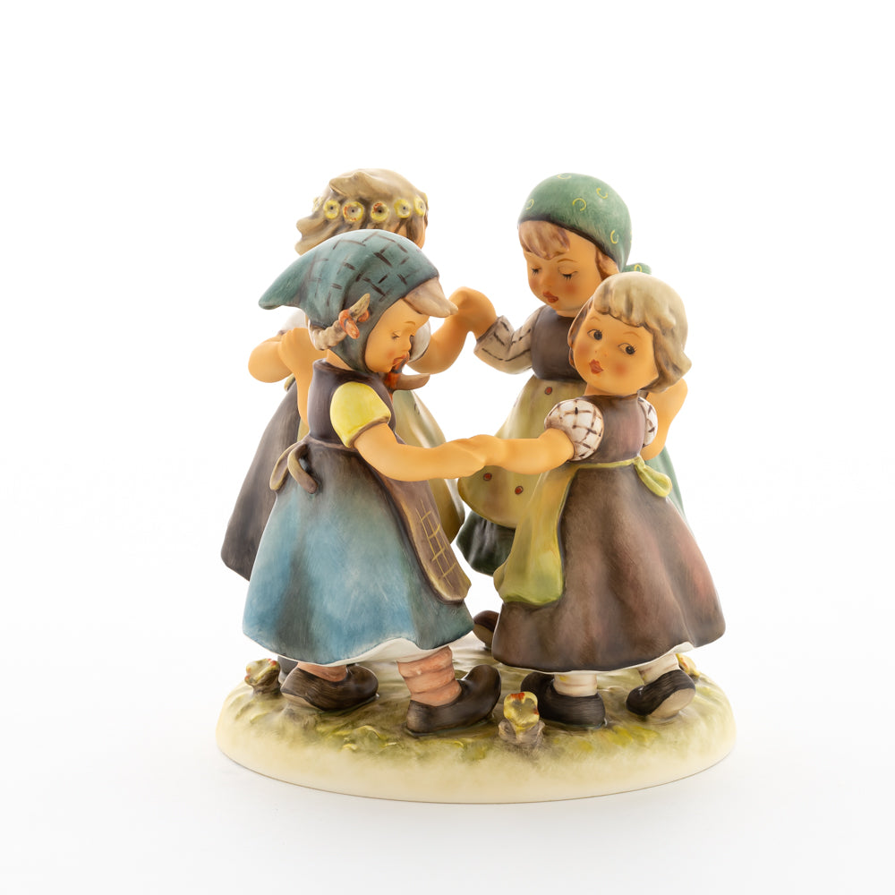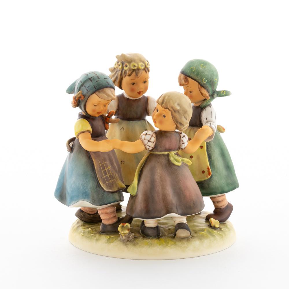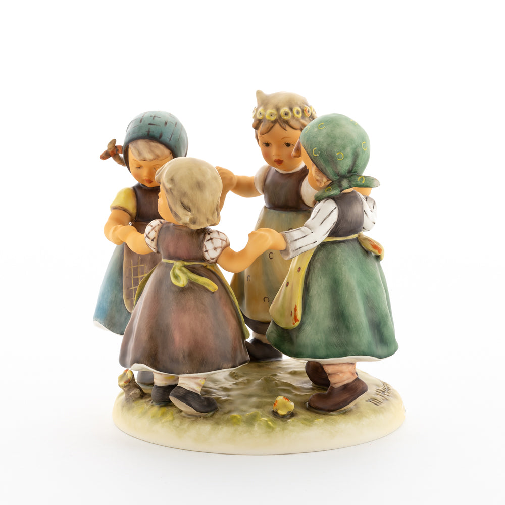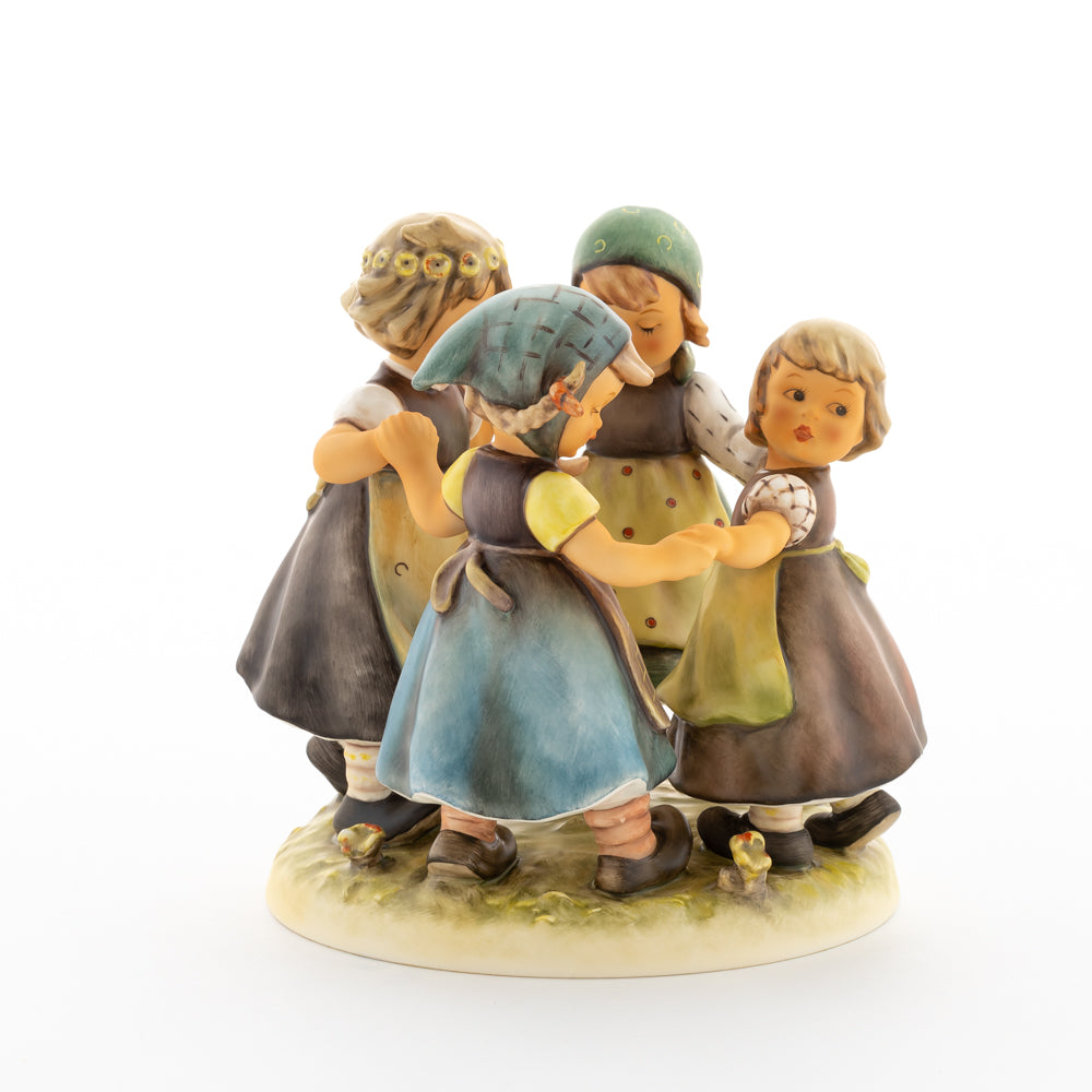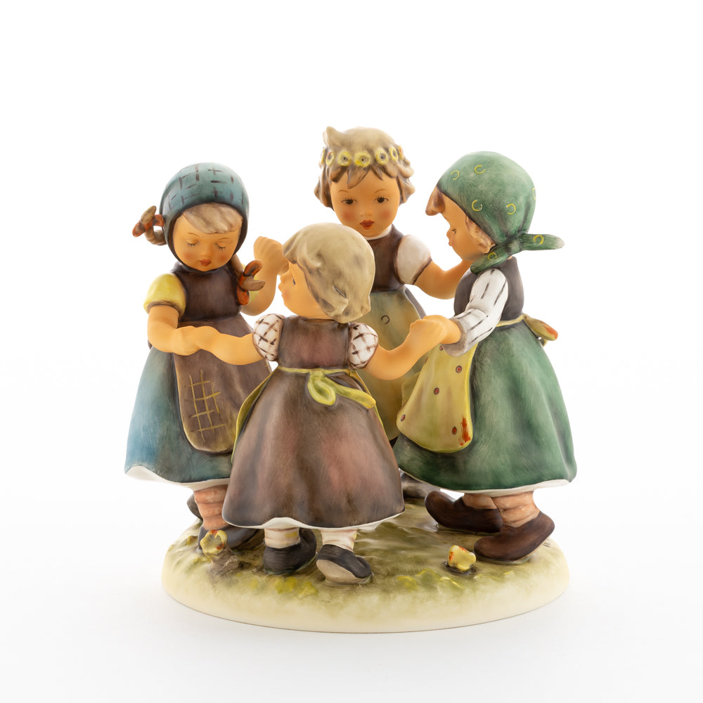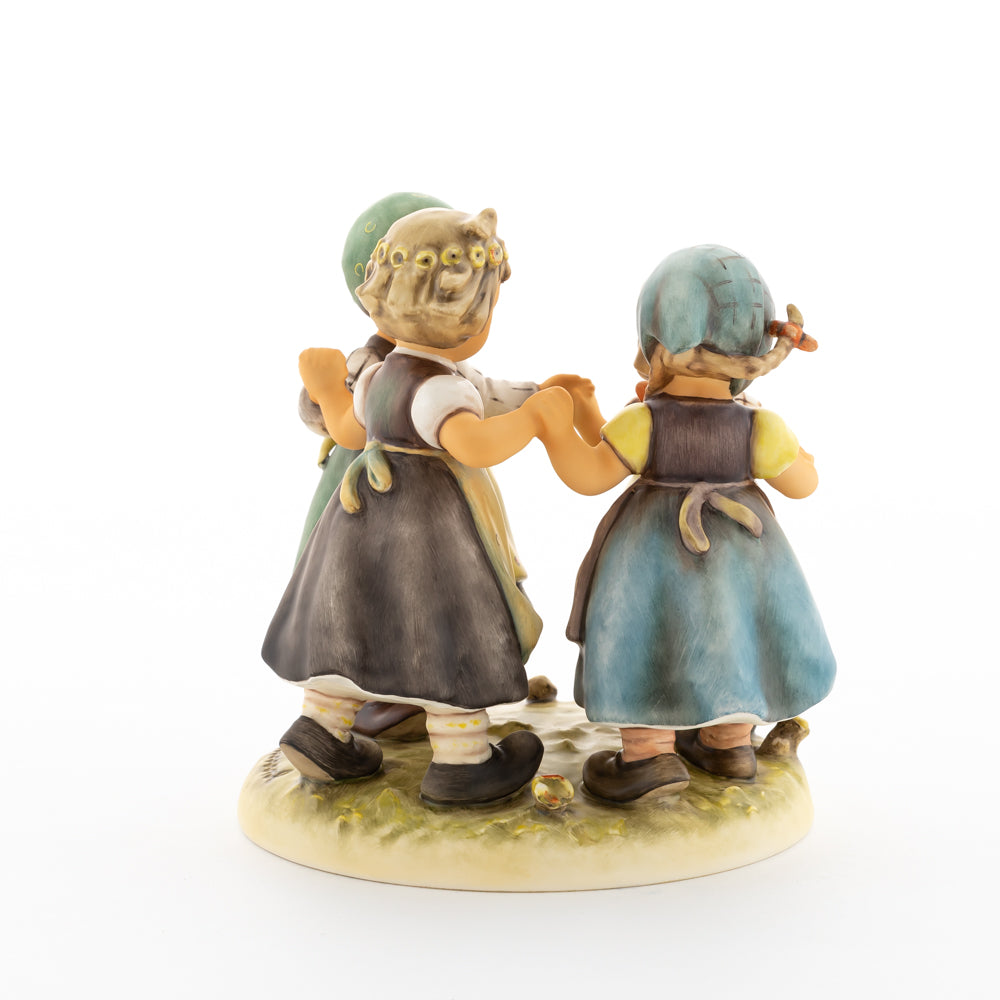 „Ringelreihen“ begeistert Sie mit seiner Detailpracht: liebevoll gemalter Haarschmuck, niedliche Gesichter mit rötlichen Bäckchen vom Tanzen und sogar ein paar Blumenknospen, die bald in ihrer vollen Blüte erstrahlen werden. Diese Hummel-Figur (HUM 348) aus der Feder von Meistermodelleur Gerhard Skrobek stammt aus dem Jahr 1957 und ist ein wahrer Hummel-Klassiker.