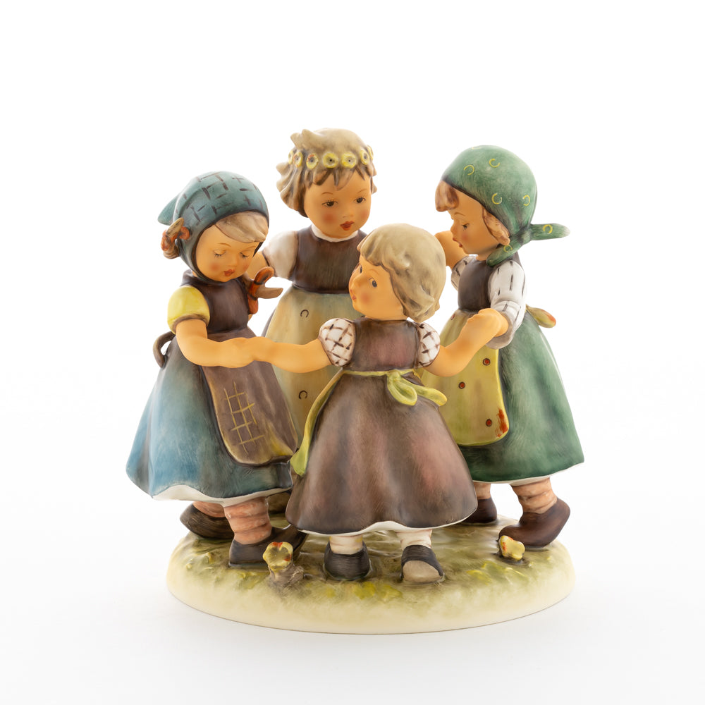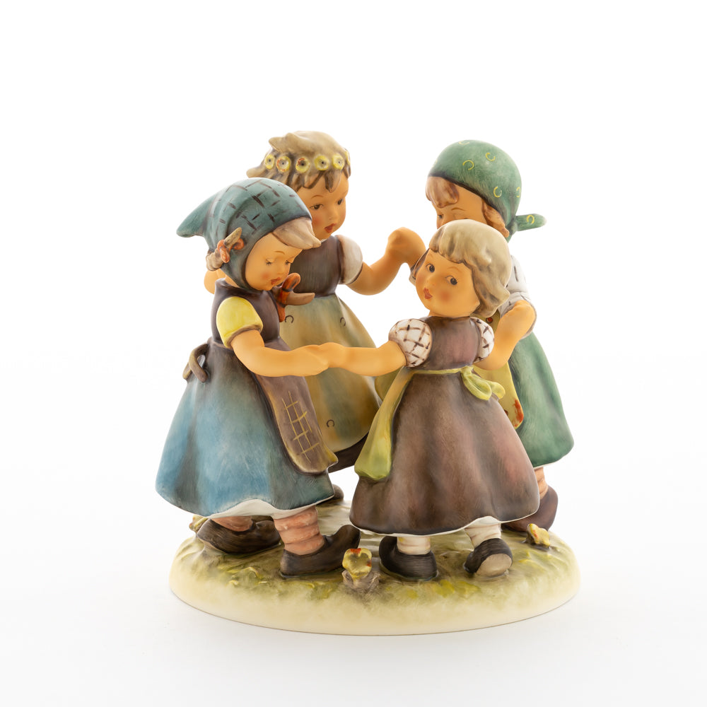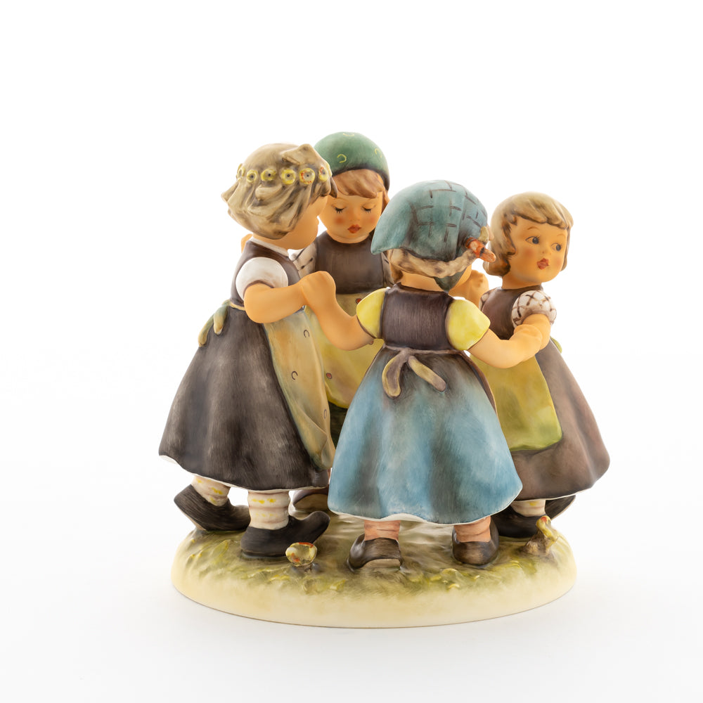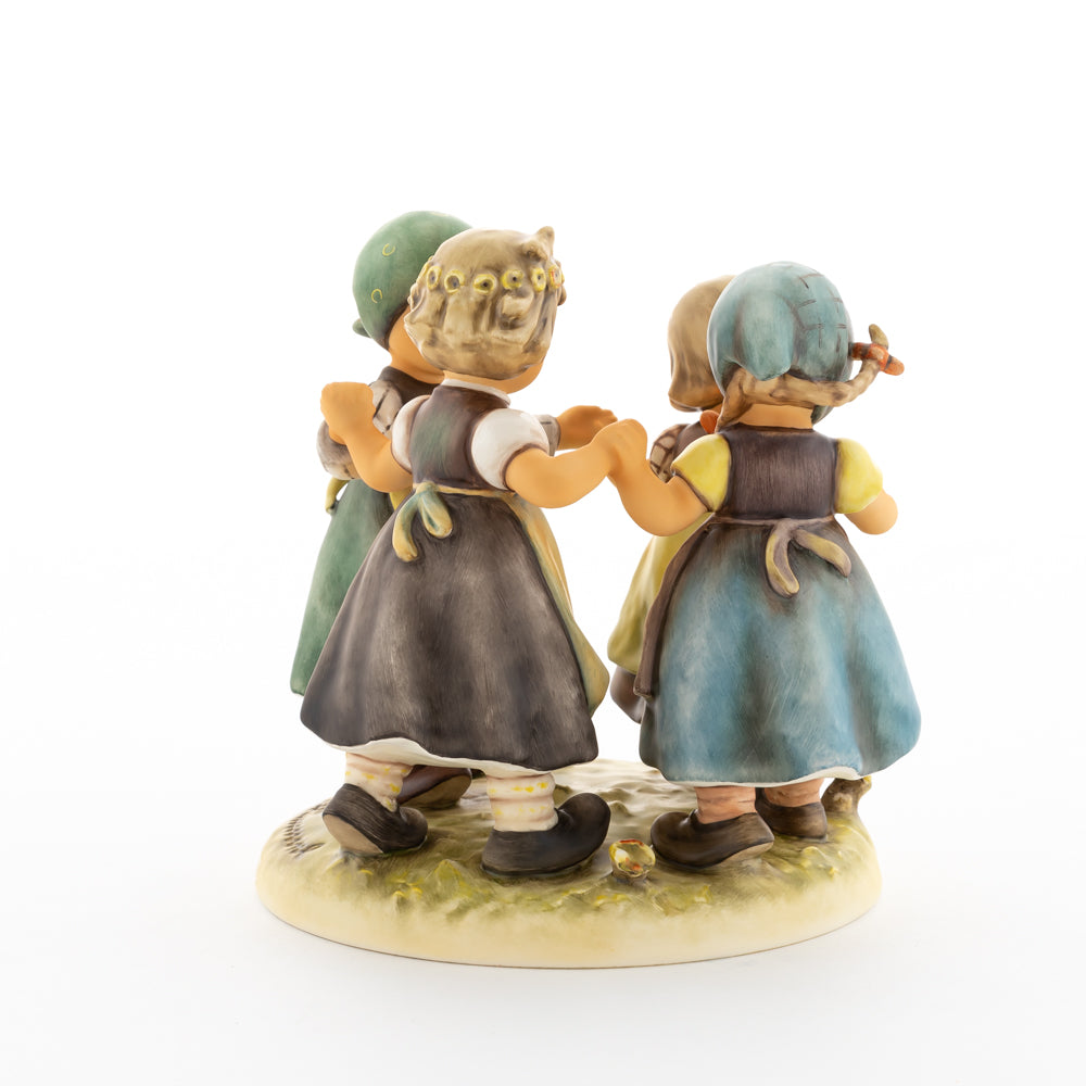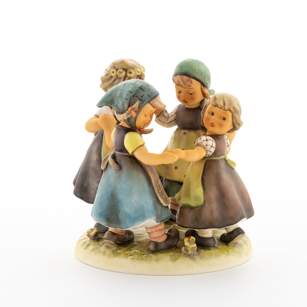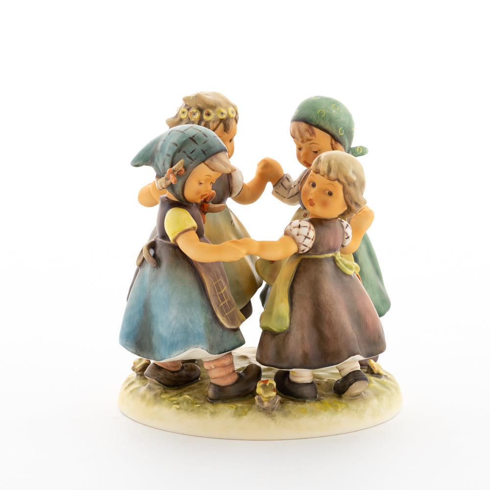 „Ringelreihen“ begeistert Sie mit seiner Detailpracht: liebevoll gemalter Haarschmuck, niedliche Gesichter mit rötlichen Bäckchen vom Tanzen und sogar ein paar Blumenknospen, die bald in ihrer vollen Blüte erstrahlen werden. Diese Hummel-Figur (HUM 348) aus der Feder von Meistermodelleur Gerhard Skrobek stammt aus dem Jahr 1957 und ist ein wahrer Hummel-Klassiker.