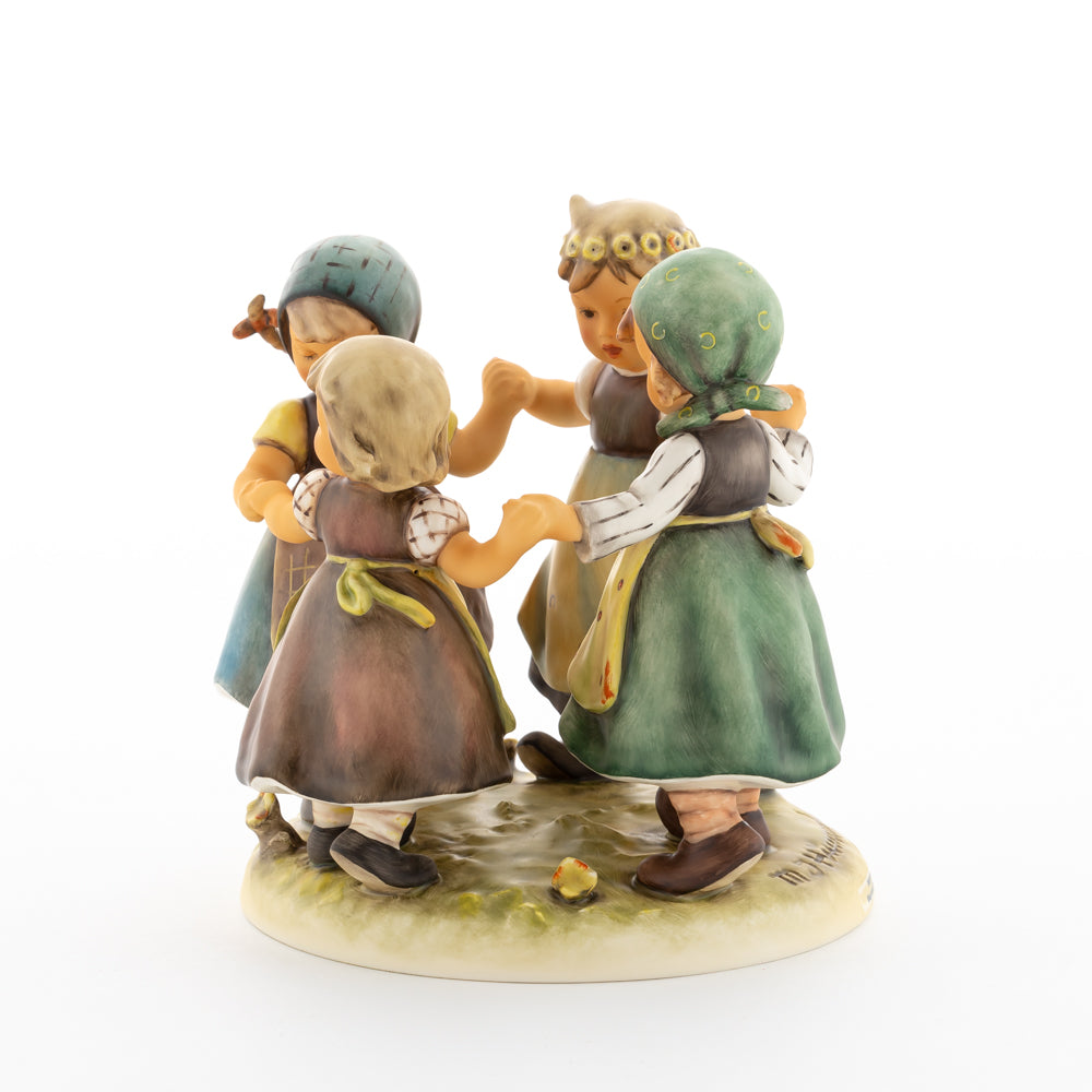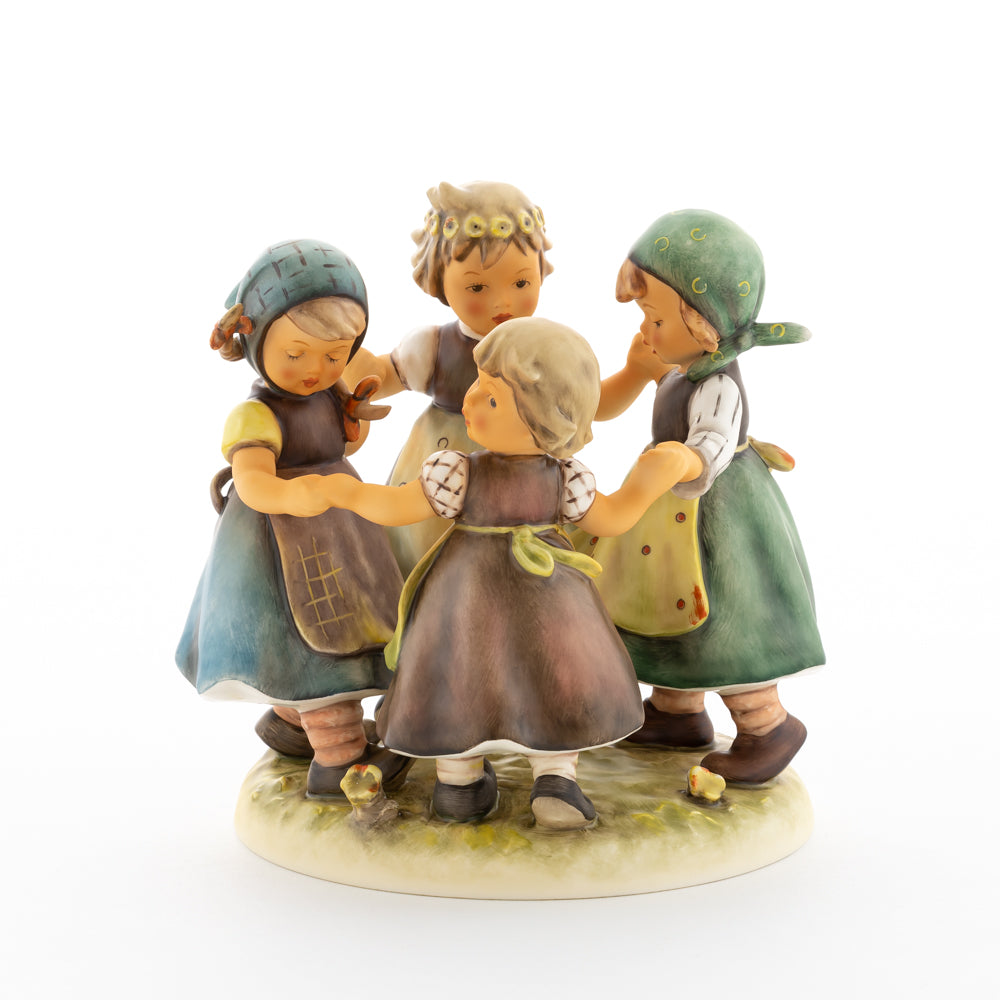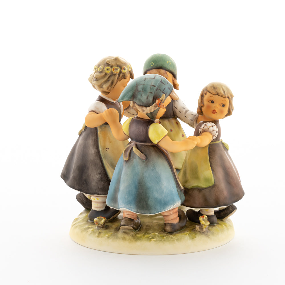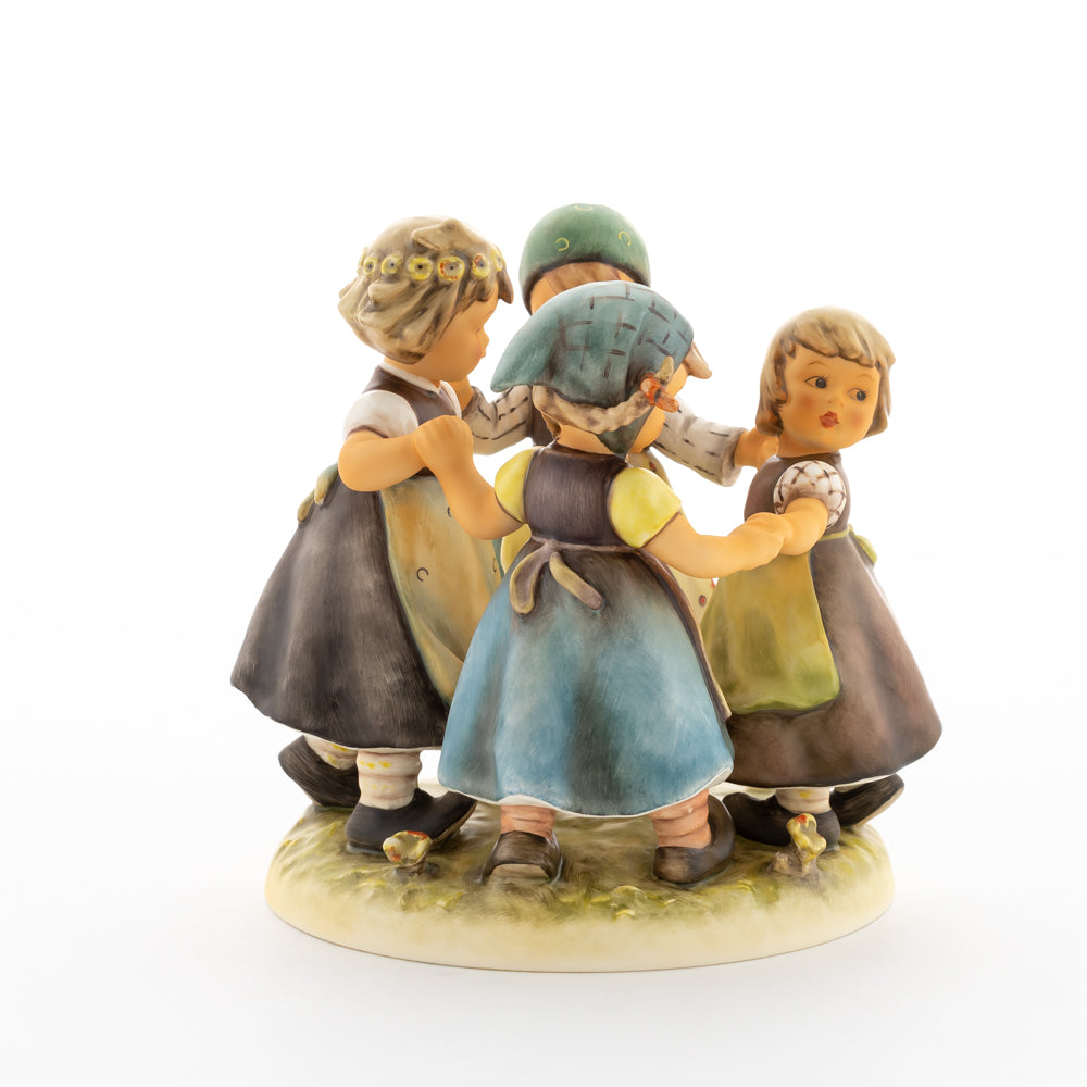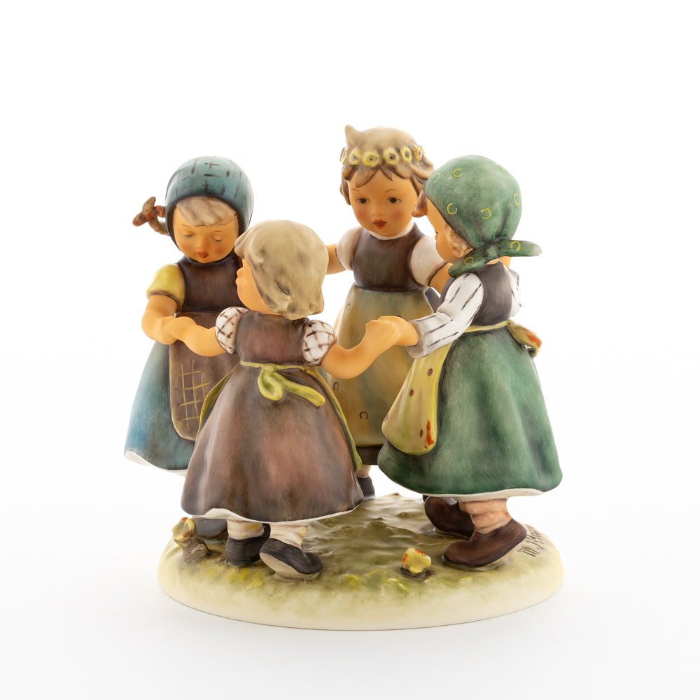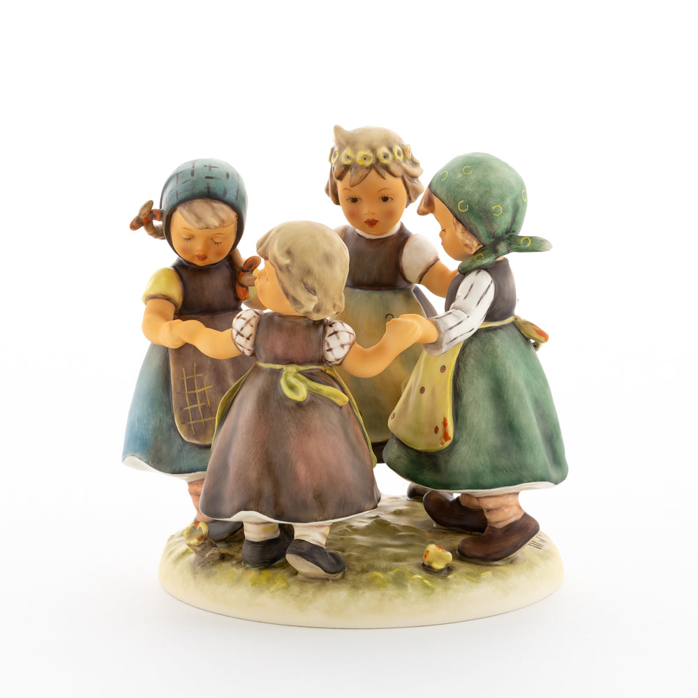 „Ringelreihen“ begeistert Sie mit seiner Detailpracht: liebevoll gemalter Haarschmuck, niedliche Gesichter mit rötlichen Bäckchen vom Tanzen und sogar ein paar Blumenknospen, die bald in ihrer vollen Blüte erstrahlen werden. Diese Hummel-Figur (HUM 348) aus der Feder von Meistermodelleur Gerhard Skrobek stammt aus dem Jahr 1957 und ist ein wahrer Hummel-Klassiker.