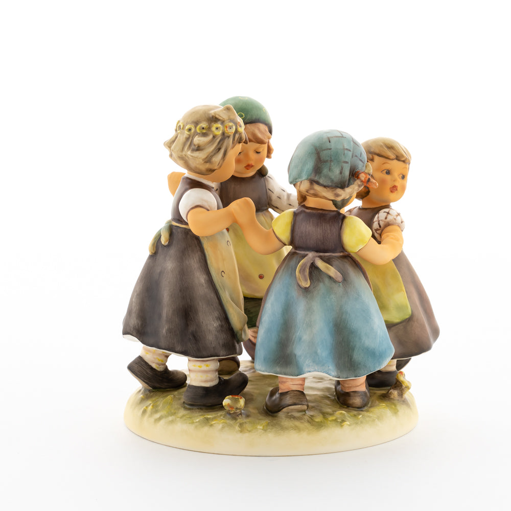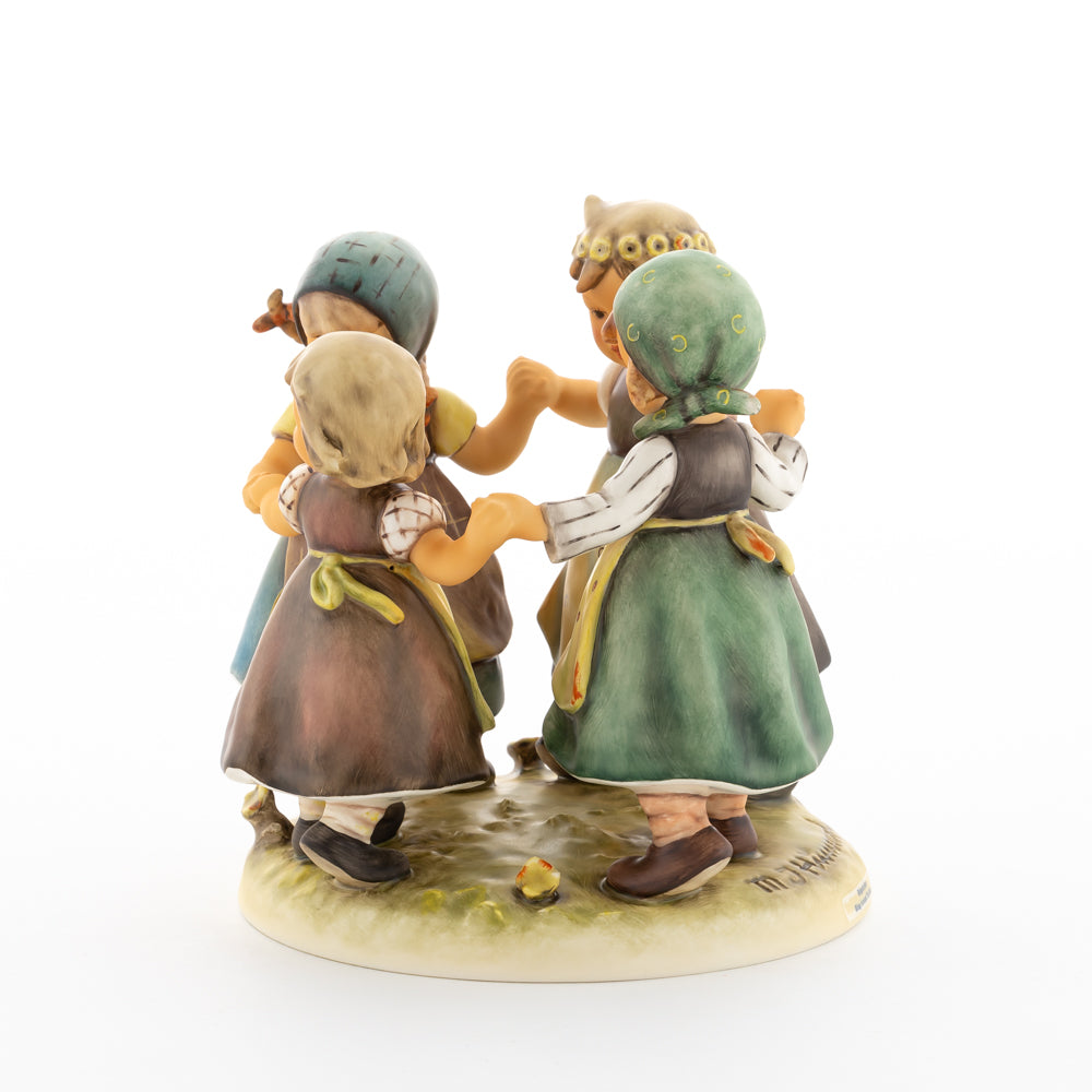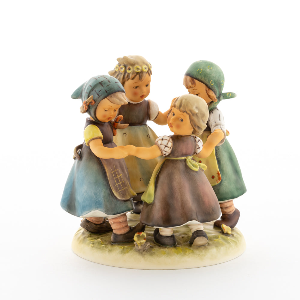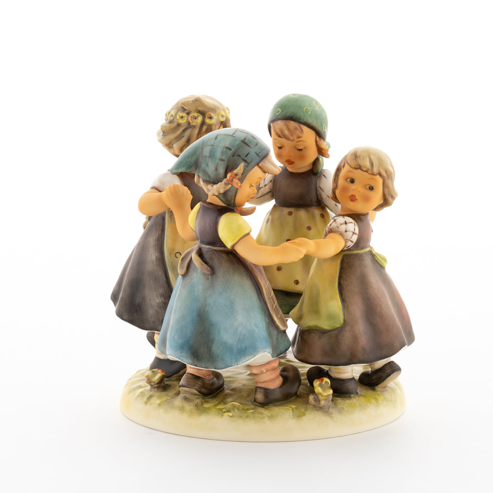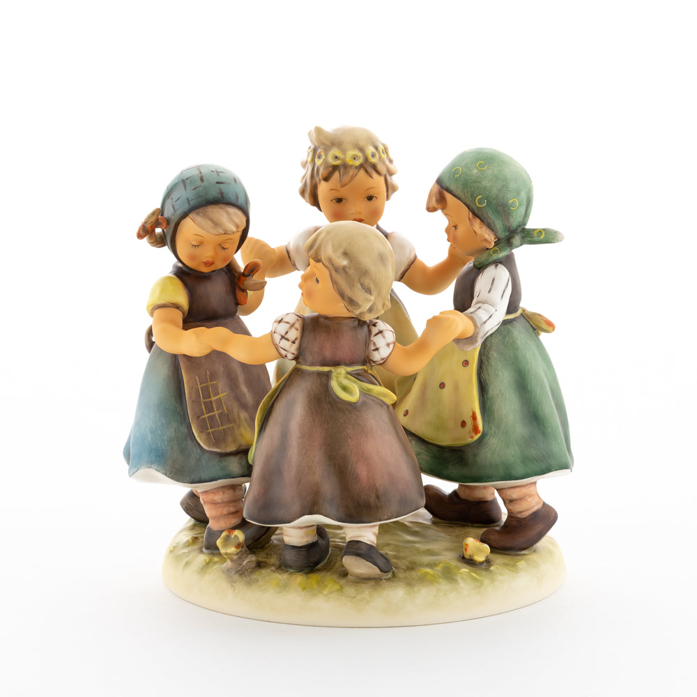 „Ringelreihen“ begeistert Sie mit seiner Detailpracht: liebevoll gemalter Haarschmuck, niedliche Gesichter mit rötlichen Bäckchen vom Tanzen und sogar ein paar Blumenknospen, die bald in ihrer vollen Blüte erstrahlen werden. Diese Hummel-Figur (HUM 348) aus der Feder von Meistermodelleur Gerhard Skrobek stammt aus dem Jahr 1957 und ist ein wahrer Hummel-Klassiker.