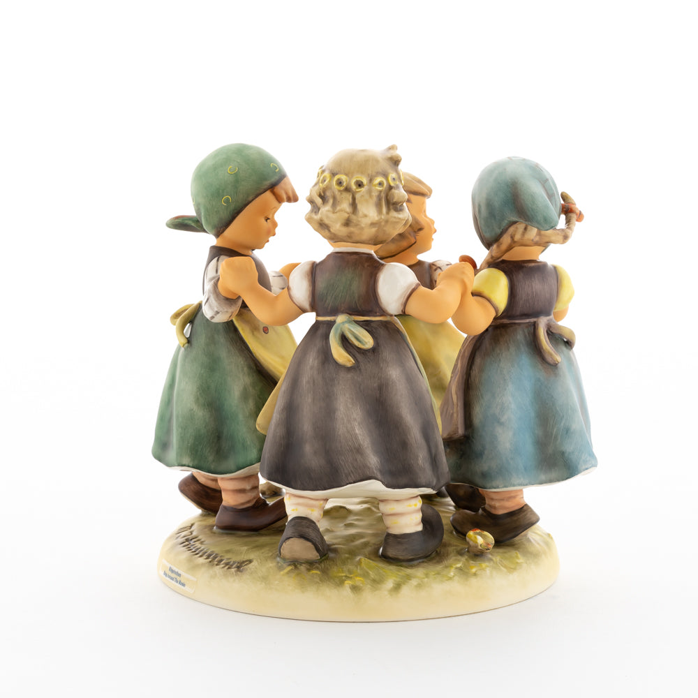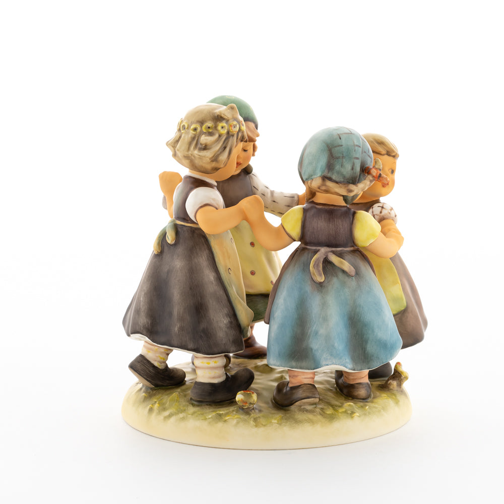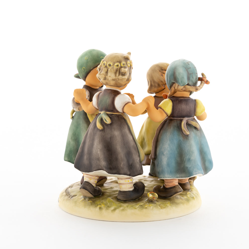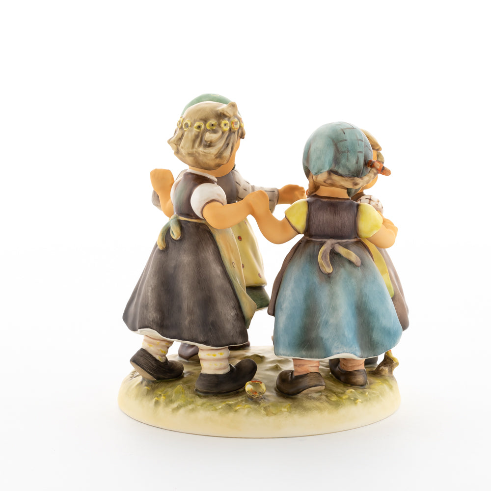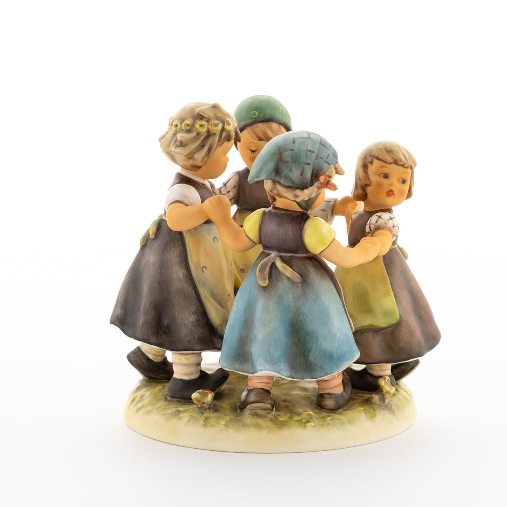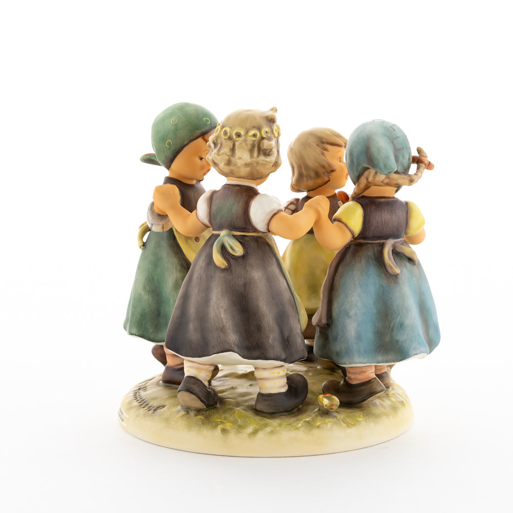 „Ringelreihen“ begeistert Sie mit seiner Detailpracht: liebevoll gemalter Haarschmuck, niedliche Gesichter mit rötlichen Bäckchen vom Tanzen und sogar ein paar Blumenknospen, die bald in ihrer vollen Blüte erstrahlen werden. Diese Hummel-Figur (HUM 348) aus der Feder von Meistermodelleur Gerhard Skrobek stammt aus dem Jahr 1957 und ist ein wahrer Hummel-Klassiker.