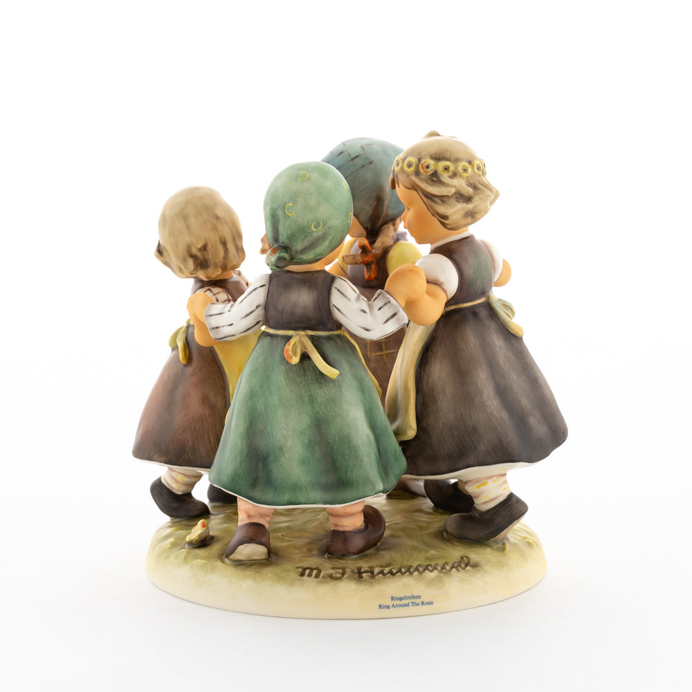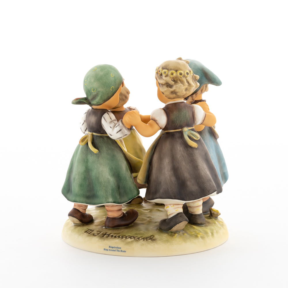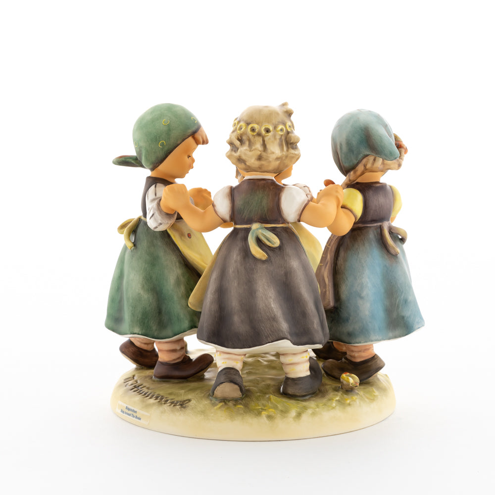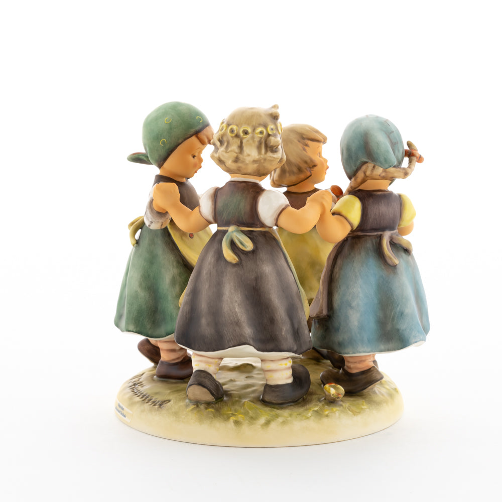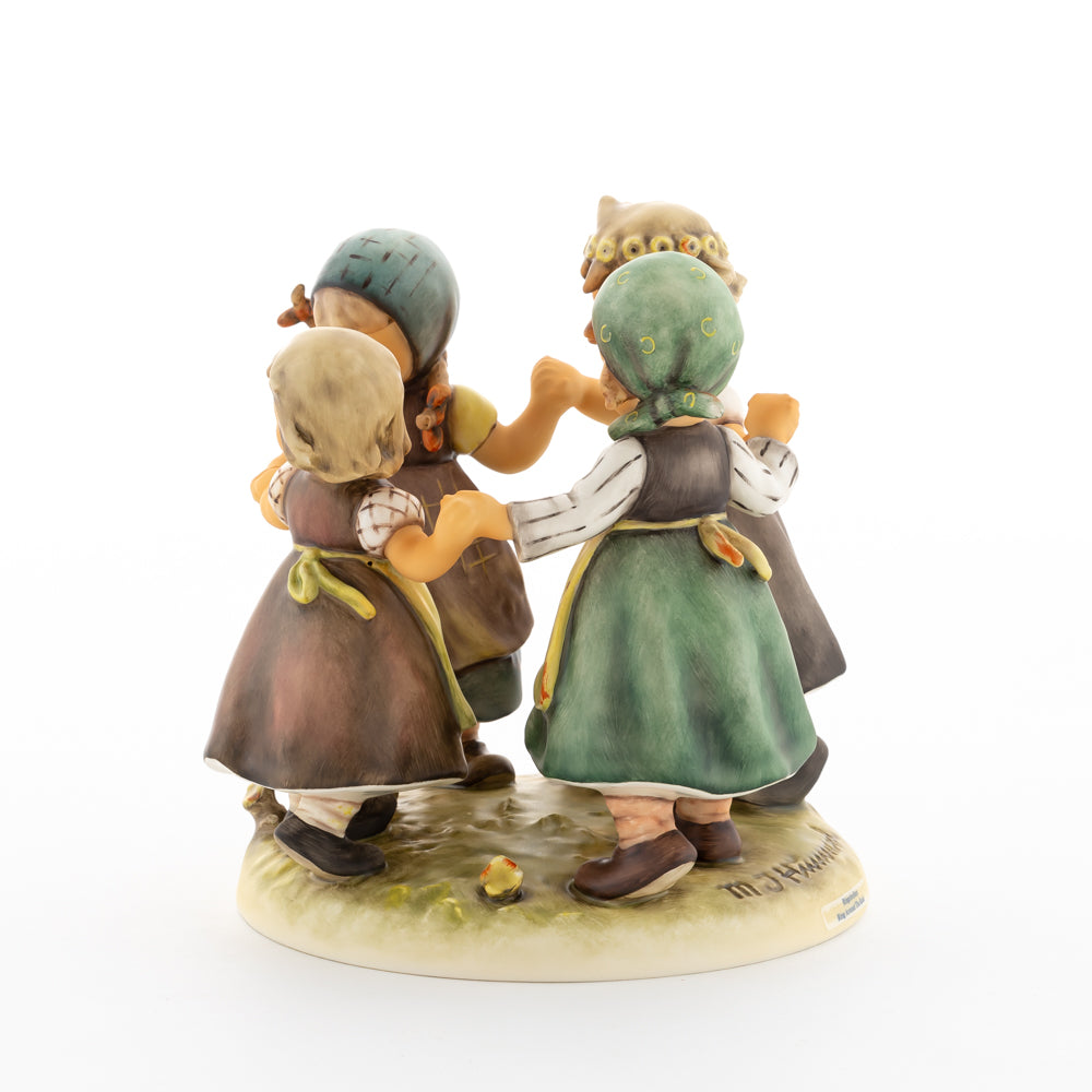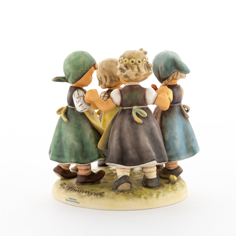 „Ringelreihen“ begeistert Sie mit seiner Detailpracht: liebevoll gemalter Haarschmuck, niedliche Gesichter mit rötlichen Bäckchen vom Tanzen und sogar ein paar Blumenknospen, die bald in ihrer vollen Blüte erstrahlen werden. Diese Hummel-Figur (HUM 348) aus der Feder von Meistermodelleur Gerhard Skrobek stammt aus dem Jahr 1957 und ist ein wahrer Hummel-Klassiker.
