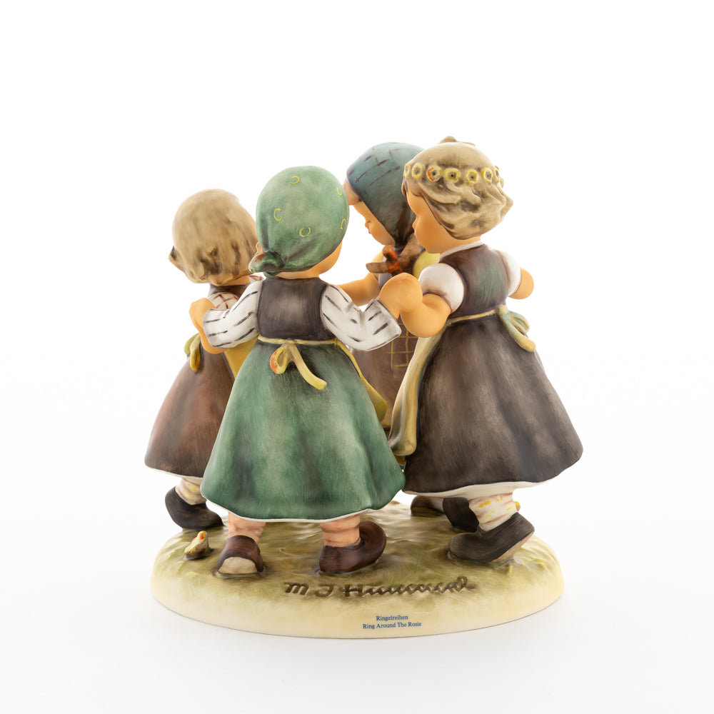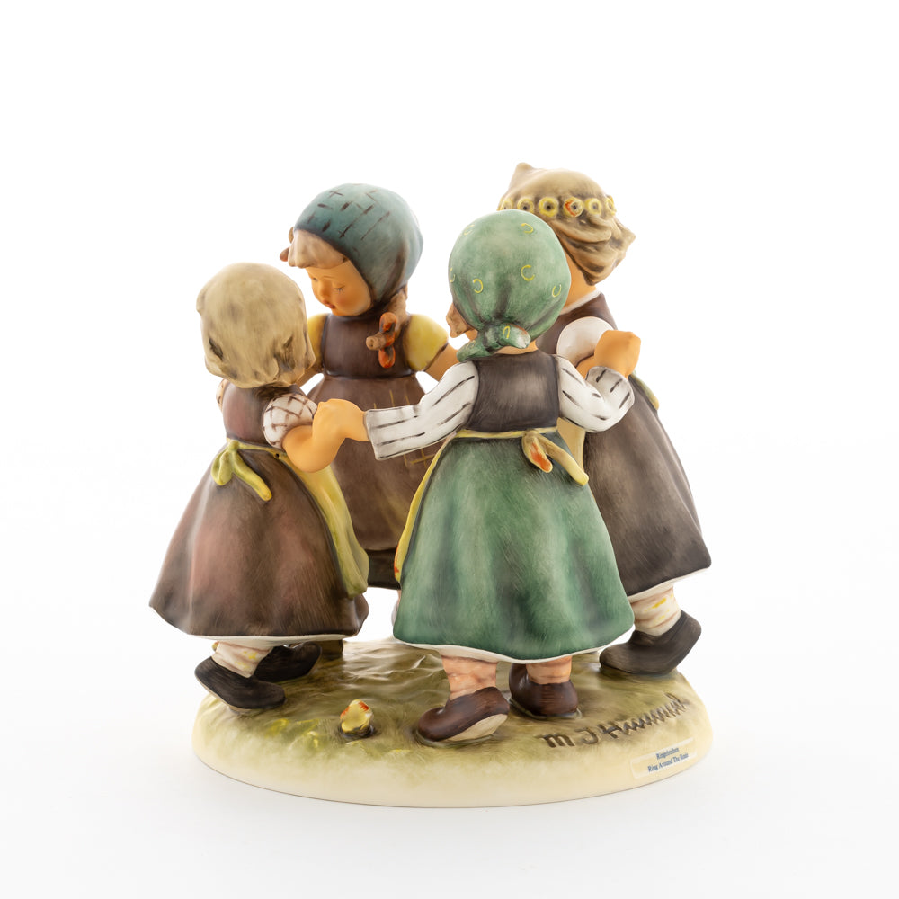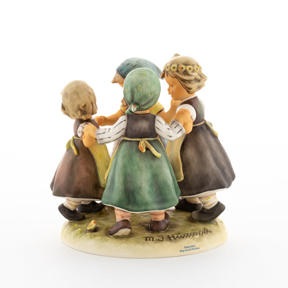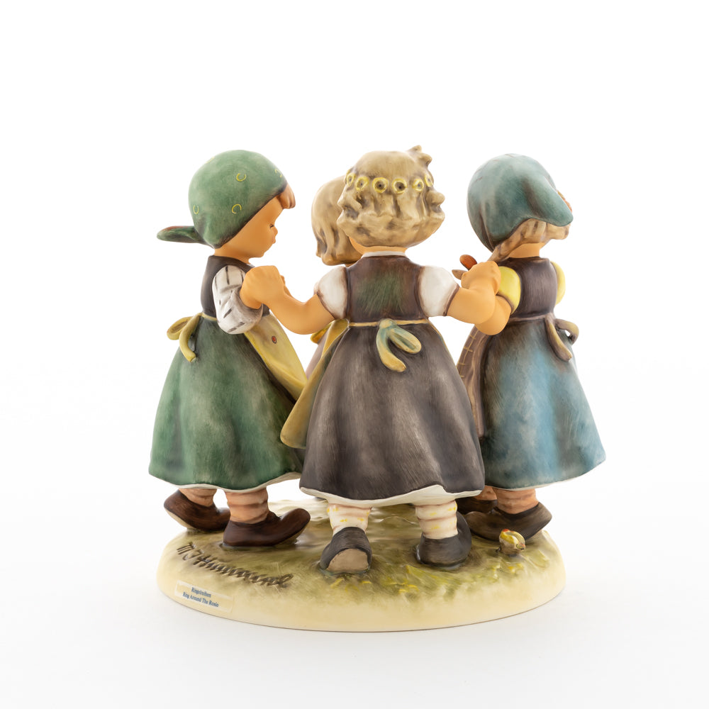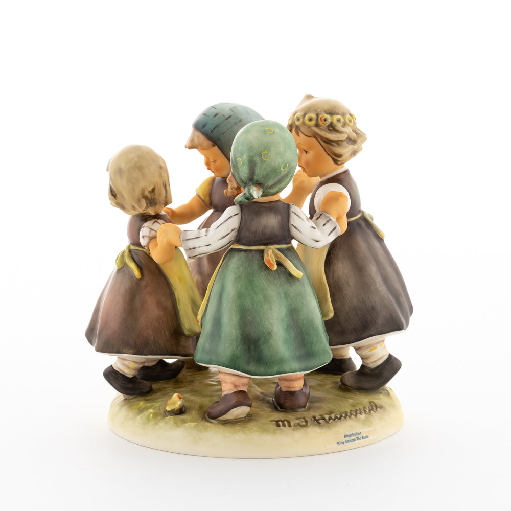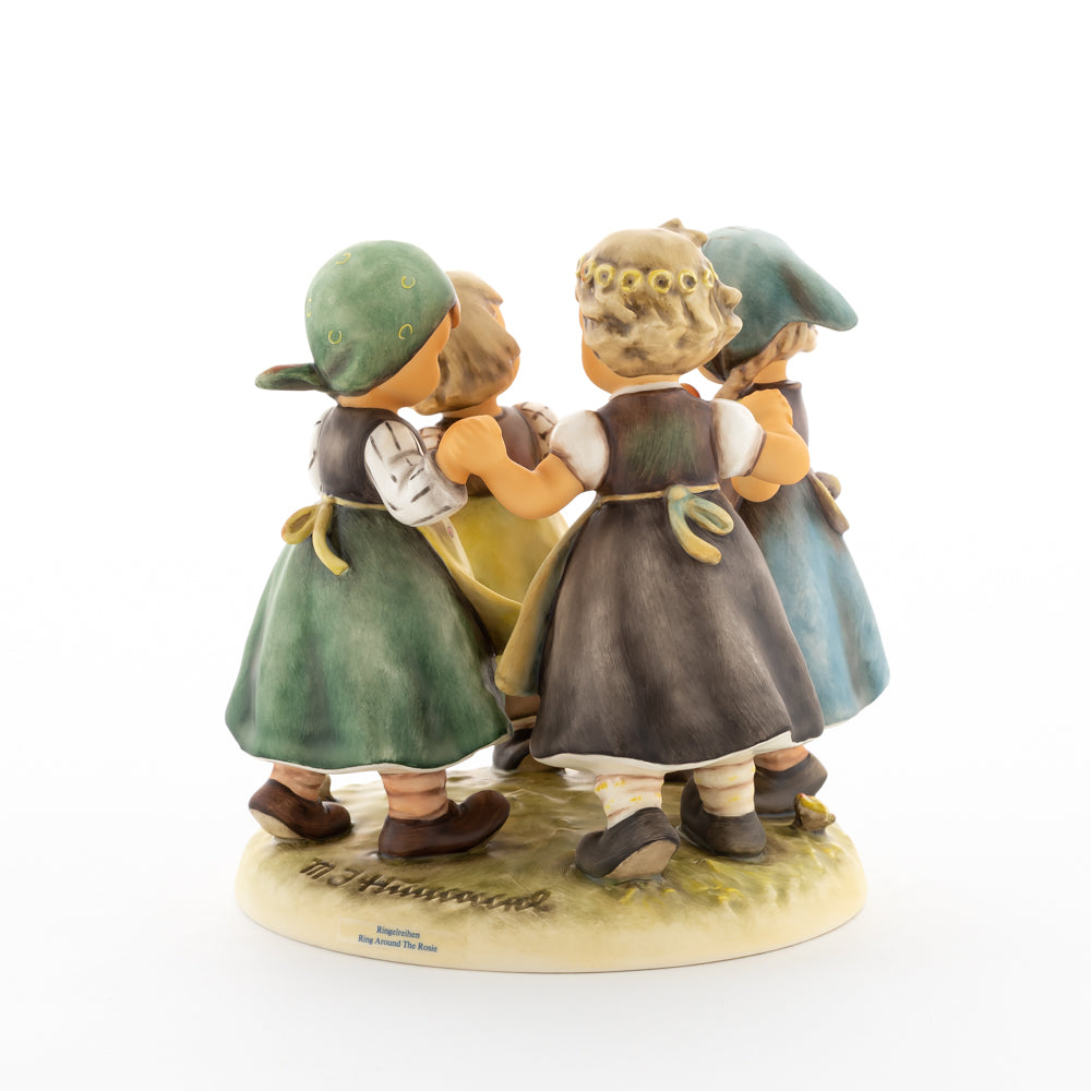„Ringelreihen“ begeistert Sie mit seiner Detailpracht: liebevoll gemalter Haarschmuck, niedliche Gesichter mit rötlichen Bäckchen vom Tanzen und sogar ein paar Blumenknospen, die bald in ihrer vollen Blüte erstrahlen werden. Diese Hummel-Figur (HUM 348) aus der Feder von Meistermodelleur Gerhard Skrobek stammt aus dem Jahr 1957 und ist ein wahrer Hummel-Klassiker.