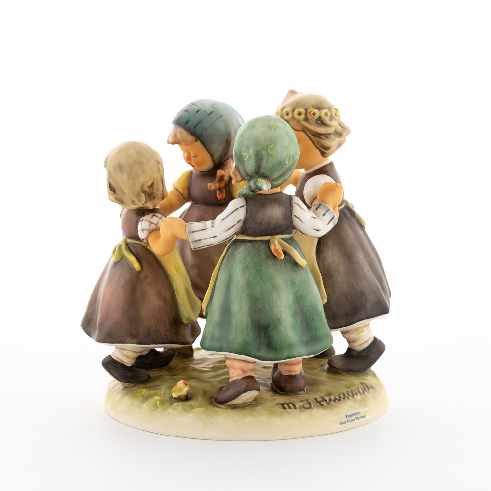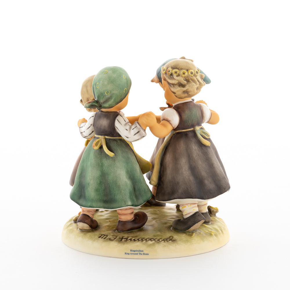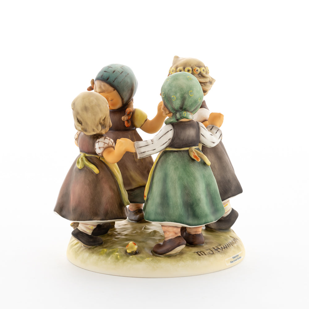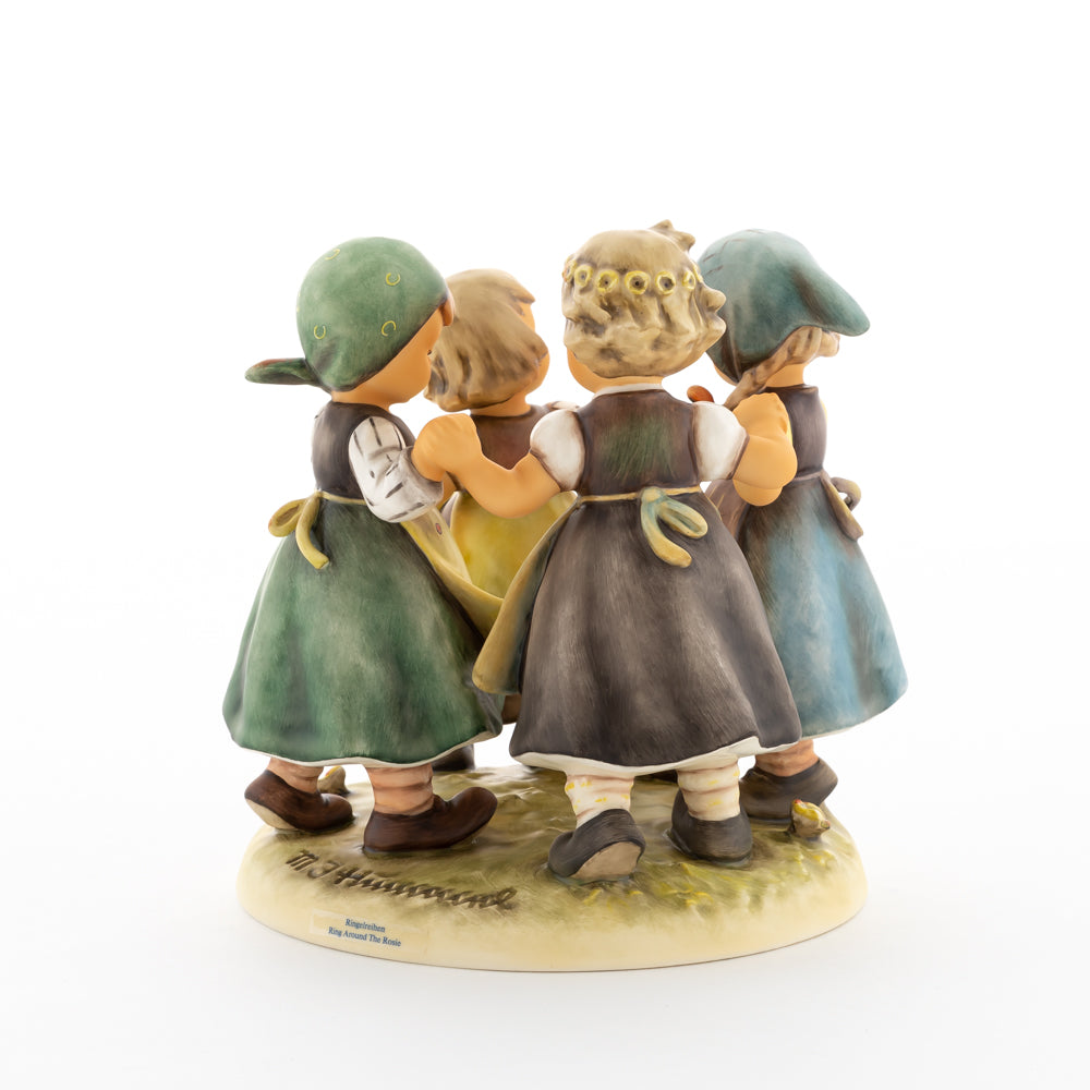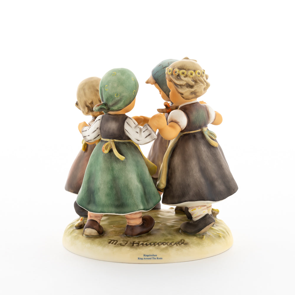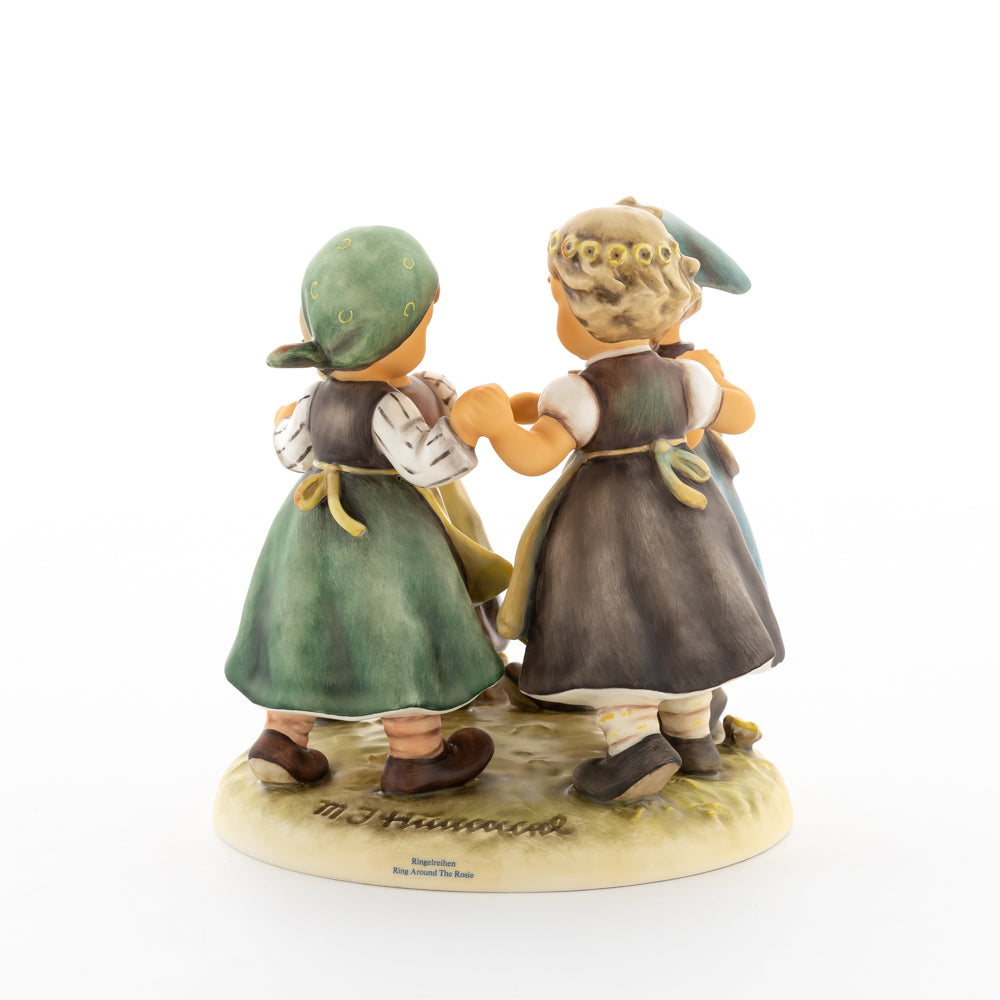 „Ringelreihen“ begeistert Sie mit seiner Detailpracht: liebevoll gemalter Haarschmuck, niedliche Gesichter mit rötlichen Bäckchen vom Tanzen und sogar ein paar Blumenknospen, die bald in ihrer vollen Blüte erstrahlen werden. Diese Hummel-Figur (HUM 348) aus der Feder von Meistermodelleur Gerhard Skrobek stammt aus dem Jahr 1957 und ist ein wahrer Hummel-Klassiker.